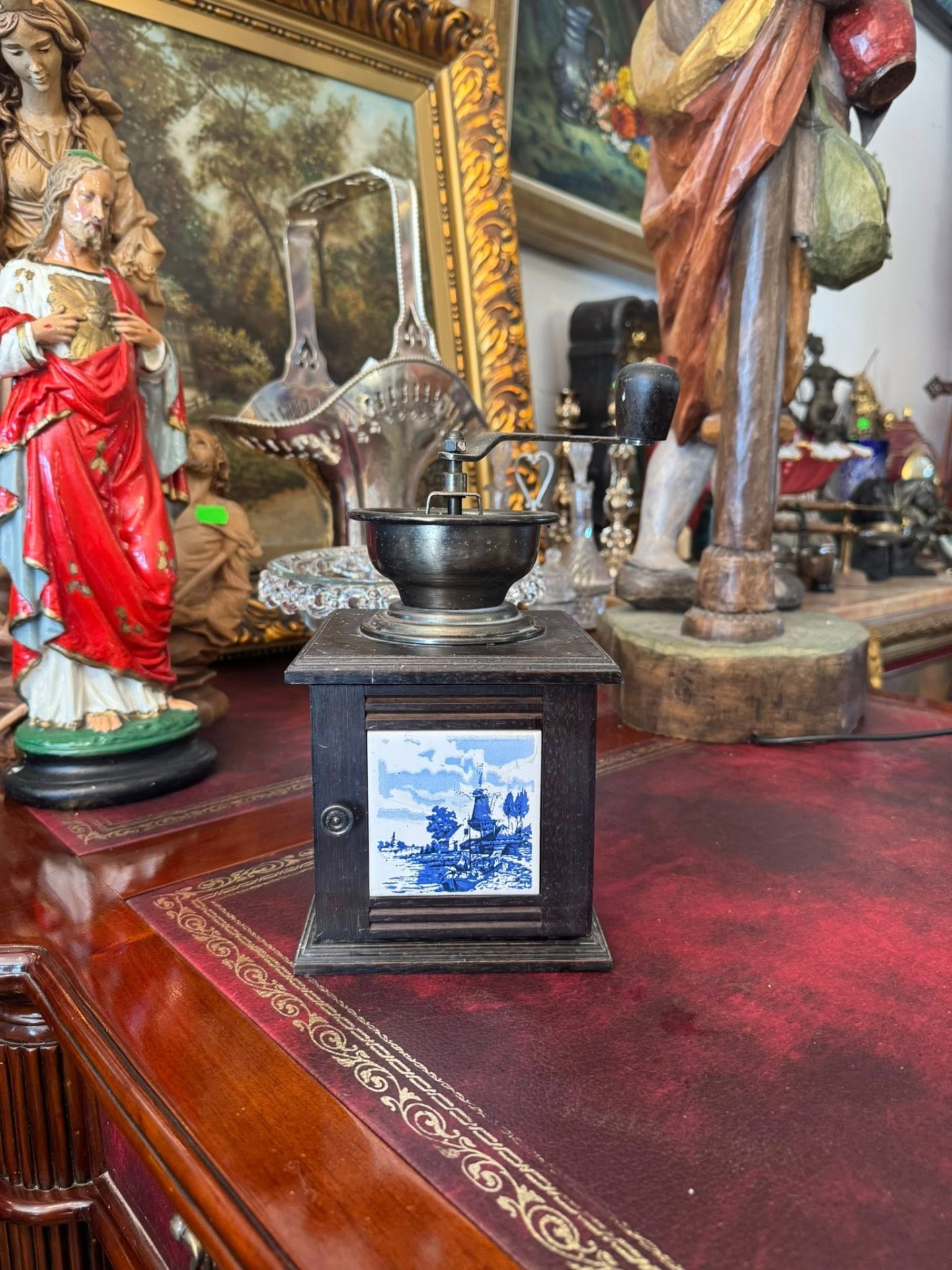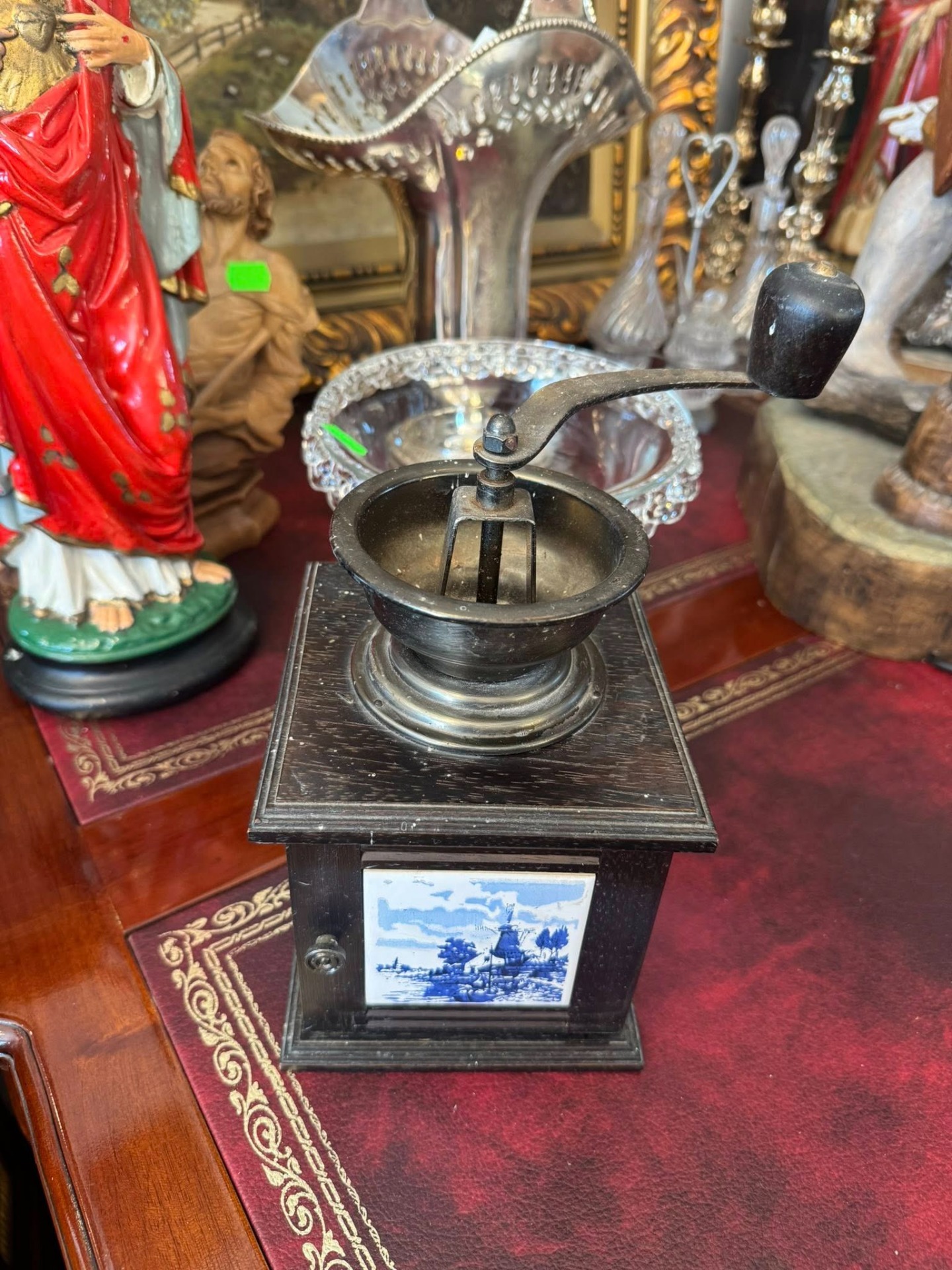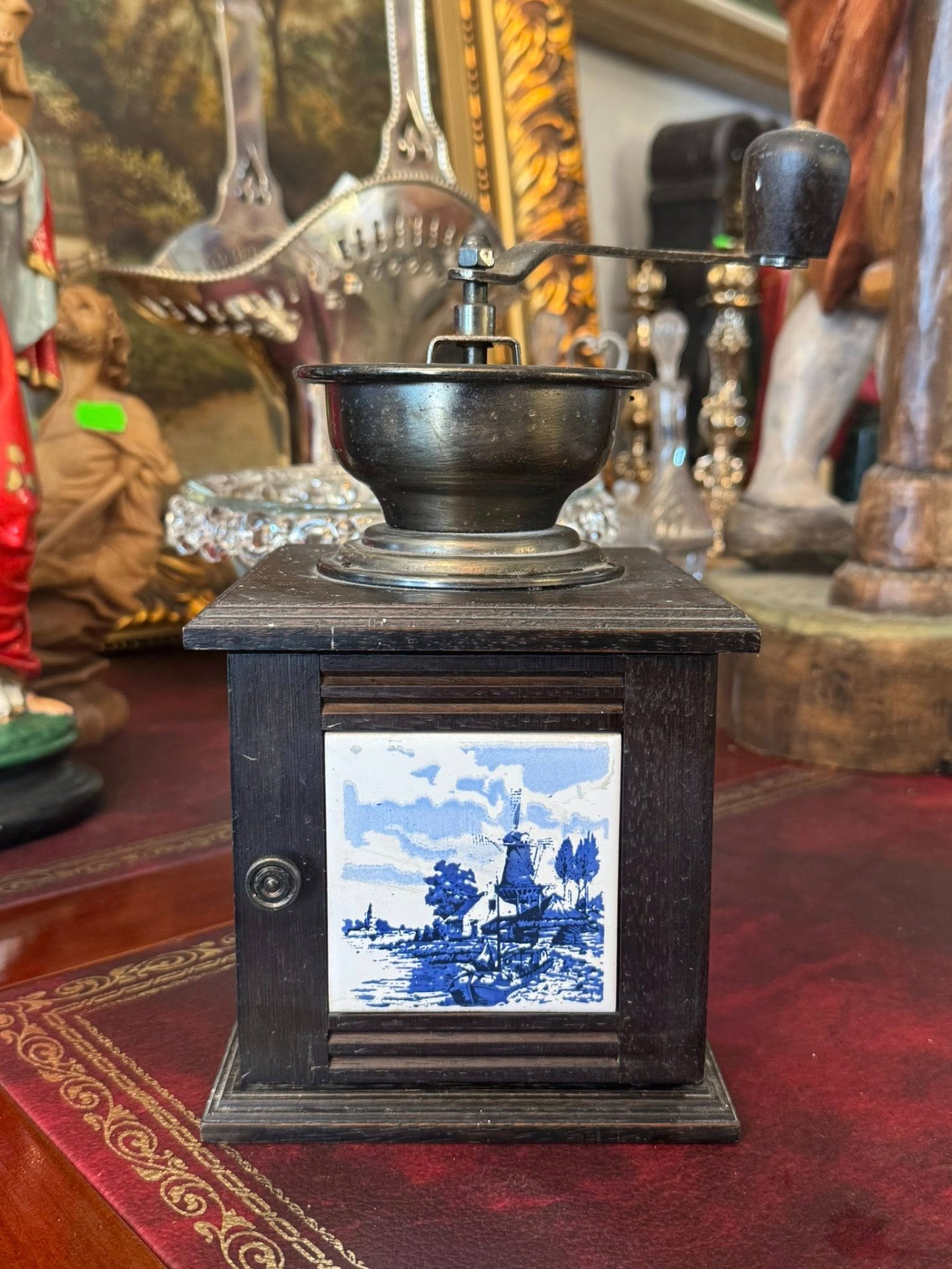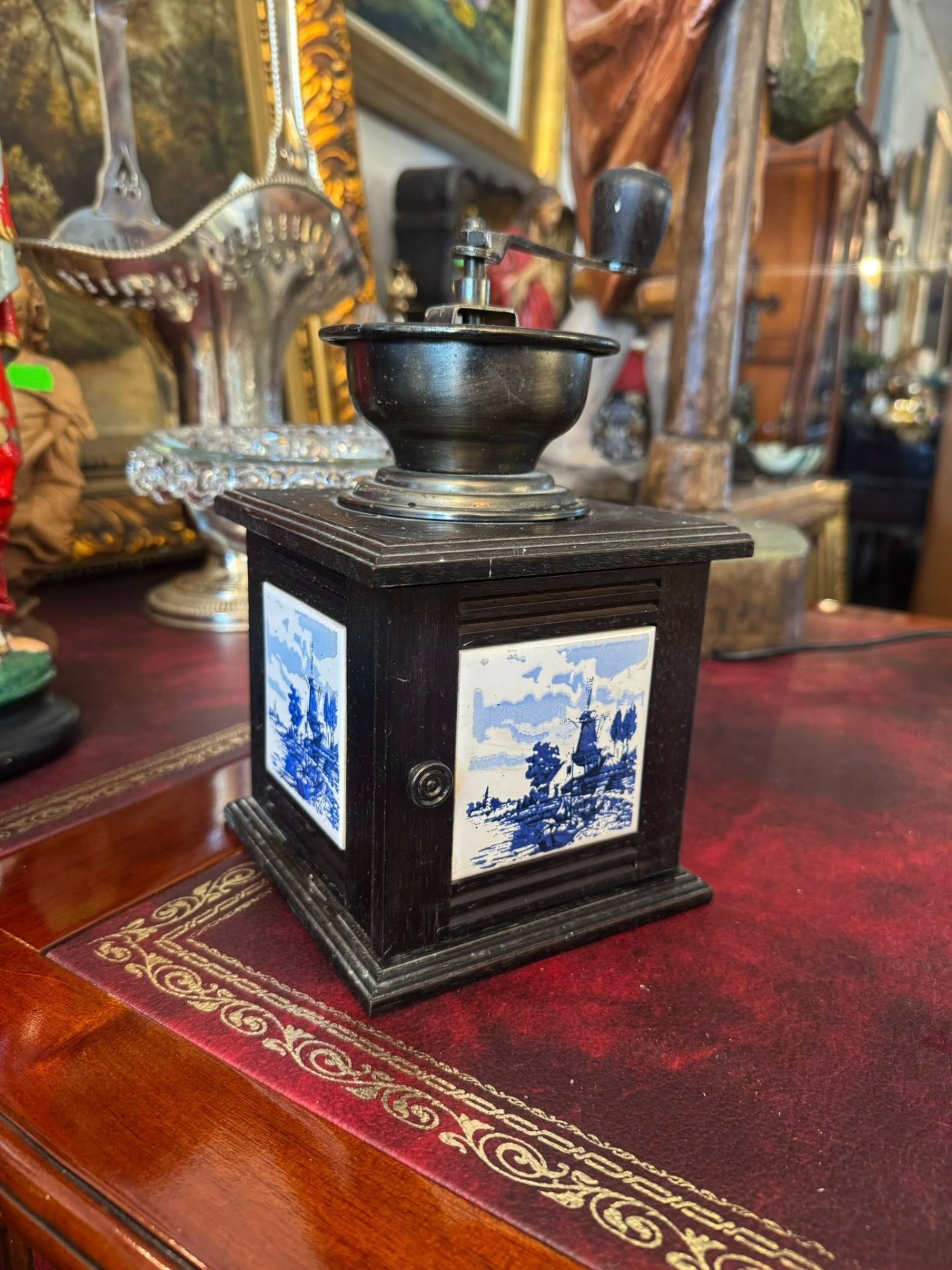 Râșniță de cafea manuală din lemn de culoare închisă, cu placi din ceramică pictată în stilul „Delft Blue”. (Olanda, cca 1950)