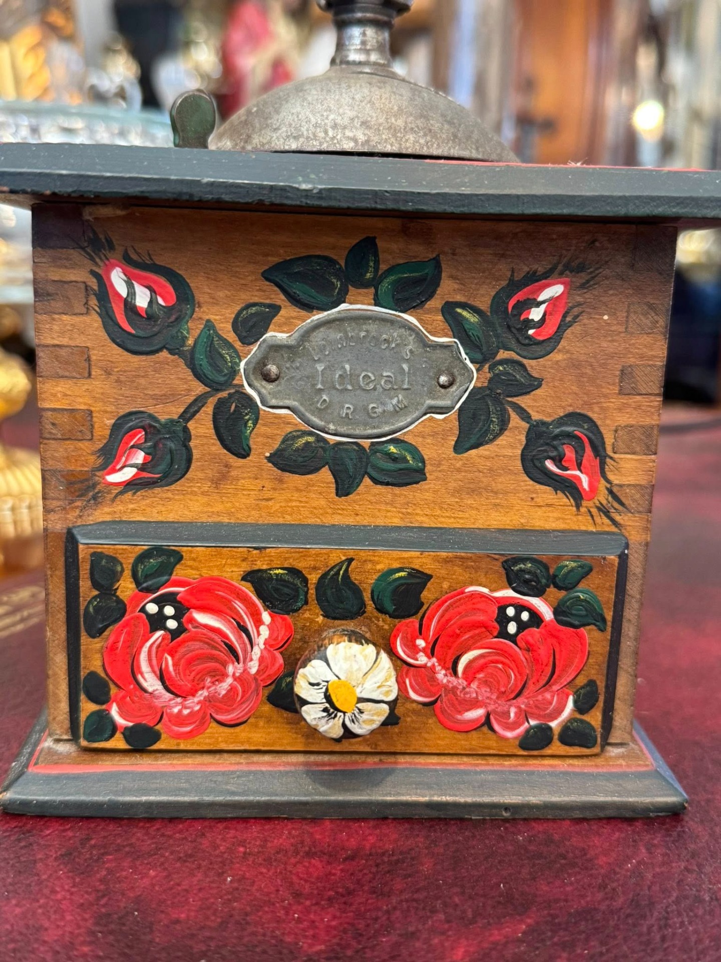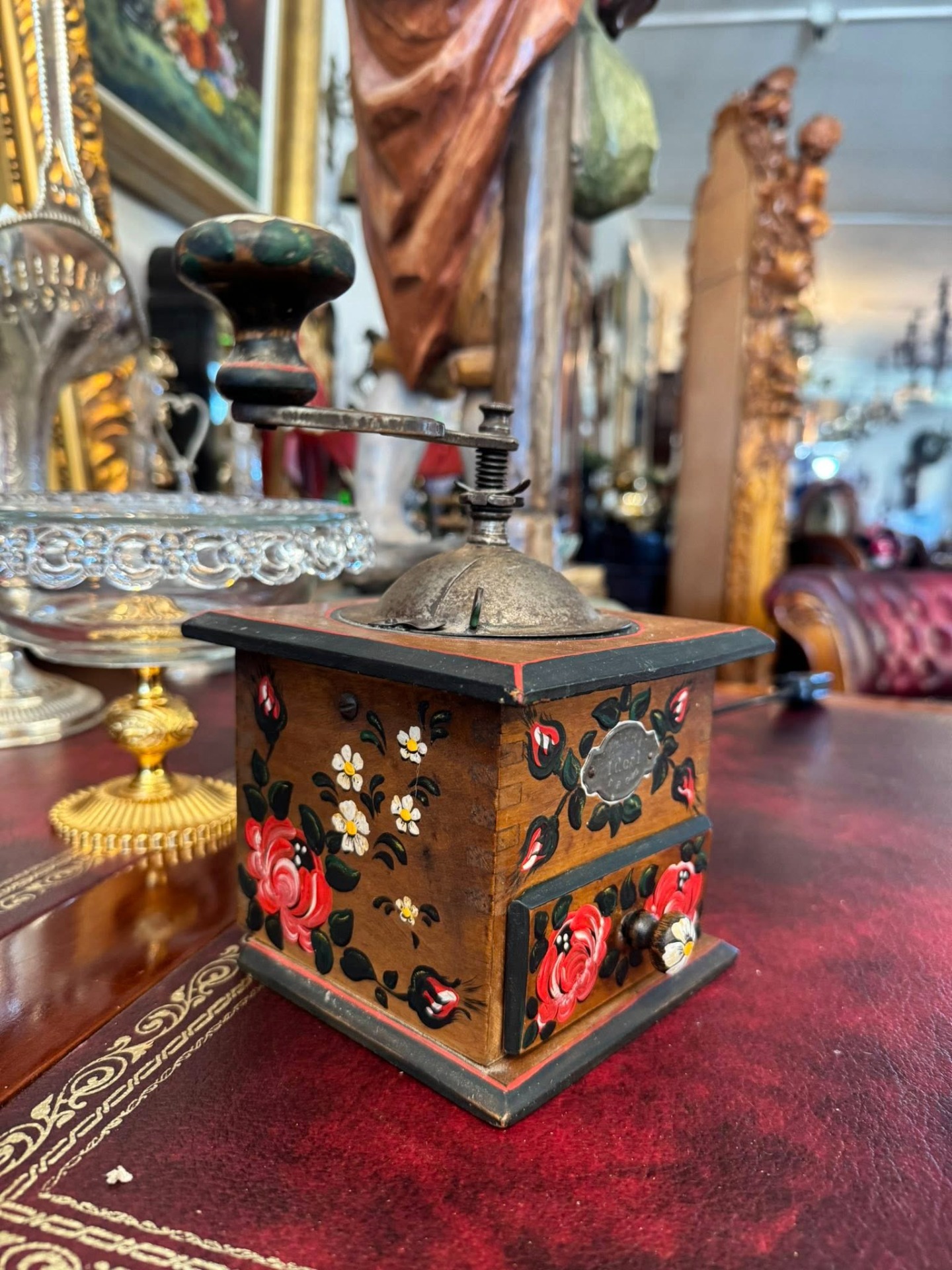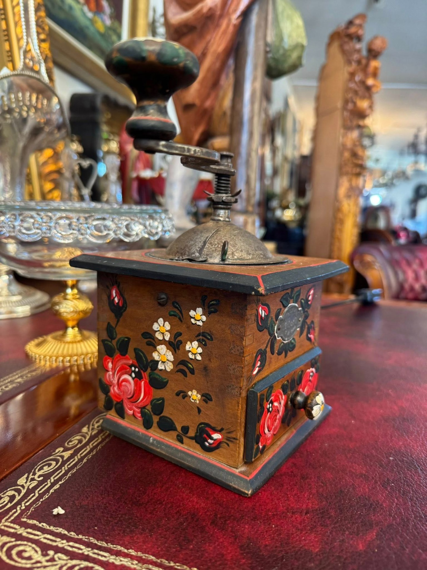 Râșniță de cafea vintage, realizată din lemn pictat manual în stil Bauernmalerei (pictură populară germană/austriacă), prezentând trandafiri roșii vibranți și boboci pe un fundal galben-miere, cu margini negre accentuate.