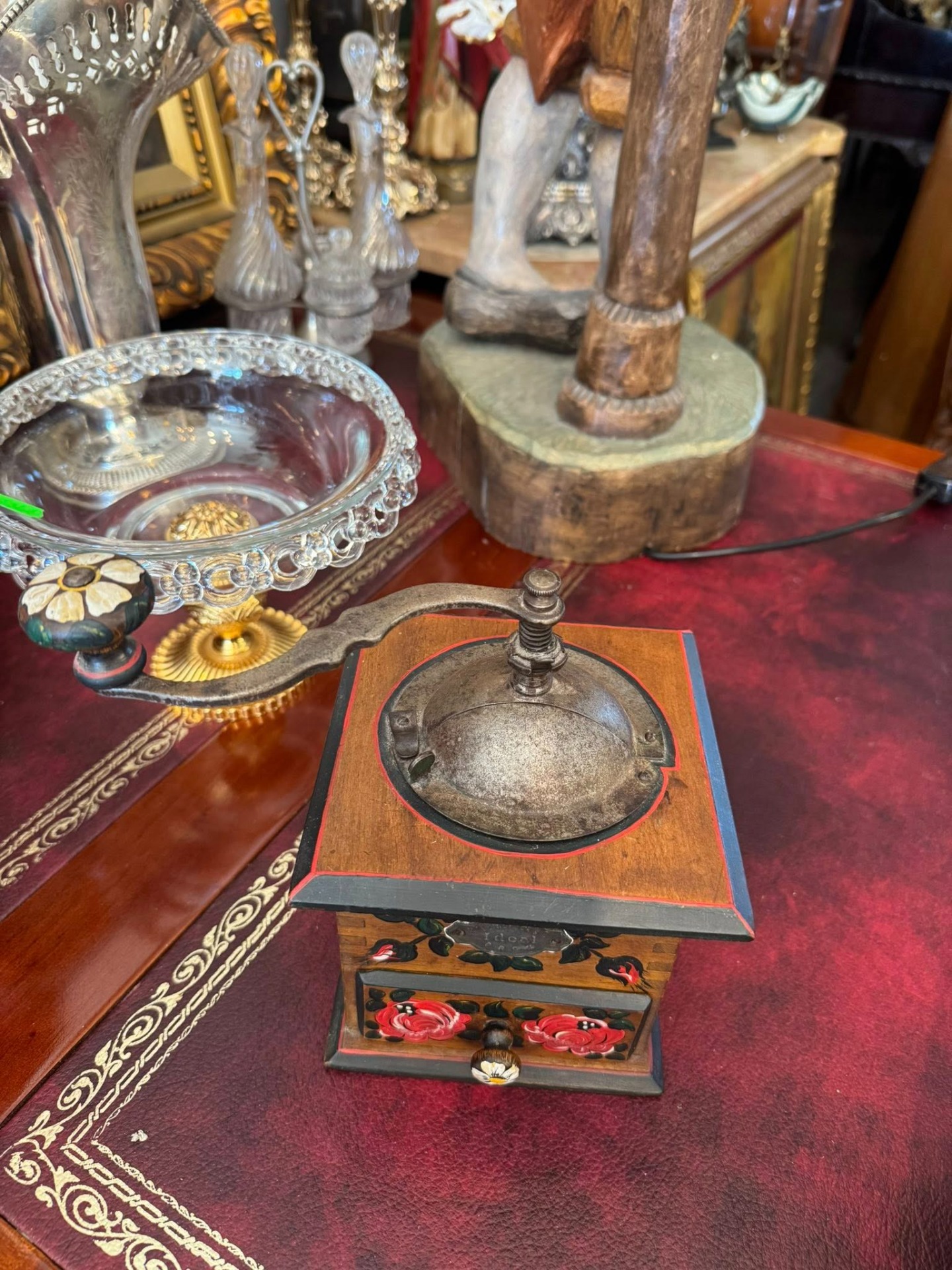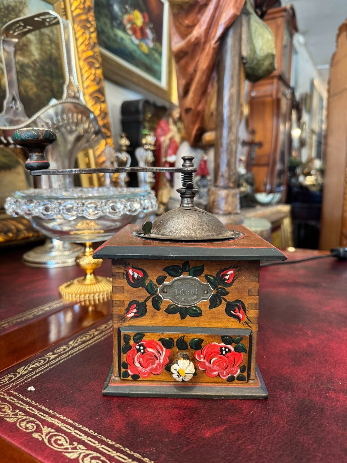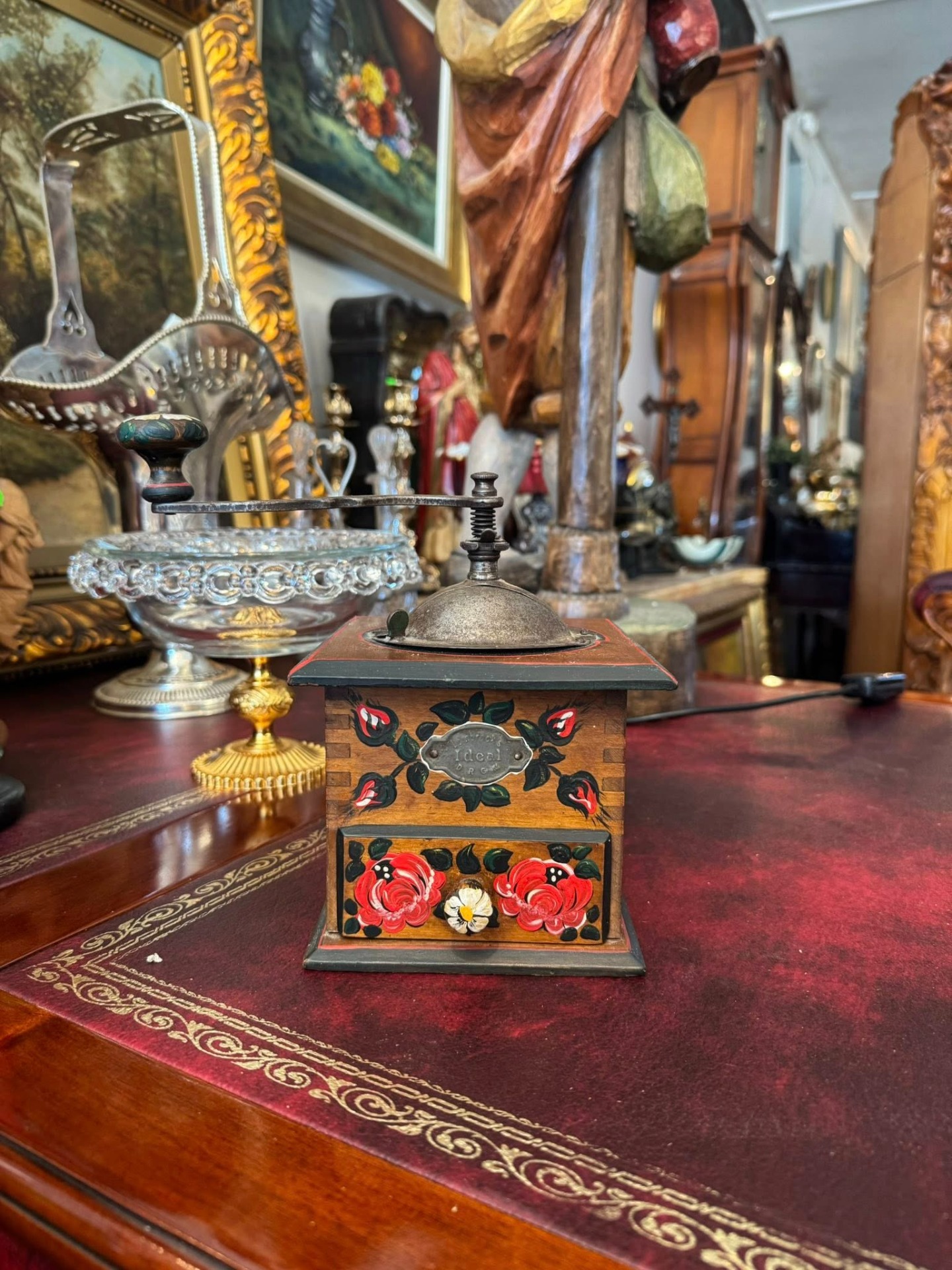 Râșniță de cafea vintage, realizată din lemn pictat manual în stil Bauernmalerei (pictură populară germană/austriacă), prezentând trandafiri roșii vibranți și boboci pe un fundal galben-miere, cu margini negre accentuate.