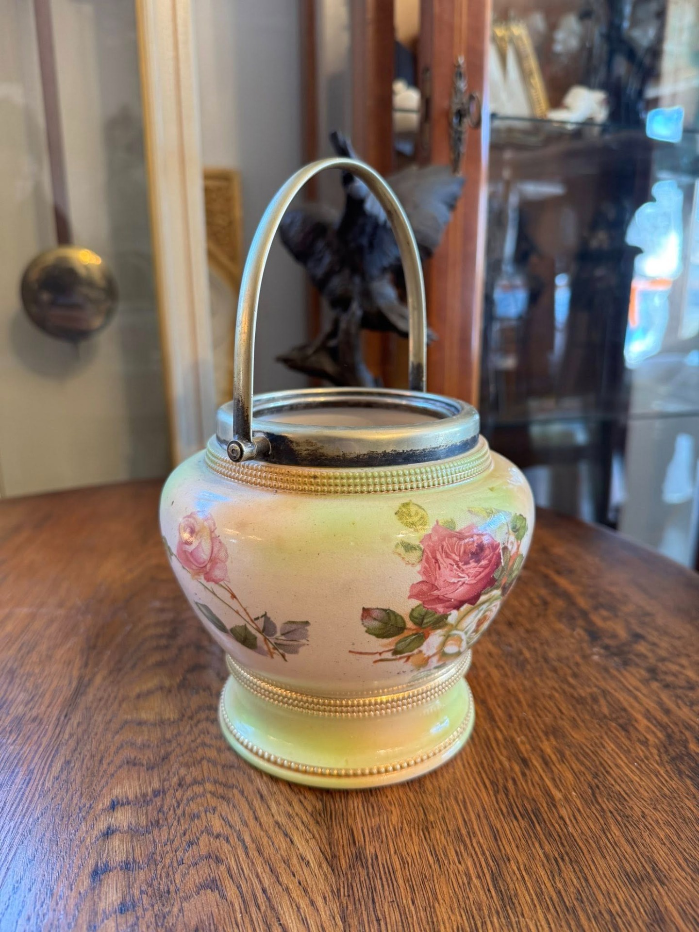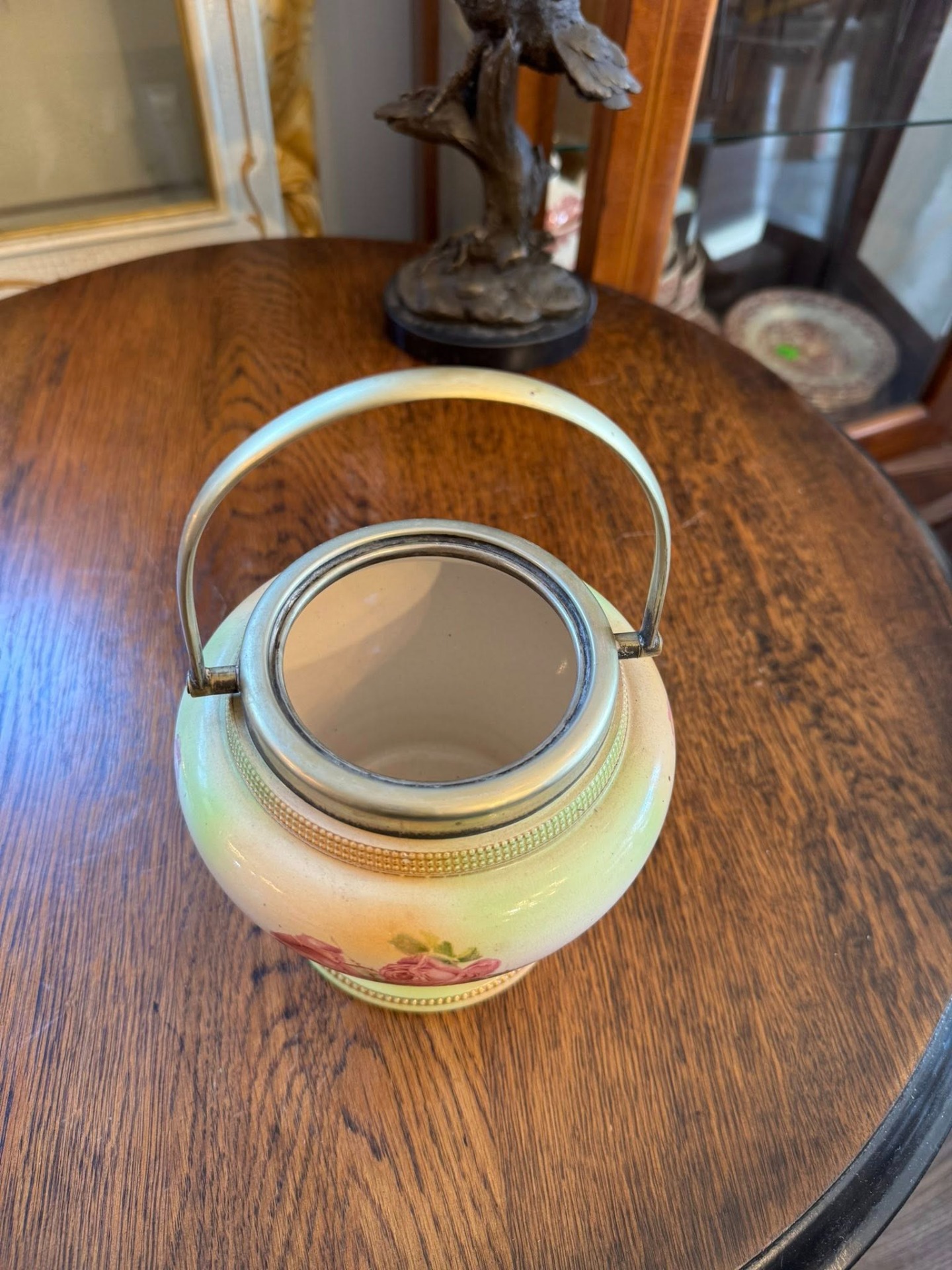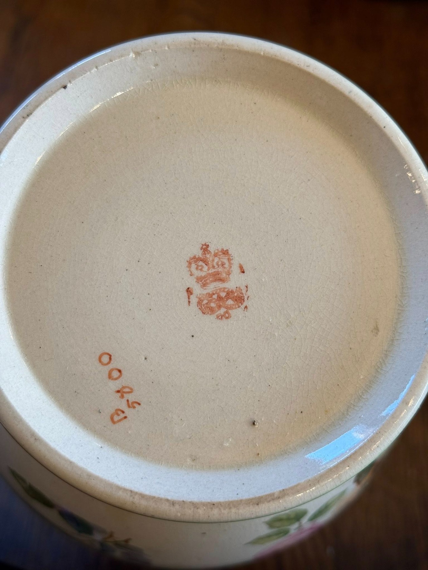 Recipient din porțelan decorat cu motive florale (cel mai probabil un vas de biscuiți sau zaharniță), cu un mâner metalic. Pe spatele vasului se observă o ștampilă roșie cu o coroană regală și inițiale. Aceasta este marca Royal Worcester (Marea Britanie), una dintre cele mai vechi și prestigioase manufacturi de porțelan englezesc.