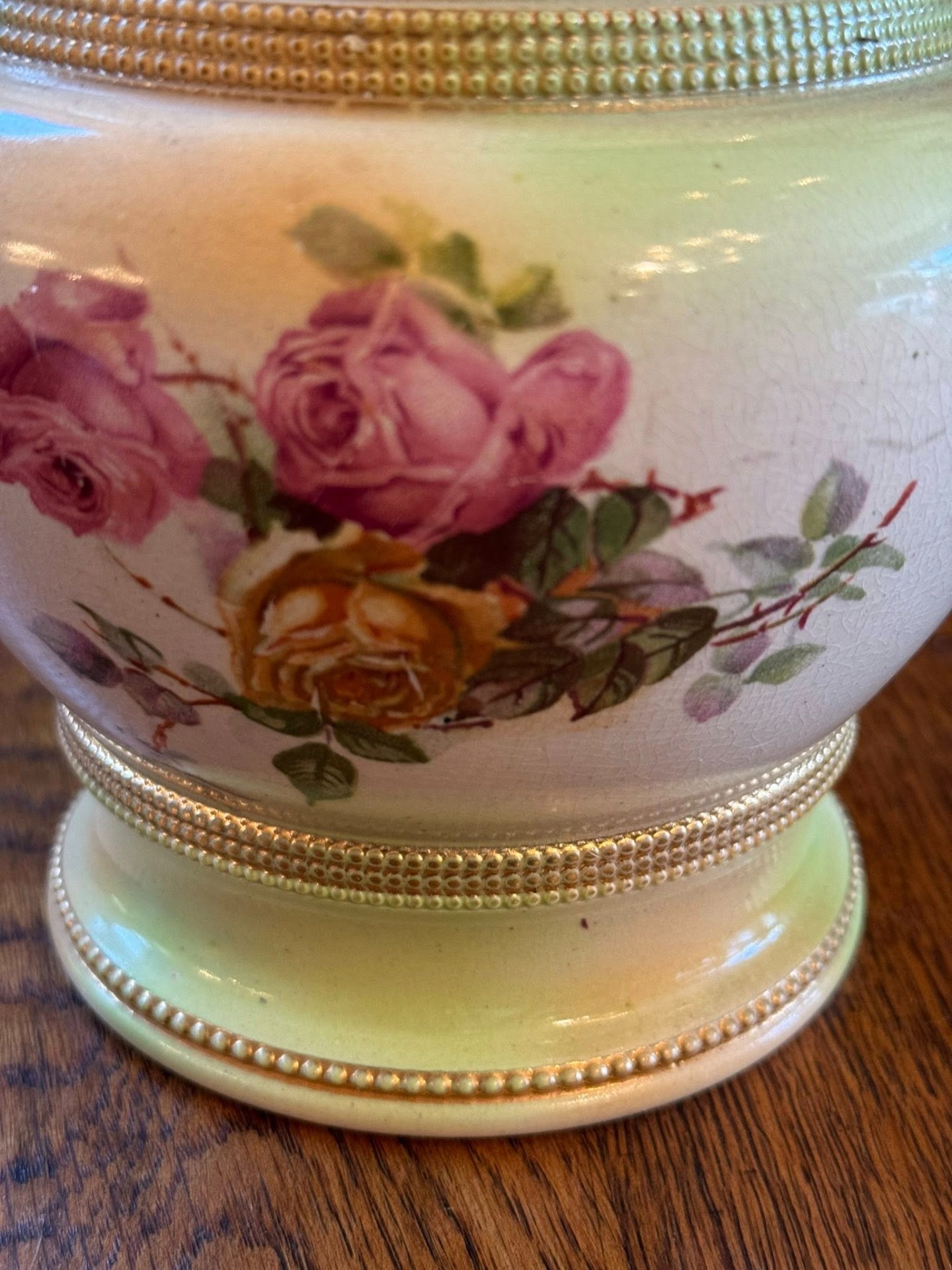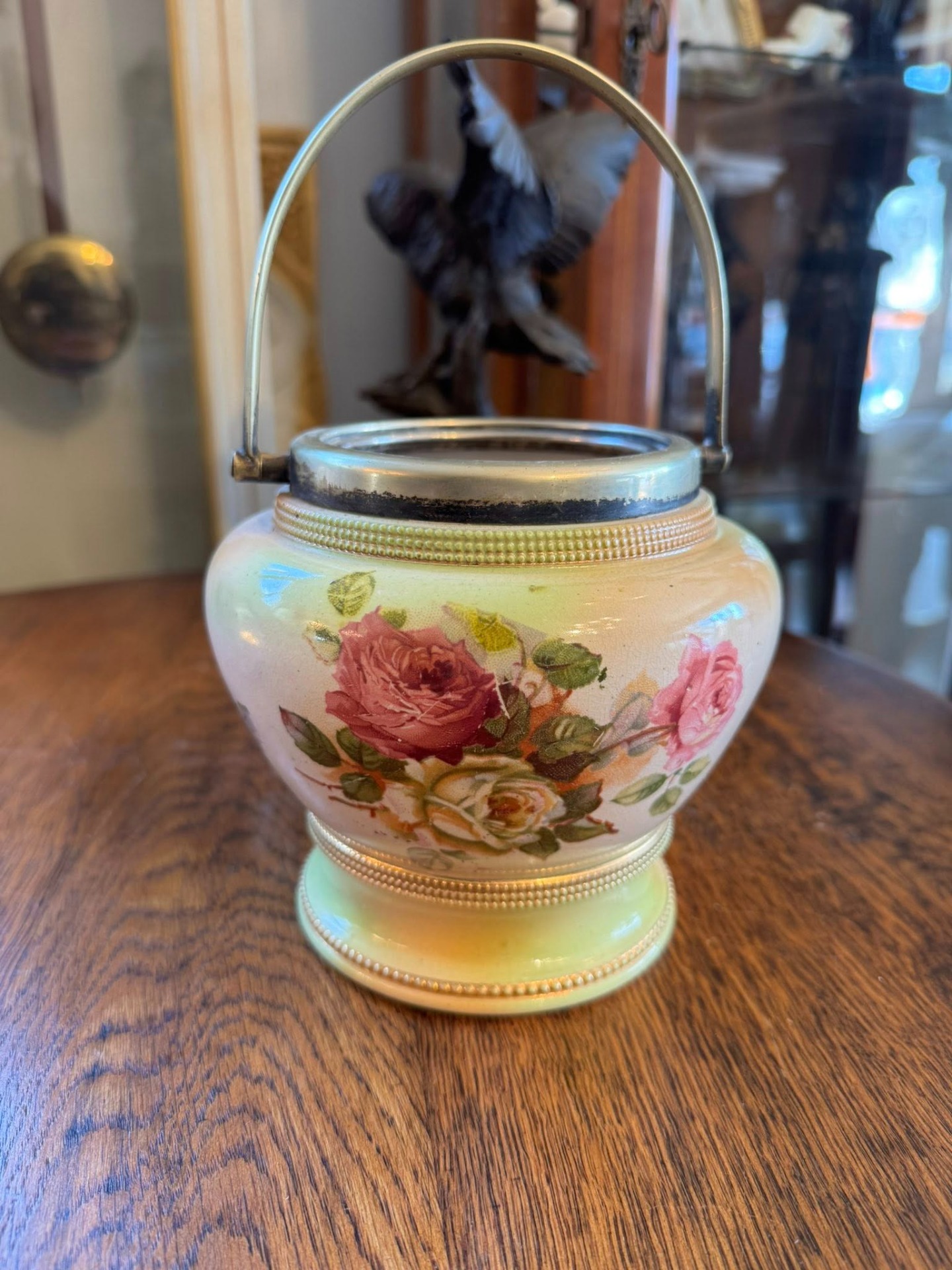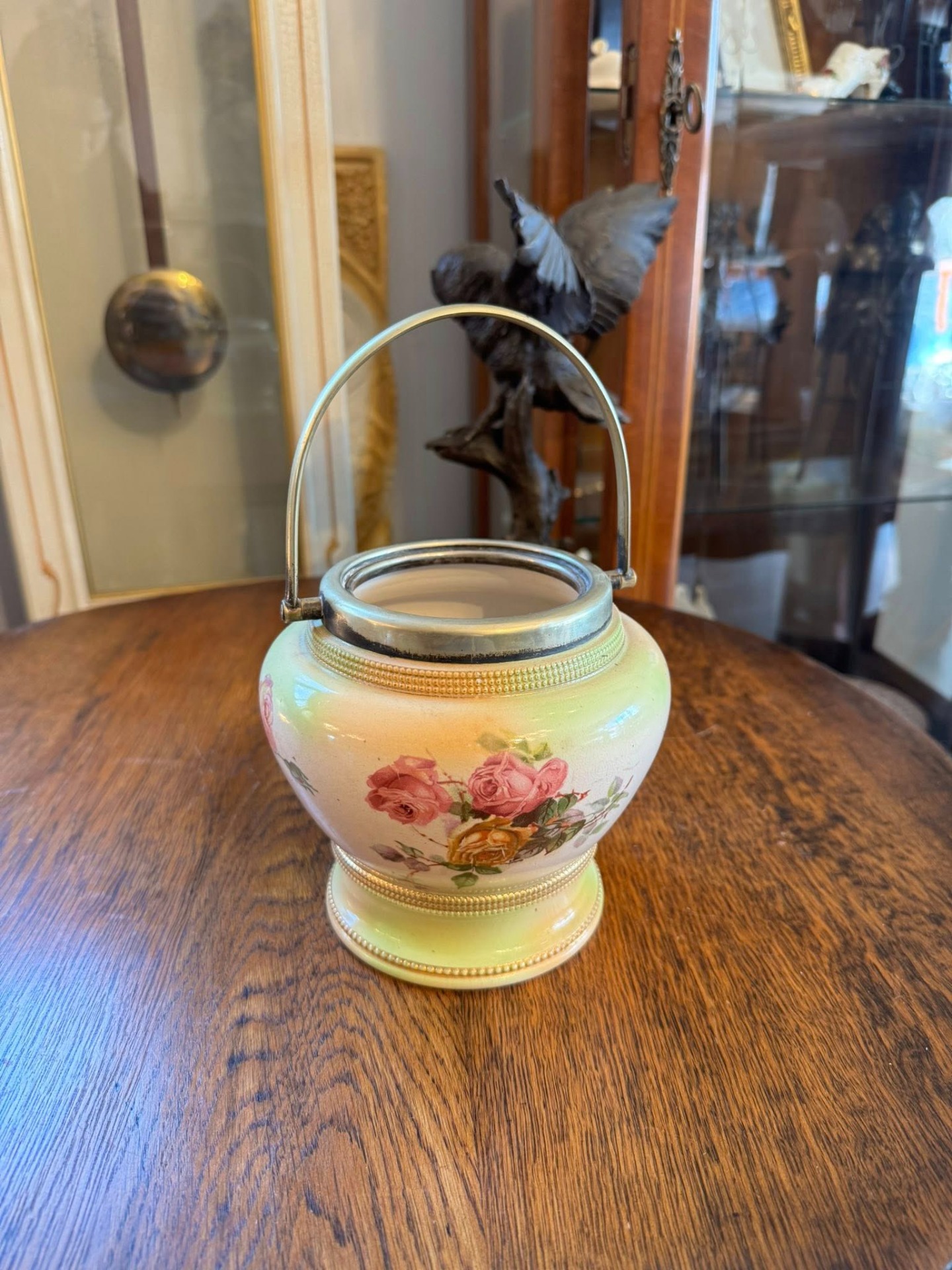 Recipient din porțelan decorat cu motive florale (cel mai probabil un vas de biscuiți sau zaharniță), cu un mâner metalic. Pe spatele vasului se observă o ștampilă roșie cu o coroană regală și inițiale. Aceasta este marca Royal Worcester (Marea Britanie), una dintre cele mai vechi și prestigioase manufacturi de porțelan englezesc.