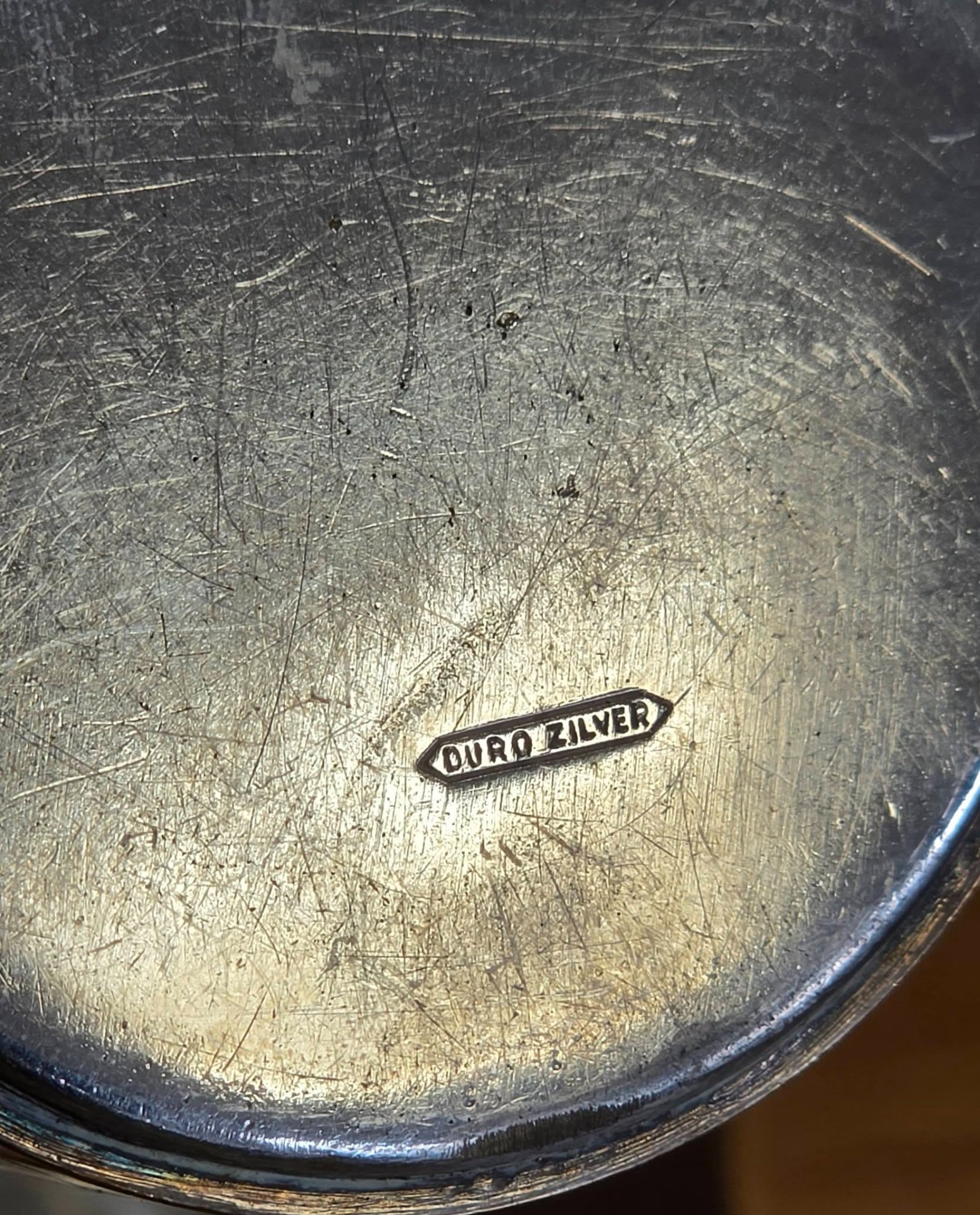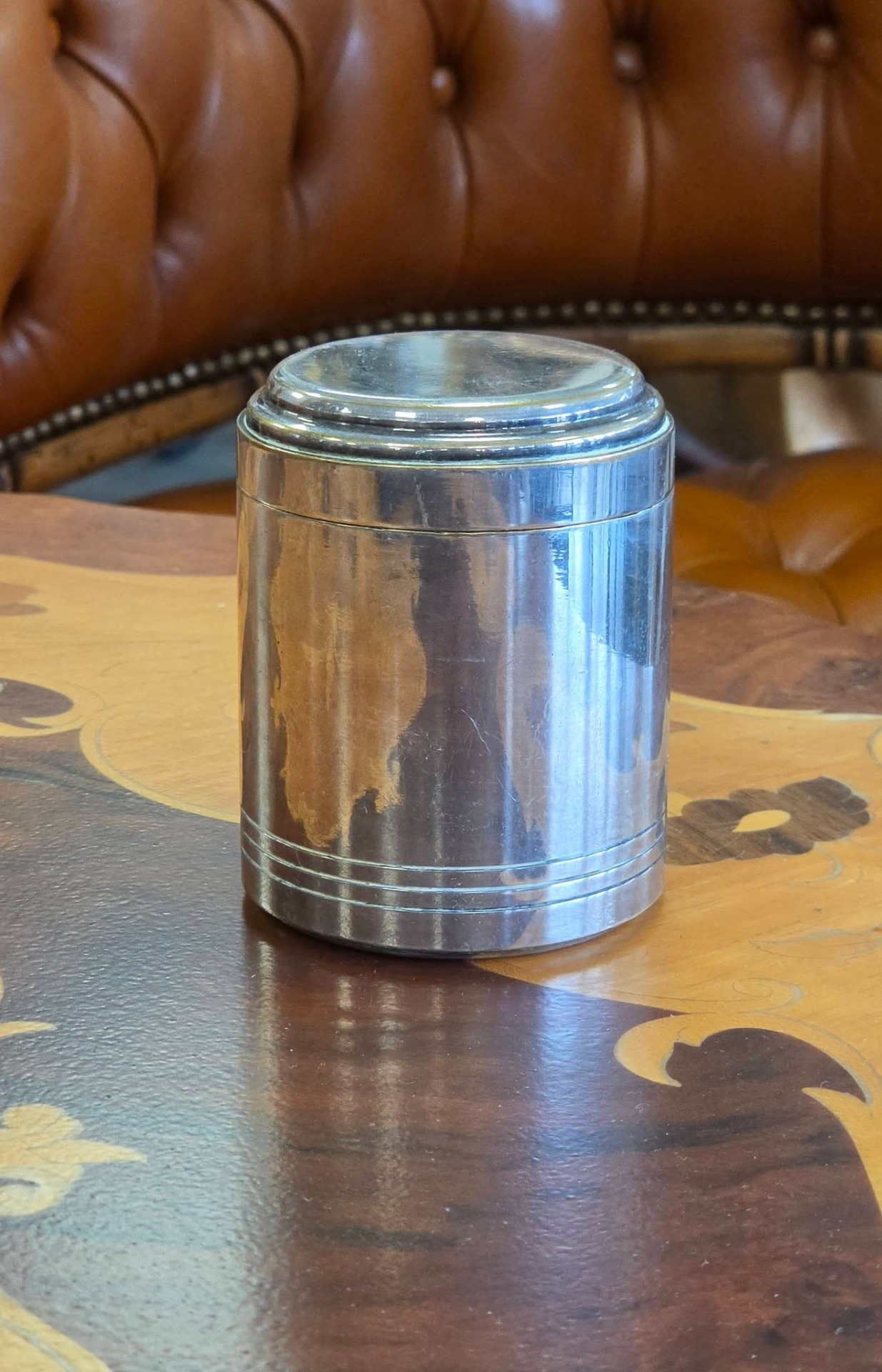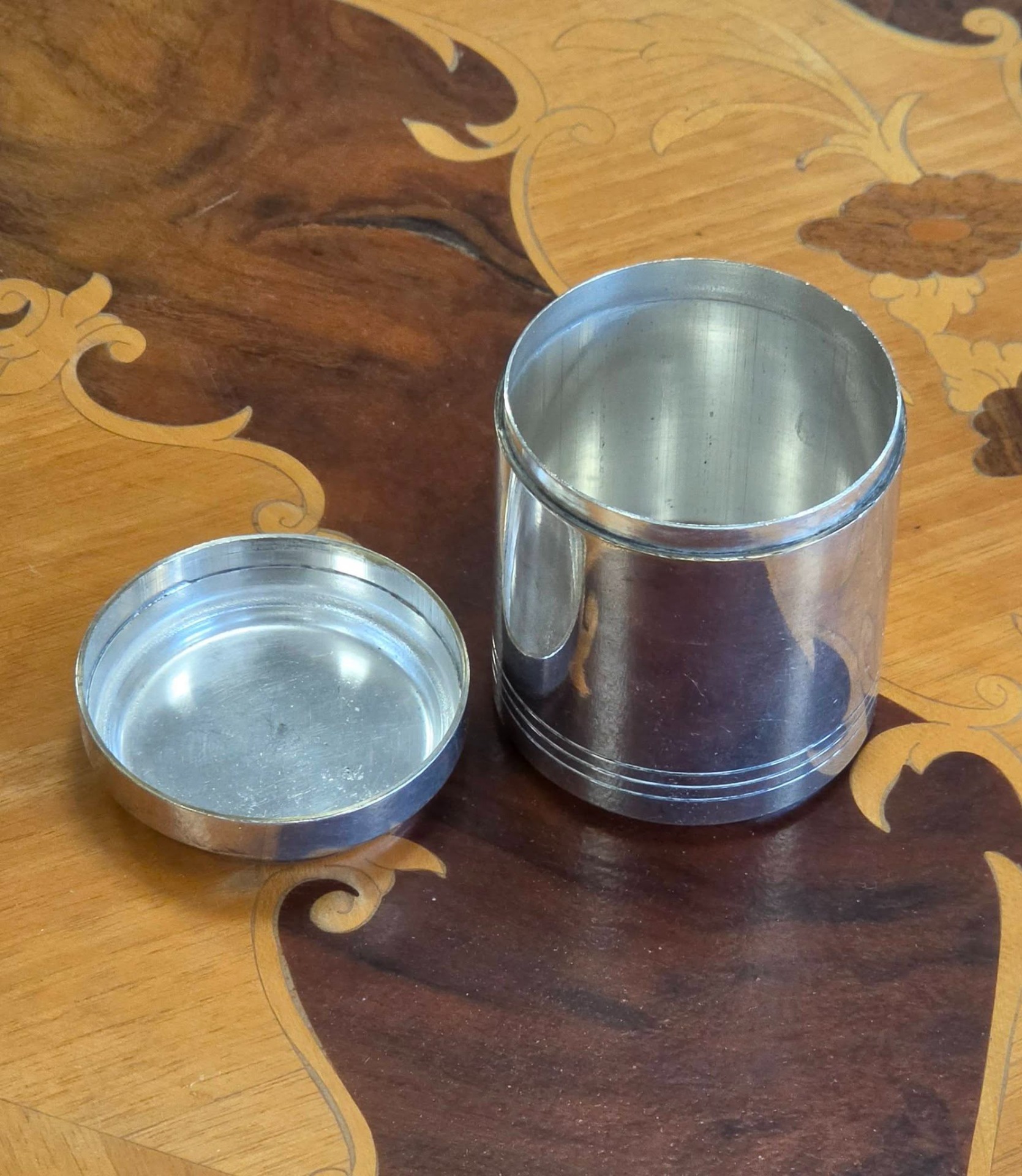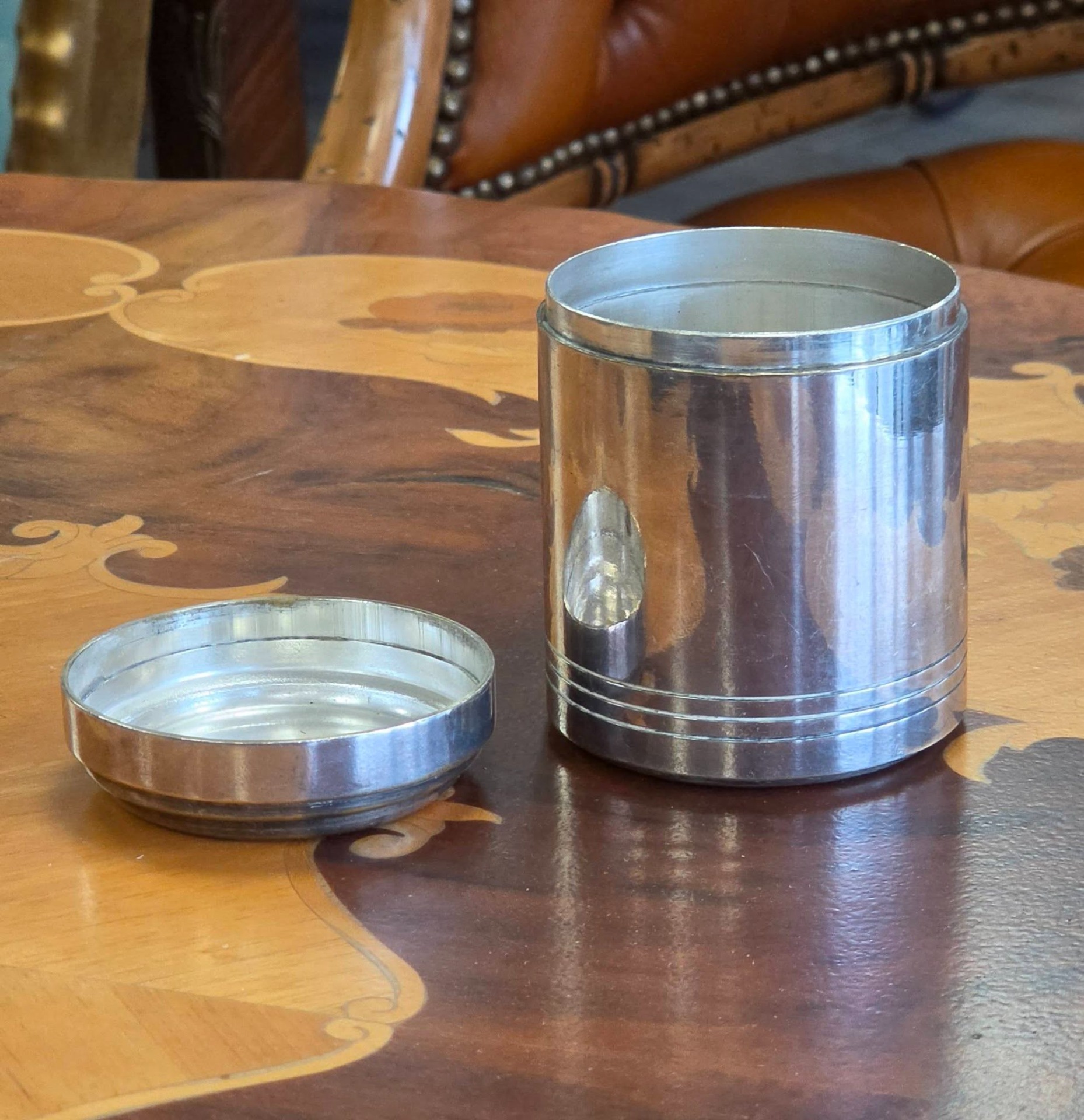 Recipient vechi pentru condimente din metal argintat, cu capac (anii 1940-1950, Olanda).