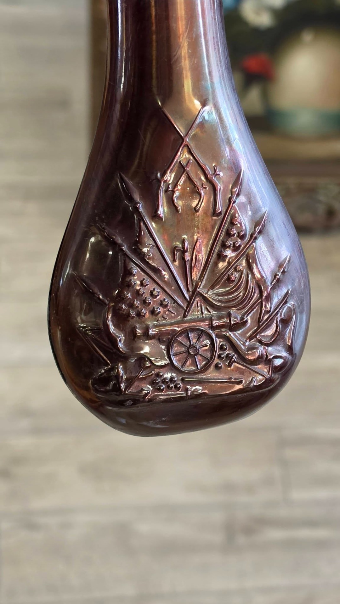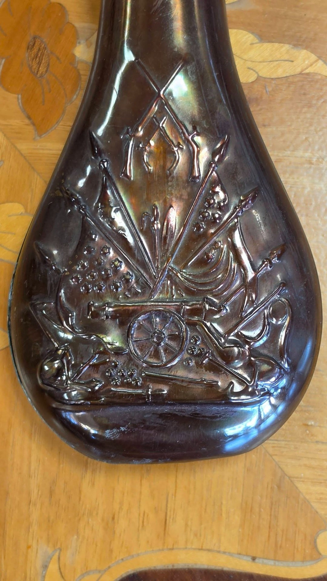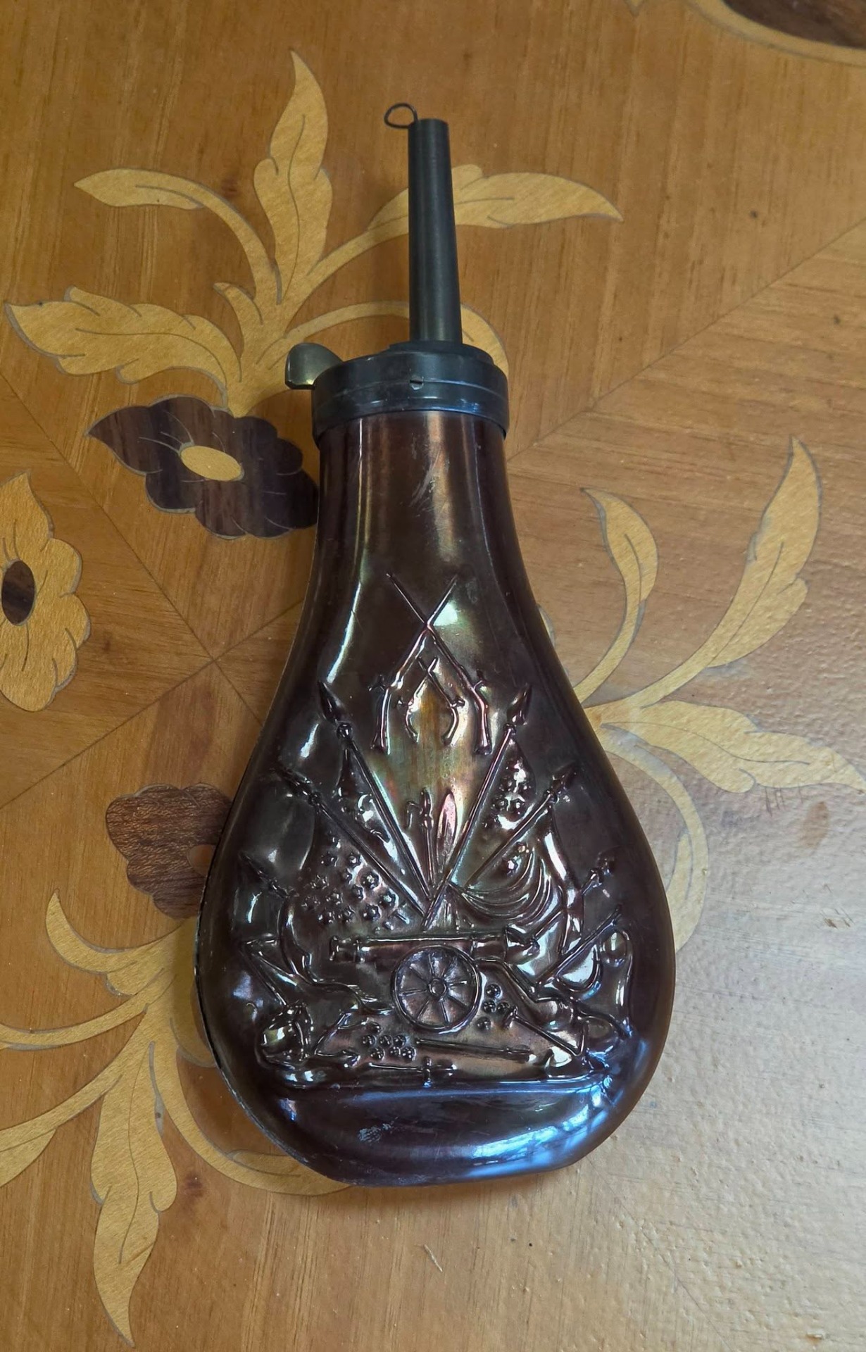 Recipient vechi pentru praf de pușcă (powder flask), din cupru, specific Războiului Civil American, decorat cu tunuri, steaguri și puști încrucișate.