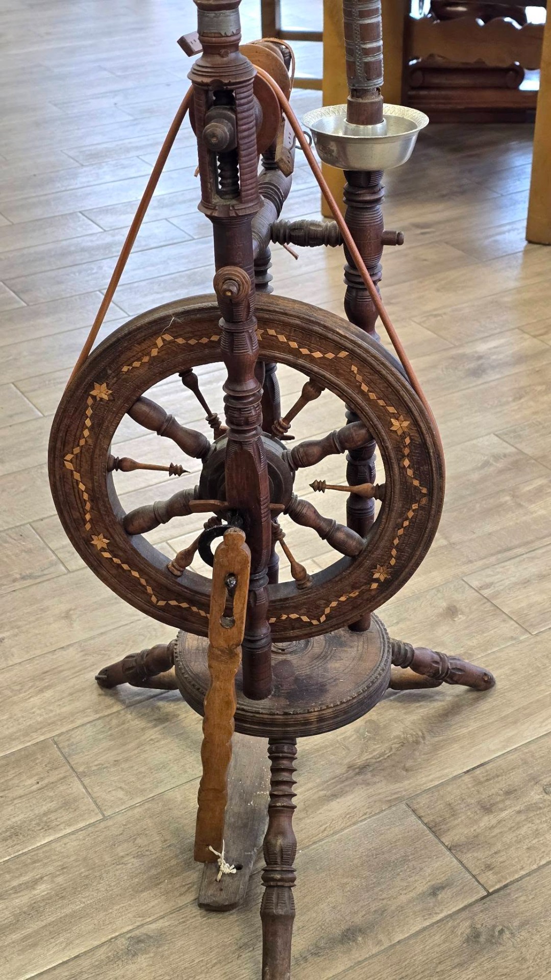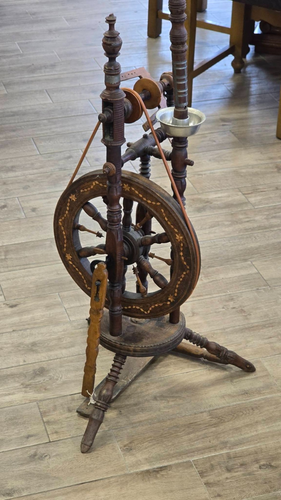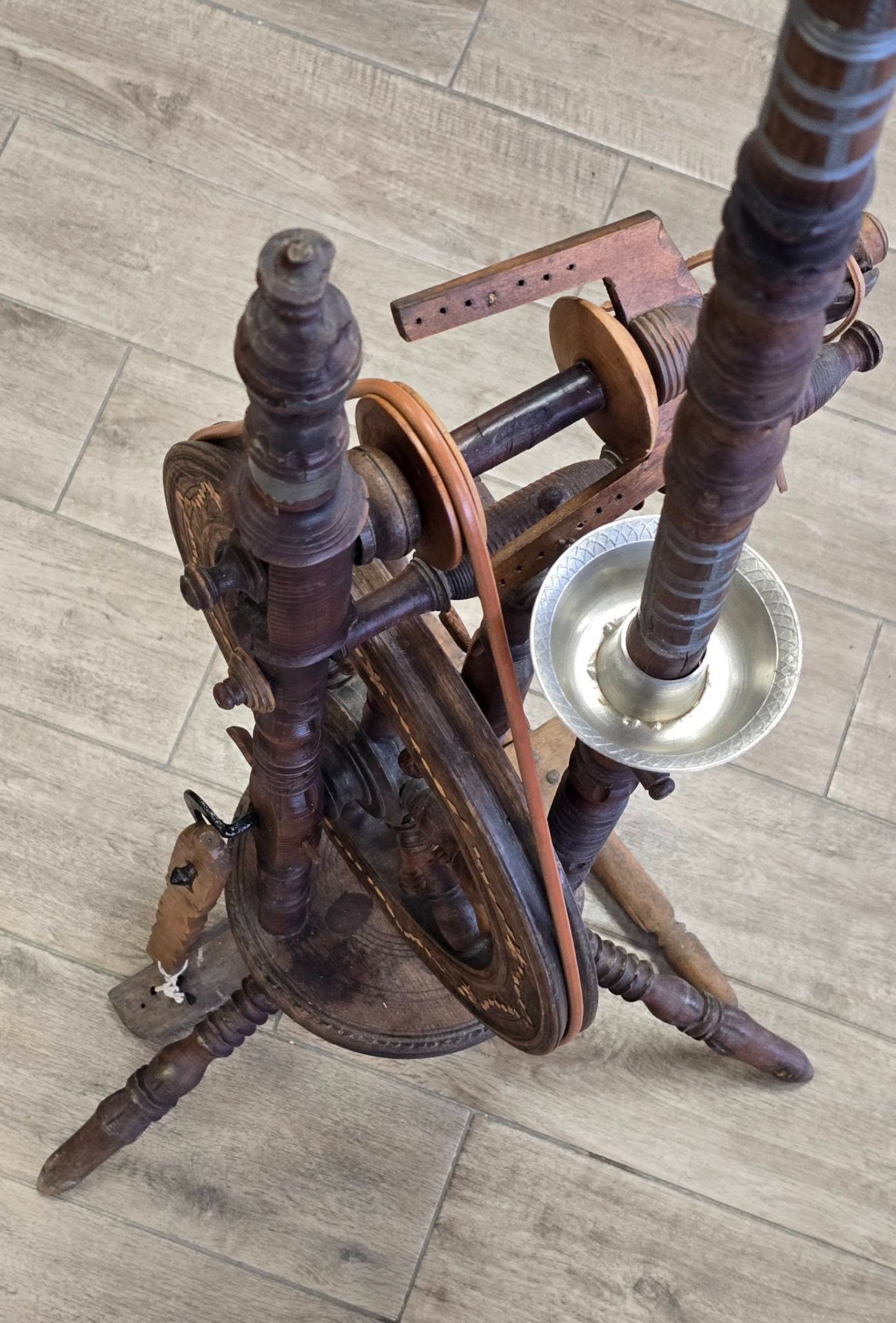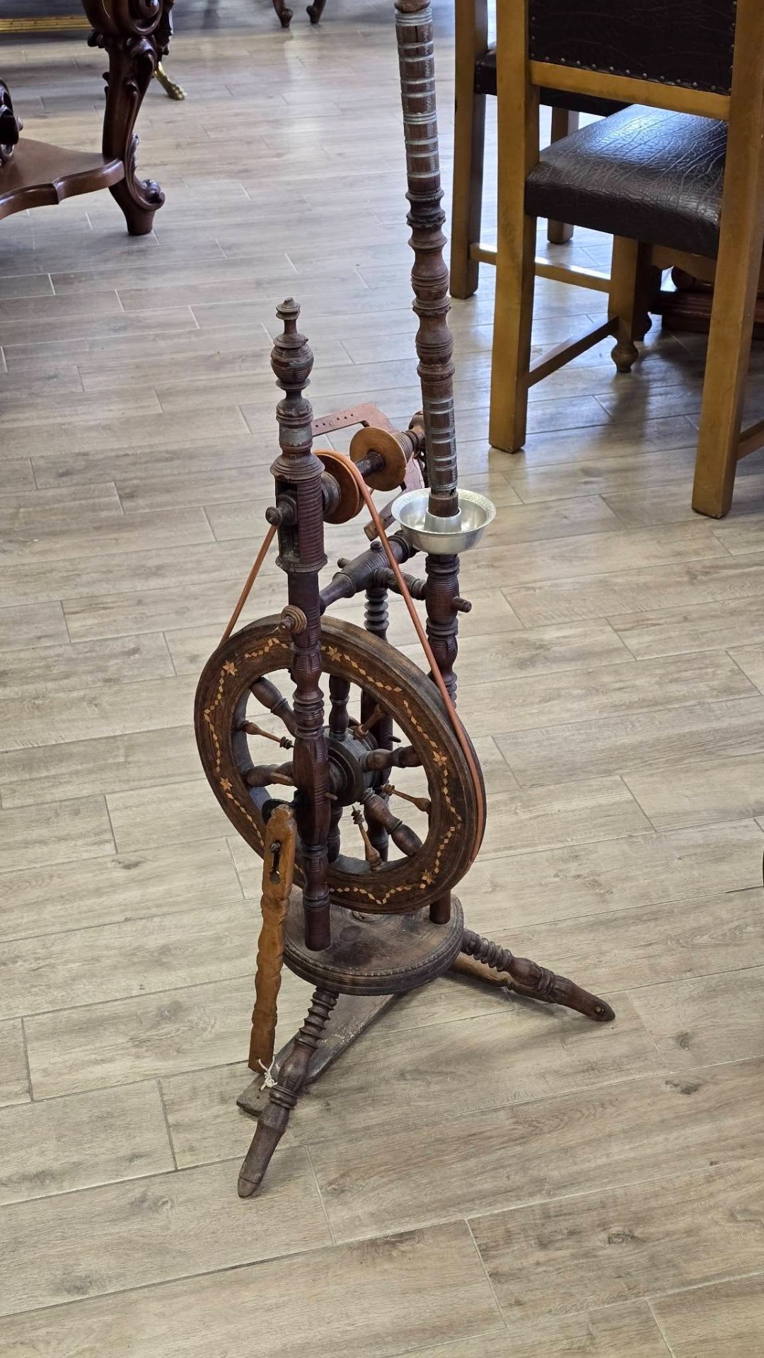 Roată de tors verticală (model "Castle Wheel"), o piesă autentică de colecție, ideală pentru decor rustic, pensiuni sau colecționari de artă populară, cu