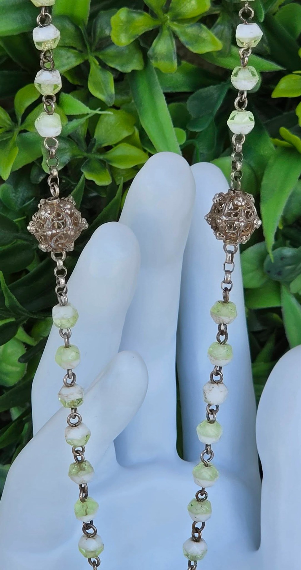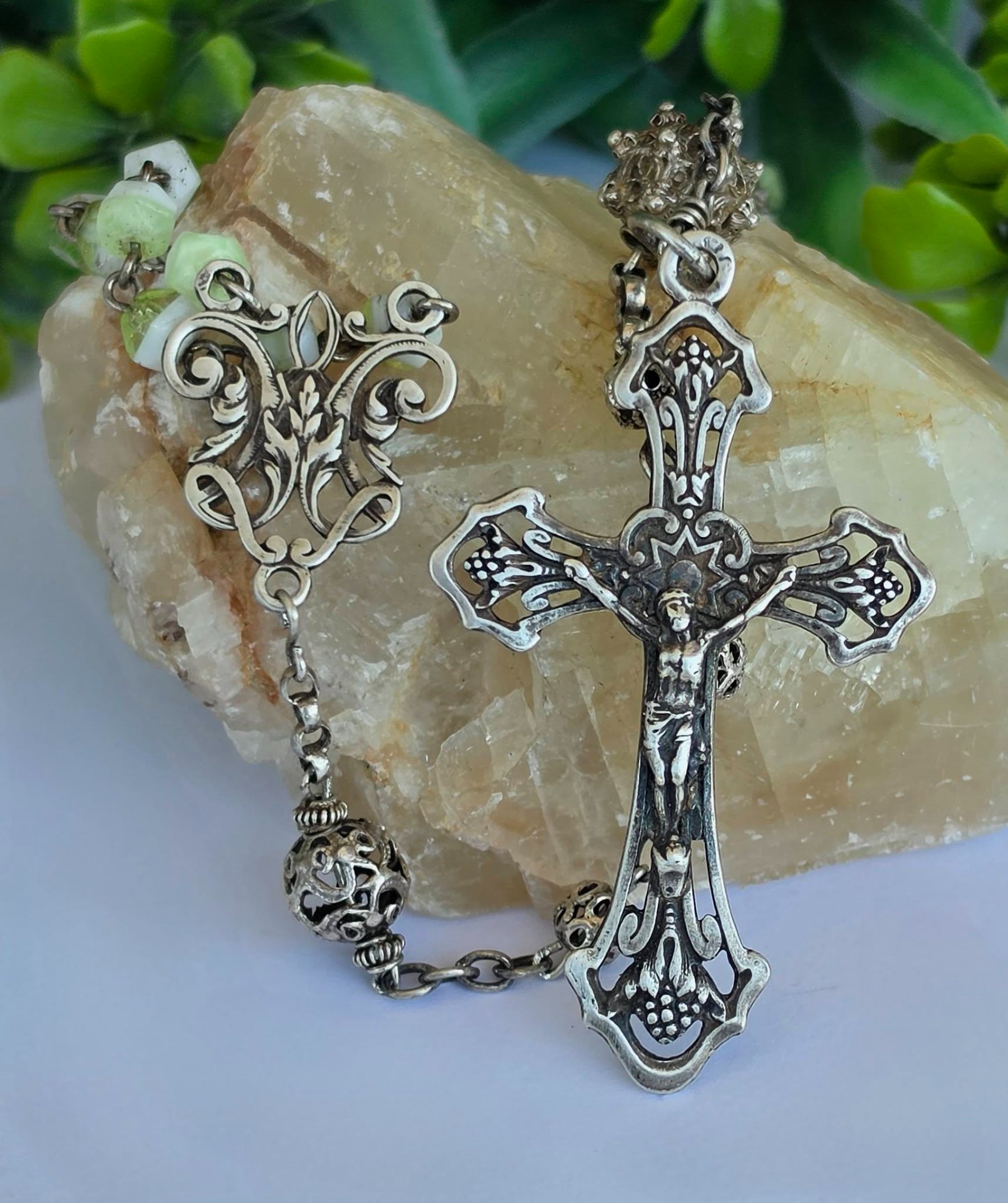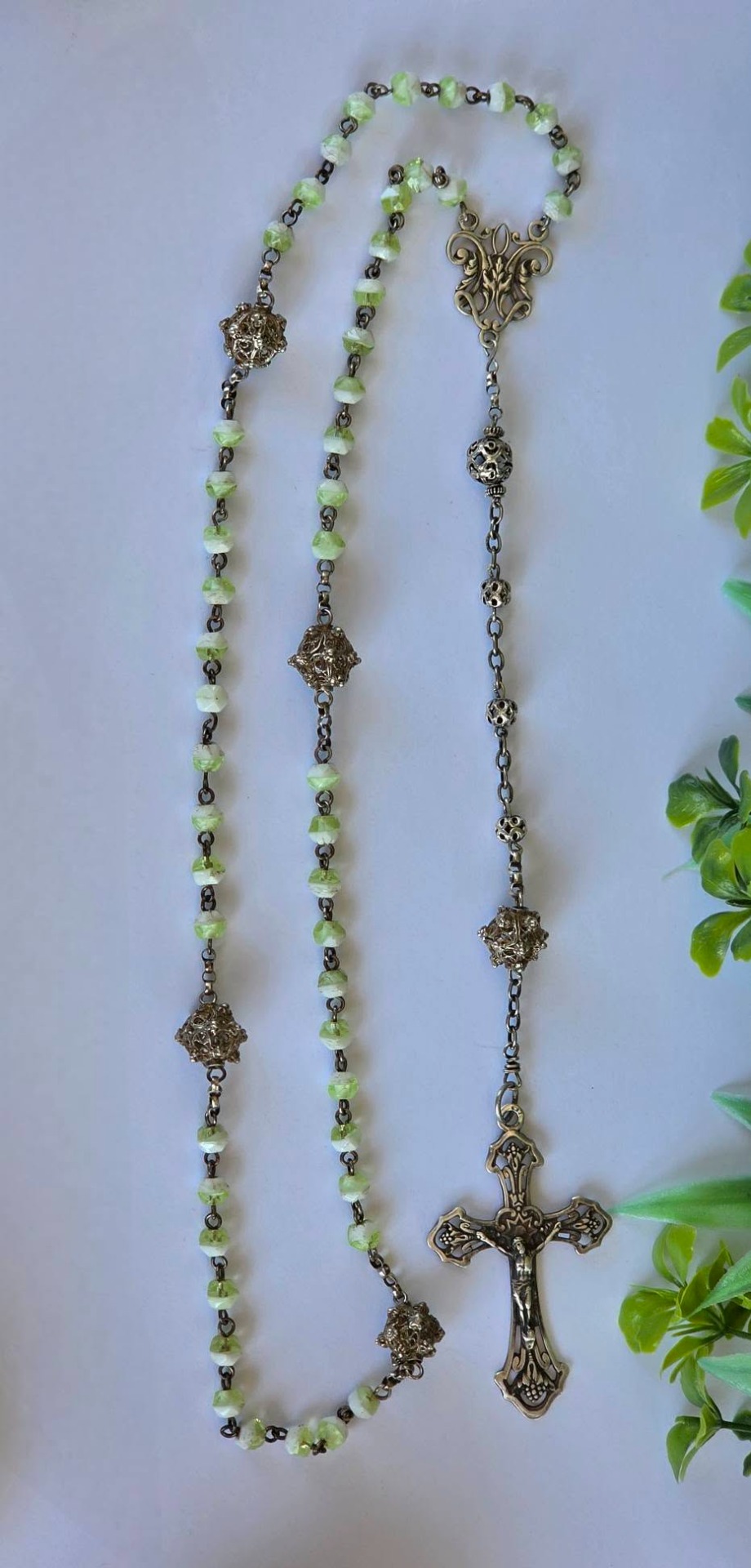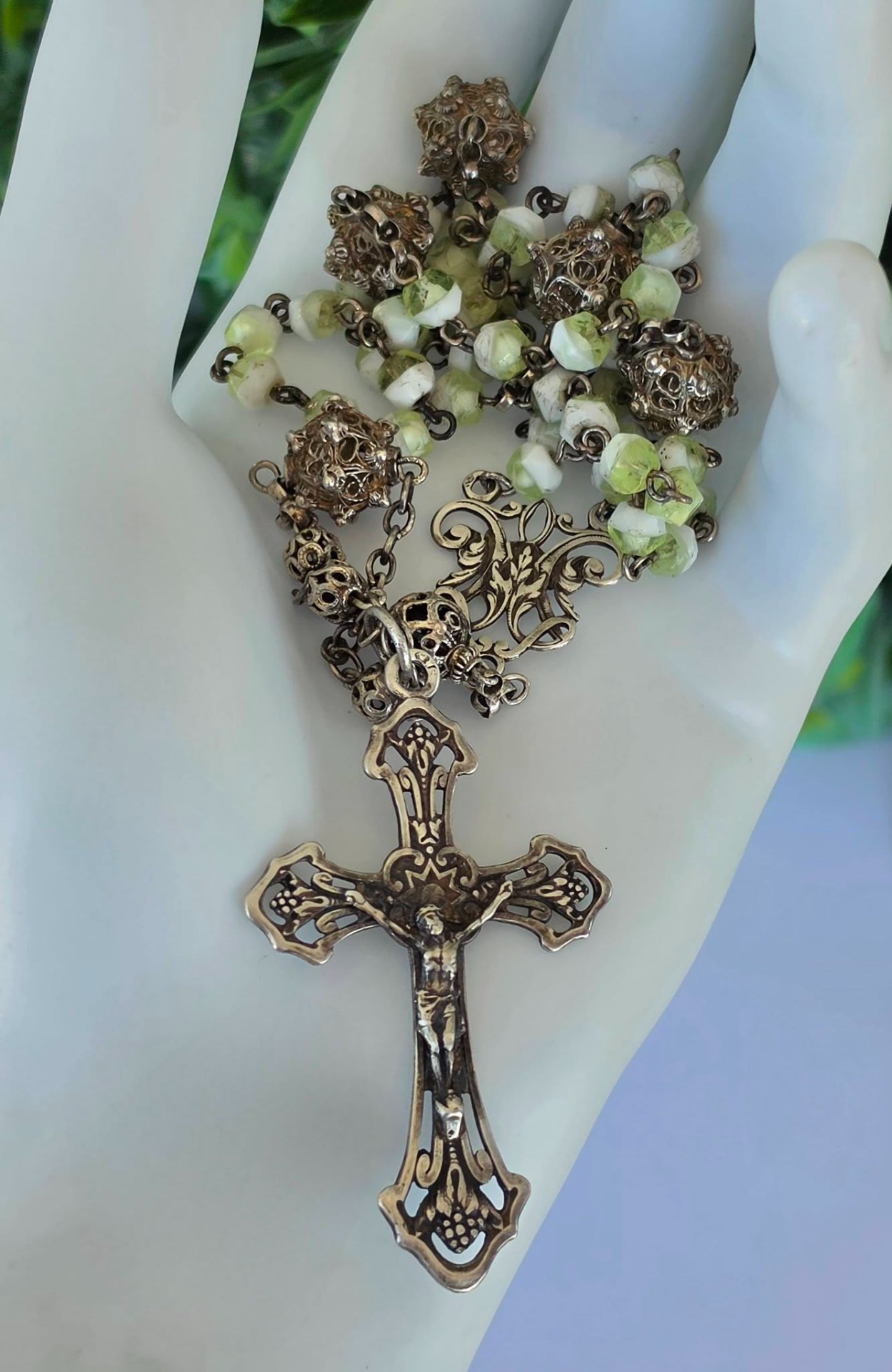 Rozariu vechi din argint, 5 decade, cu mărgele din sticlă Bohemia, mărgele filigranate și crucifix "Corpus Christi" (a doua jum.a sec.XIX, Franța).