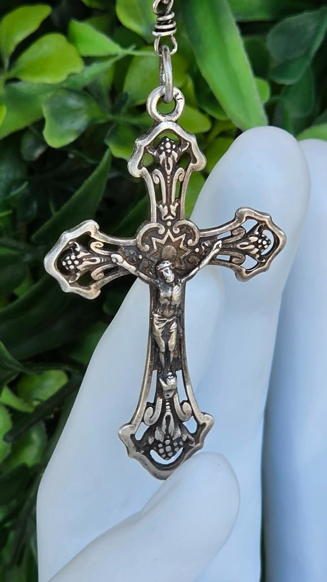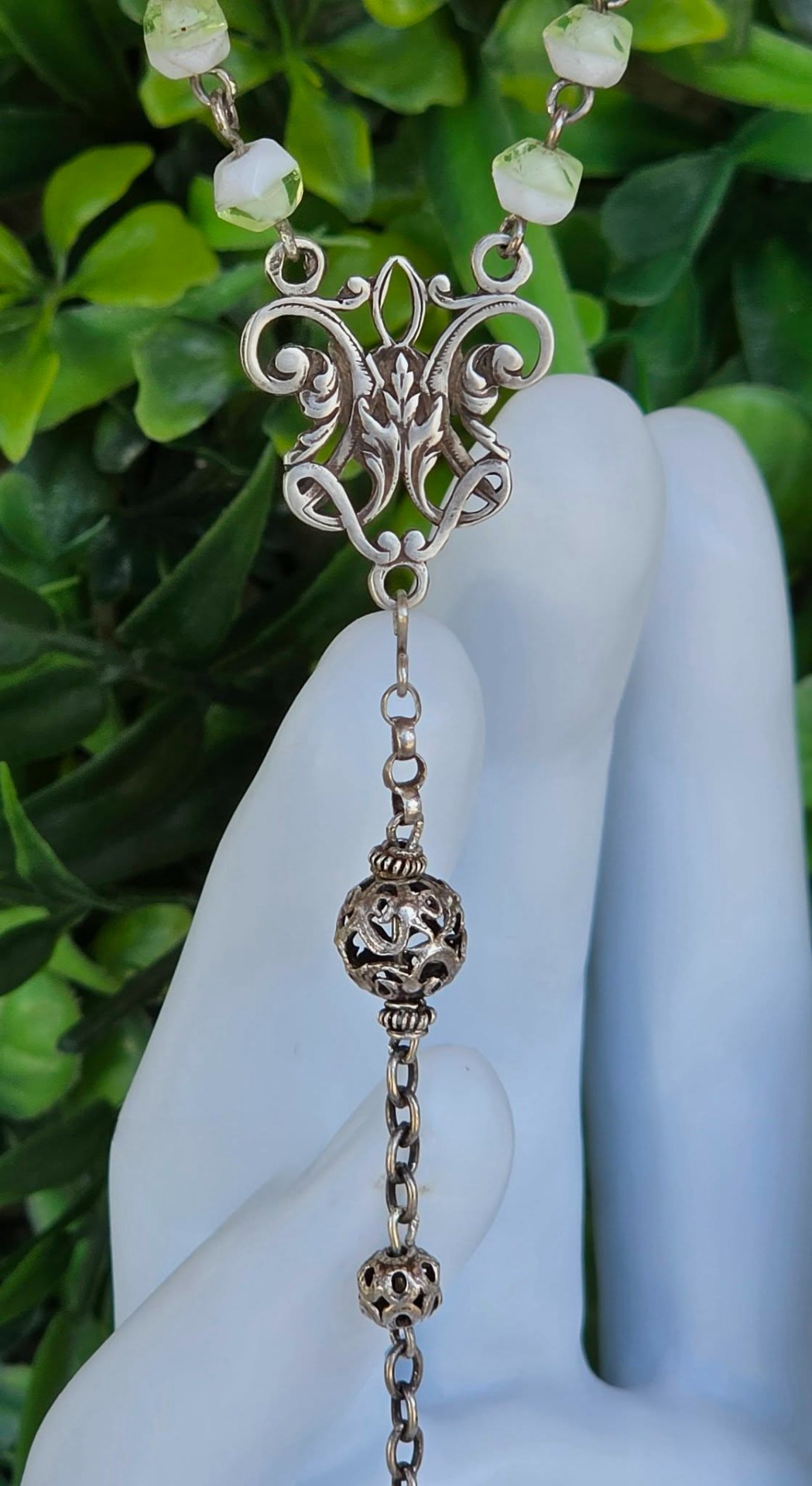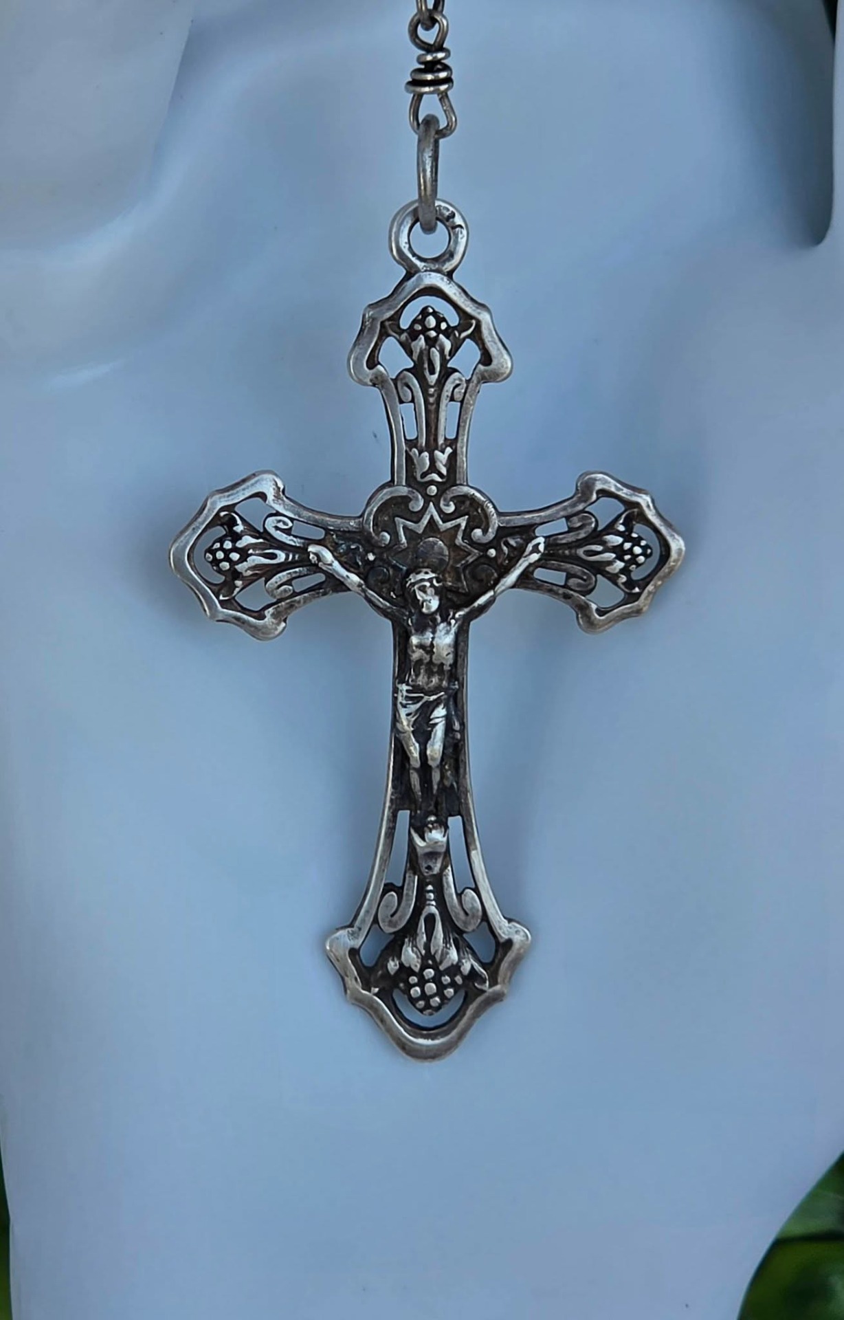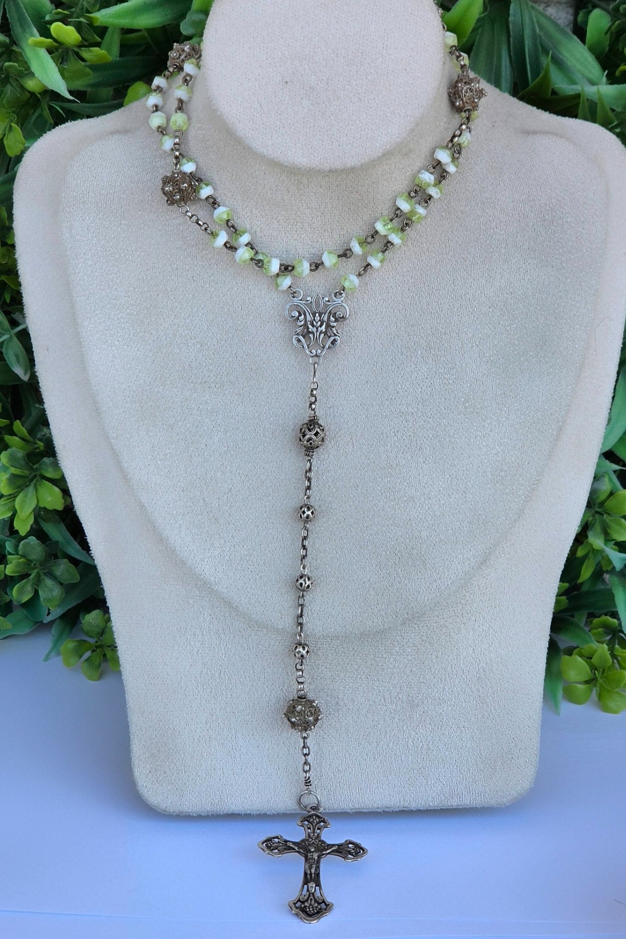 Rozariu vechi din argint, 5 decade, cu mărgele din sticlă Bohemia, mărgele filigranate și crucifix "Corpus Christi" (a doua jum.a sec.XIX, Franța).