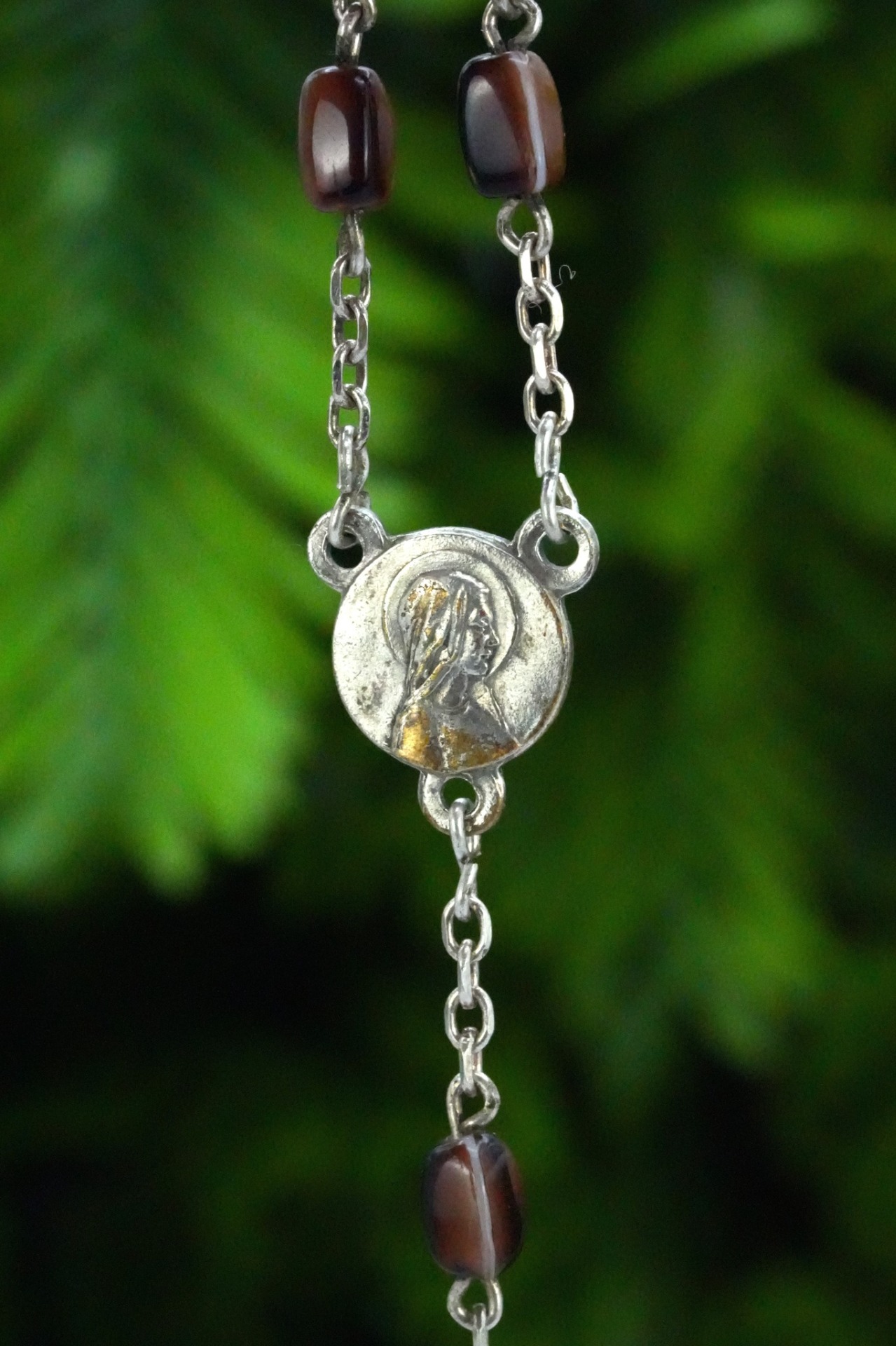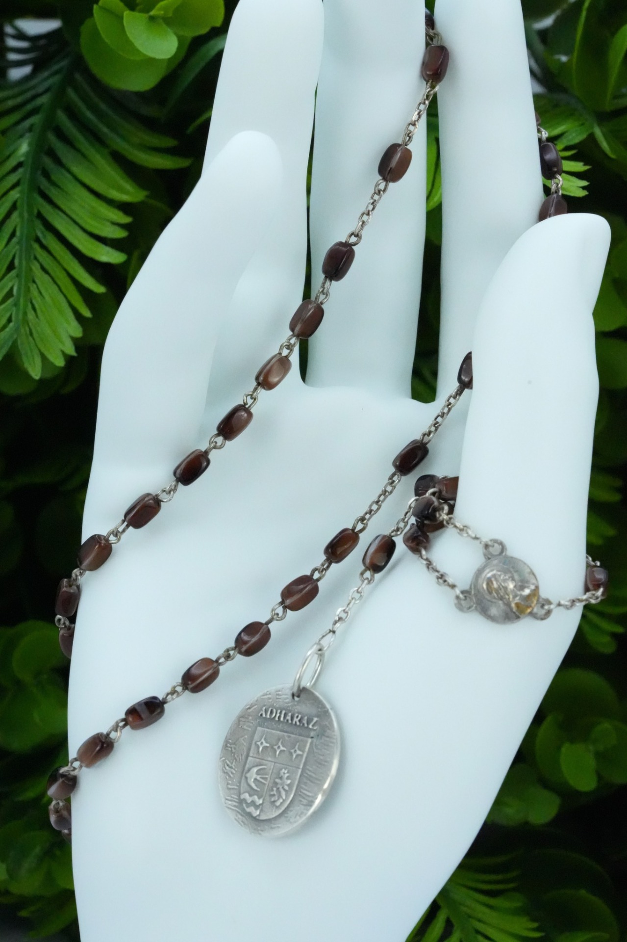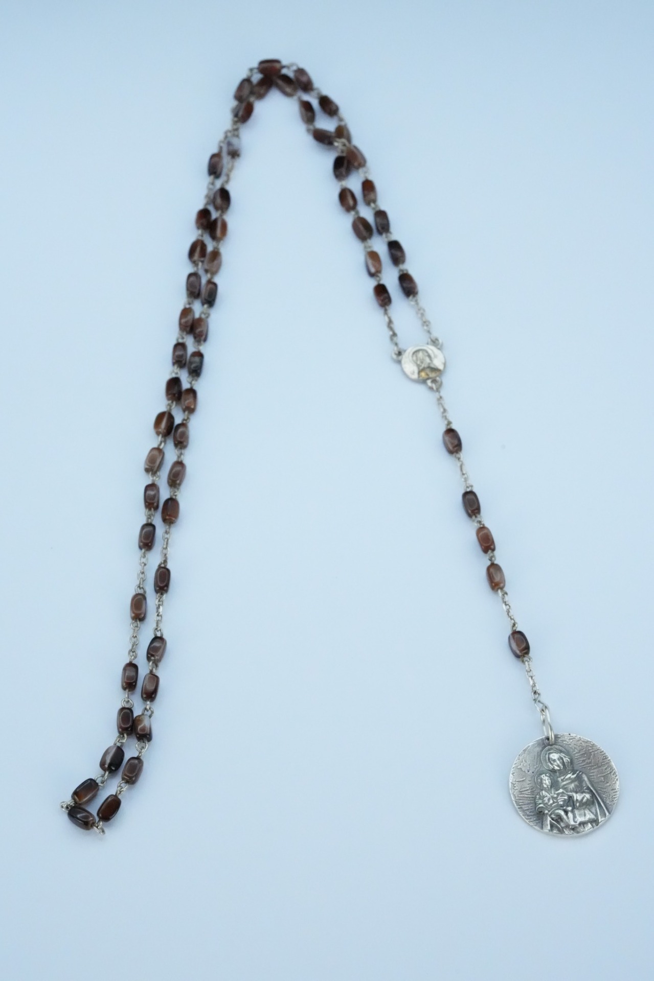 Rozariu vechi din argint și elemente din argint aurit, cu mărgele maro și medalion religios.
