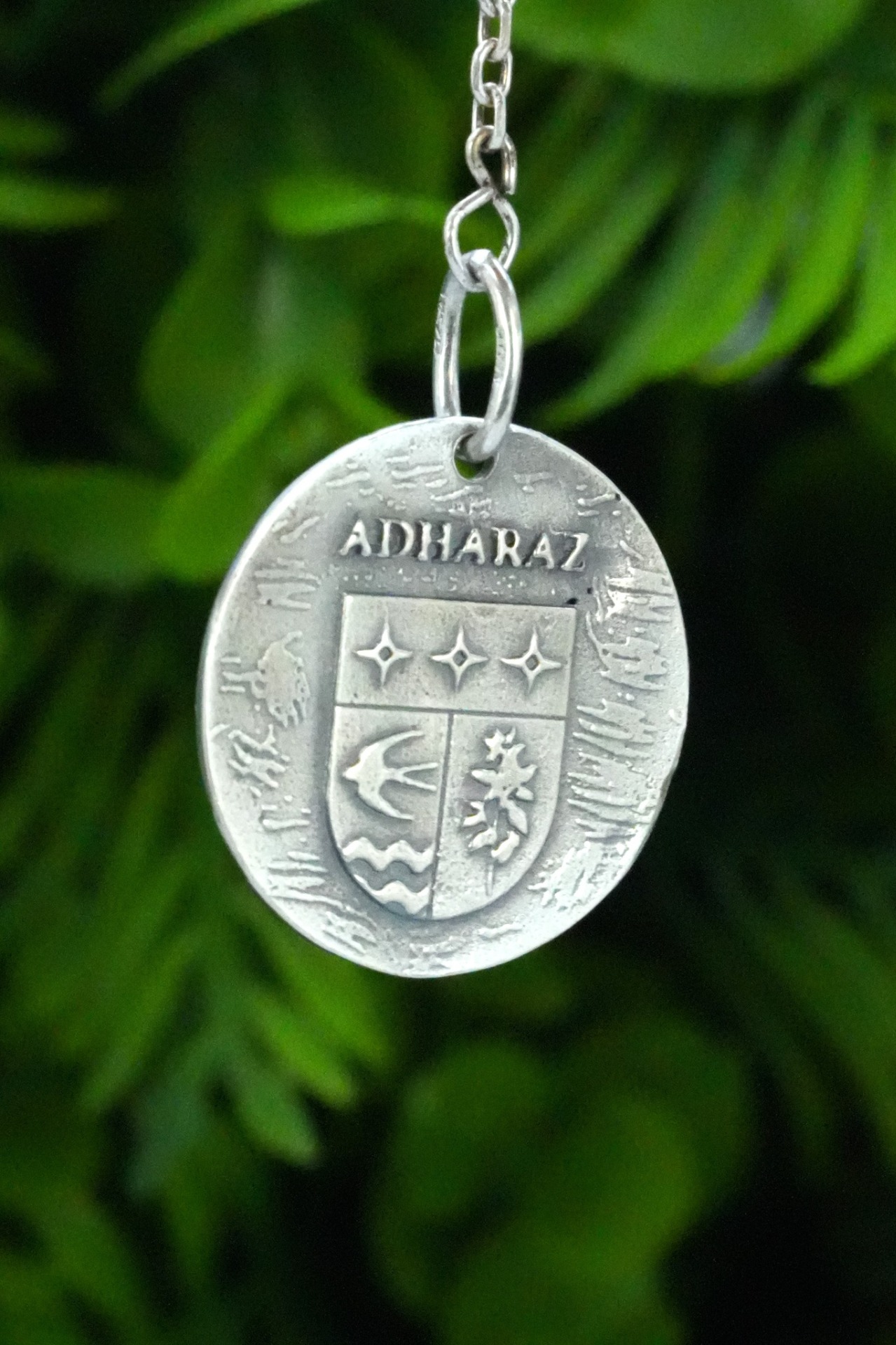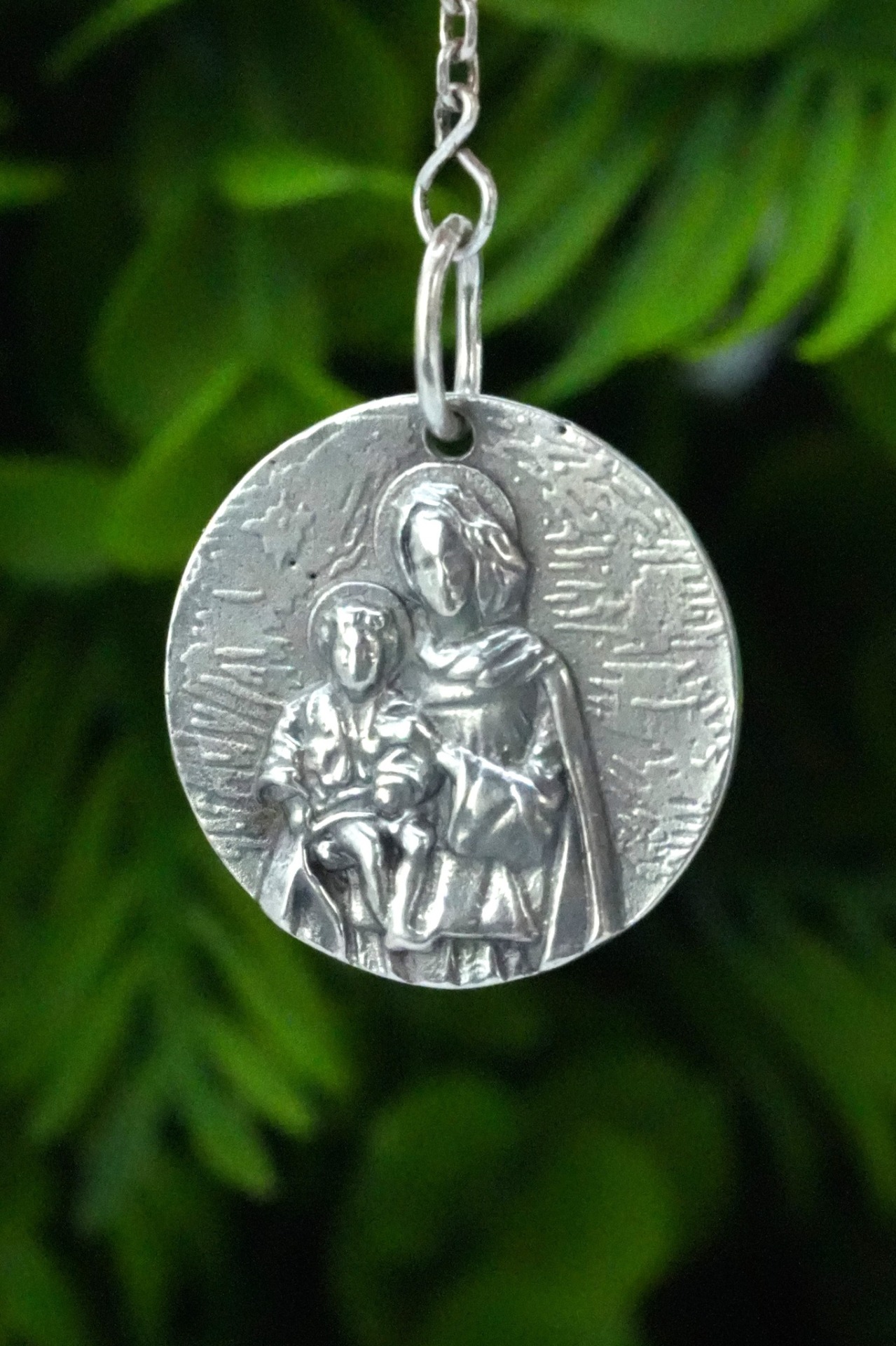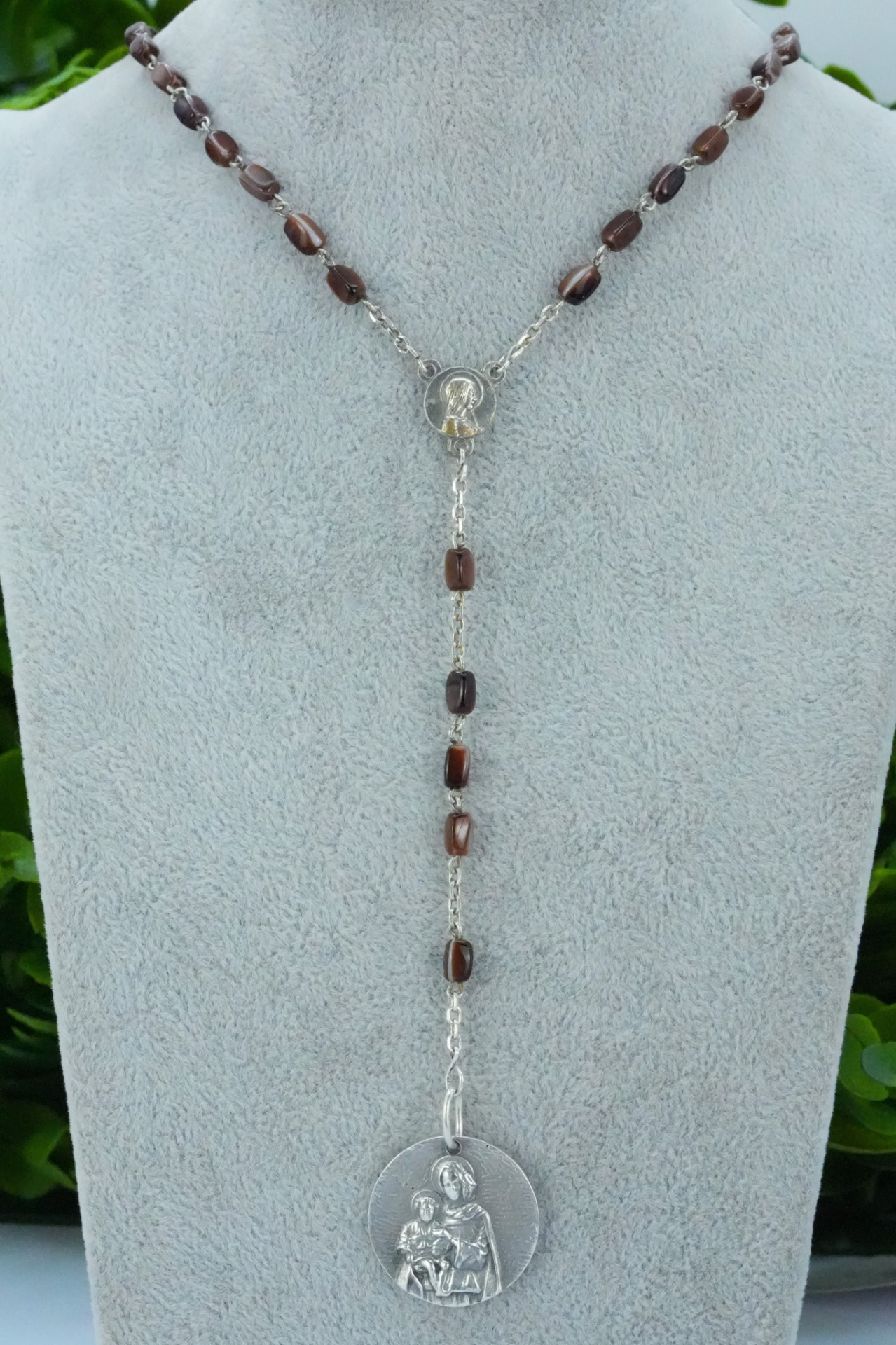 Rozariu vechi din argint și elemente din argint aurit, cu mărgele maro și medalion religios.