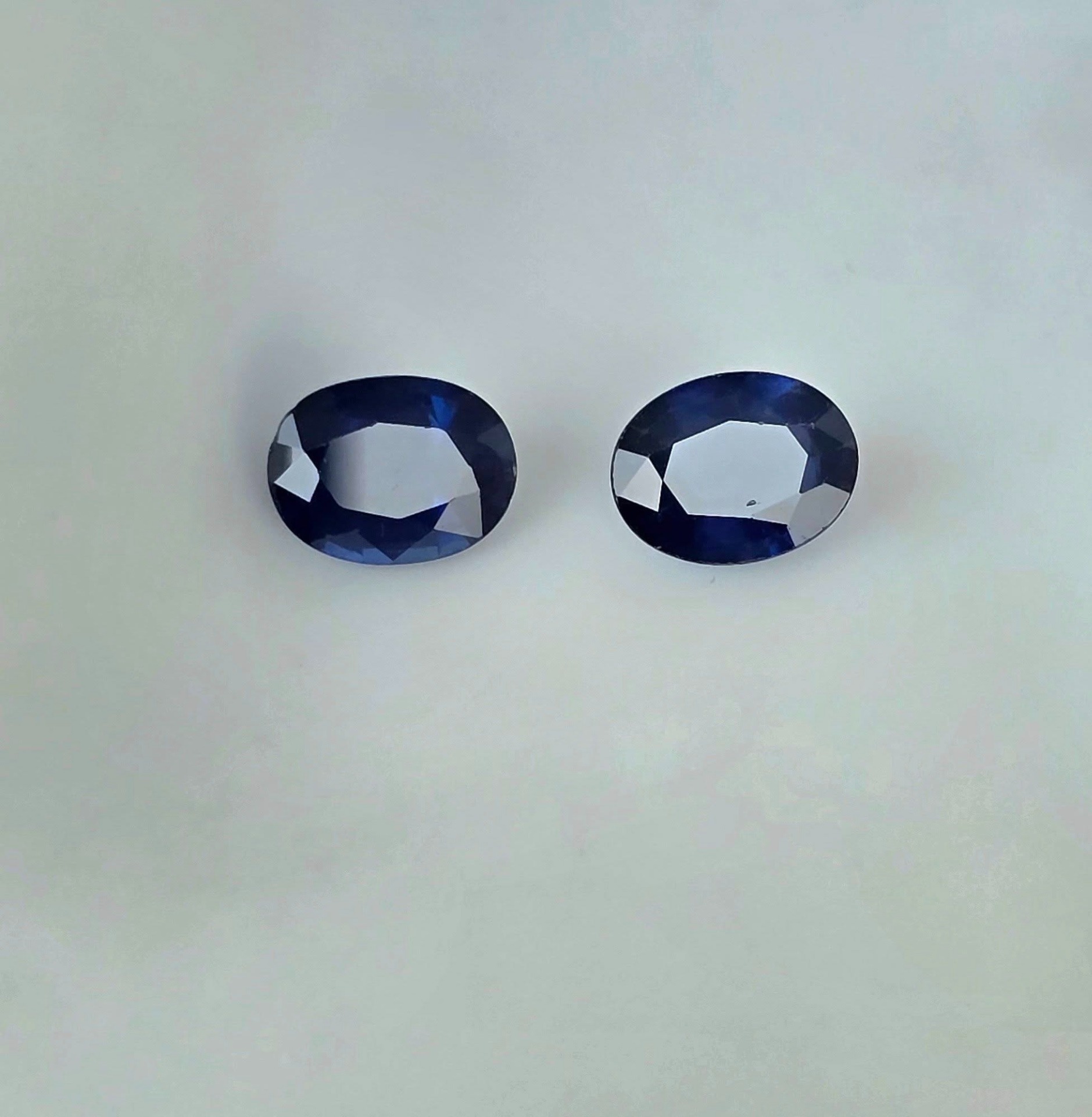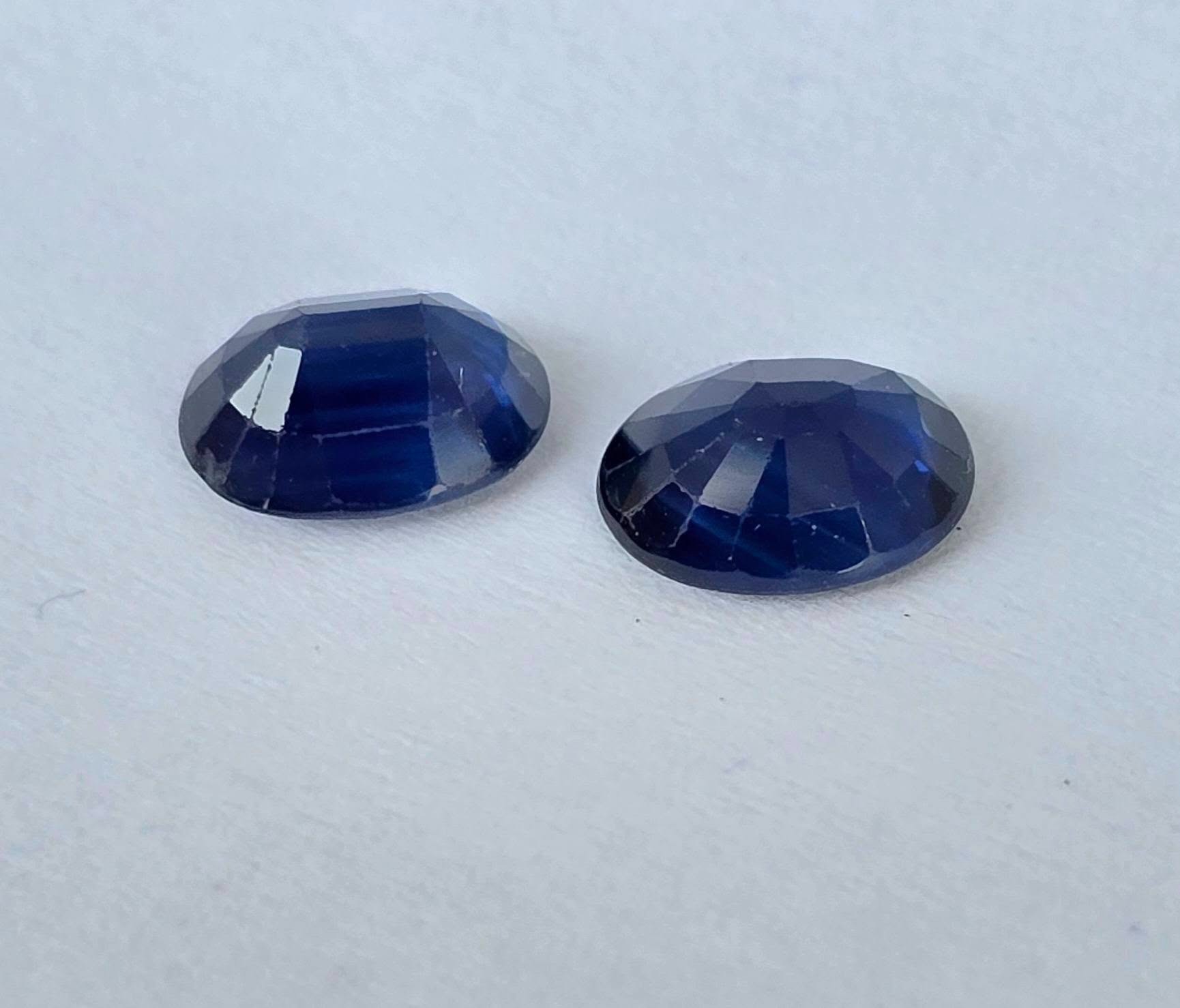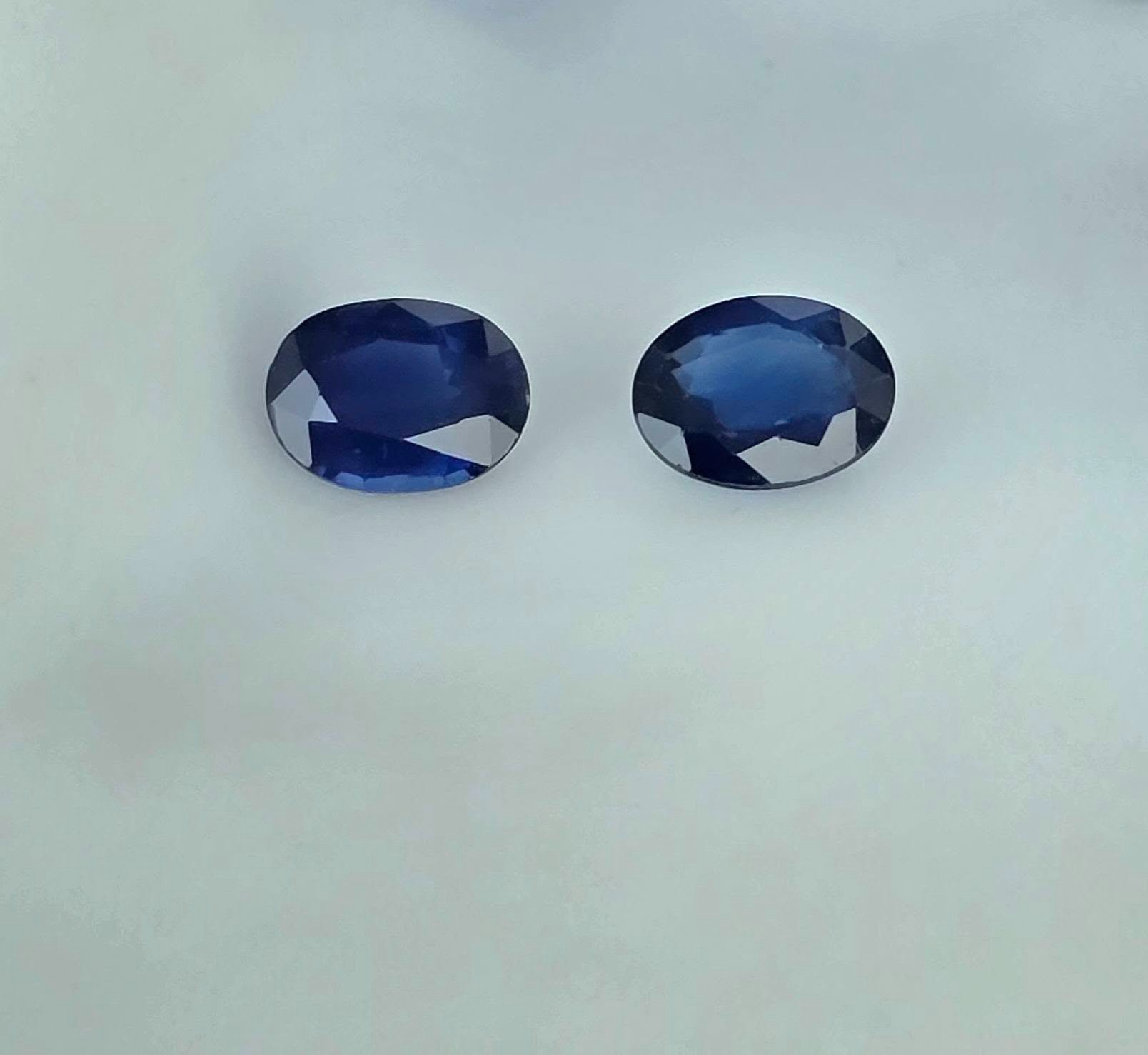 Safire naturale, tăietură "ovală", cu vizibile zone de culoare naturale ("color zone"), cu dimensiuni apropiate, potrivite pentru încorporarea lor într-o pereche de cercei.