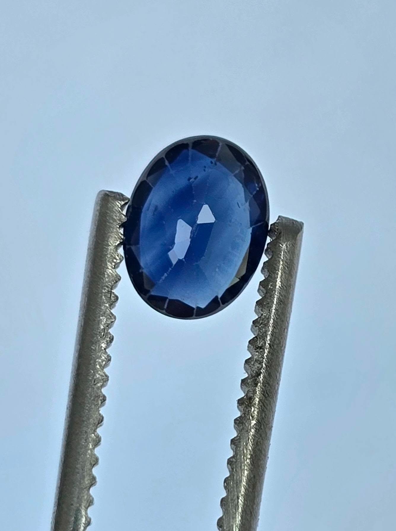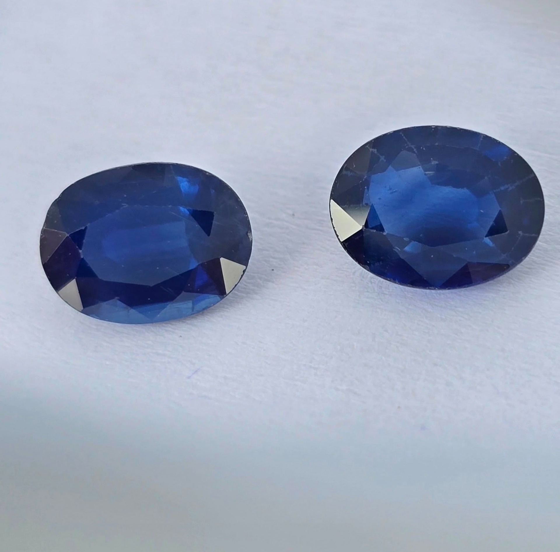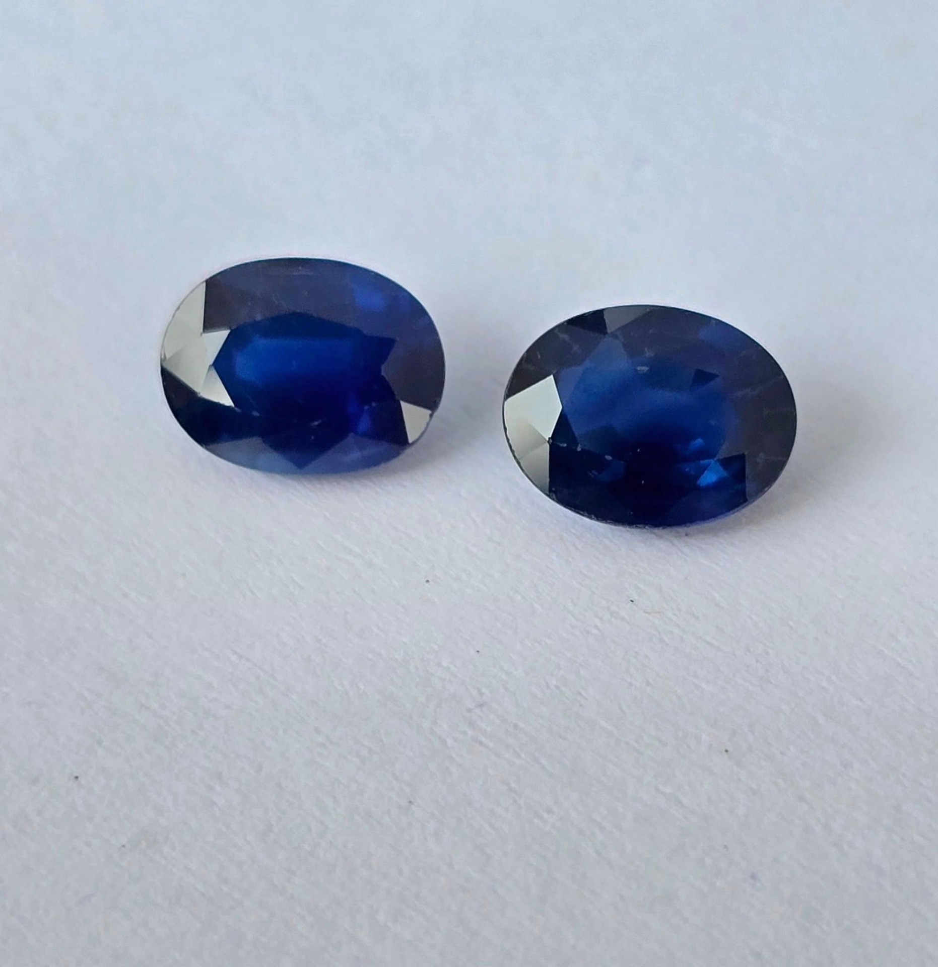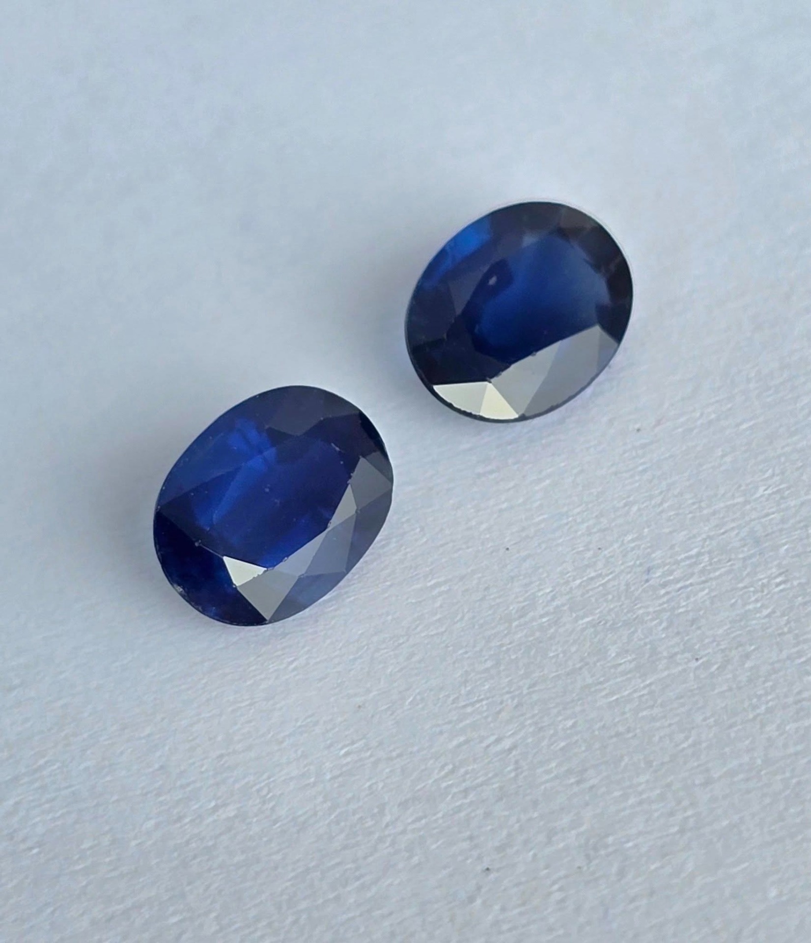 Safire naturale, tăietură "ovală", cu vizibile zone de culoare naturale ("color zone"), cu dimensiuni apropiate, potrivite pentru încorporarea lor într-o pereche de cercei.