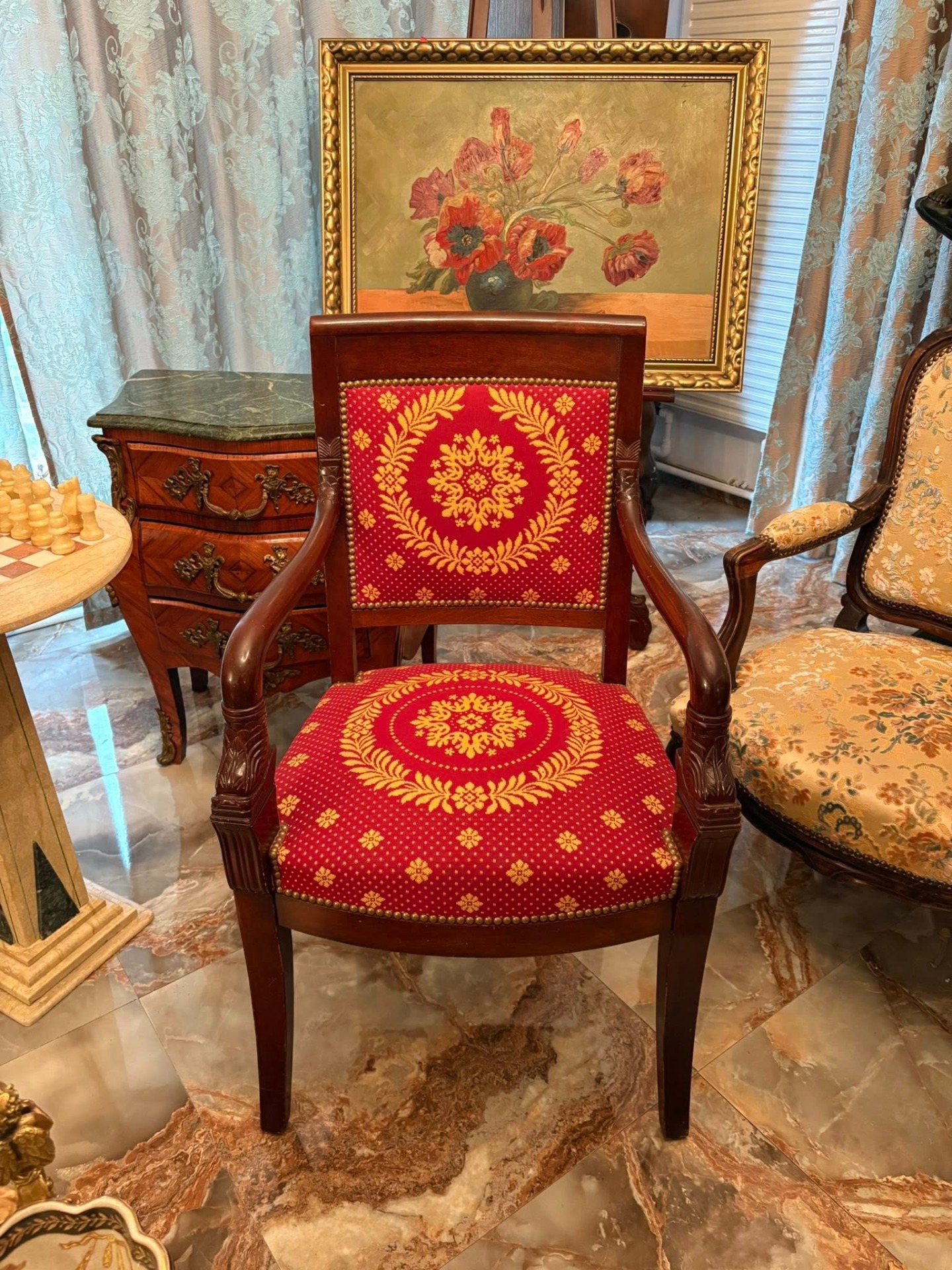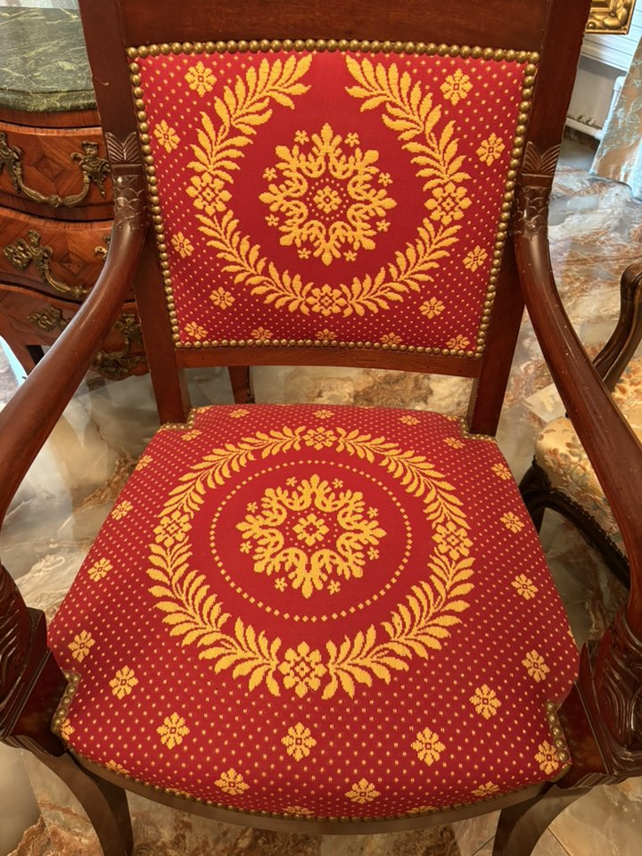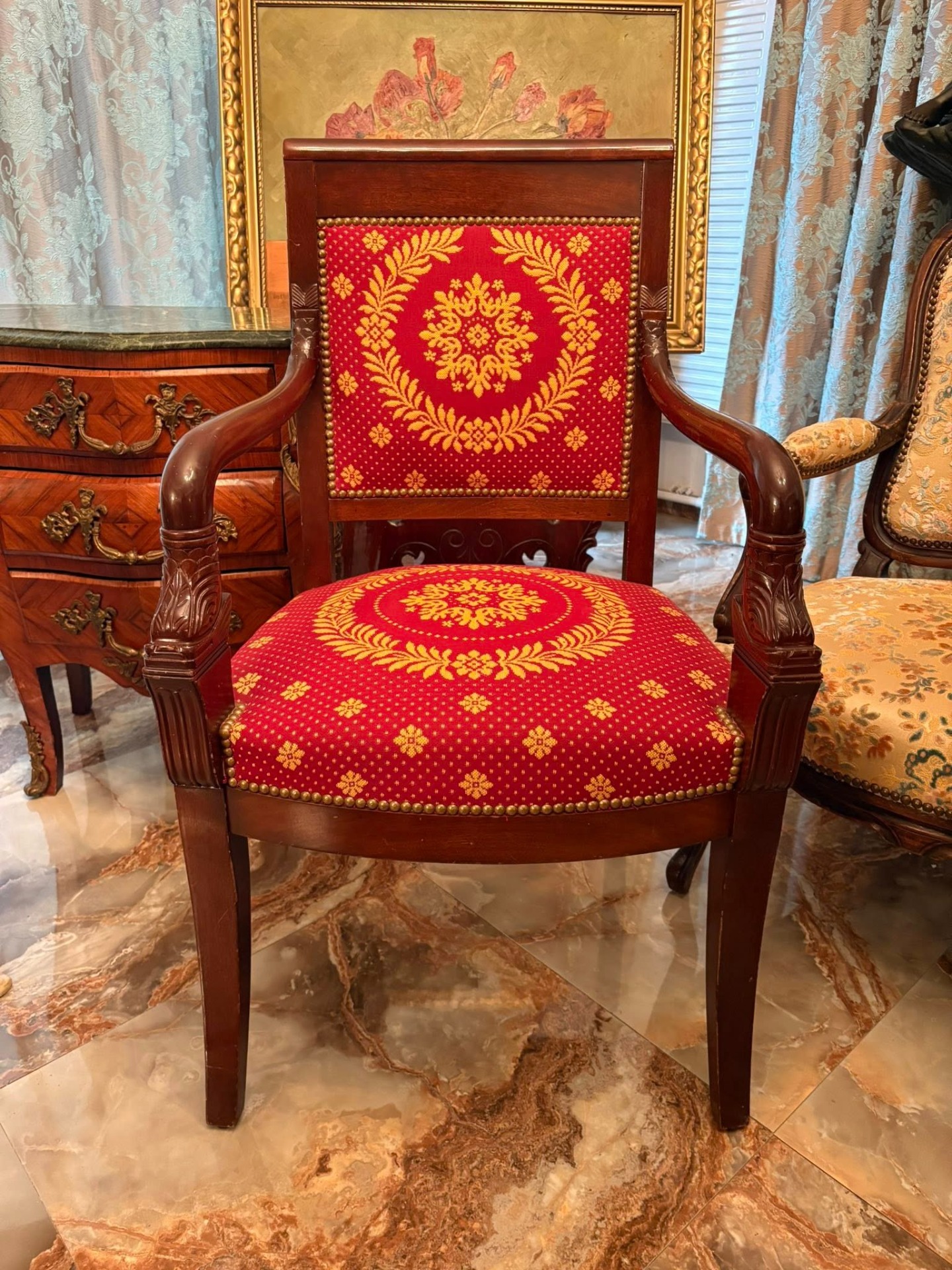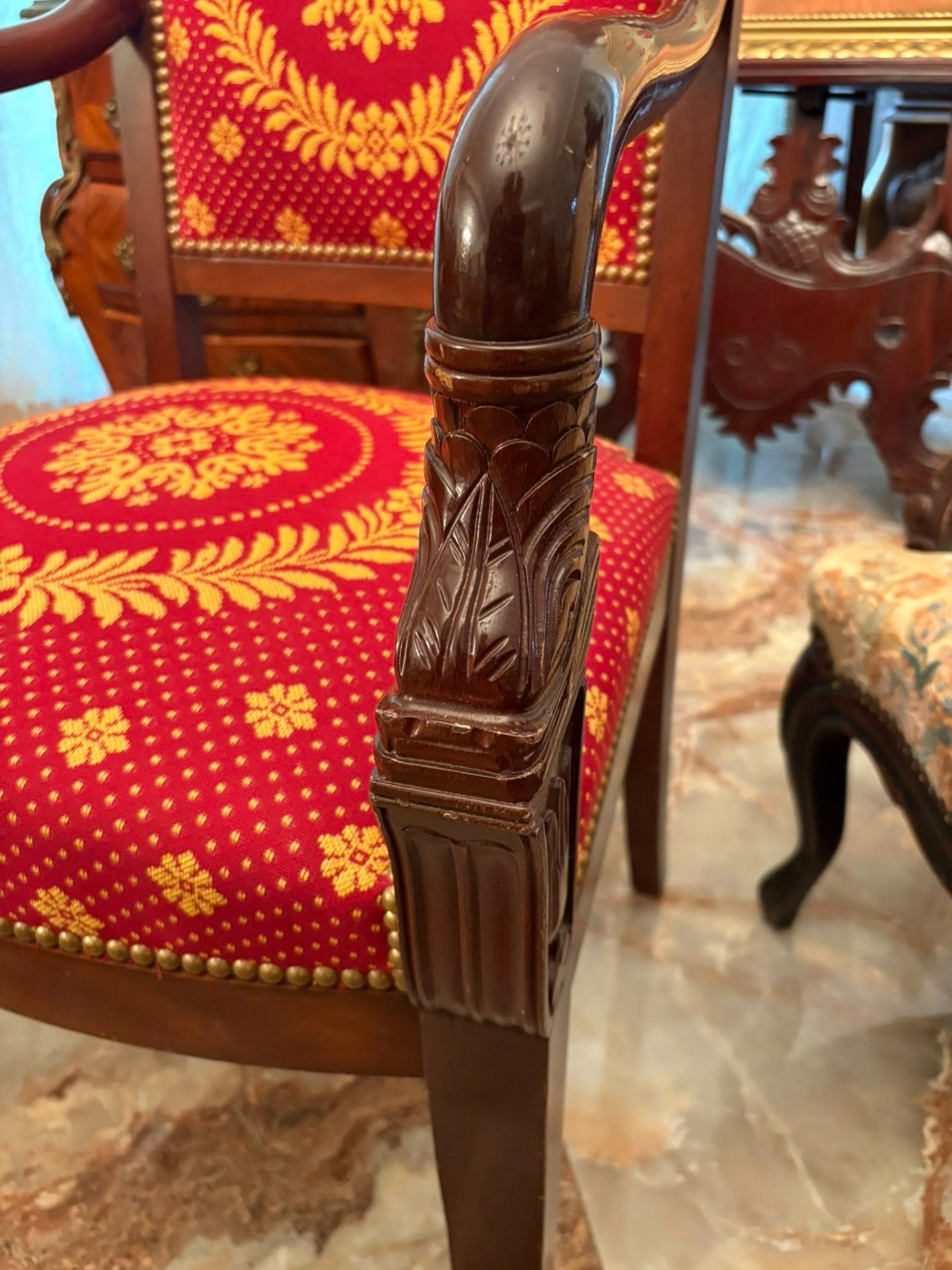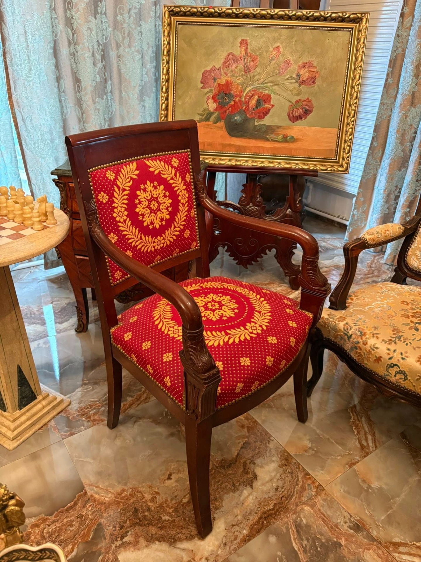 Scaun de birou din lemn masiv pentru doamne, posibil mahon,cu tapițerie roșie decorată cu motive aurii