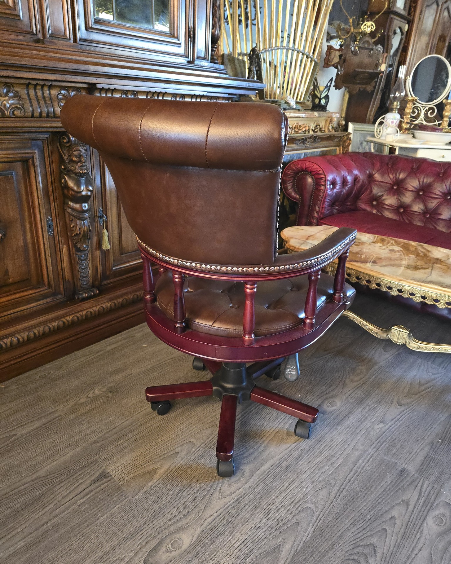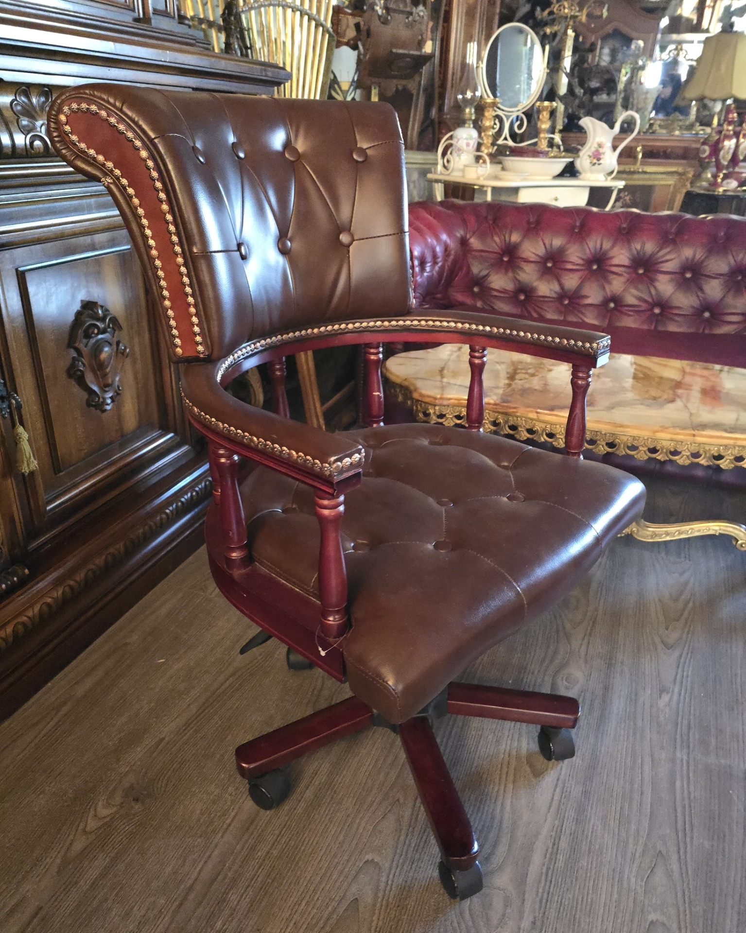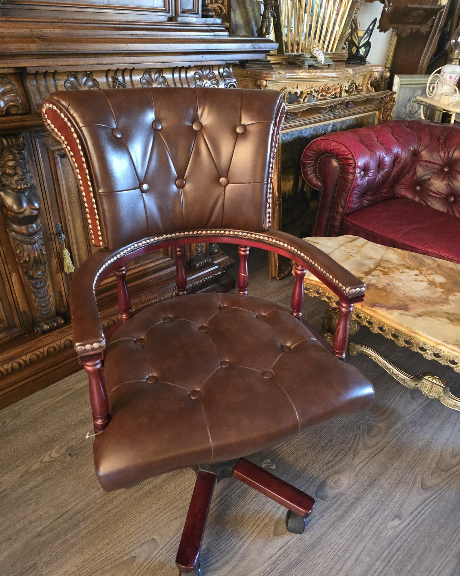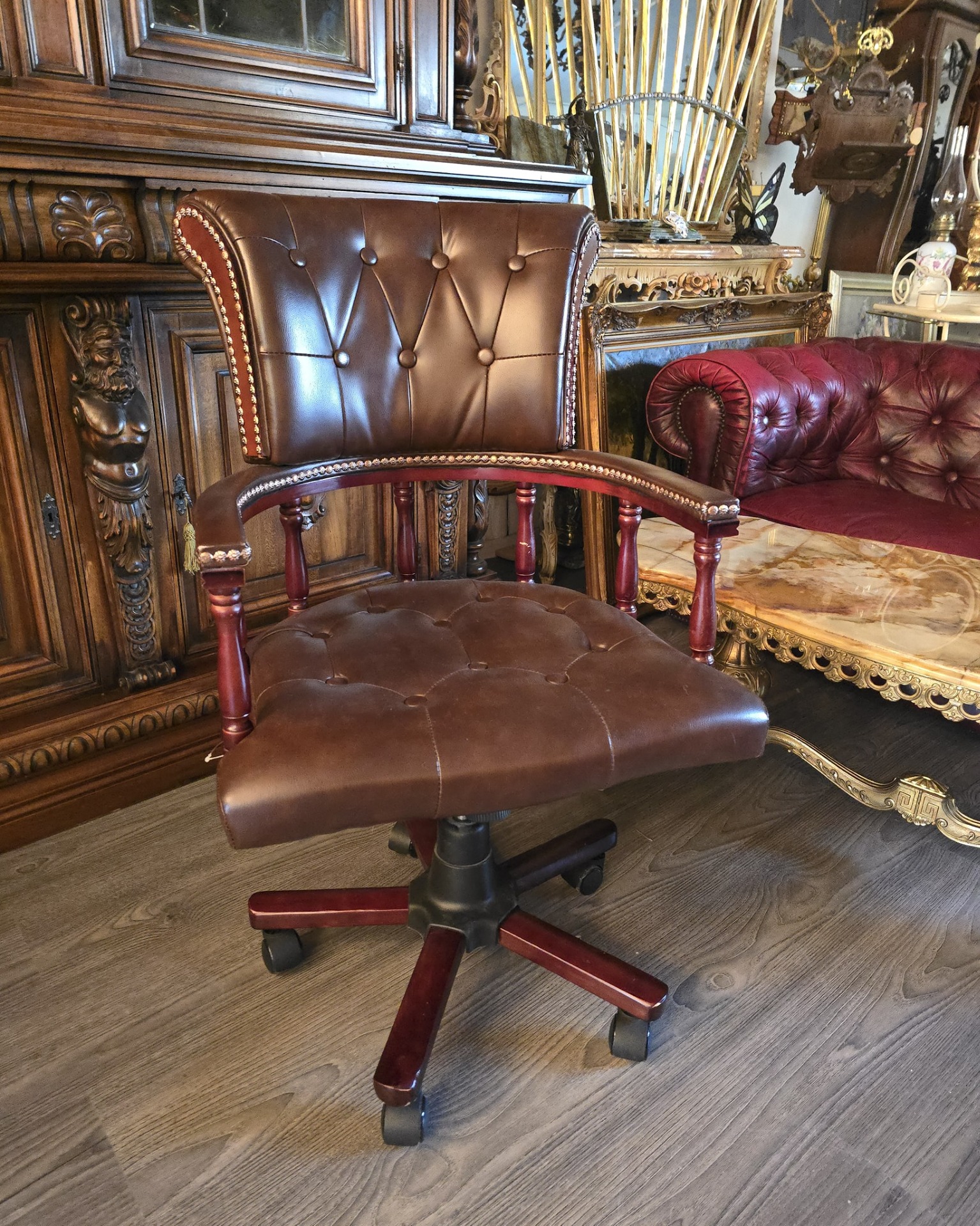 Scaun de birou în stil Chesterfield din pielenaturala, care îmbină perfect estetica clasică englezească cu funcționalitatea modernă.