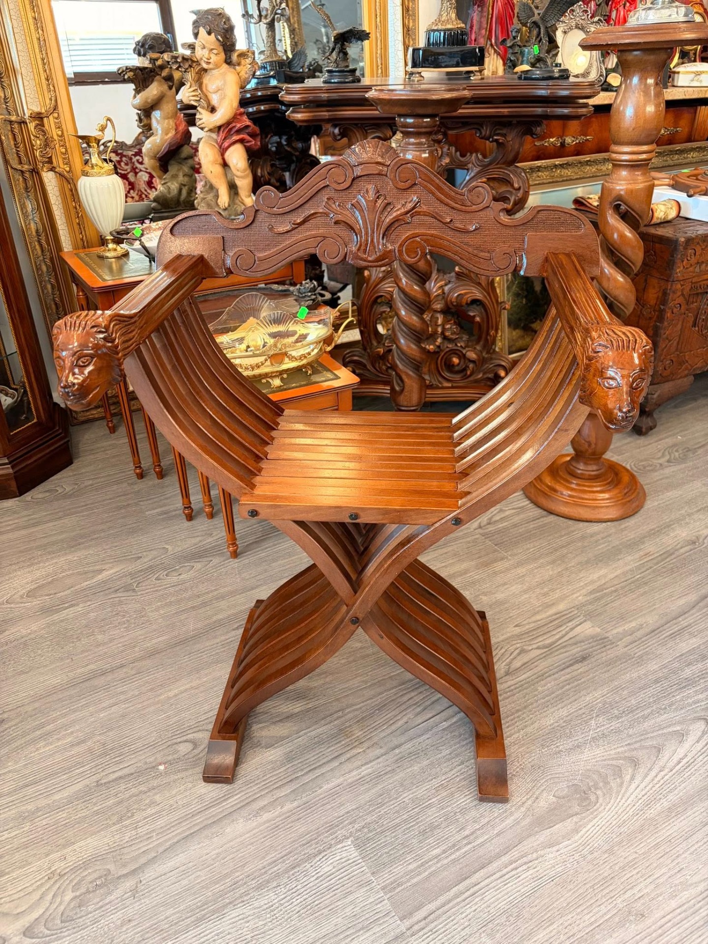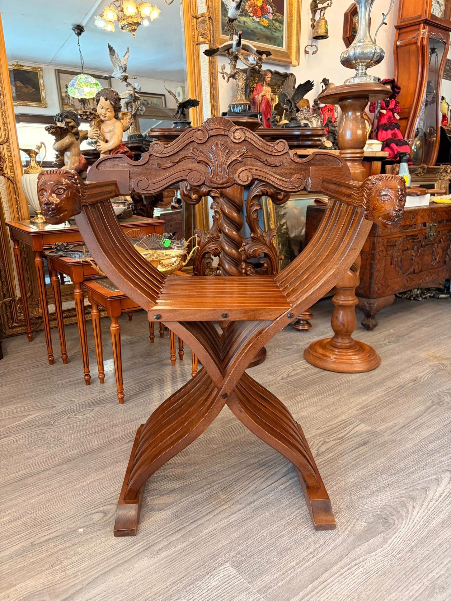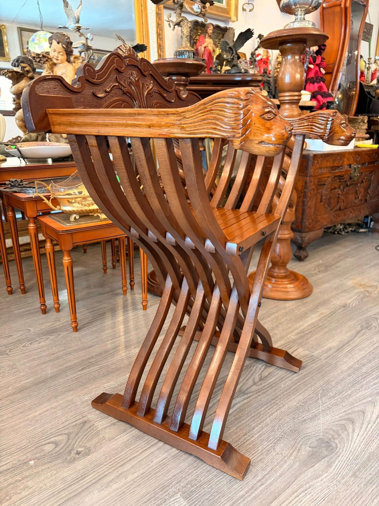 Scaun vechi impresionant, de tip Savonarola (cunoscut și ca Dantesca), realizat în stil Neo-Renaștere Italiană (inspirat de modelele secolului XV), cu structură clasică în formă de "X" (curule), formată din lamele curbate de lemn care se îmbină elegant, cu spătarul bogat sculptat,detașabil și structură pliabilă.