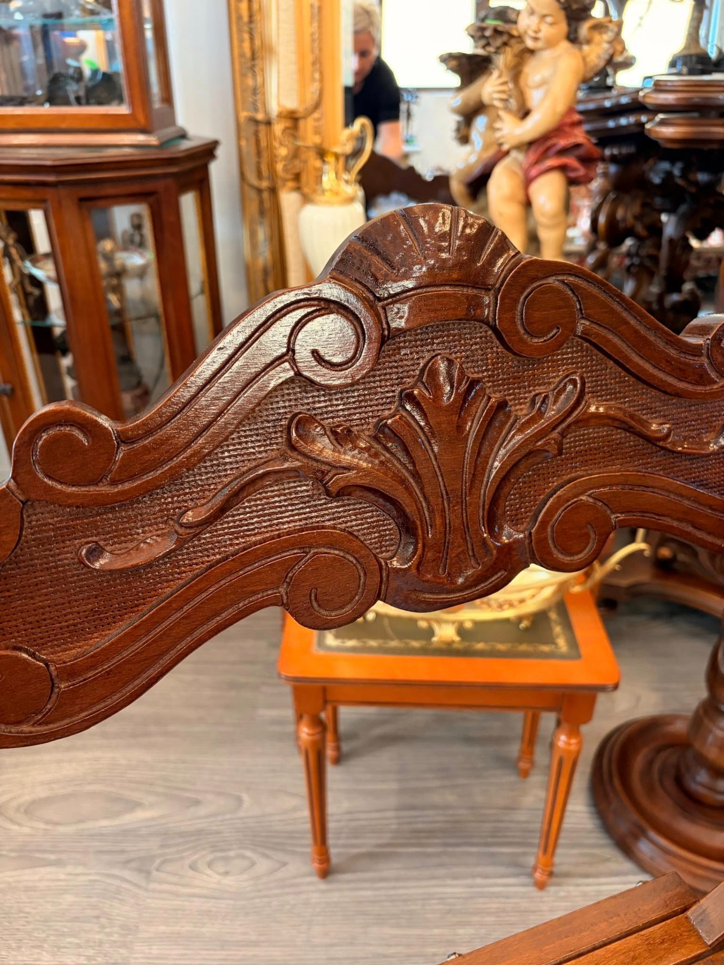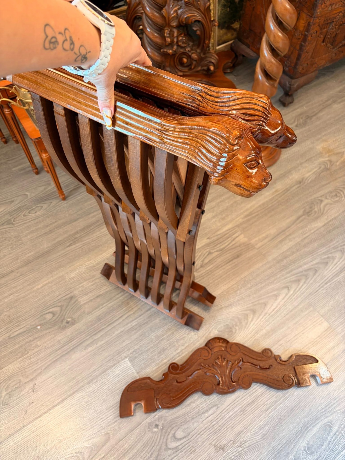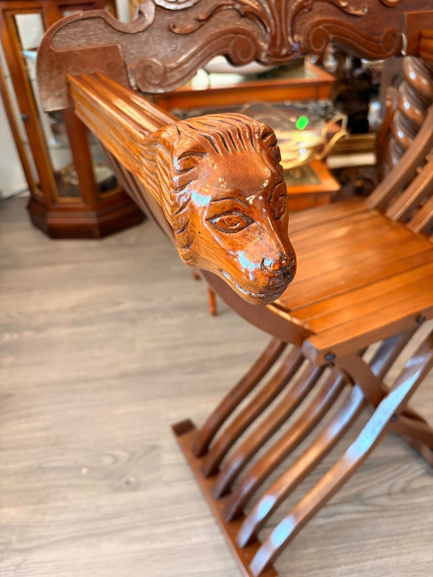 Scaun vechi impresionant, de tip Savonarola (cunoscut și ca Dantesca), realizat în stil Neo-Renaștere Italiană (inspirat de modelele secolului XV), cu structură clasică în formă de "X" (curule), formată din lamele curbate de lemn care se îmbină elegant, cu spătarul bogat sculptat,detașabil și structură pliabilă.