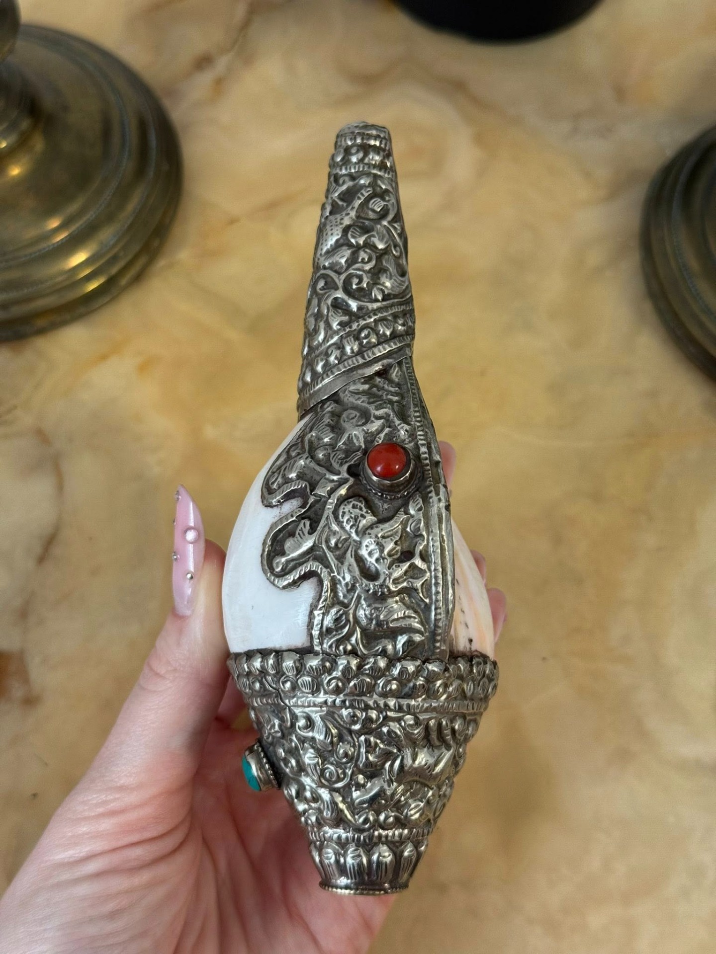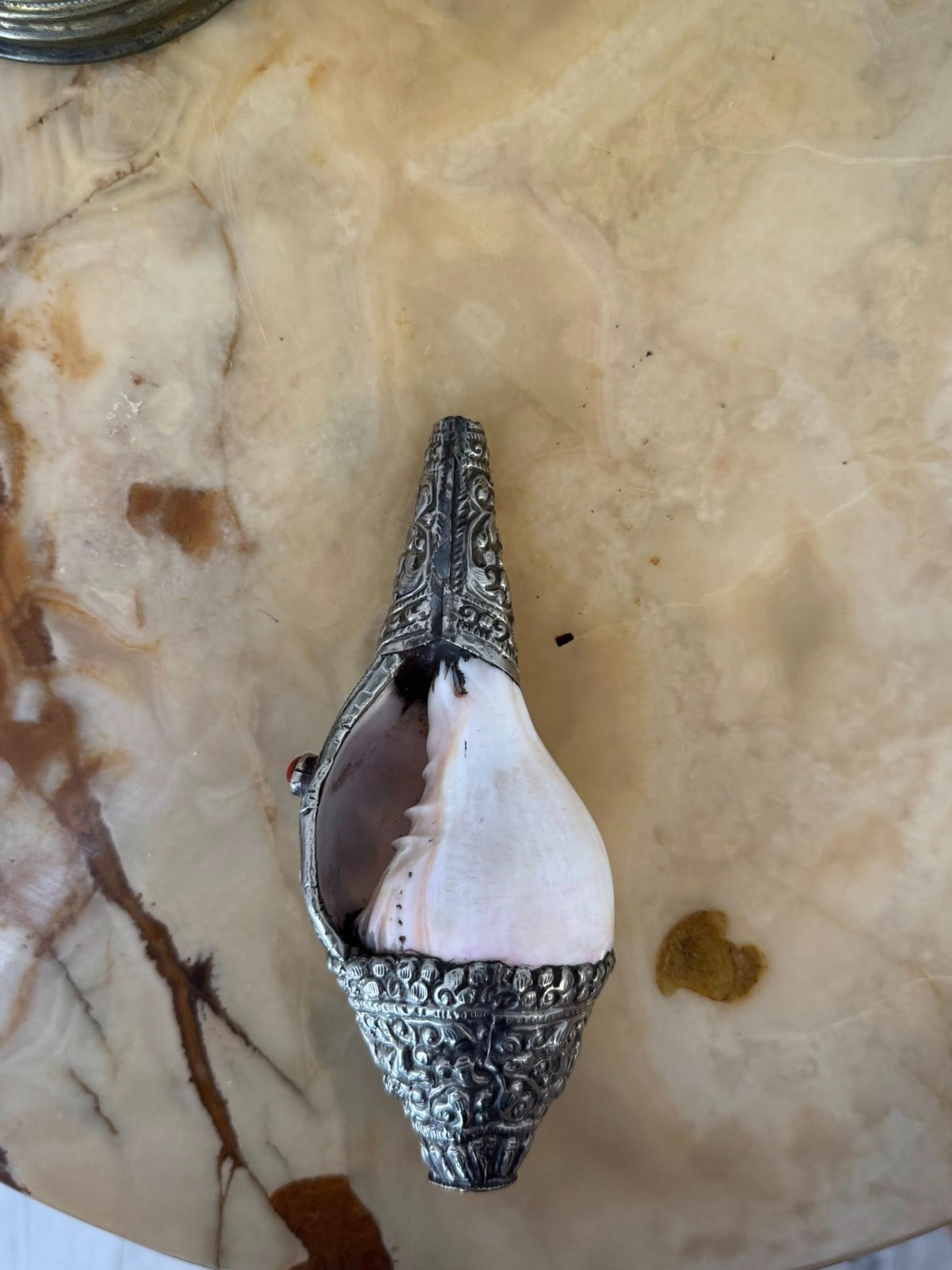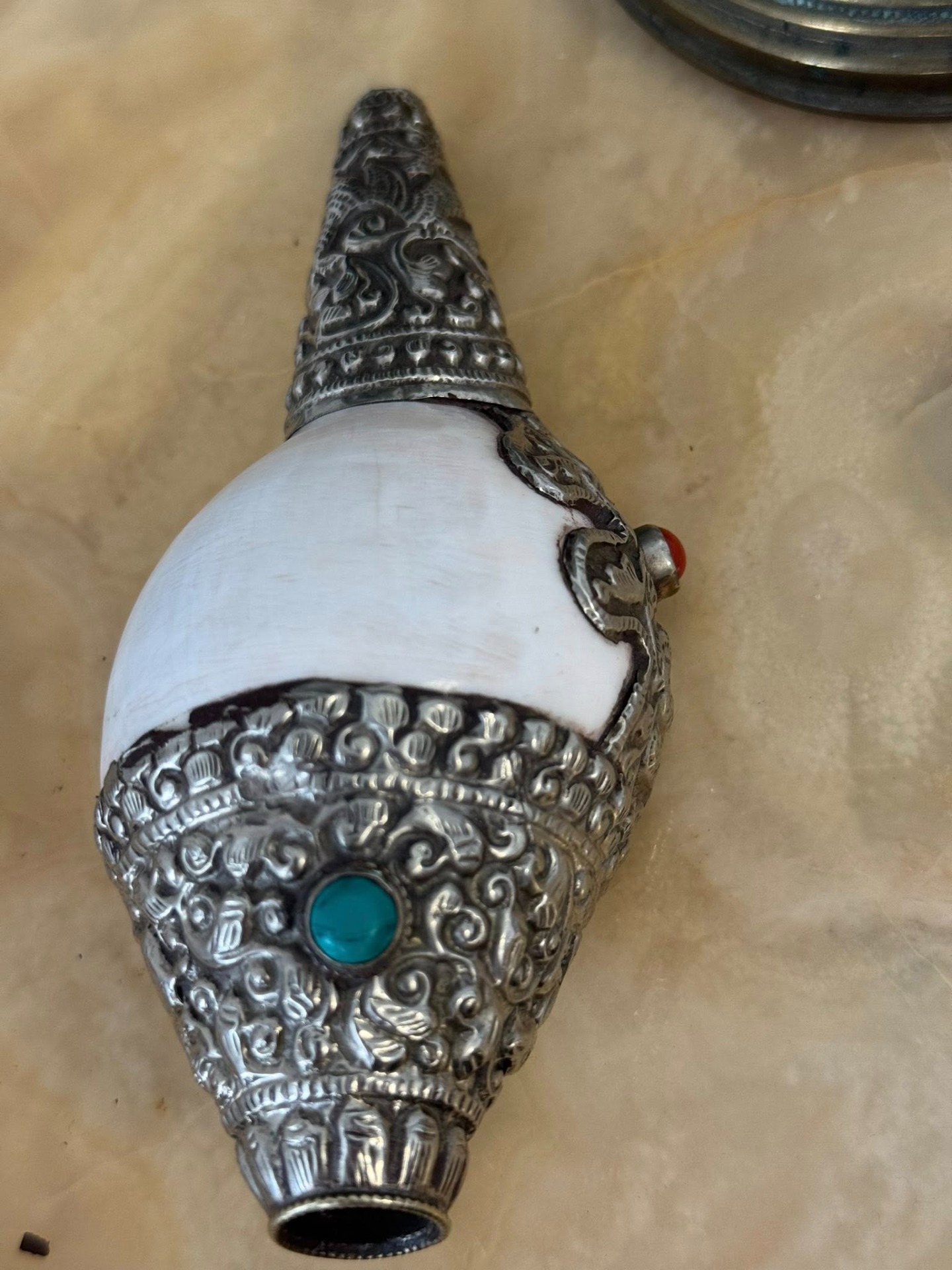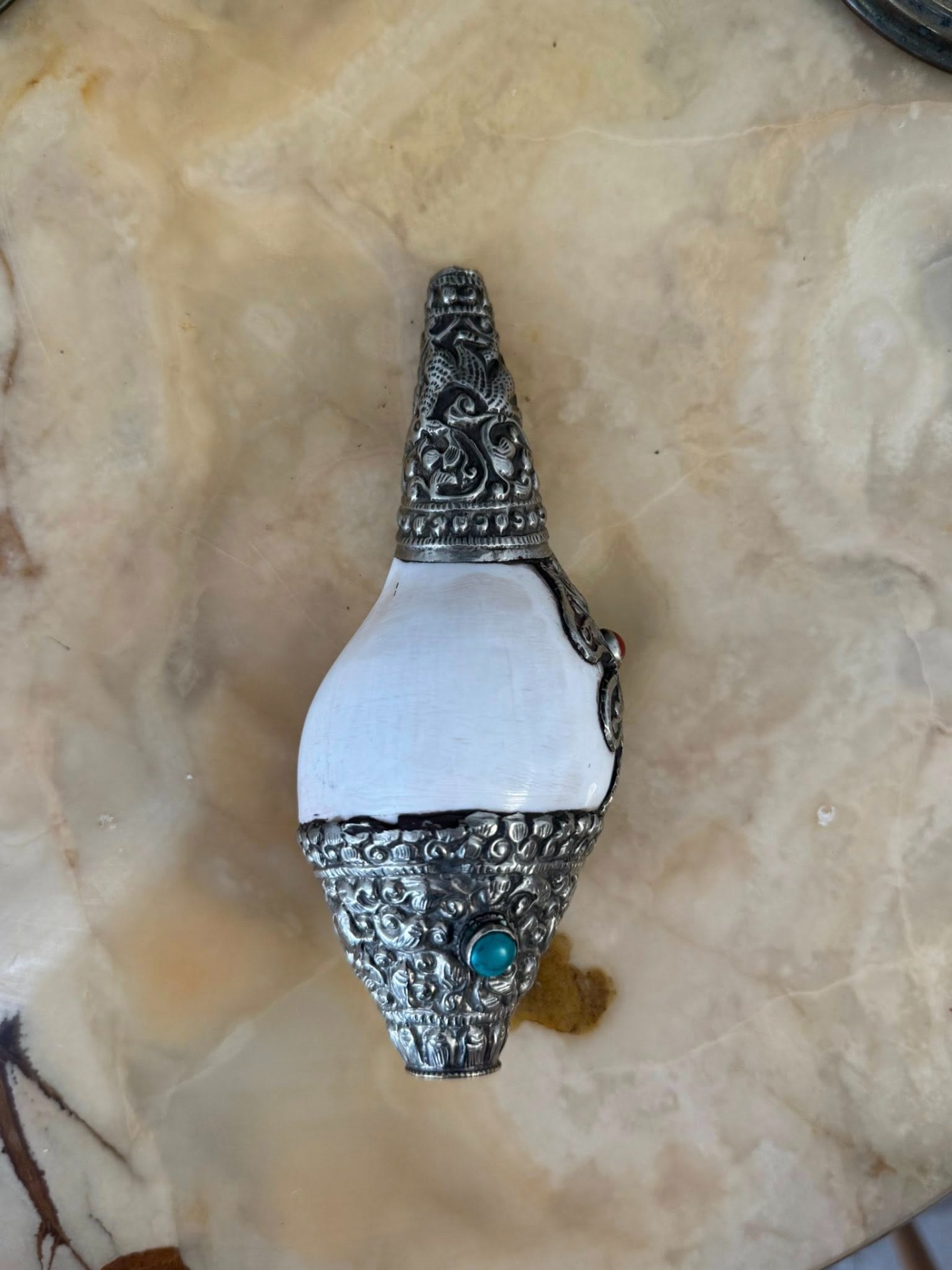 Scoică ritualică decorată (Shanka), un obiect simbolic foarte important în tradițiile spirituale din Tibet (Buddhismul Tibetan) și India (Hinduism).