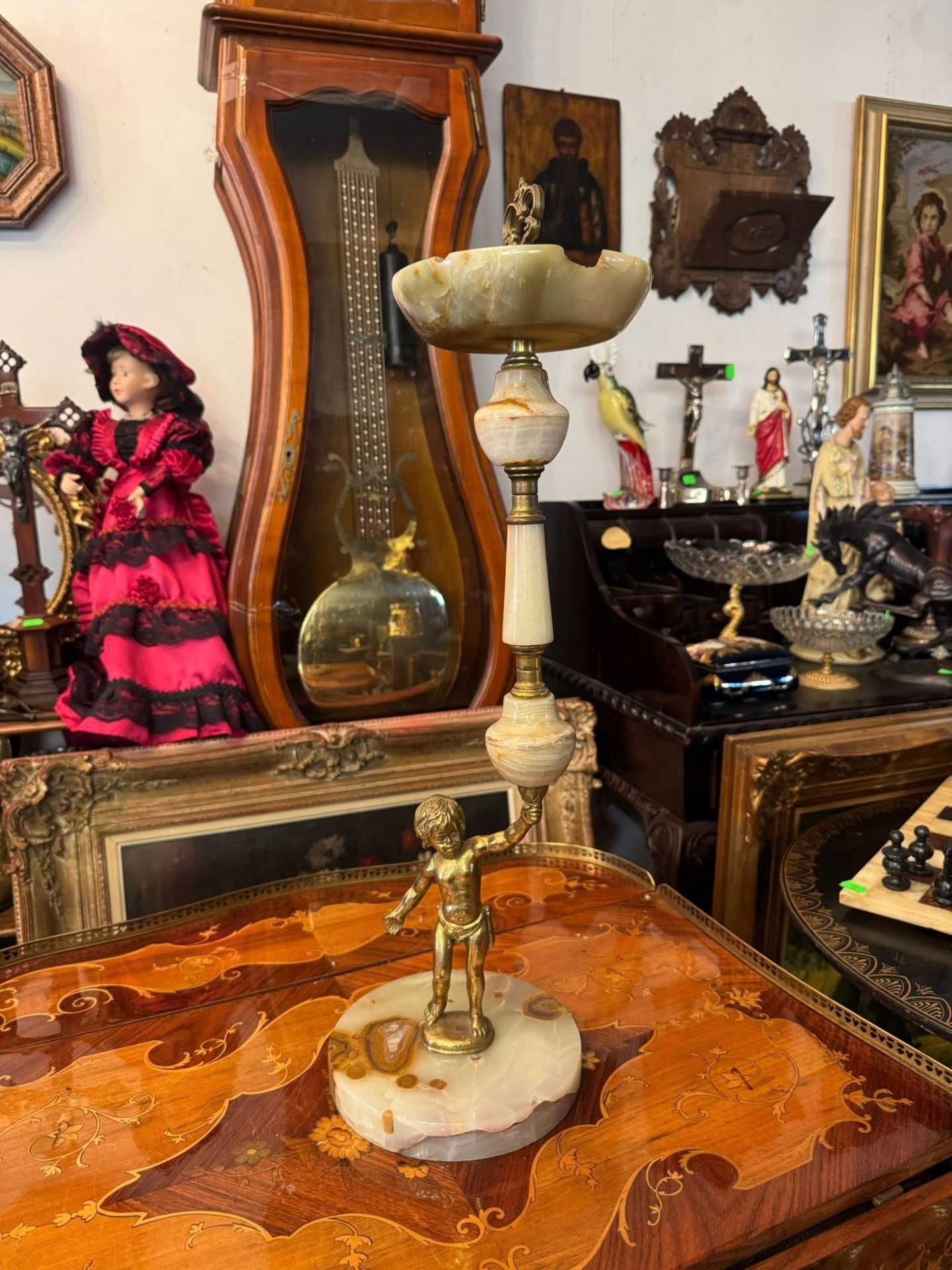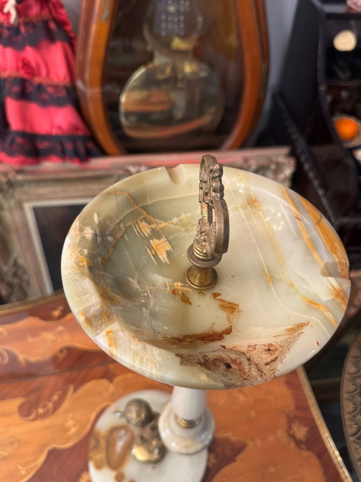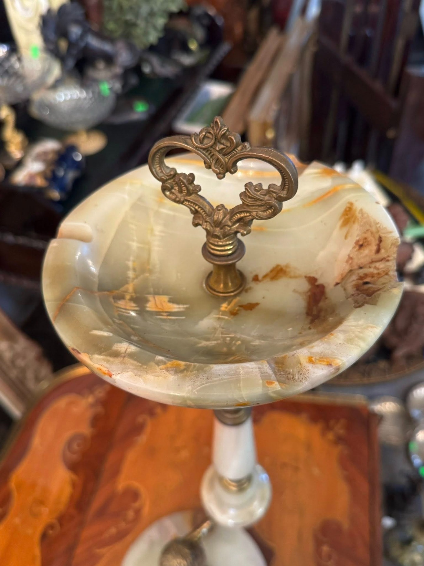 Scrumieră cu picior realizată din onix și bronz(cca 1950). Piesa centrală este un cherub (putto) care susține coloana, un motiv clasic în arta decorativă europeană, adăugând un aer elegant și baroc obiectului.