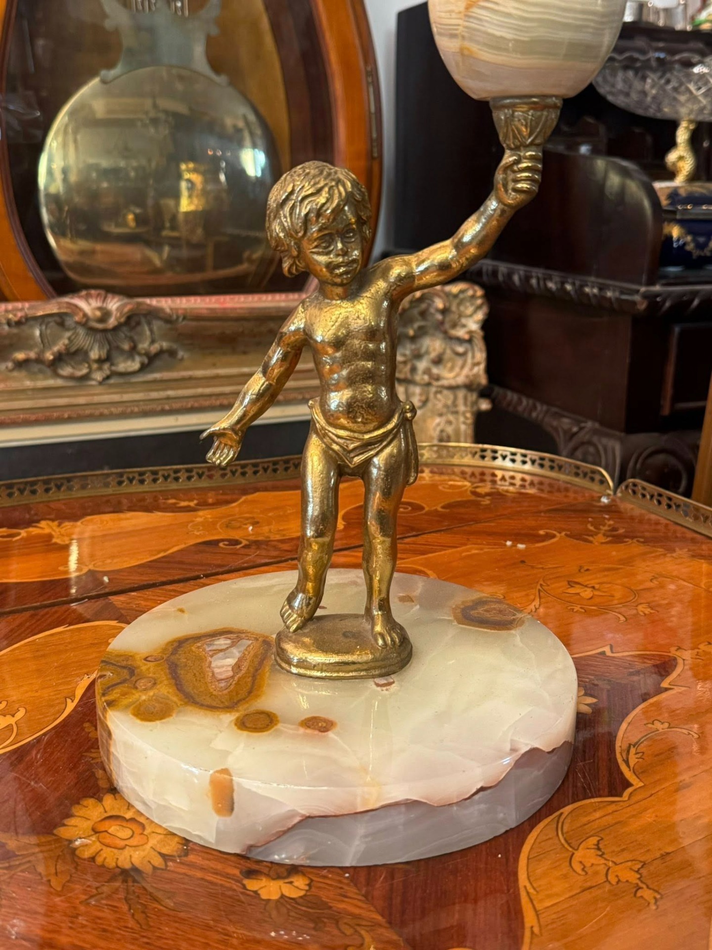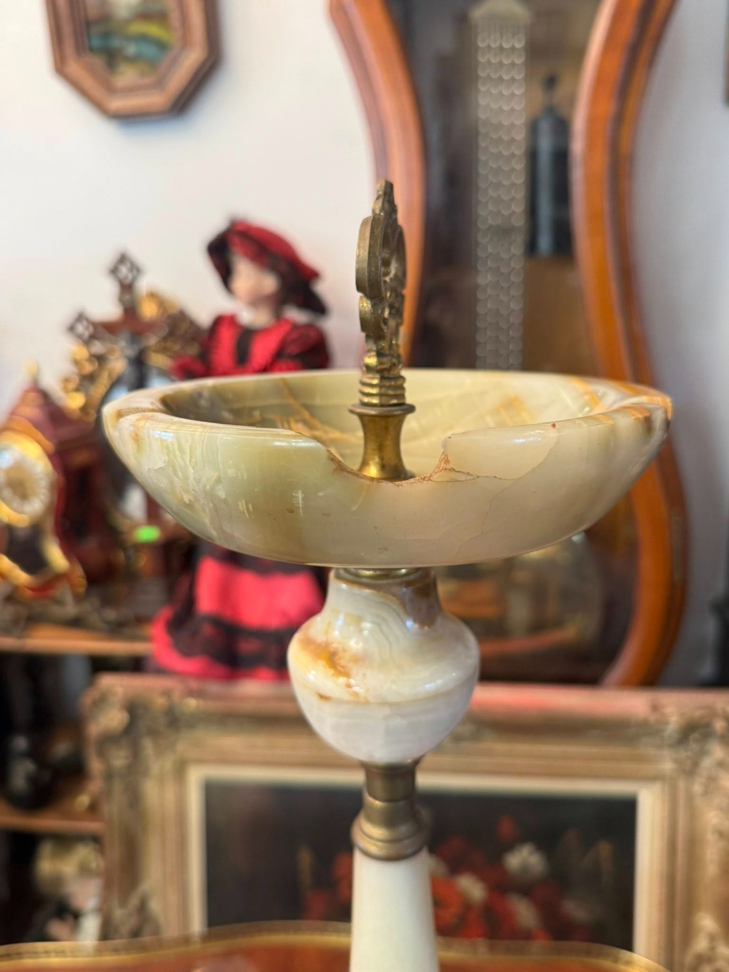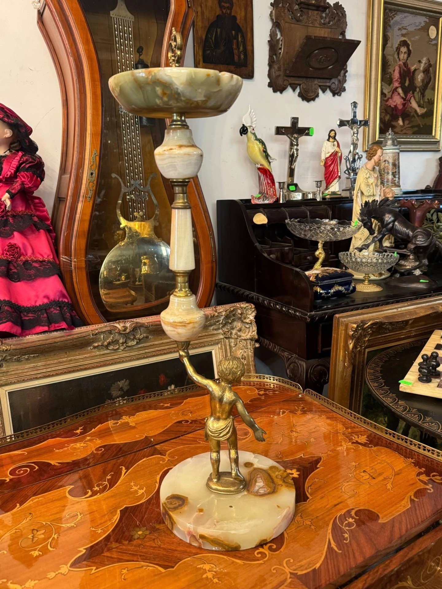Scrumieră cu picior realizată din onix și bronz(cca 1950). Piesa centrală este un cherub (putto) care susține coloana, un motiv clasic în arta decorativă europeană, adăugând un aer elegant și baroc obiectului.