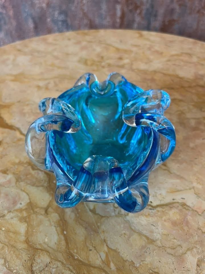 Piesă realizată din sticlă groasă, în nuanțe vibrante de albastru și turcoaz. Are un design organic, ondulat, cu margini lucrate manual, tipic stilului Murano.