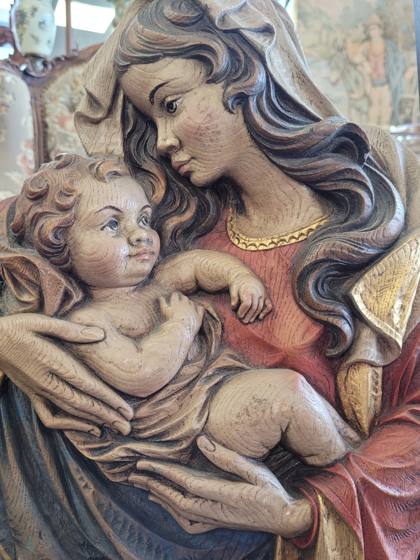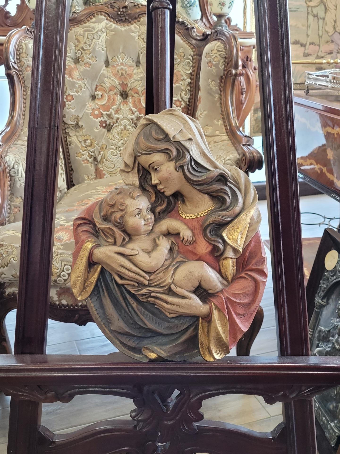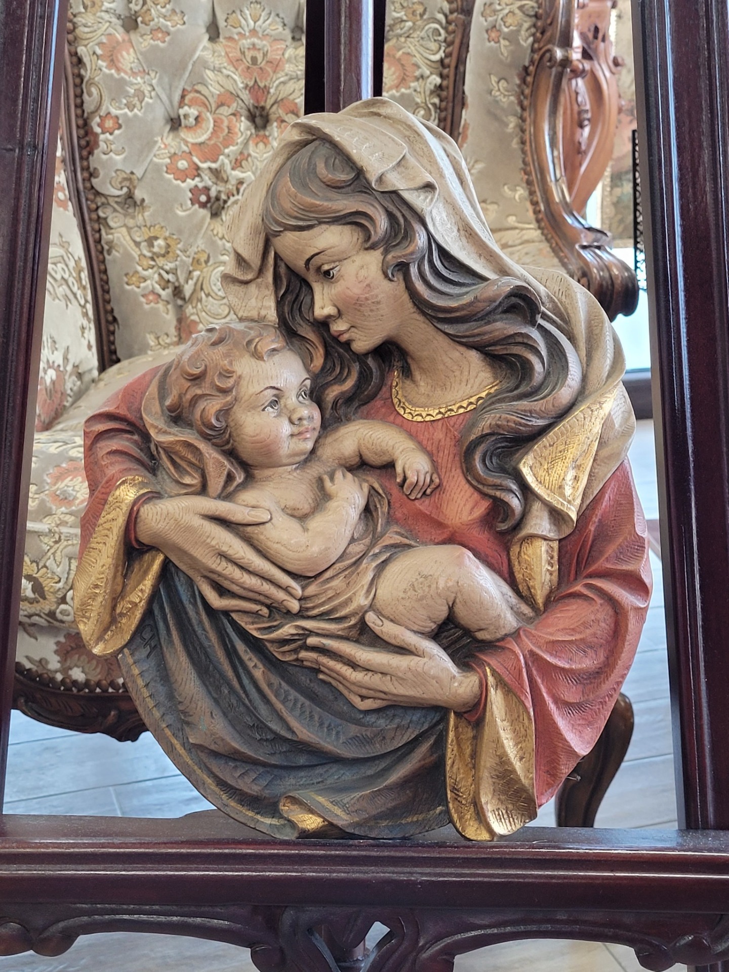 Sculptură basorelief Fecioara Maria cu Pruncul, din lemn sculptat și pictat manual, semnată CH.