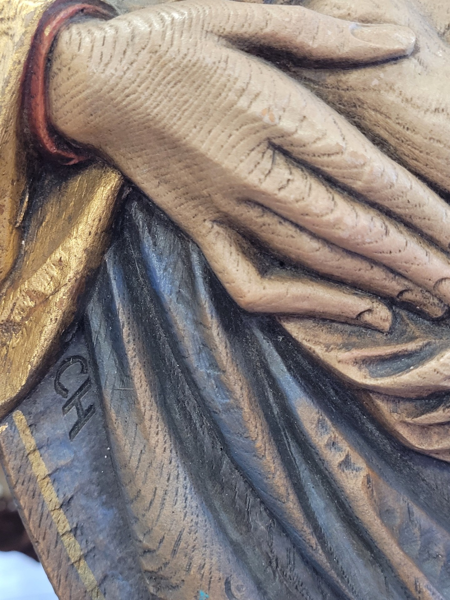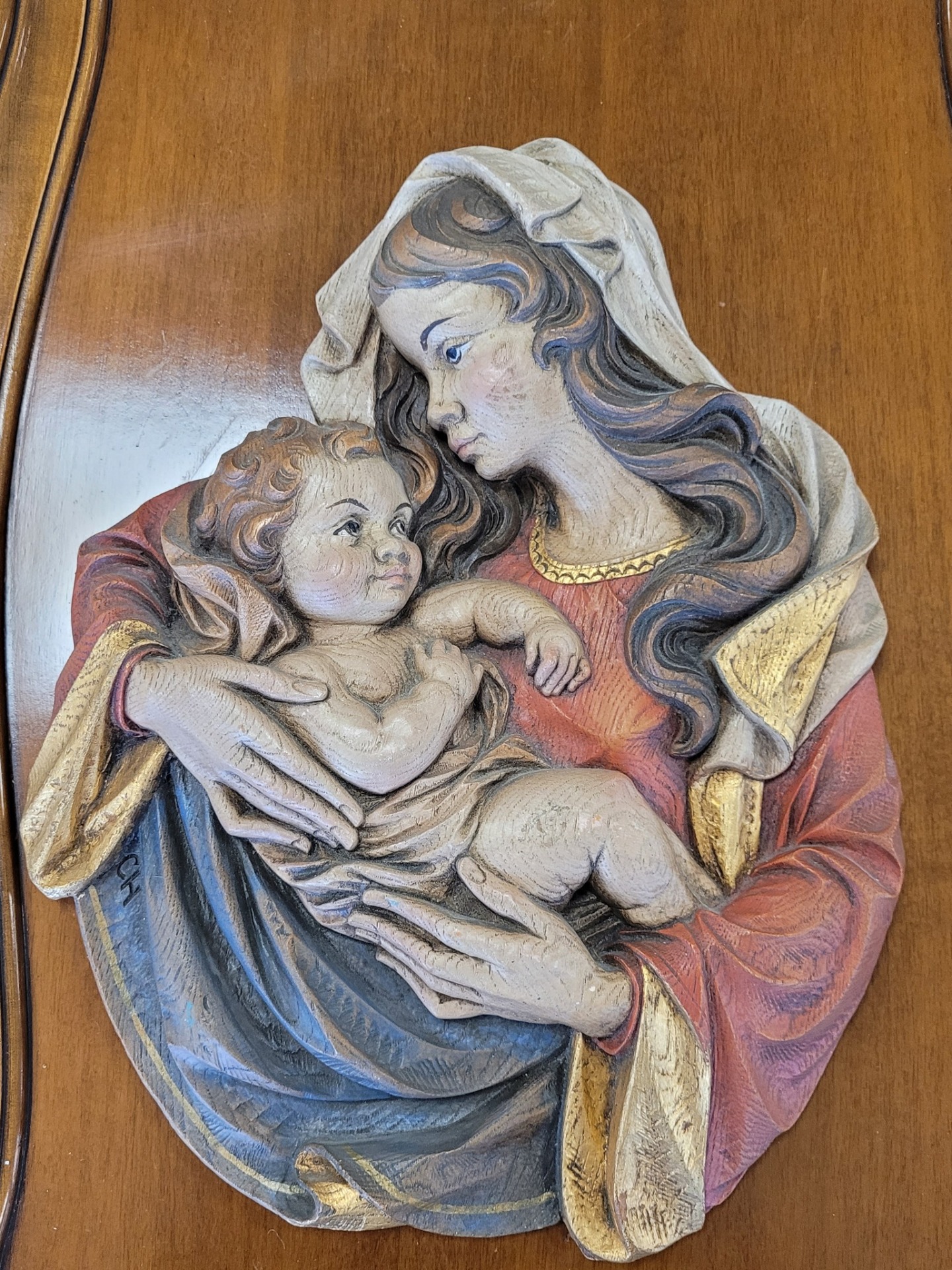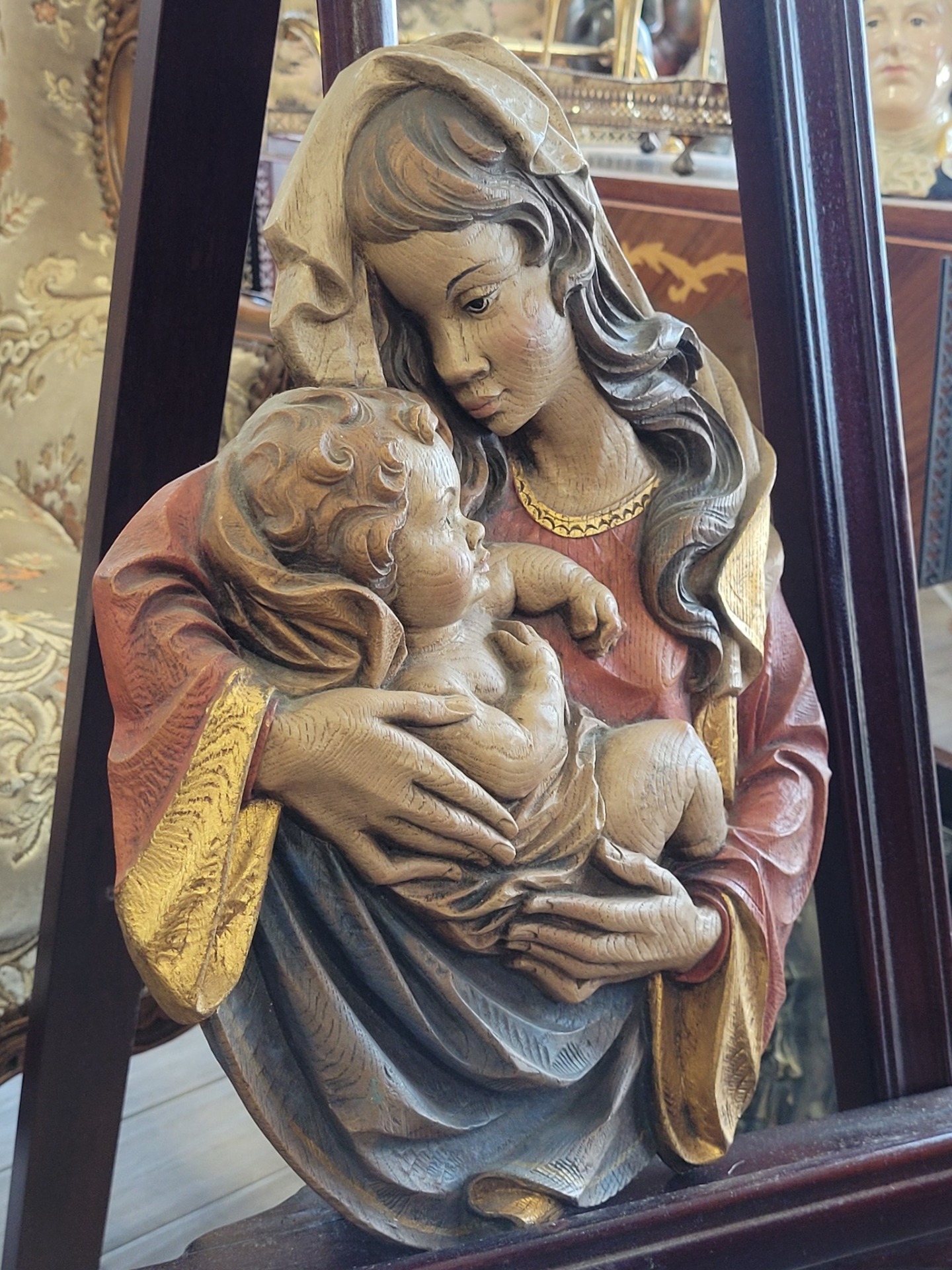 Sculptură basorelief Fecioara Maria cu Pruncul, din lemn sculptat și pictat manual, semnată CH.