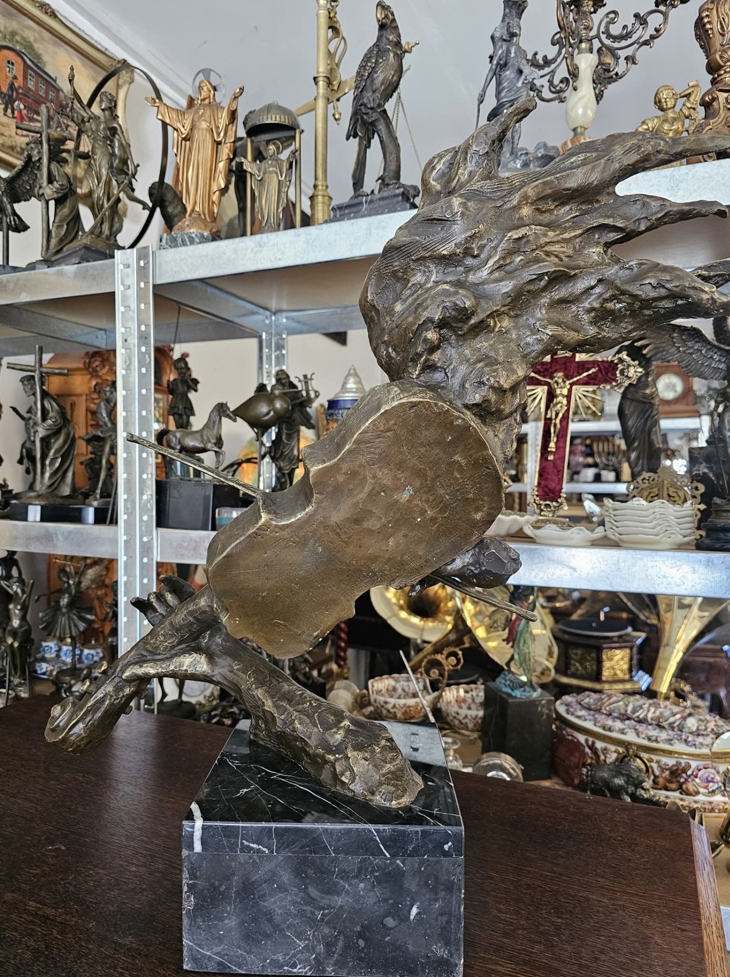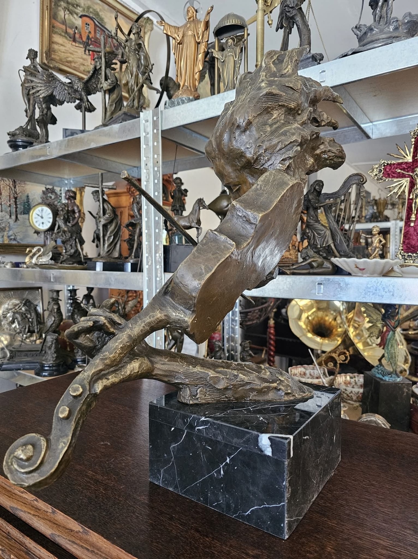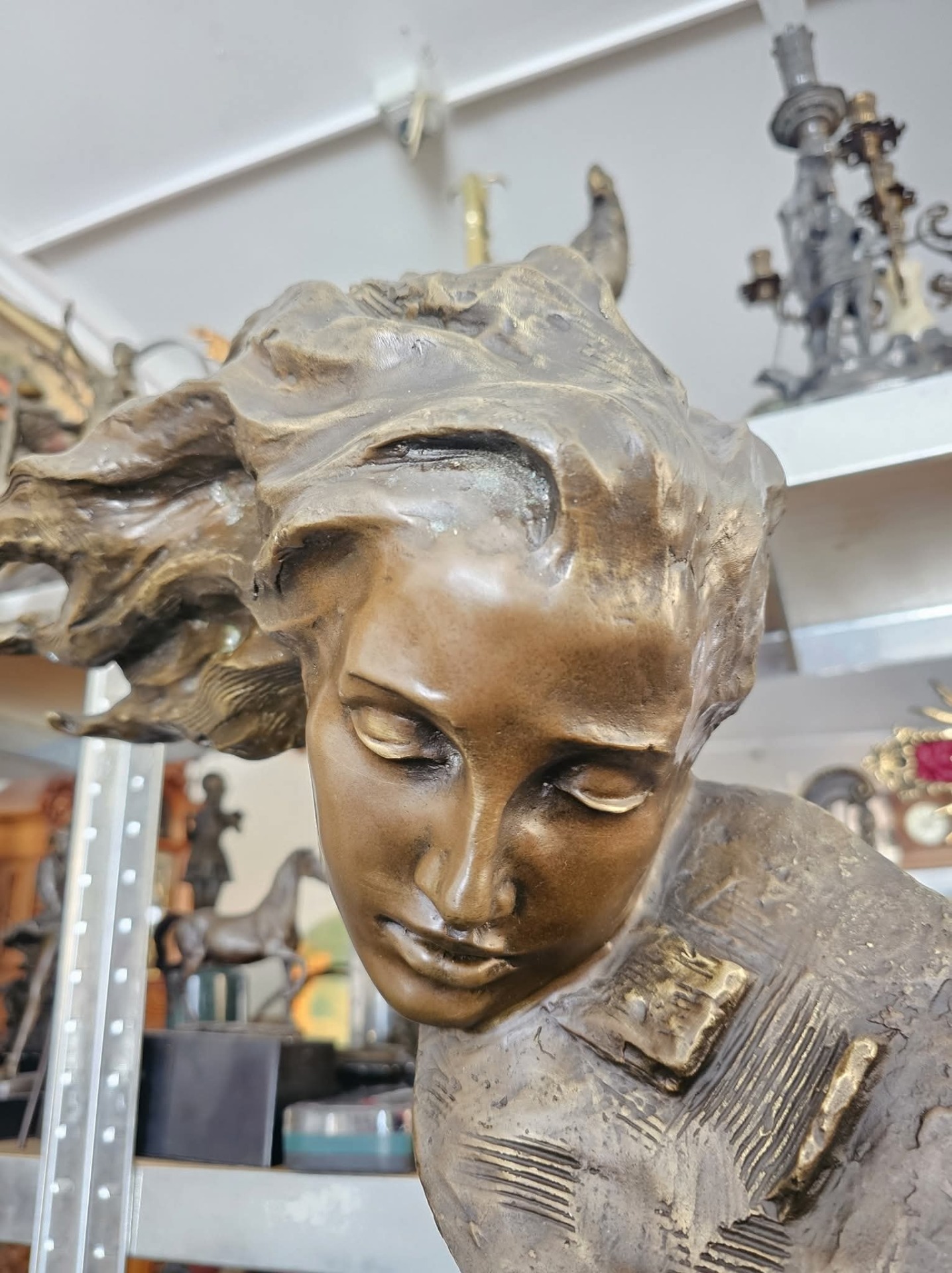 Această piesă impresionantă reprezintă o tânără violonistă surprinsă în mijlocul interpretării, cu părul fluturând elegant, sugerând dinamism și pasiune. Realizată din bronz patinat, sculptura are un nivel de detaliu remarcabil, de la expresia feței până la mâinile delicate și arcuirea arcușului. Este montată pe un soclu robust din marmură neagră cu vinișoare albe, oferind stabilitate și rafinament
