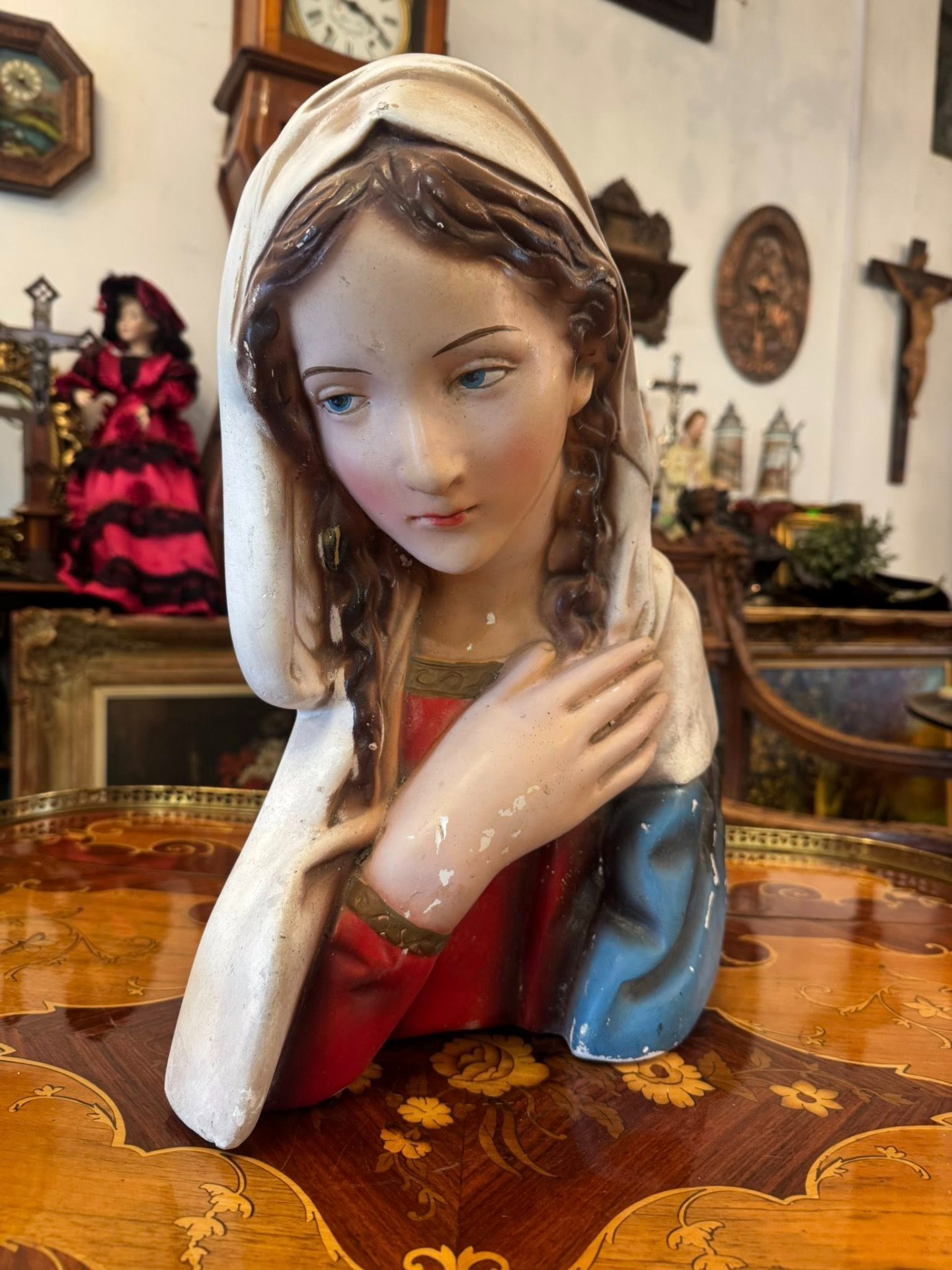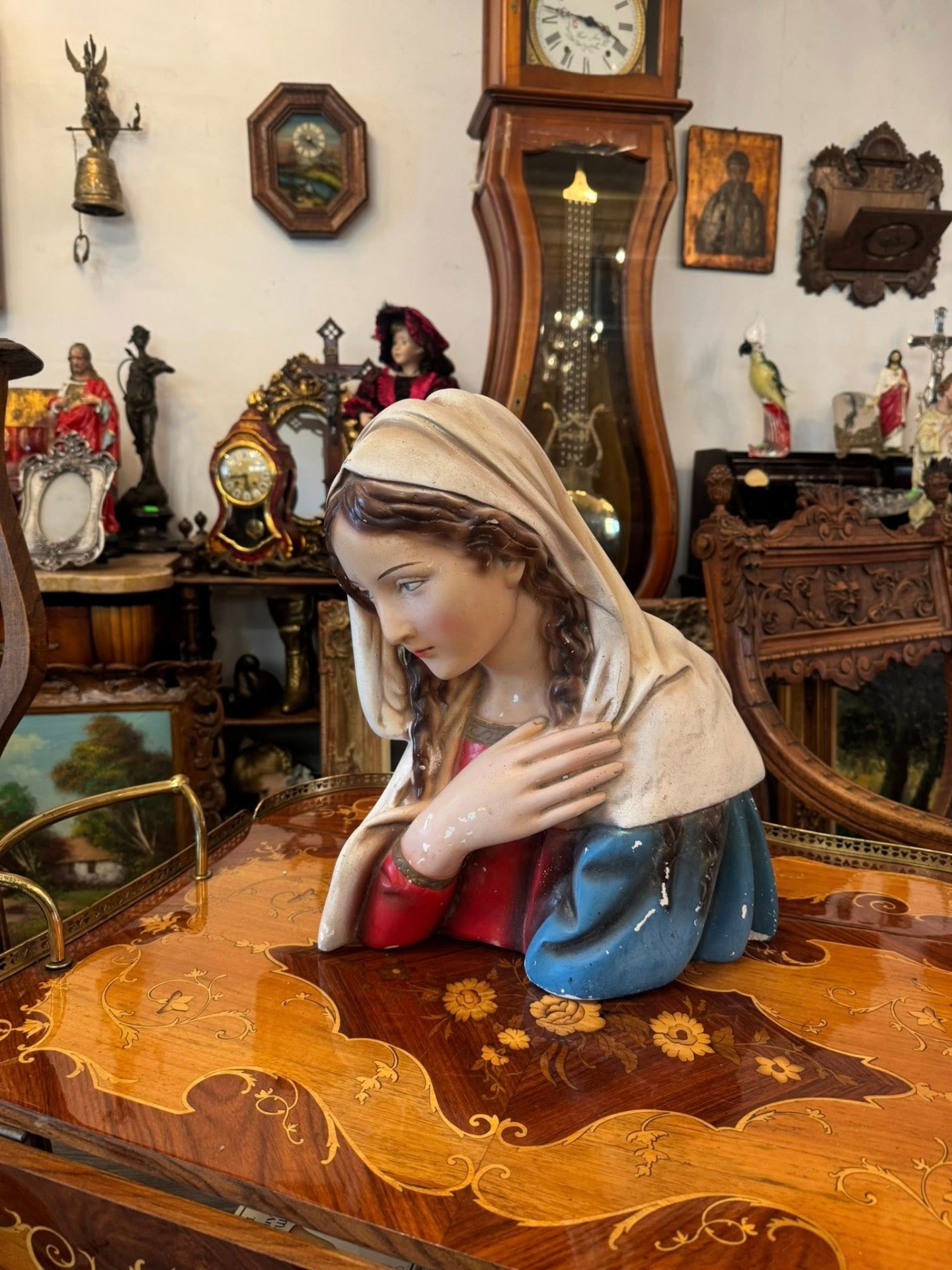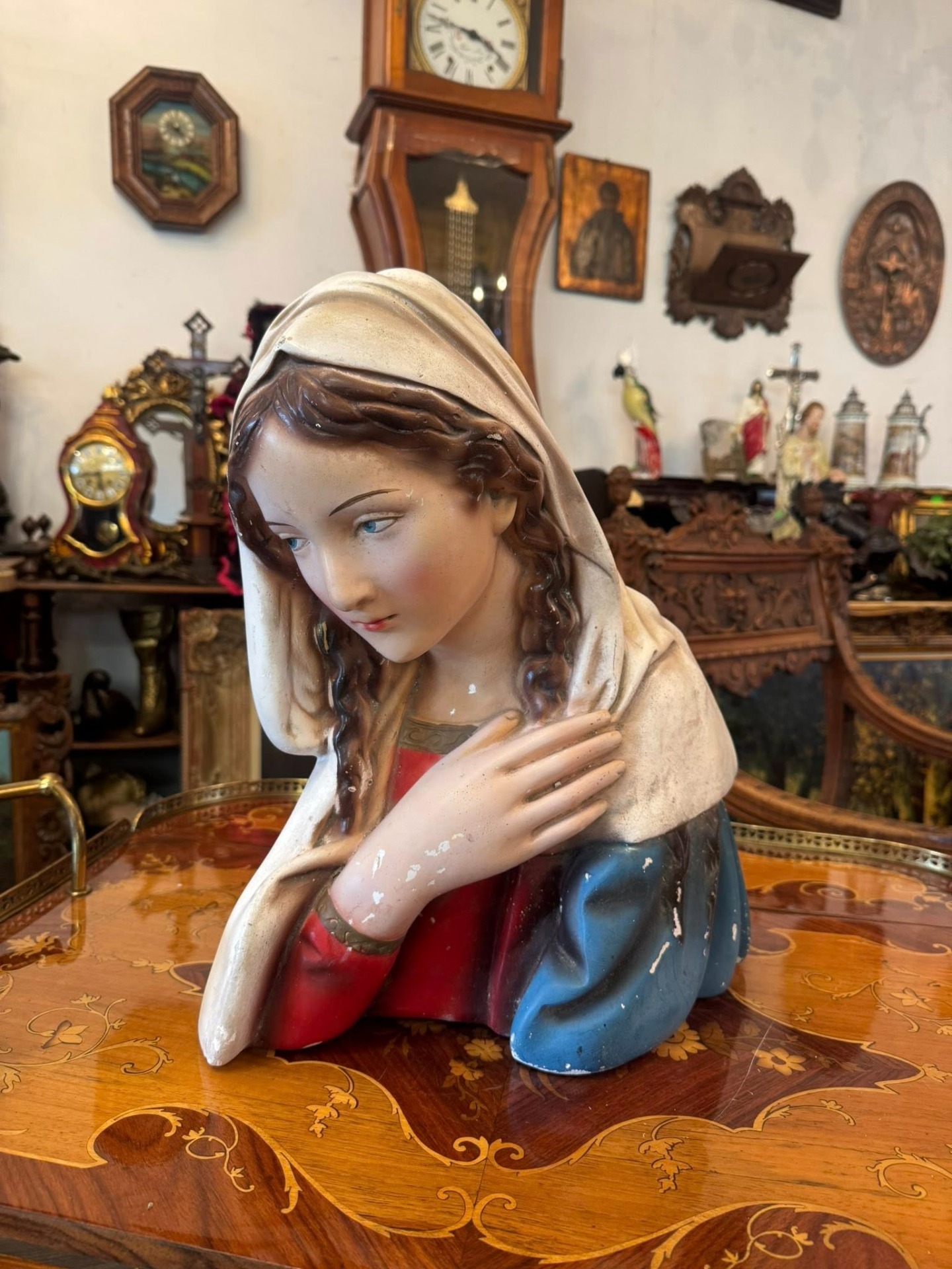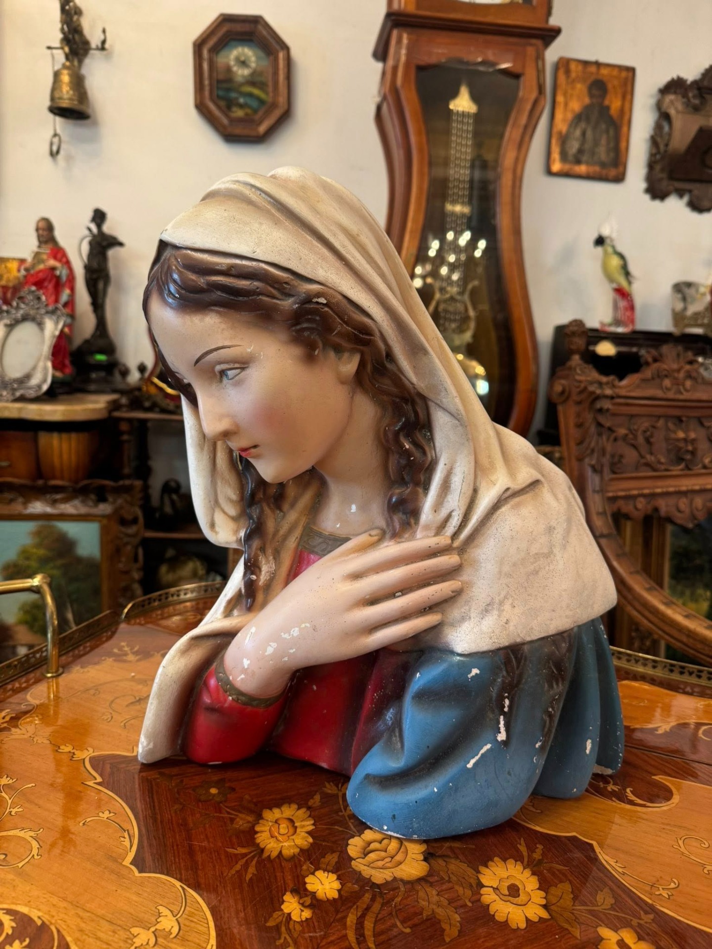 Sculptură din gips dur reprezentând-o pe Fecioara Maria cu o expresie senină și contemplativă. (cca 1940)