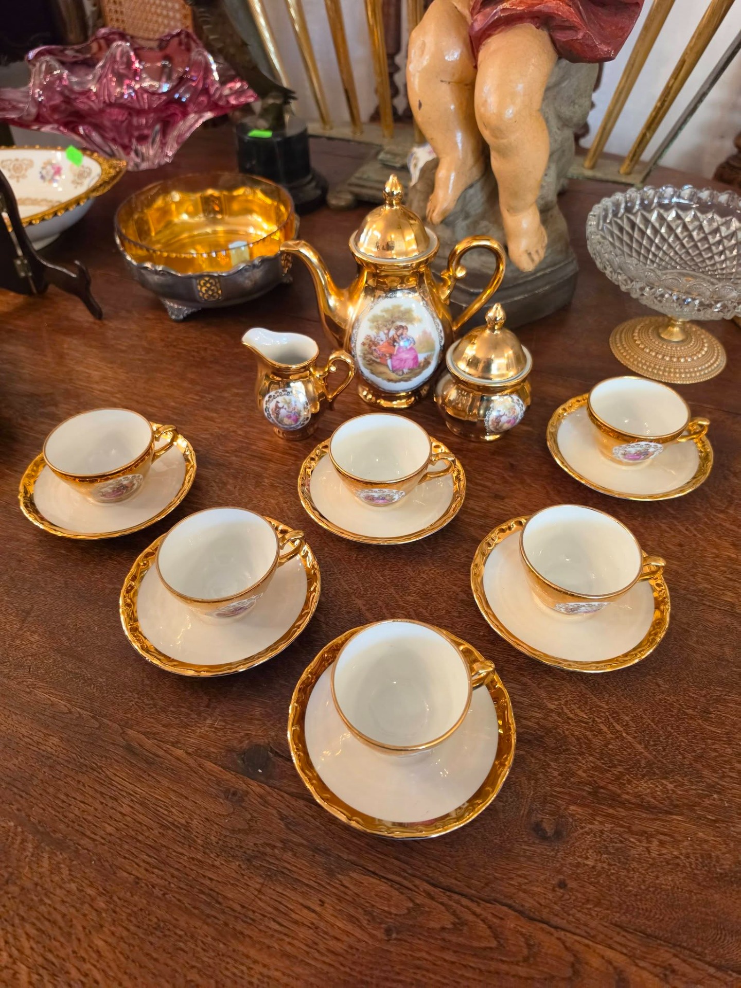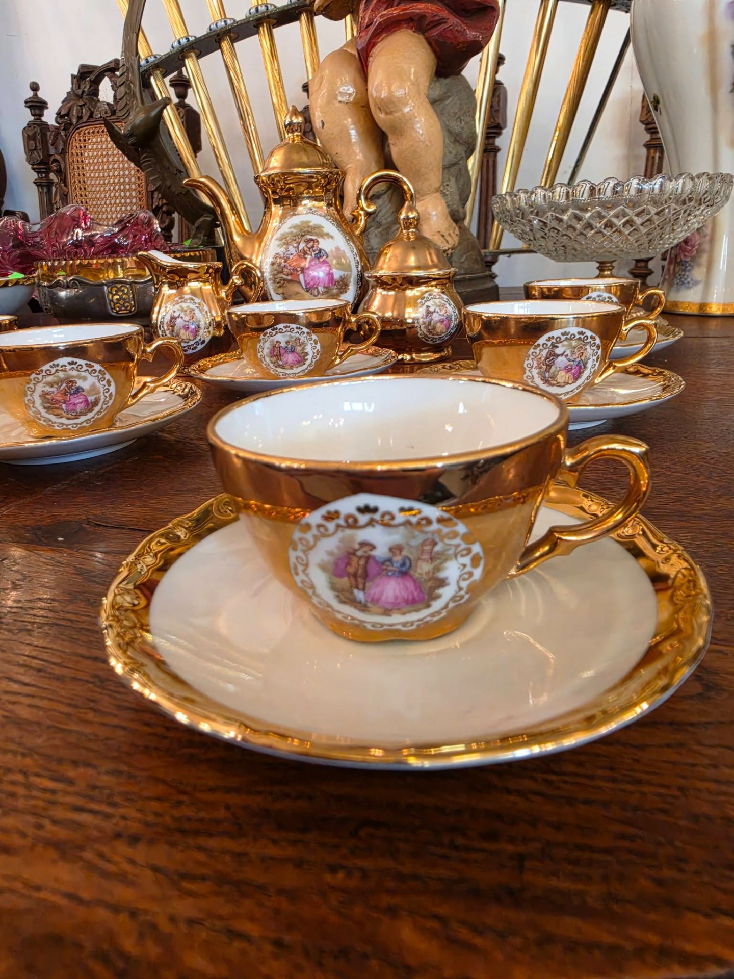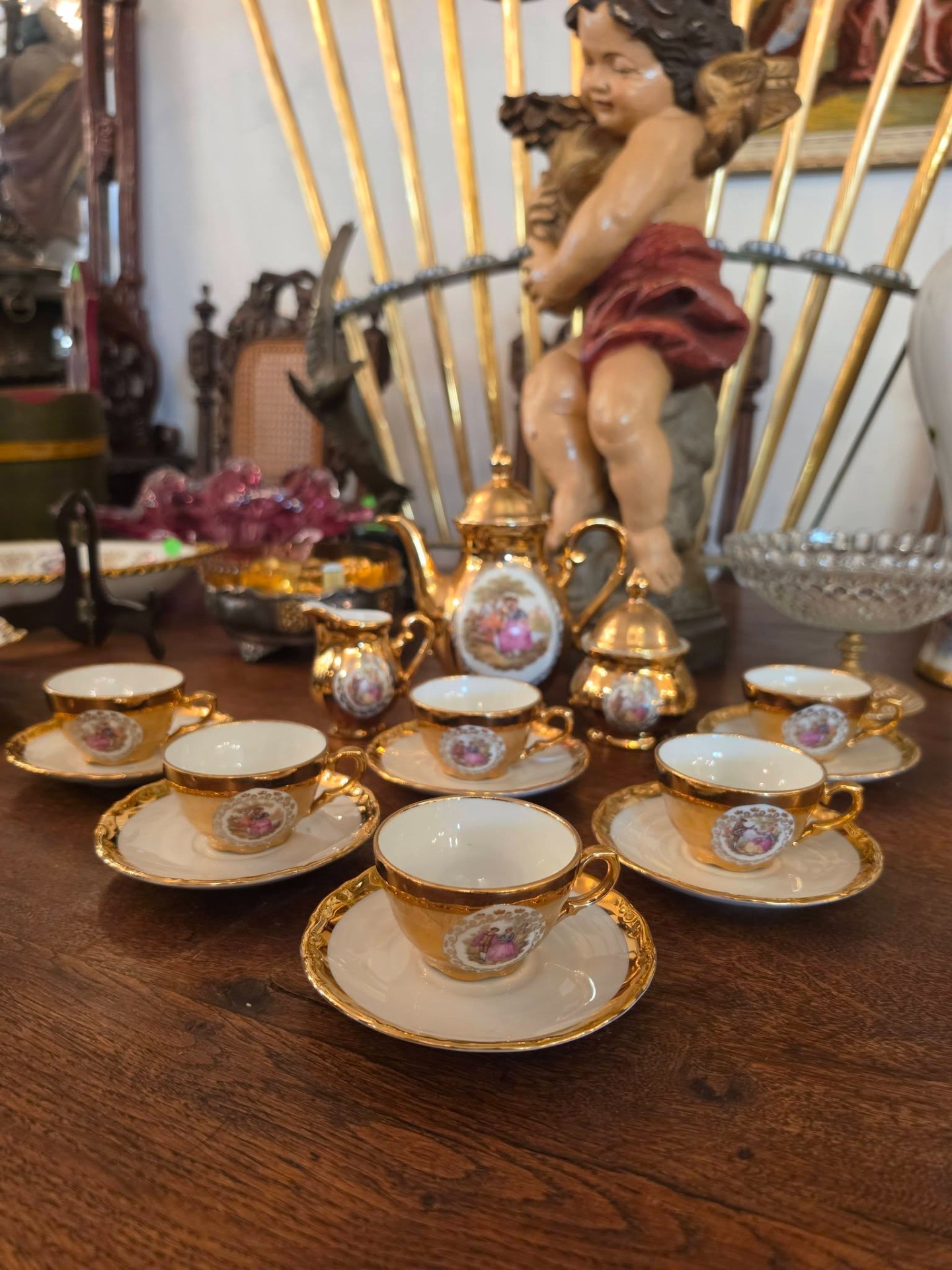 Set elegant de cafea din porțelan bavarez, decorat cu aur de 24K, cu design clasic și motive romantice (scenă galantă în stil baroc/rococo).