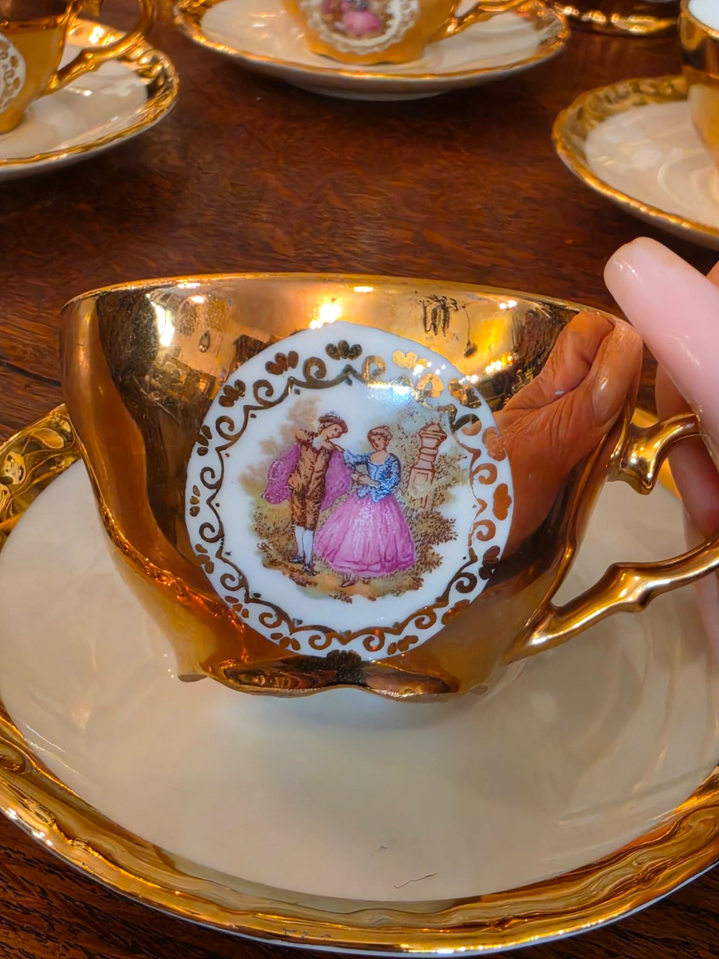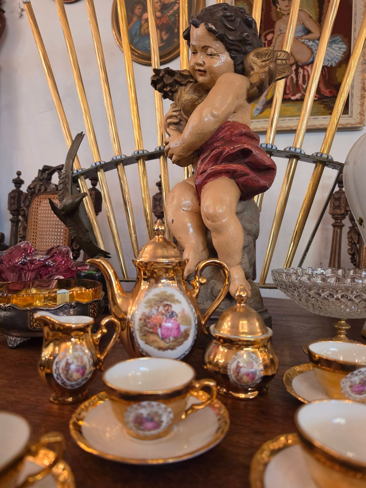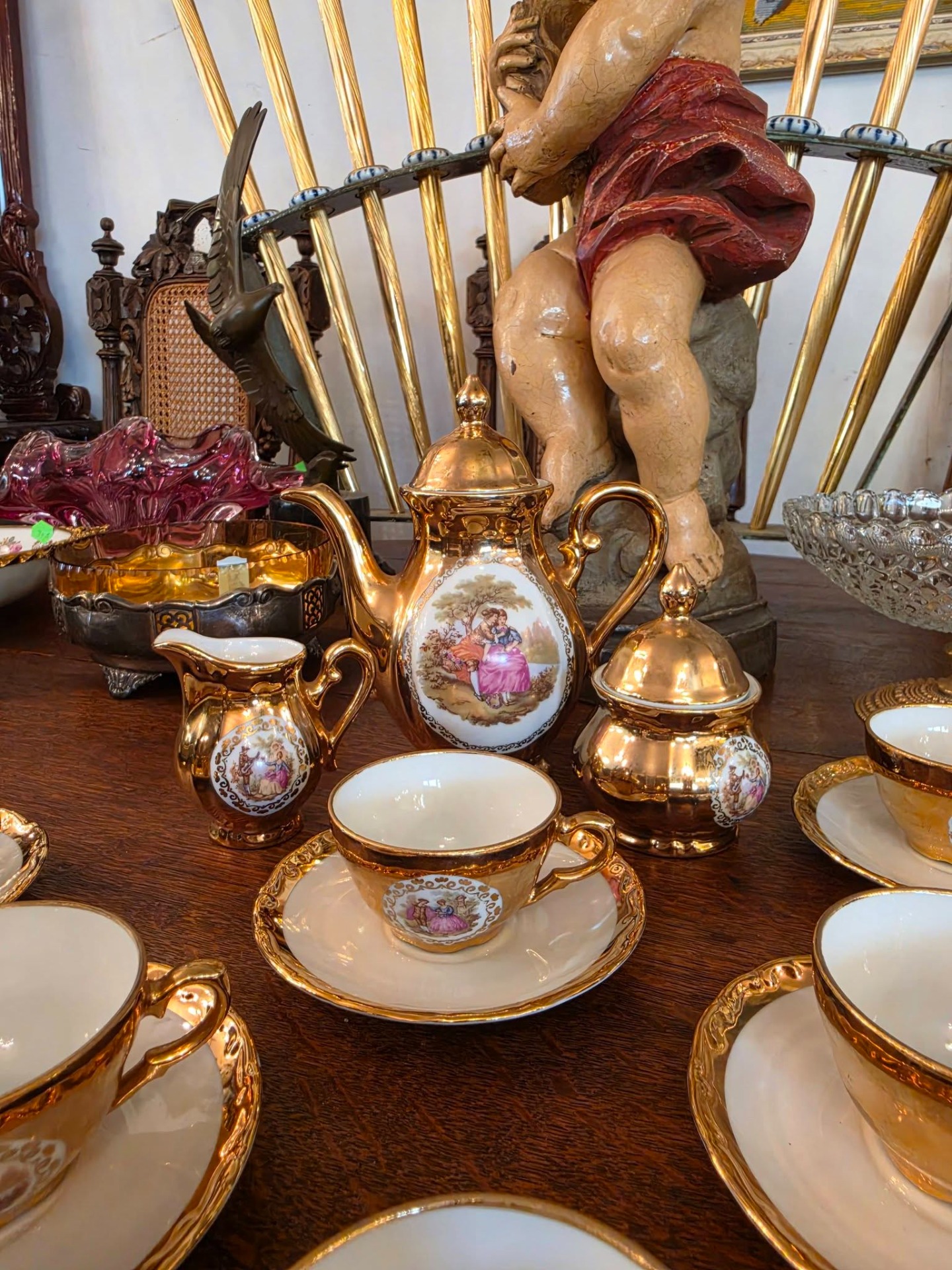 Set elegant de cafea din porțelan bavarez, decorat cu aur de 24K, cu design clasic și motive romantice (scenă galantă în stil baroc/rococo).