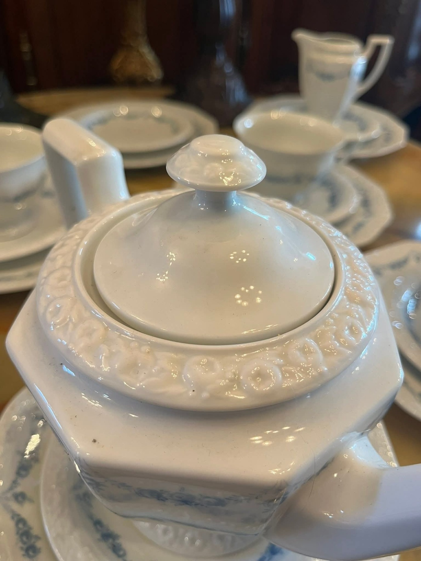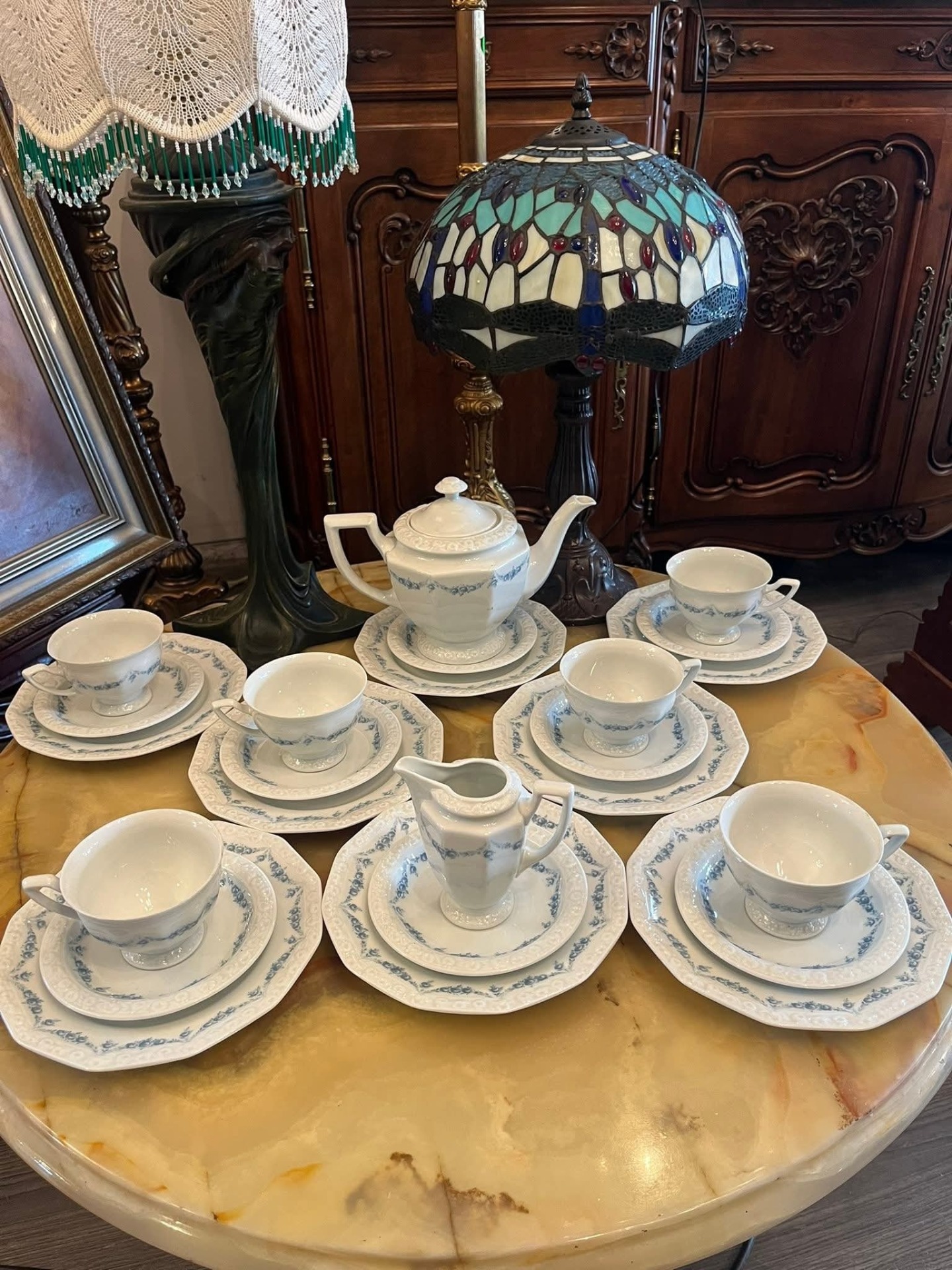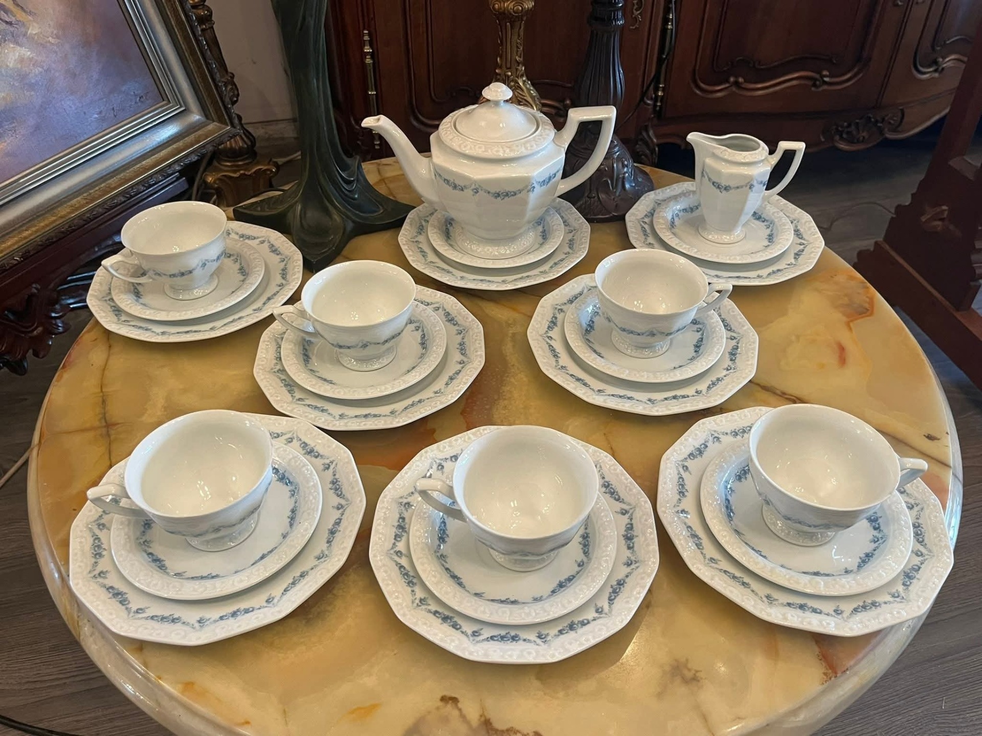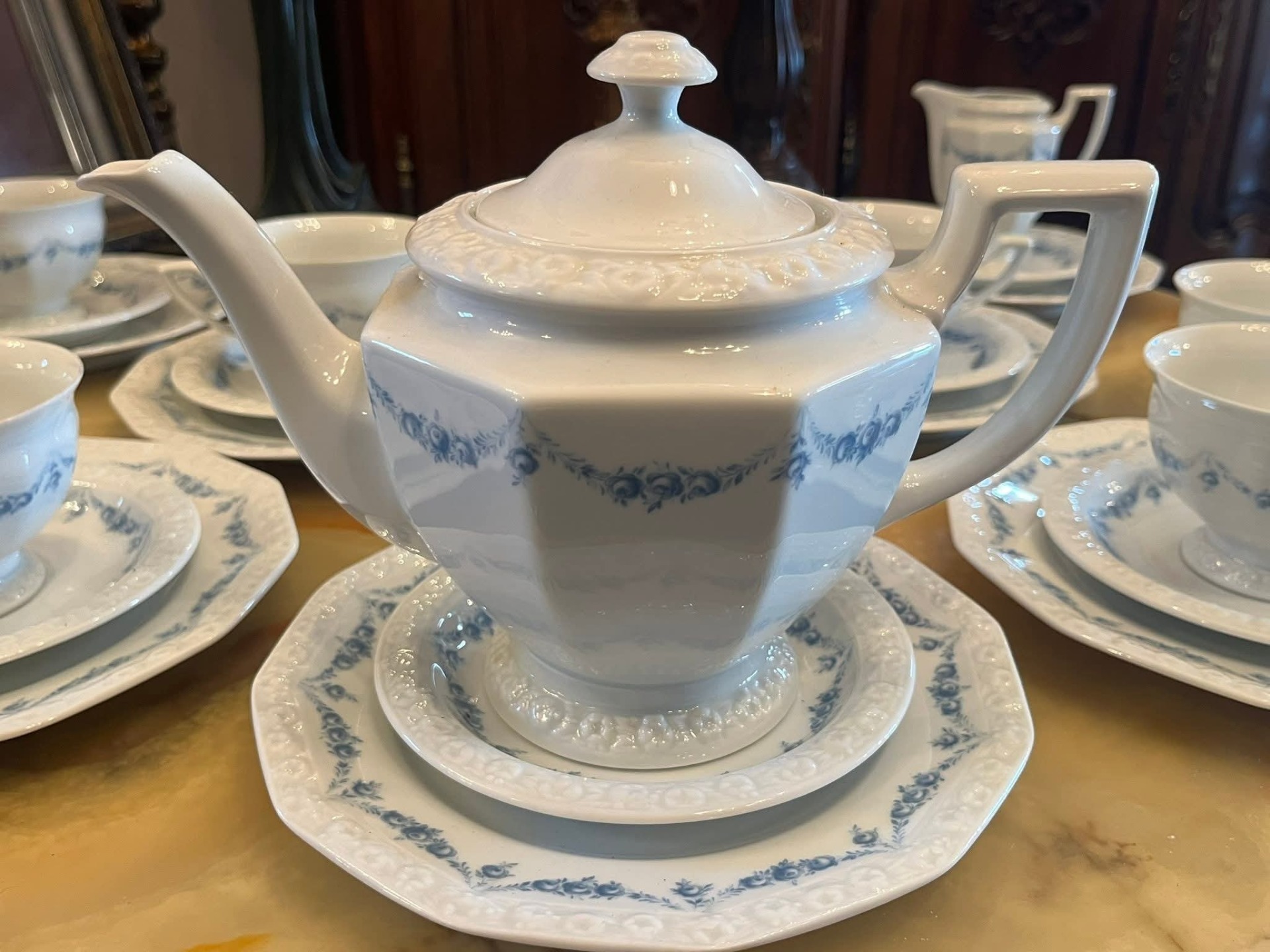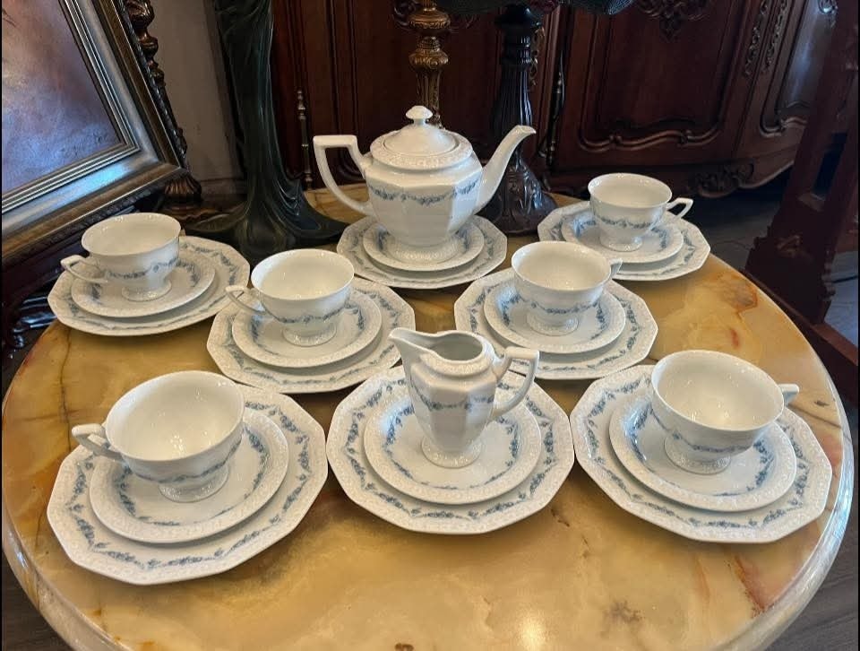 Serviciu rafinat de ceai/cafea realizat de prestigioasa manufactură Rosenthal Group – Germany, din porțelan alb de calitate superioară, decorat cu model delicat albastru în stil clasic, foarte elegant.