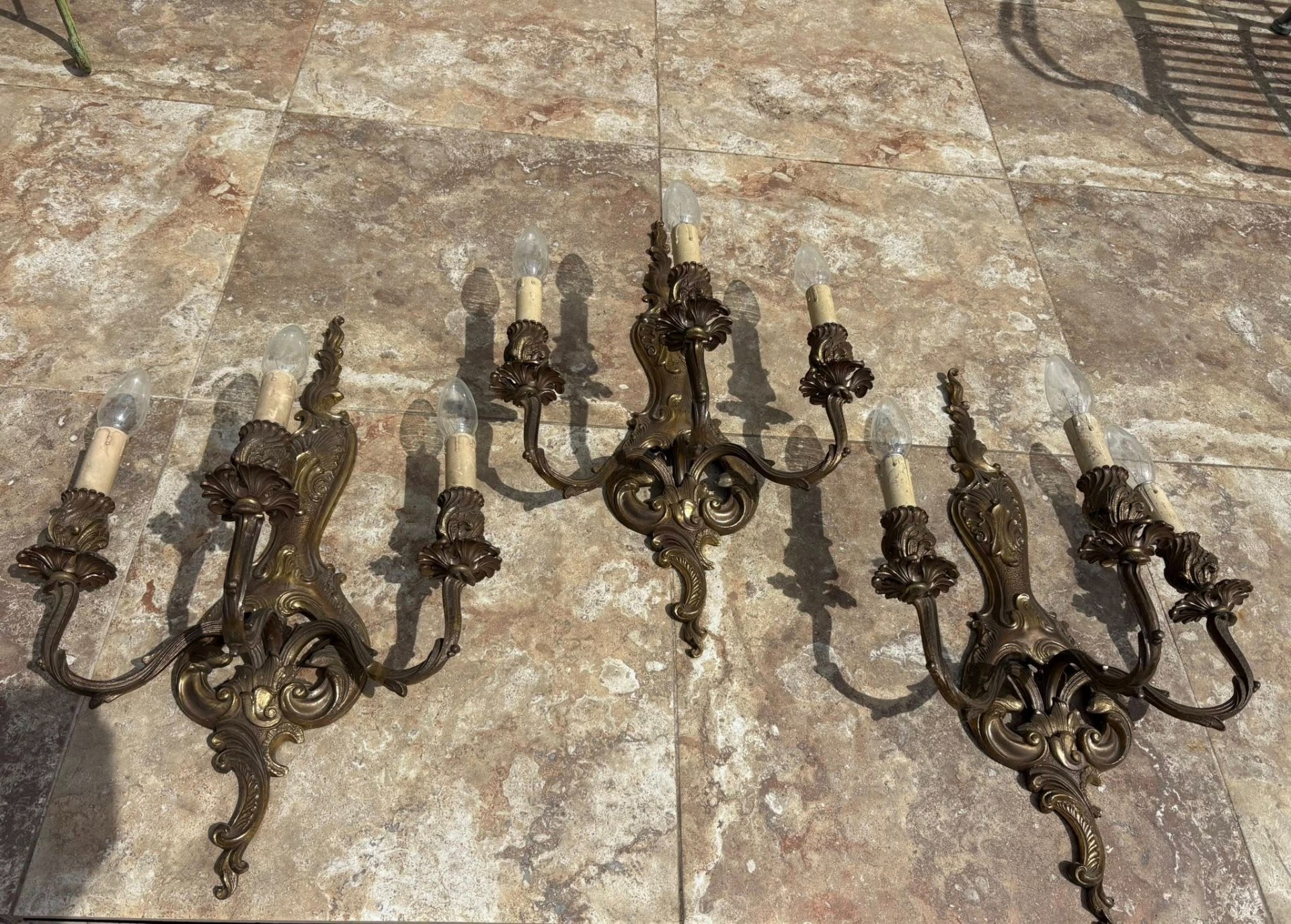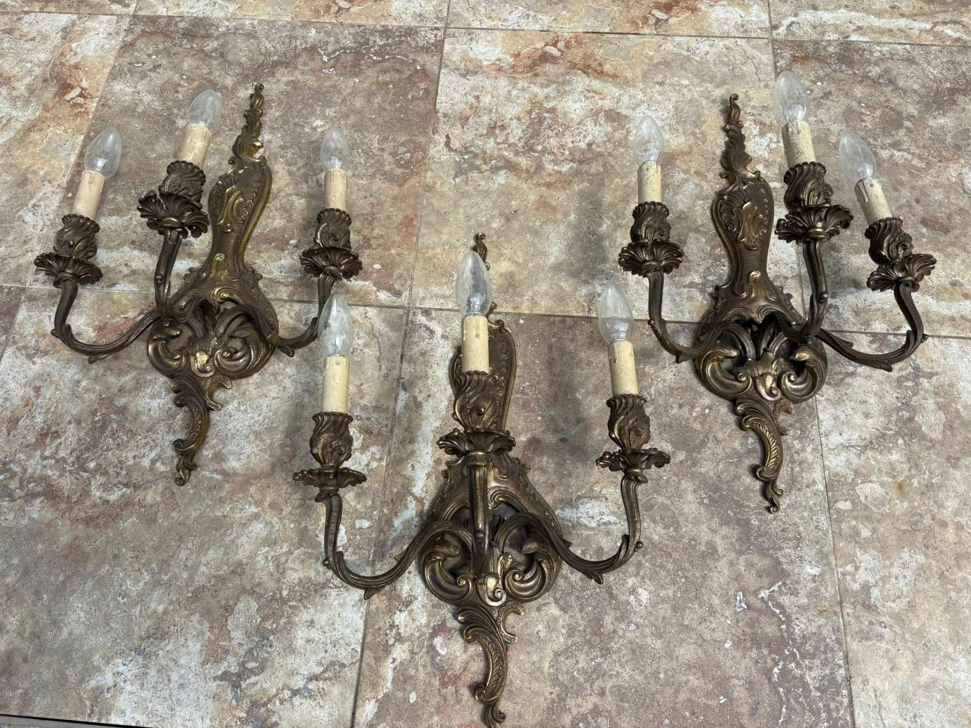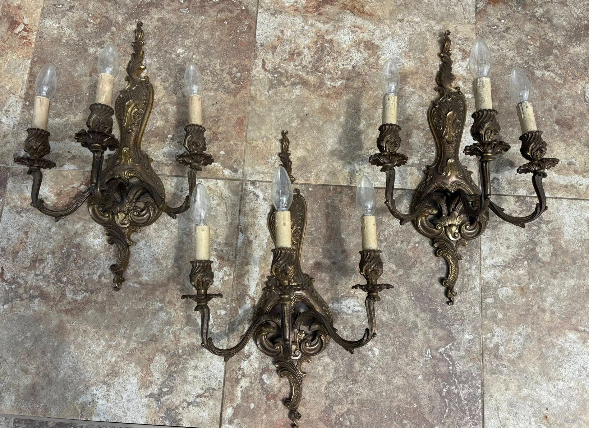 Set 3 Aplice Vintage din Bronz Masiv – Model Rococo,realizate din bronz masiv.Fiecare aplică dispune de 3 brațe ornamentate cu motive florale și detalii sculptate fin.