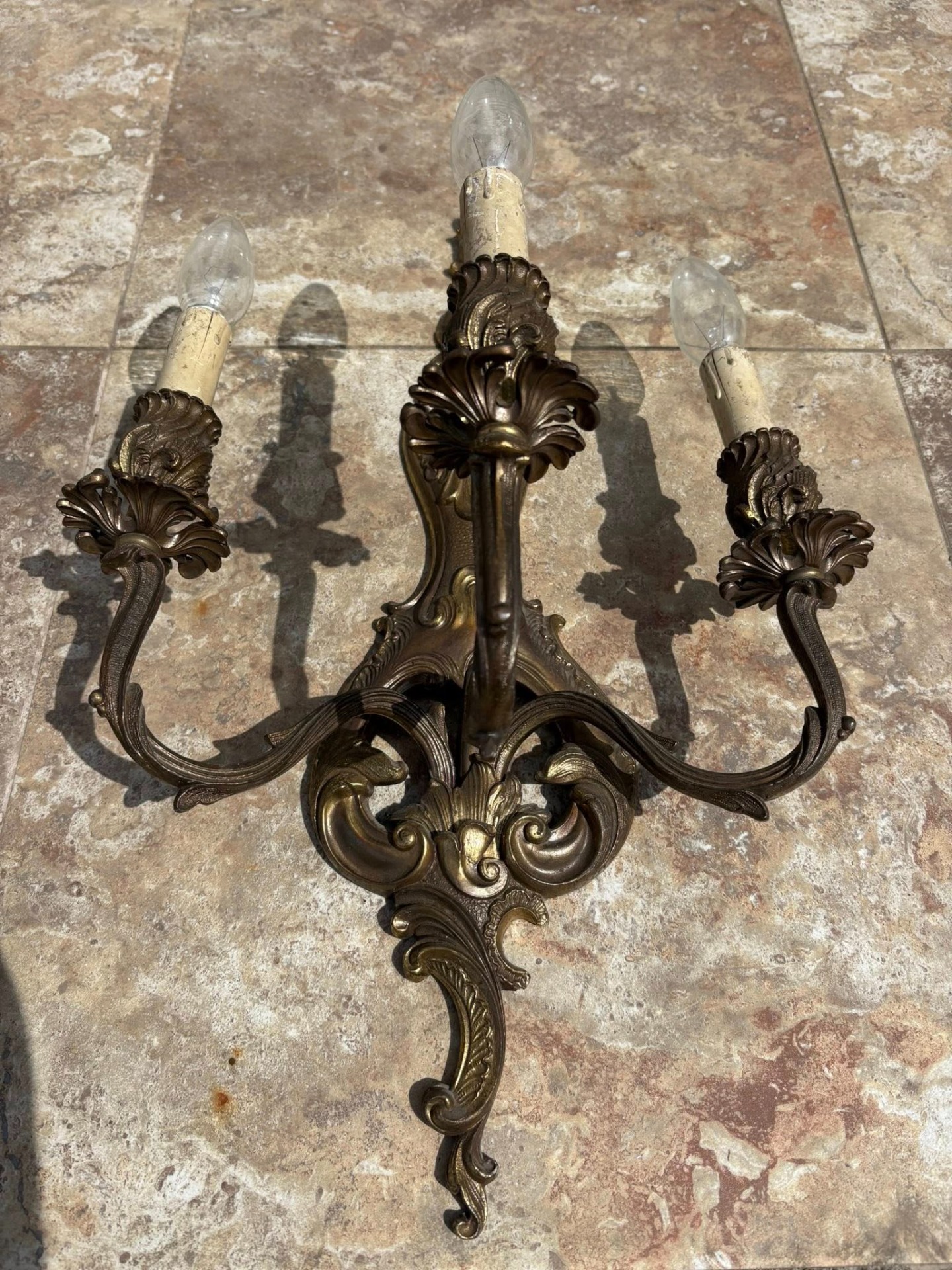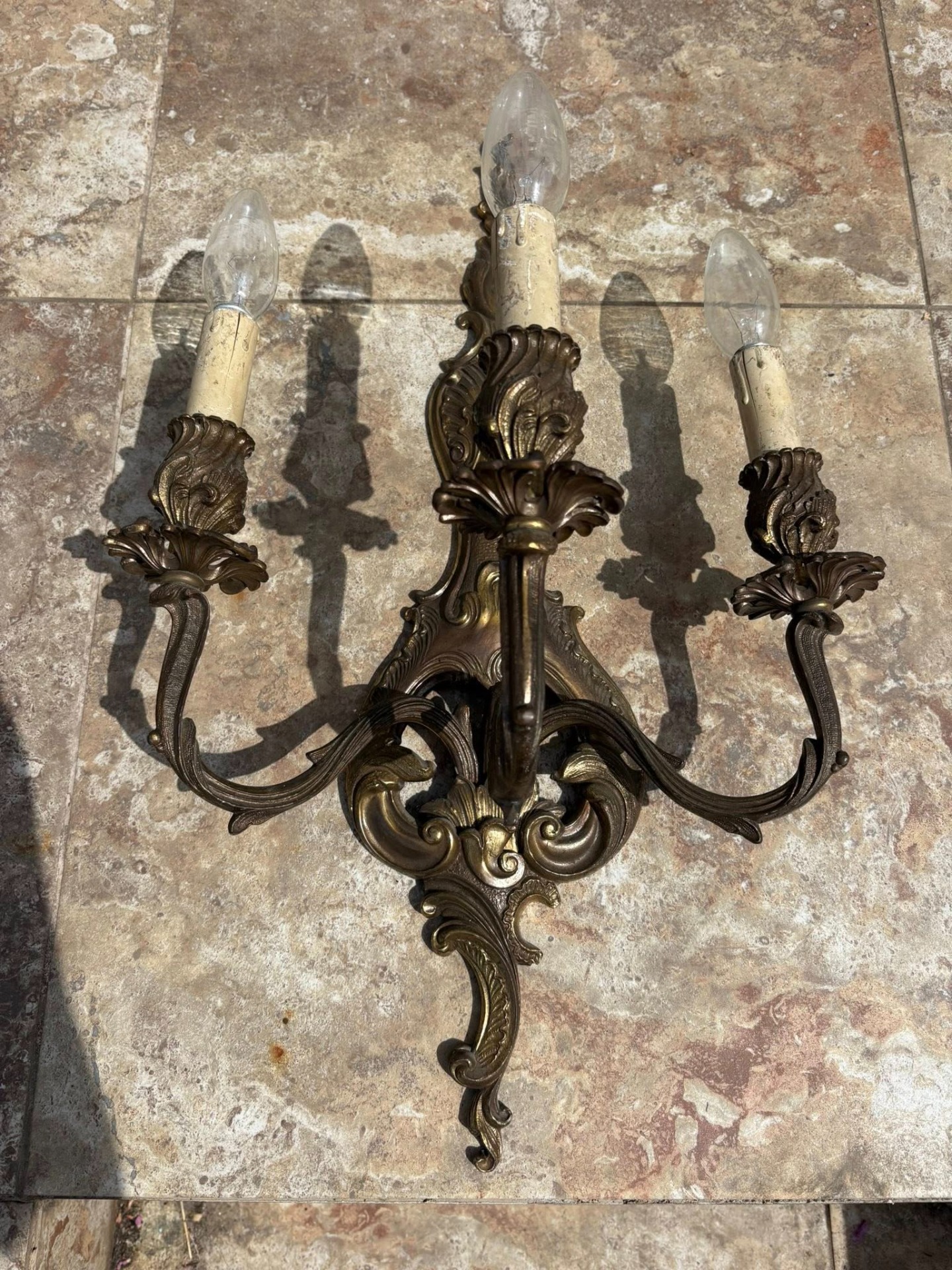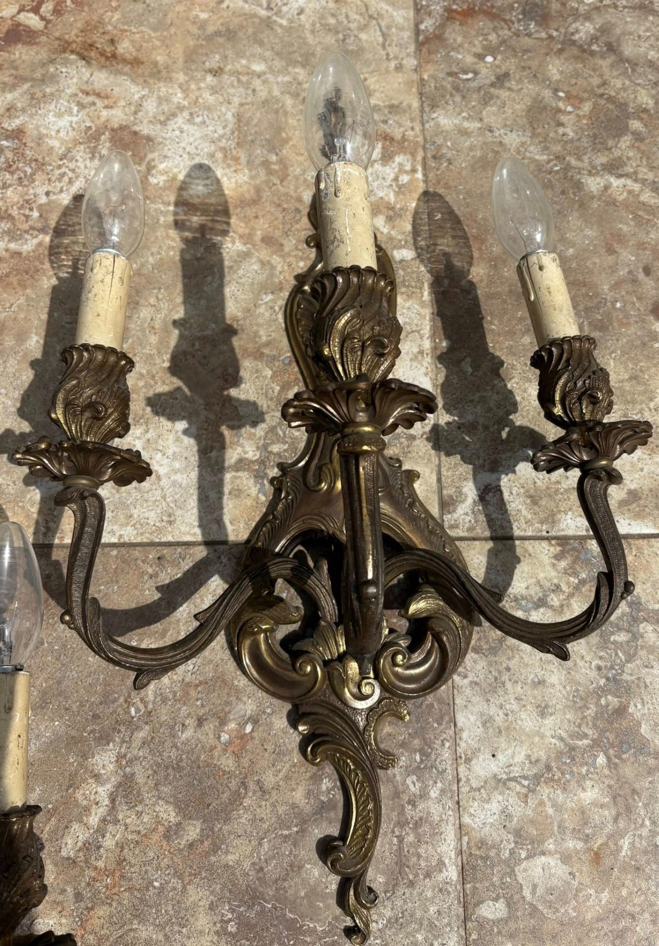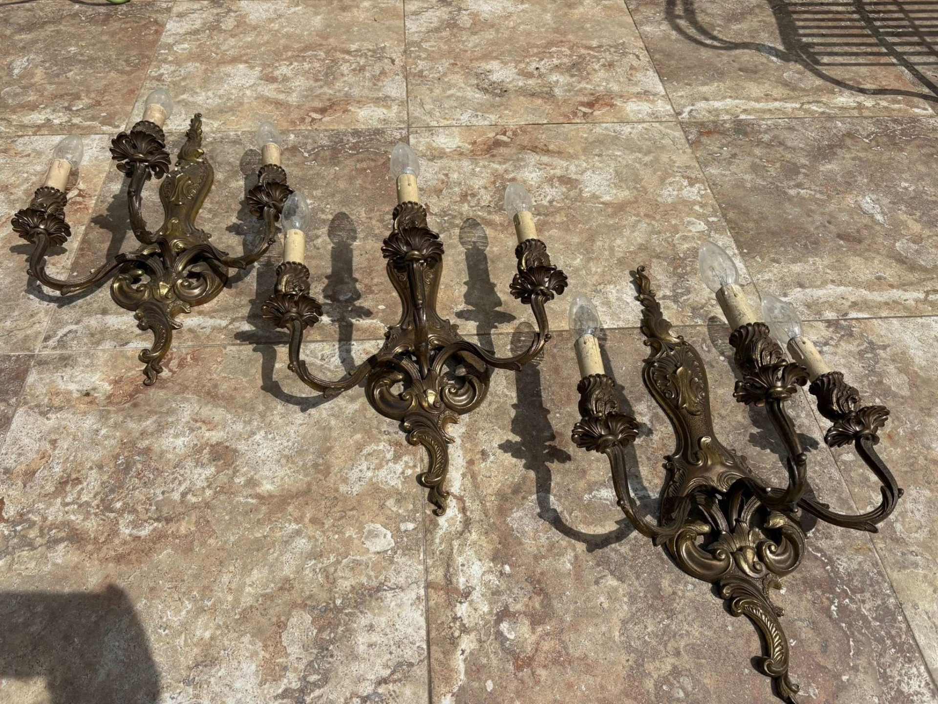 Set 3 Aplice Vintage din Bronz Masiv – Model Rococo,realizate din bronz masiv.Fiecare aplică dispune de 3 brațe ornamentate cu motive florale și detalii sculptate fin.