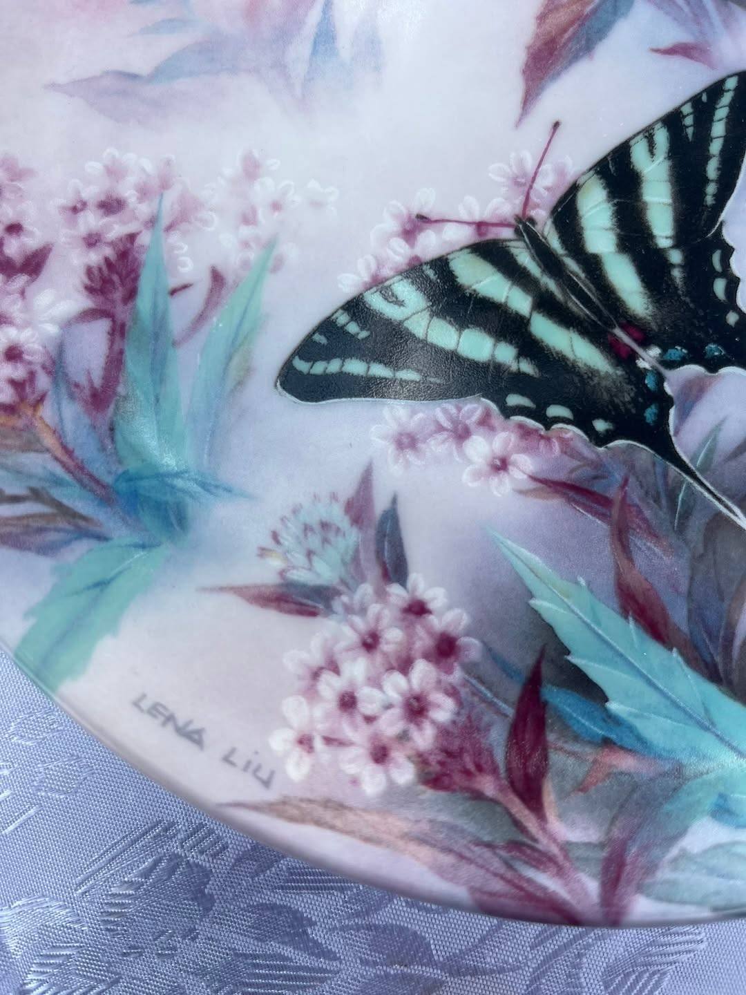 din porțelan fin, cu ilustrații delicate de fluturi și flori, realizate de Lena Liu, artist recunoscut pentru lucrările sale inspirate din natură.