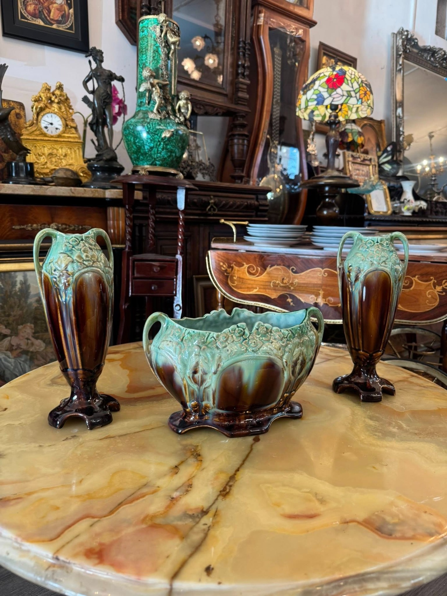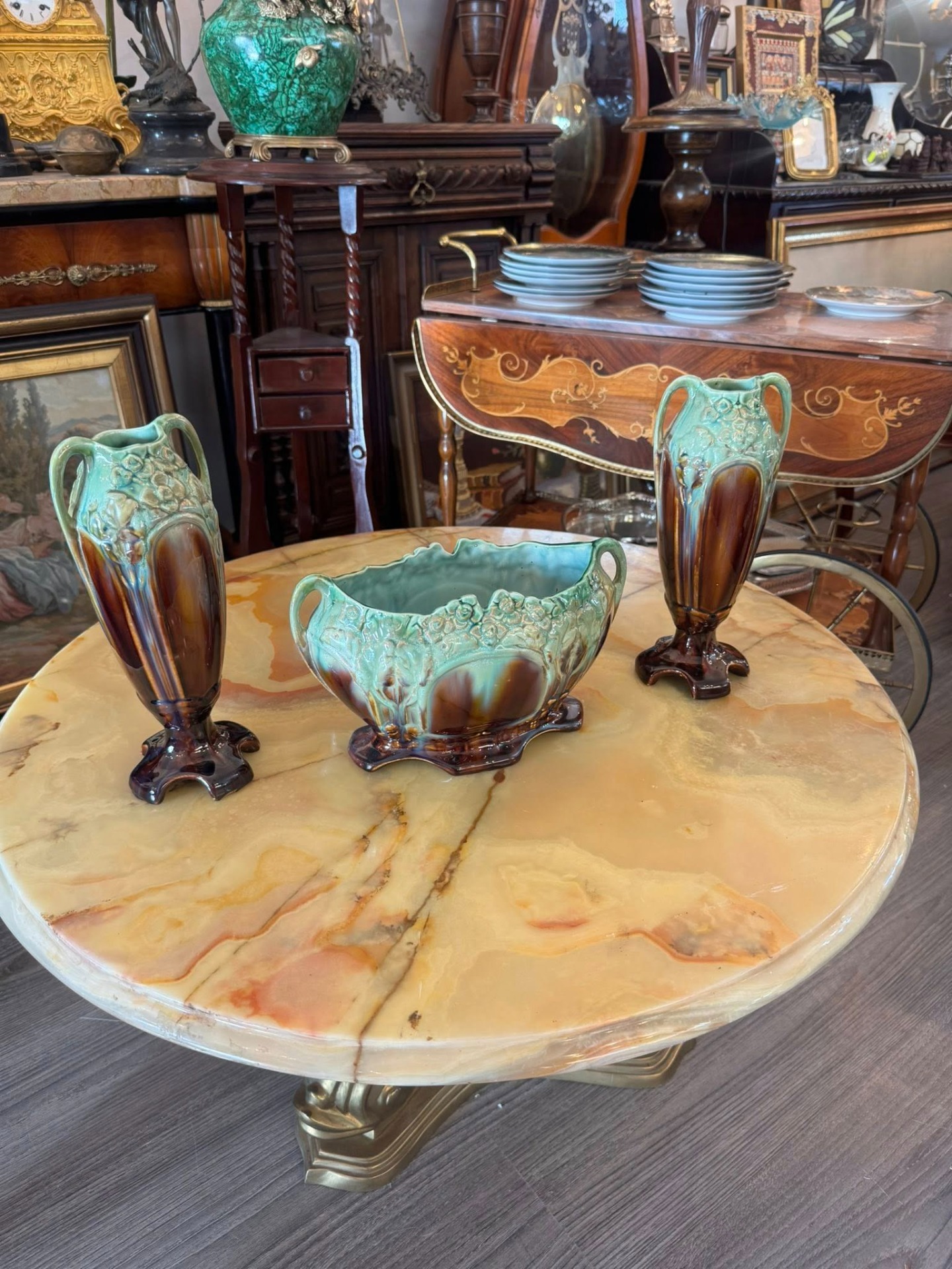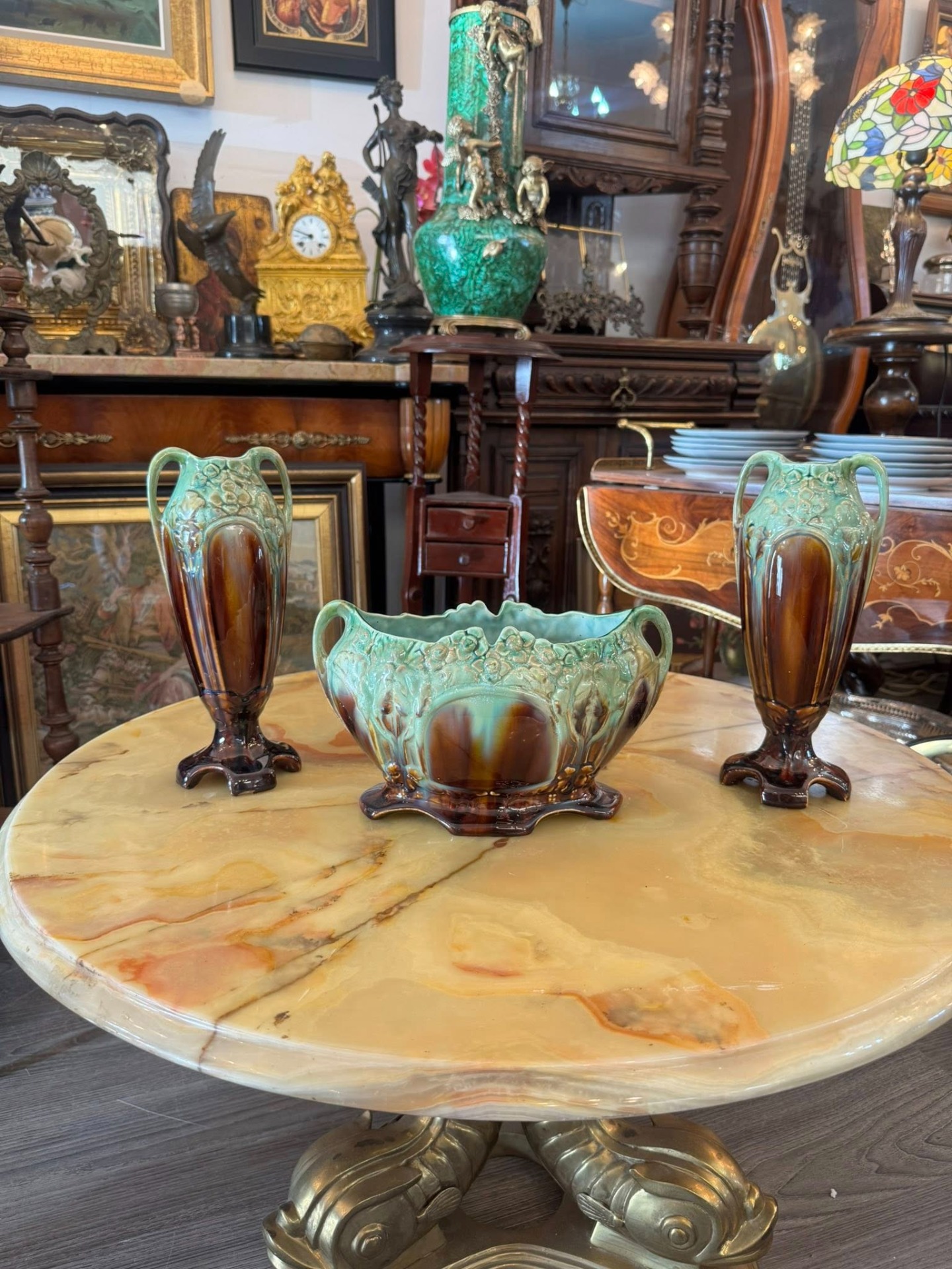 Set ceramic spectaculos, compus dintr-un bol central (cachepot/jardinière) și o pereche de vaze înalte, un exemplu superb al ceramicii de la sfârșitul