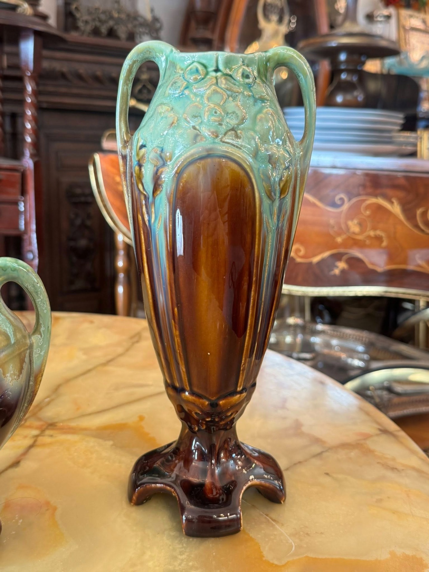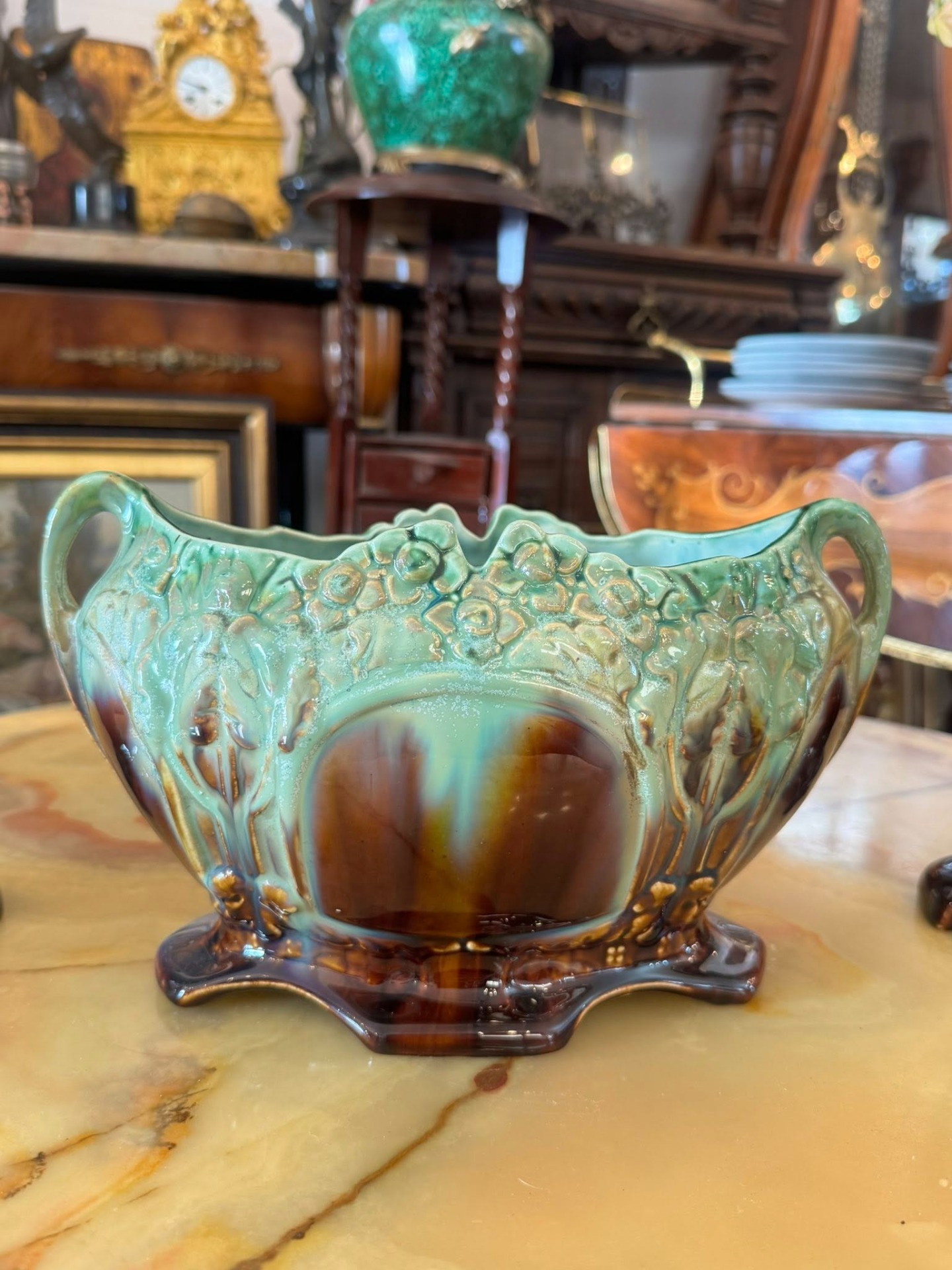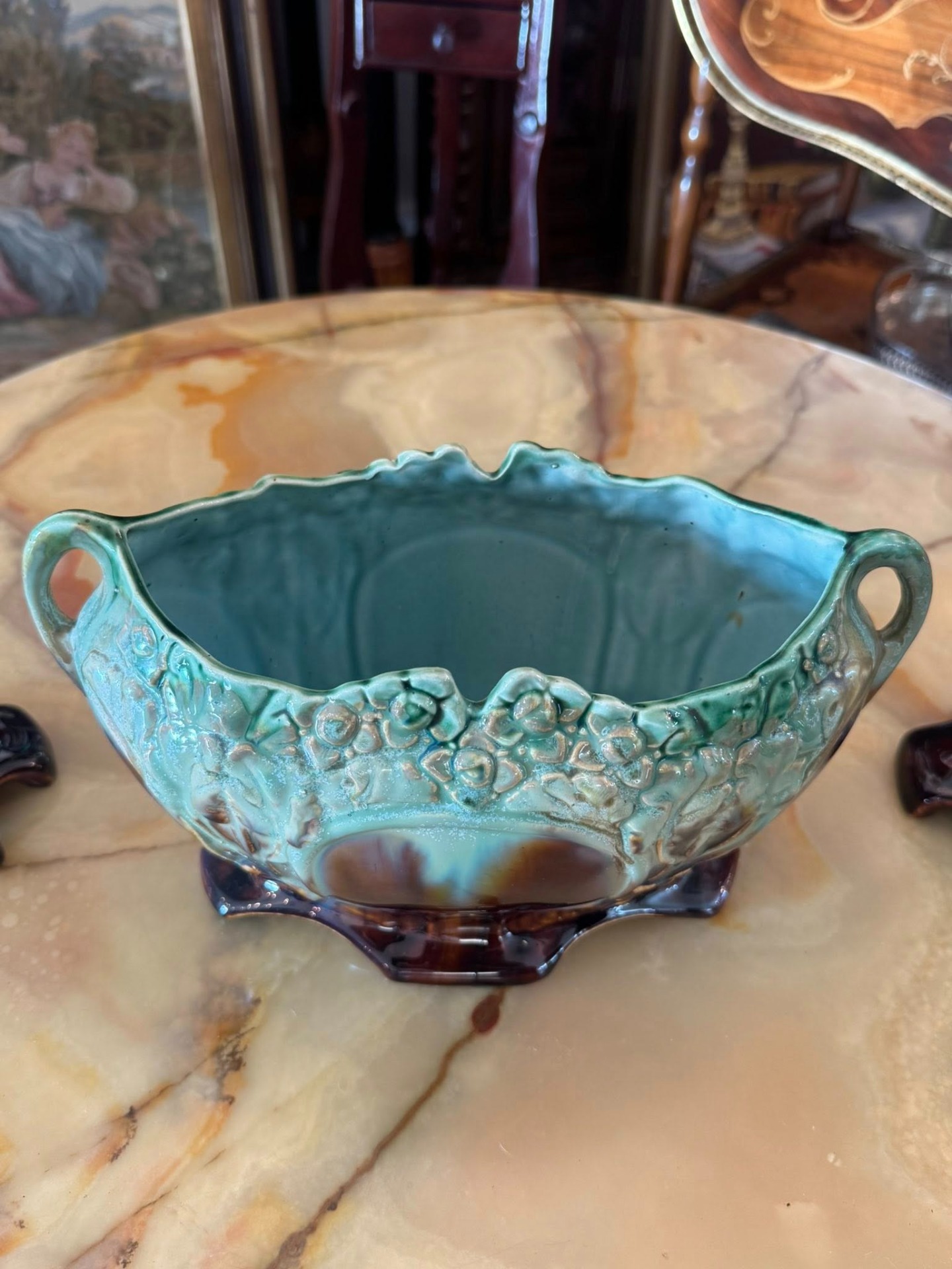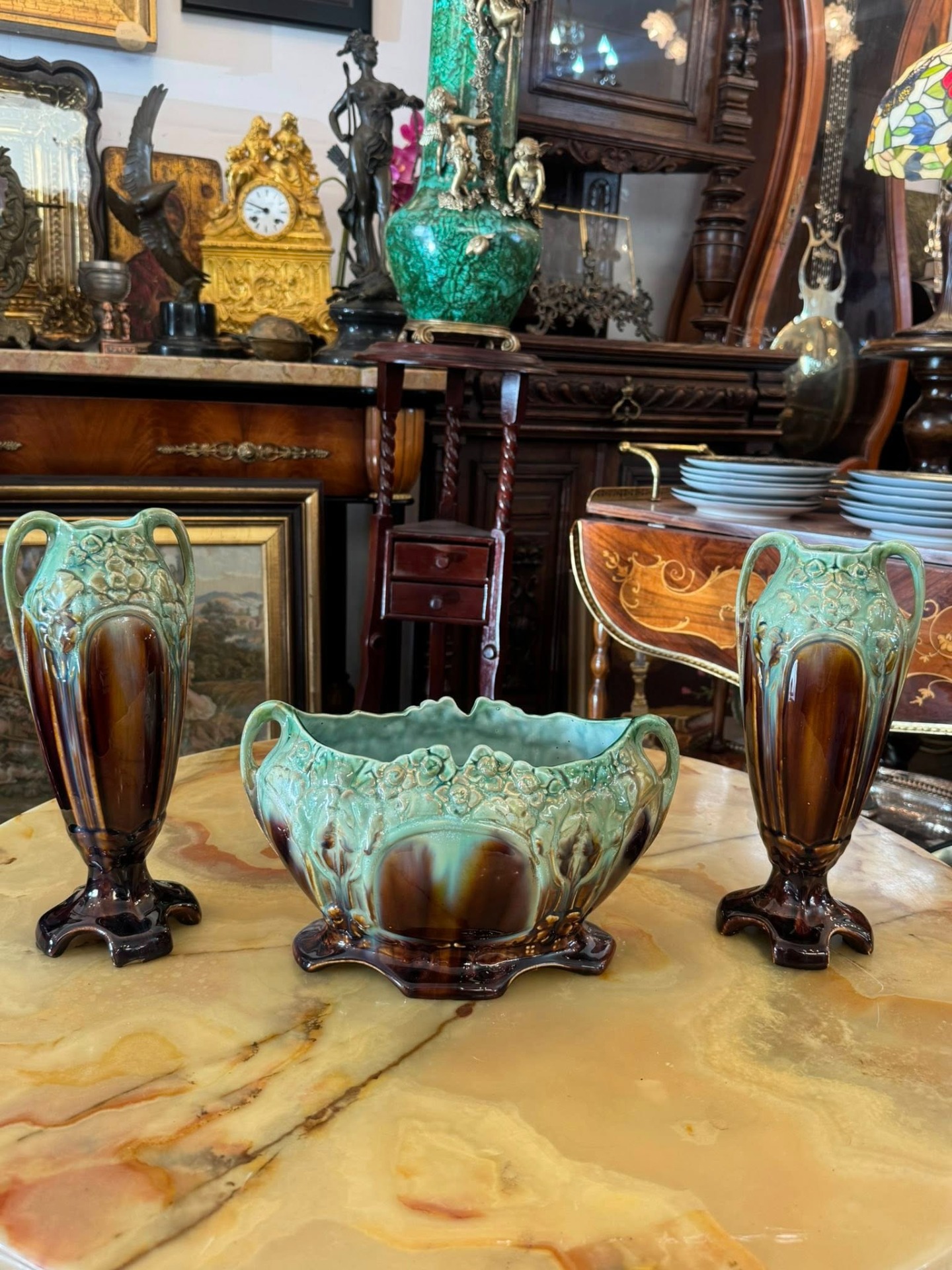 Set ceramic spectaculos, compus dintr-un bol central (cachepot/jardinière) și o pereche de vaze înalte, un exemplu superb al ceramicii de la sfârșitul