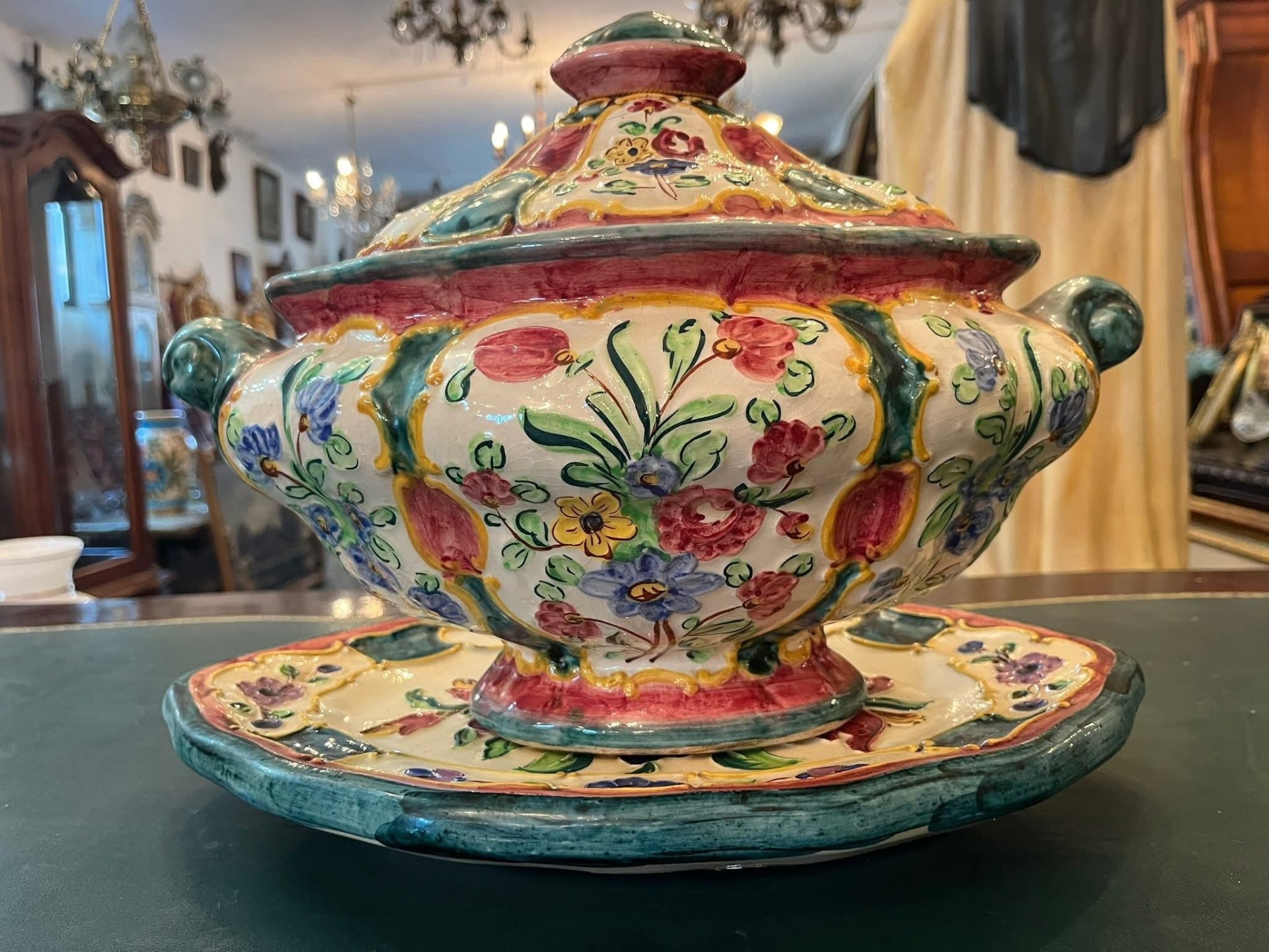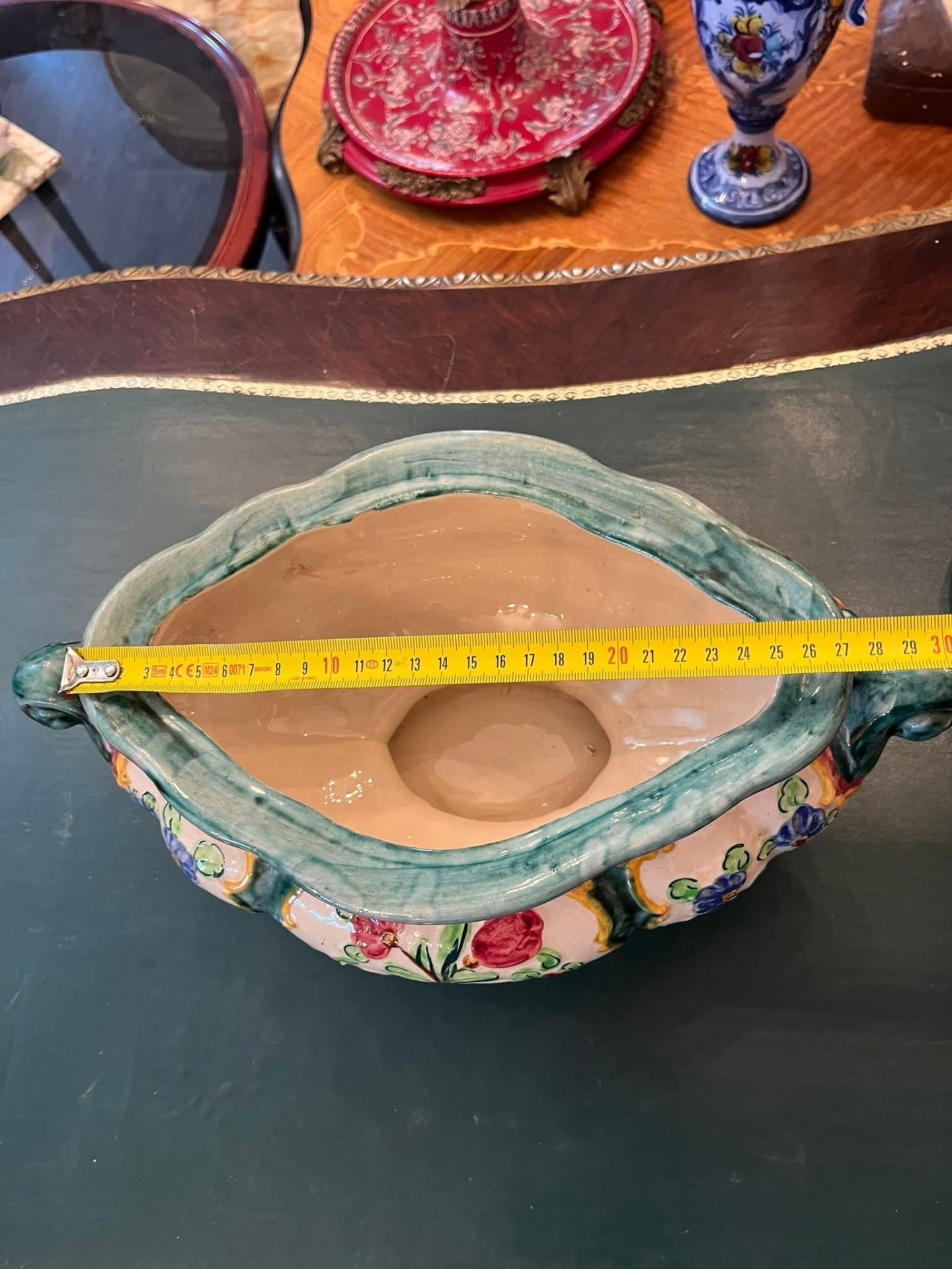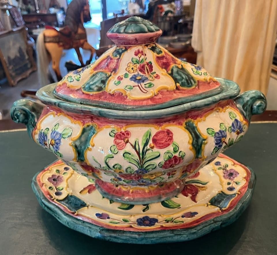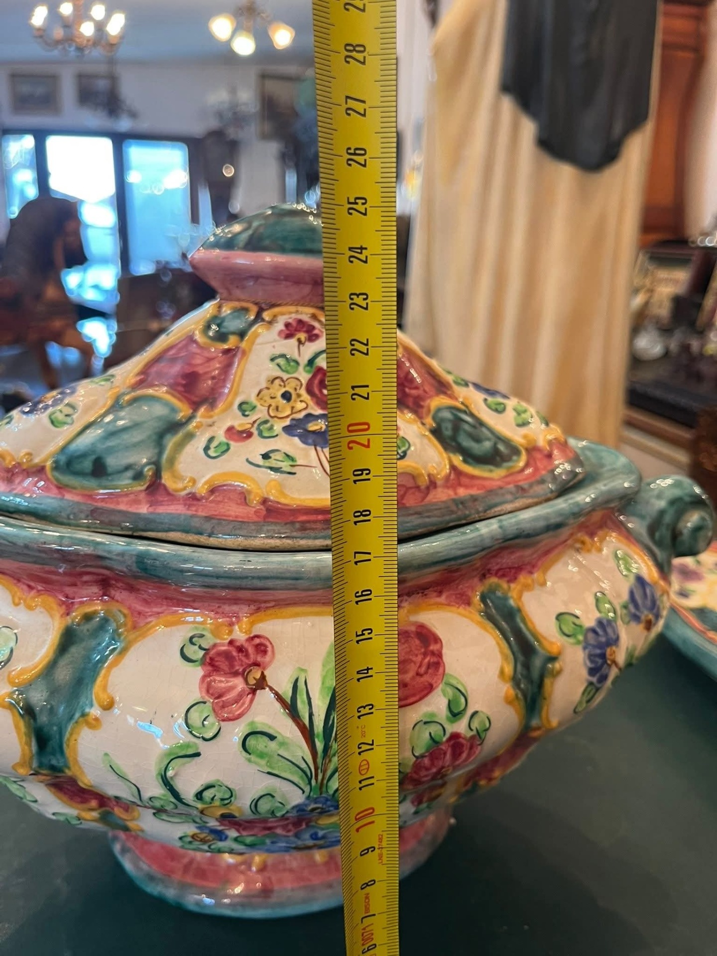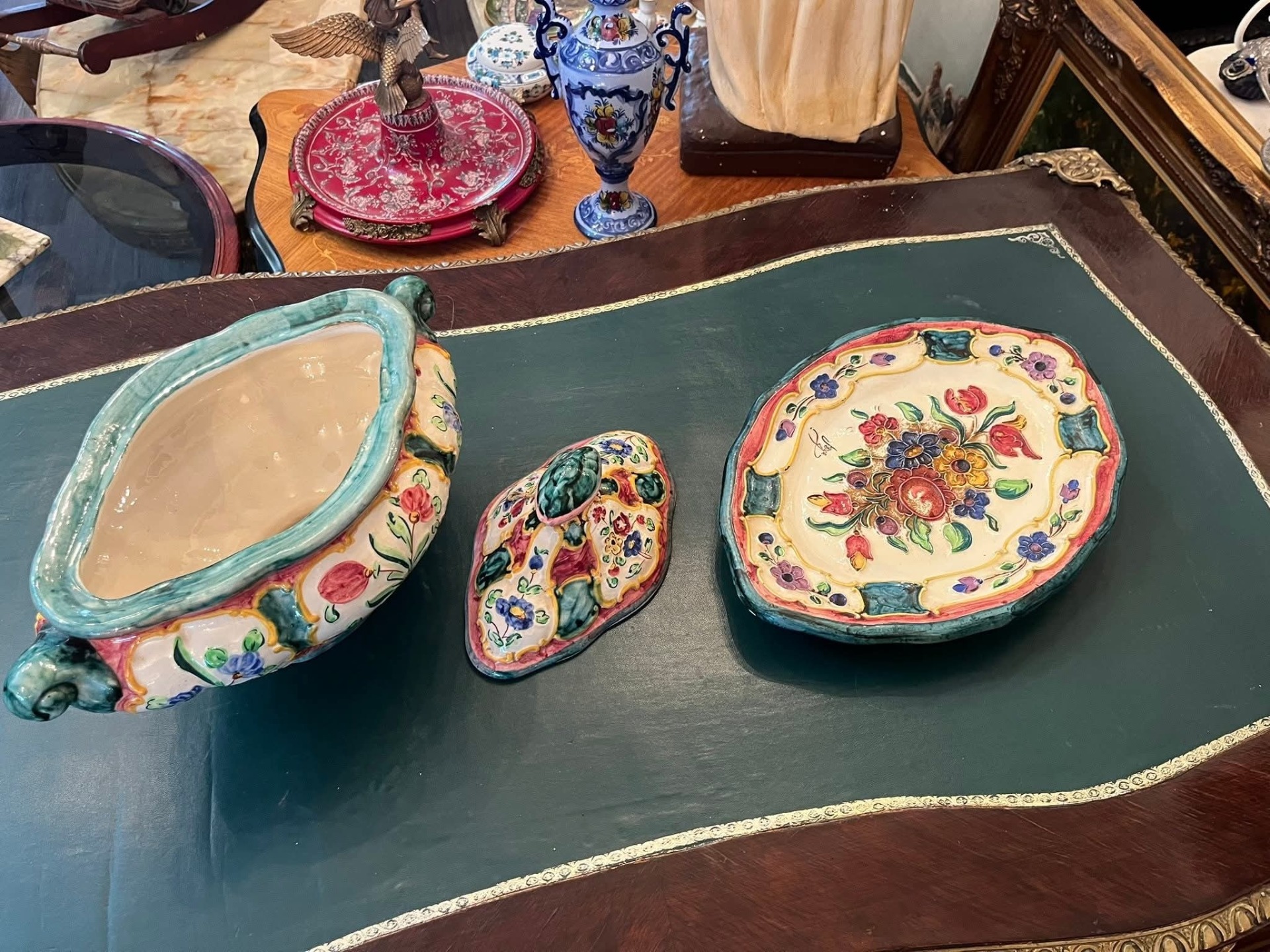 Set ceramică antică semnată – supieră cu capac și platou (Franța, sec. XIX–început sec. XX)