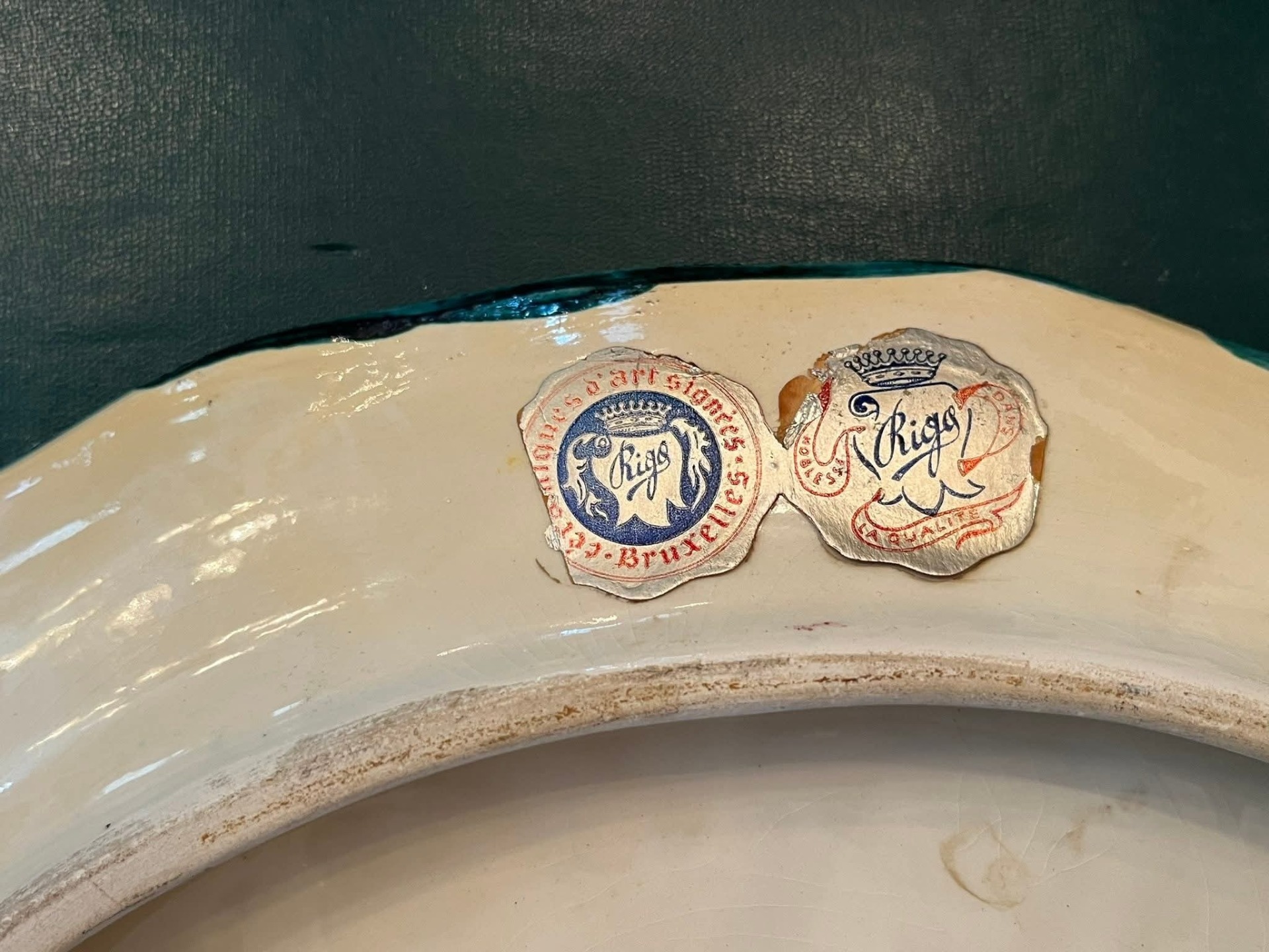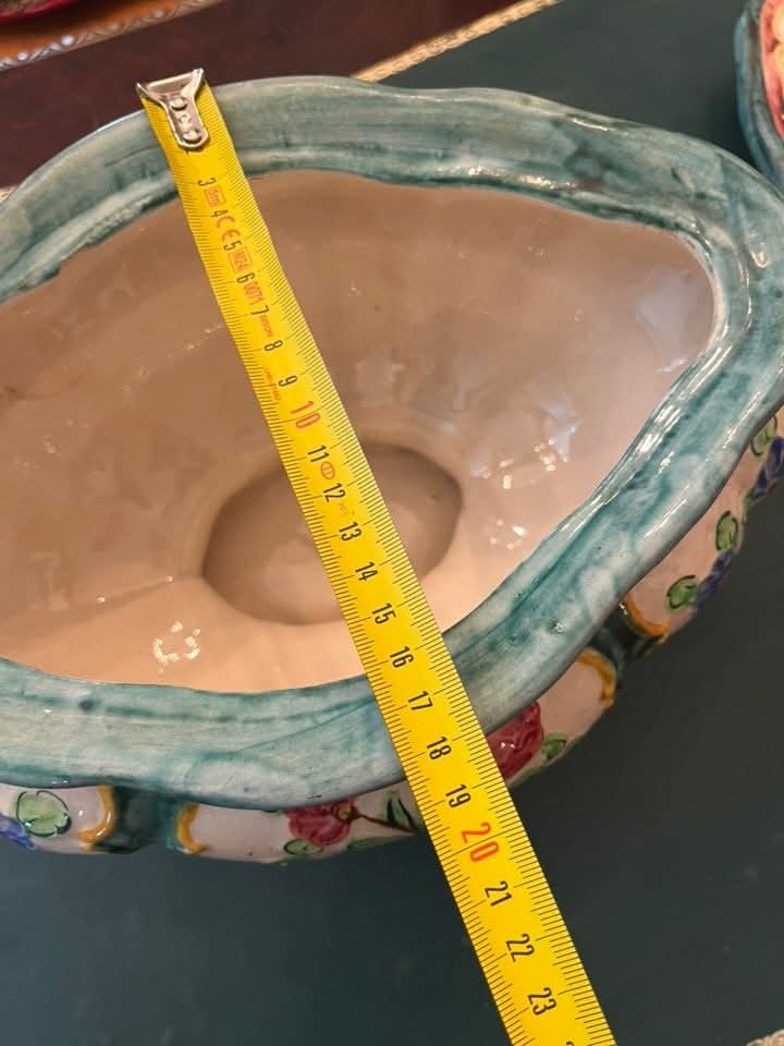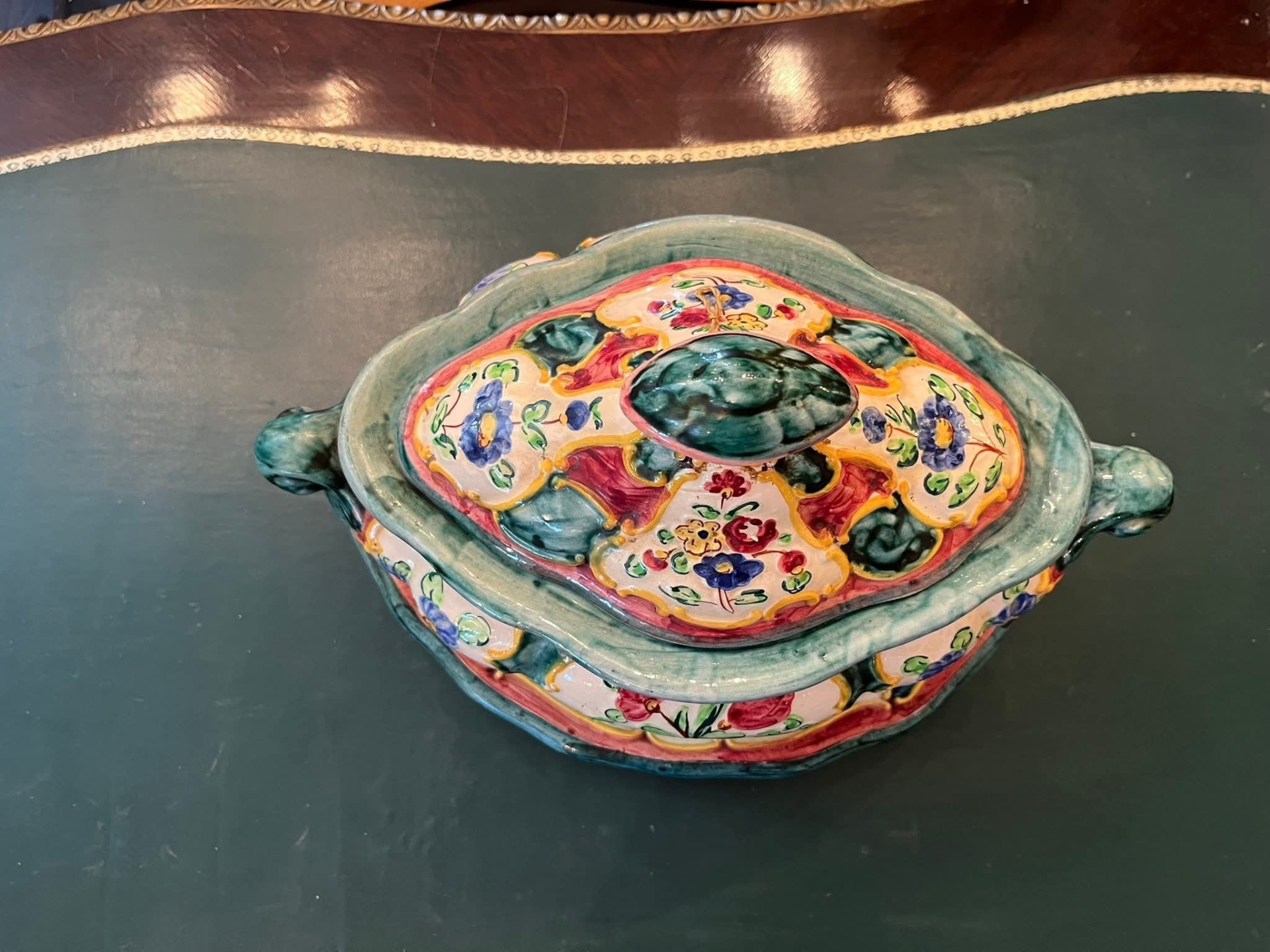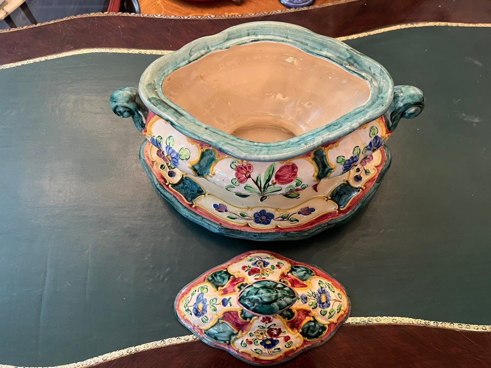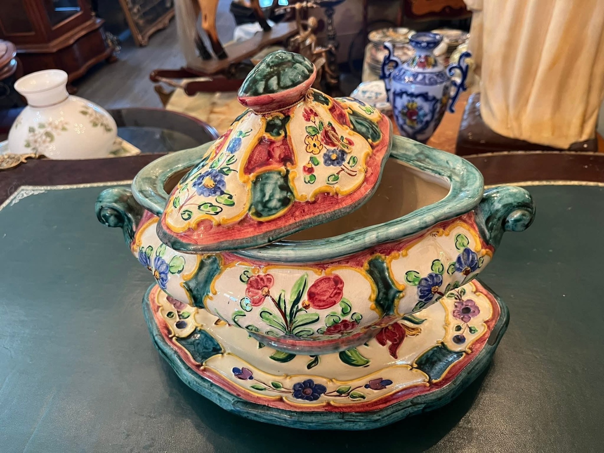 Set ceramică antică semnată – supieră cu capac și platou (Franța, sec. XIX–început sec. XX)