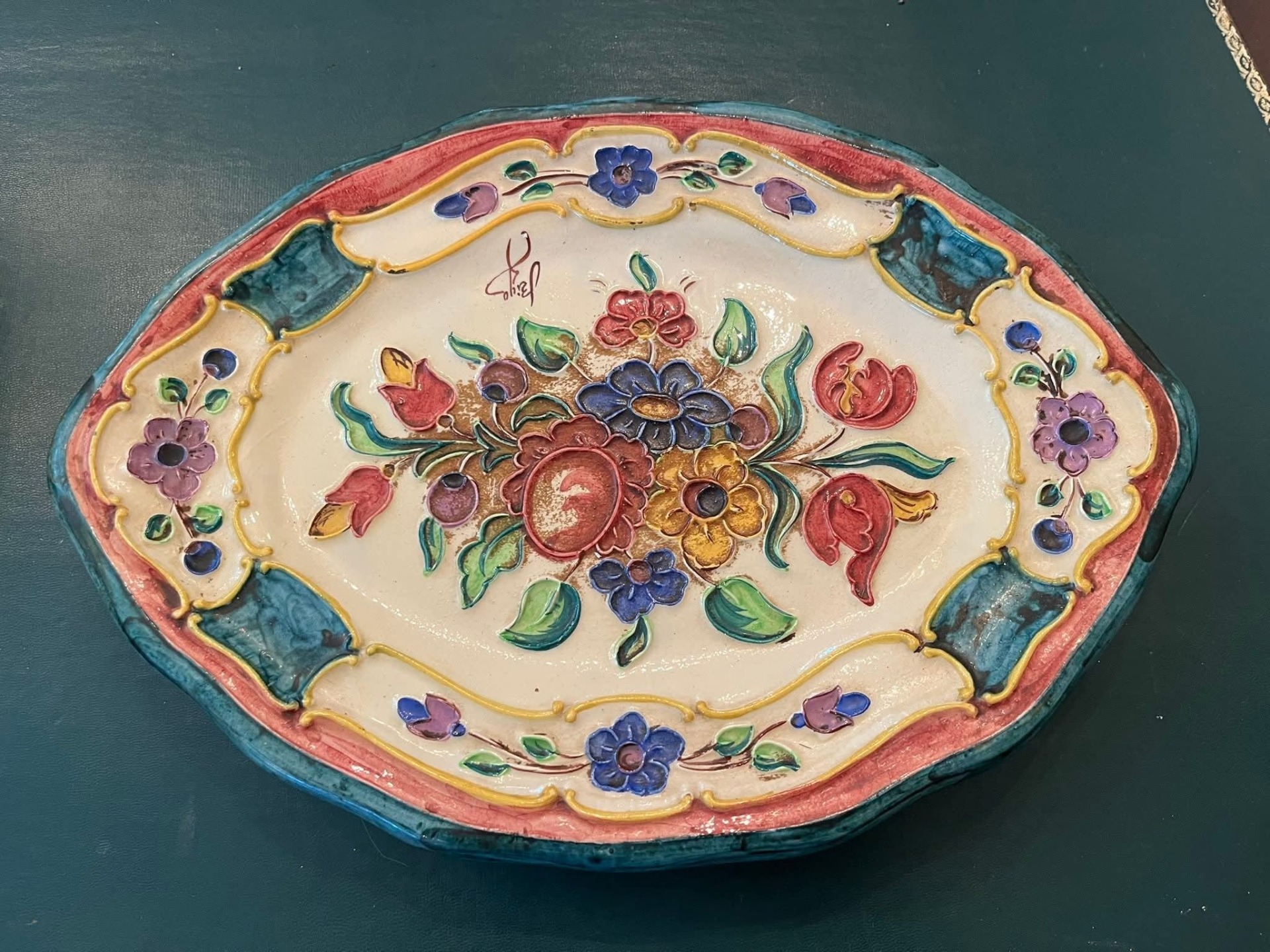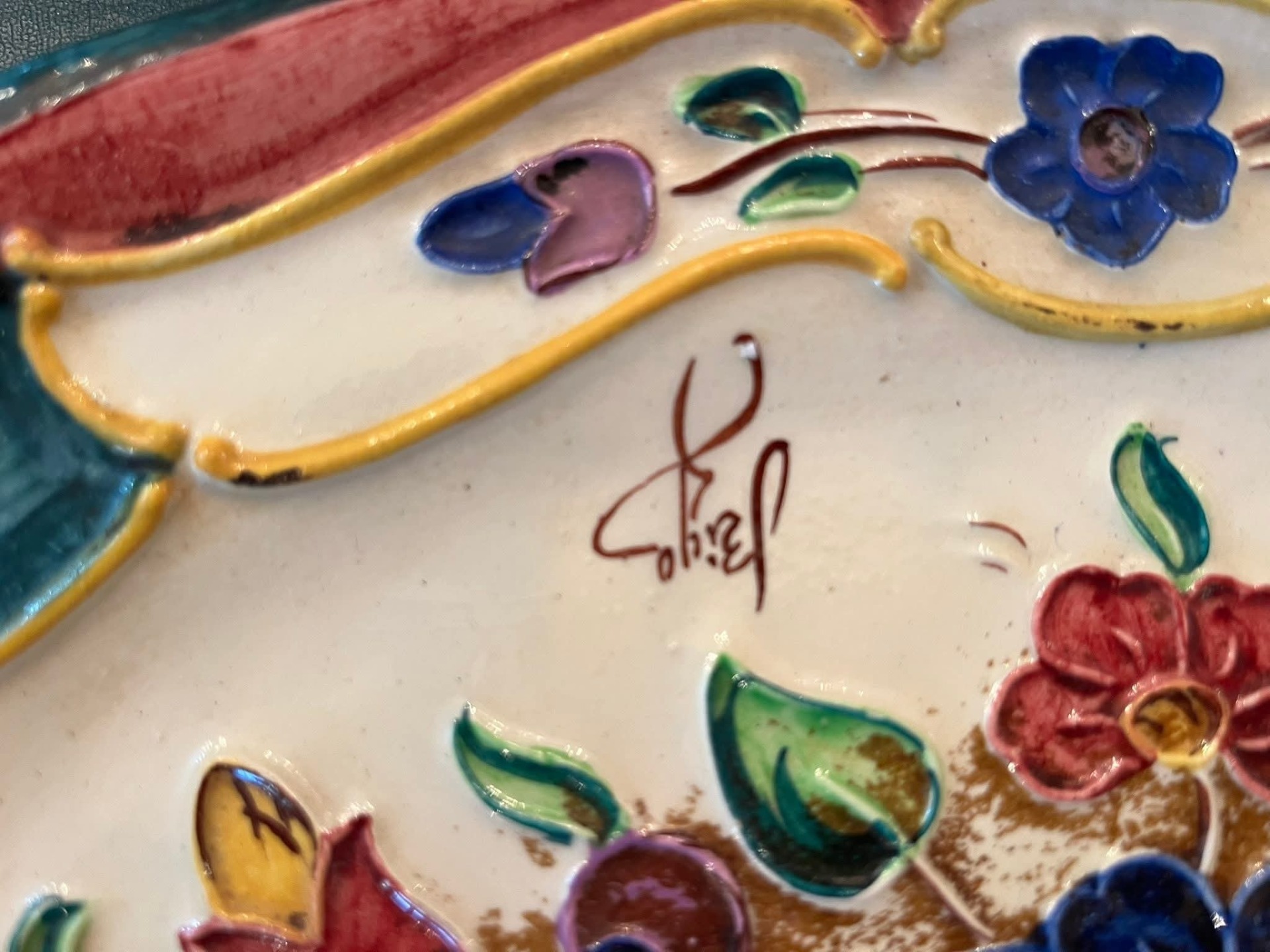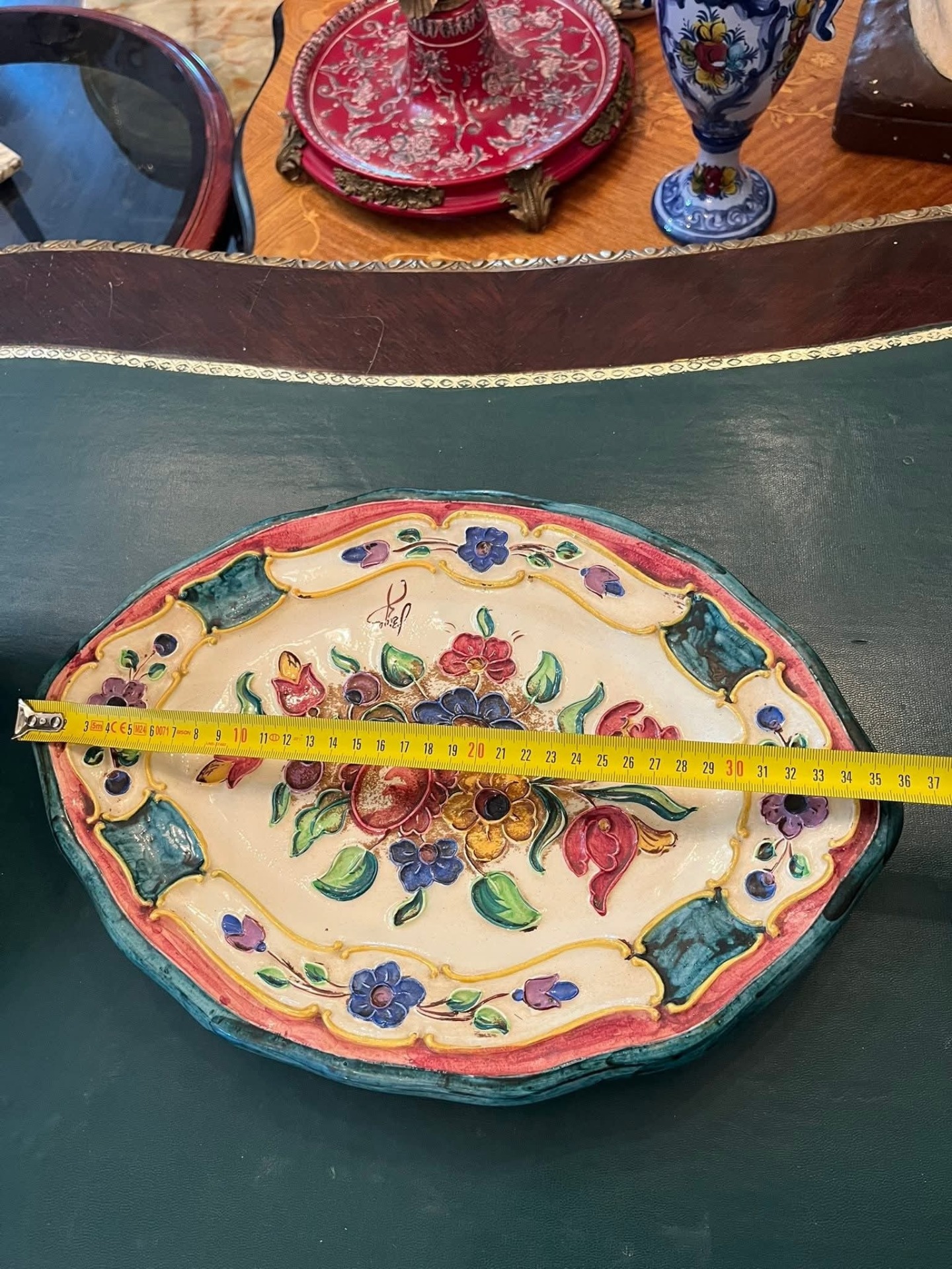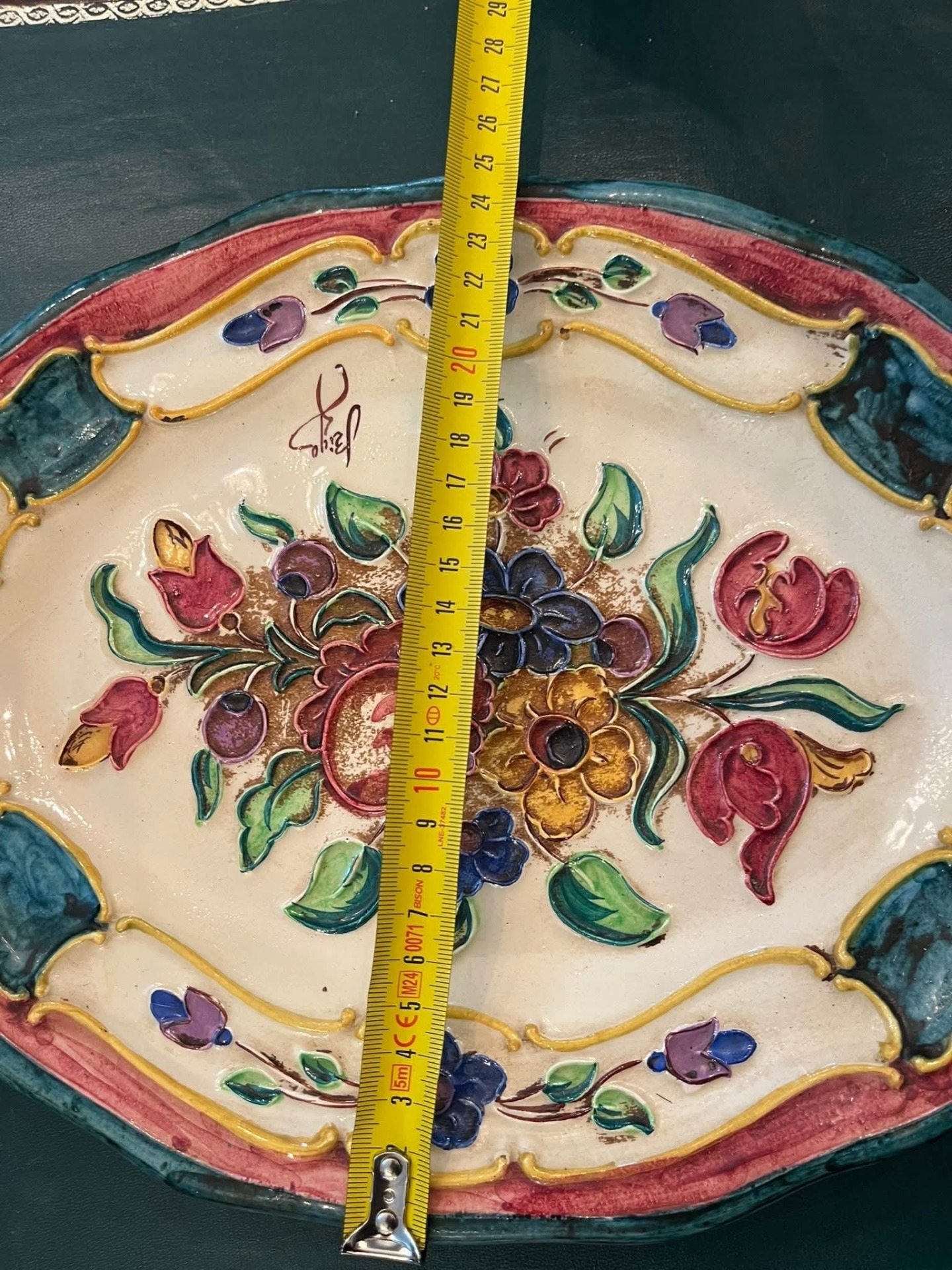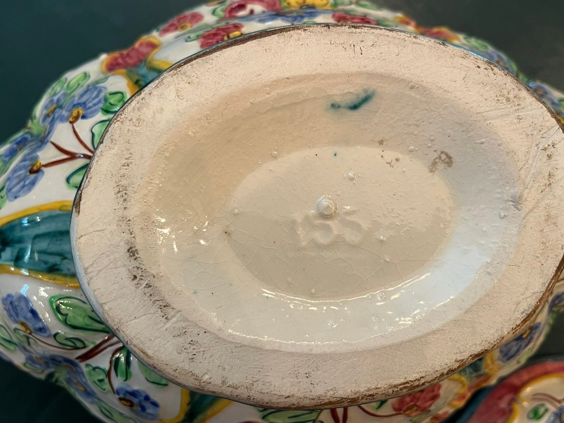 Set decorativ deosebit, realizat din ceramică smălțuită, pictată manual, compus din supieră cu capac și platou suport, piesă autentică de colecție, cu marcaje originale.