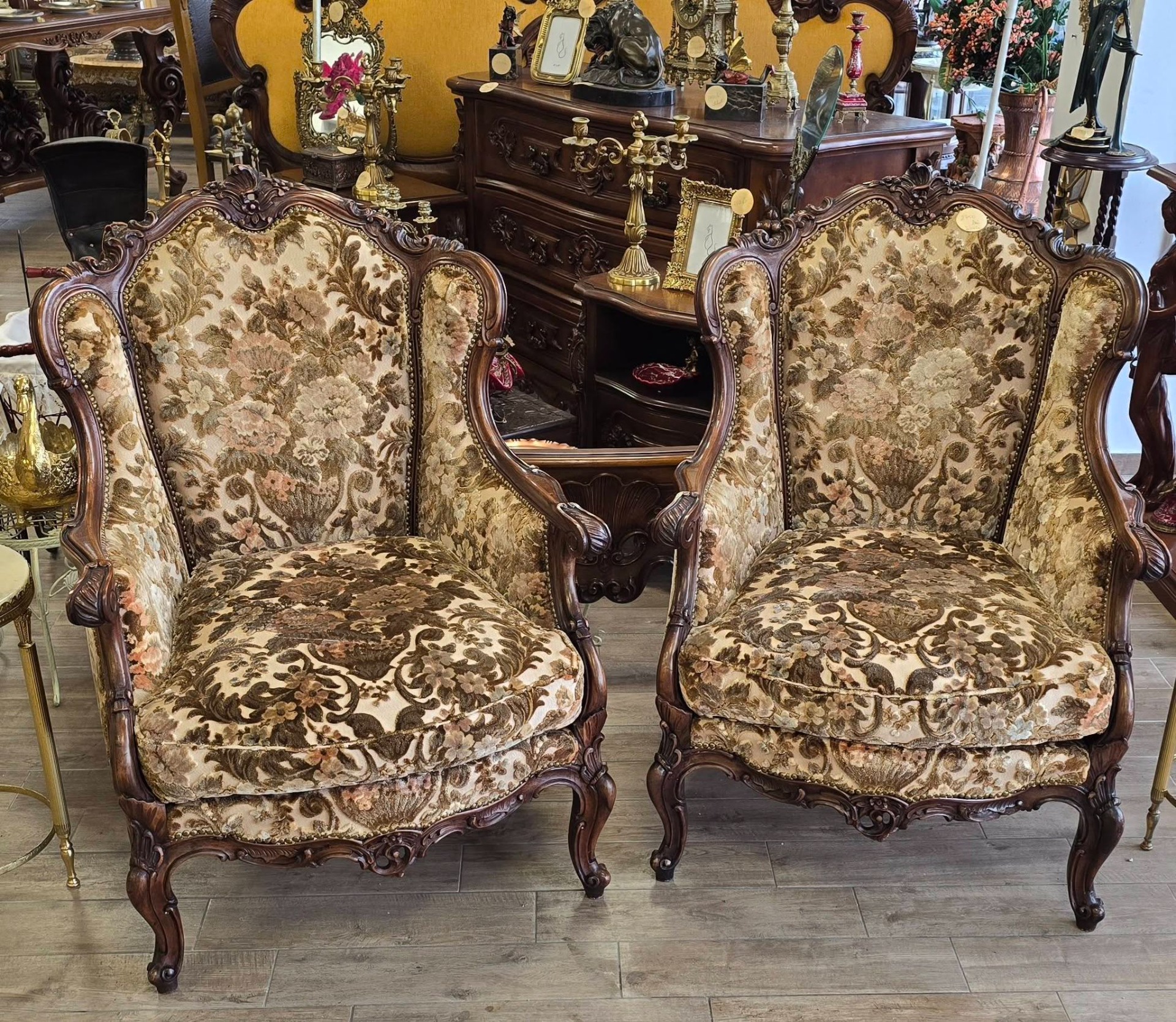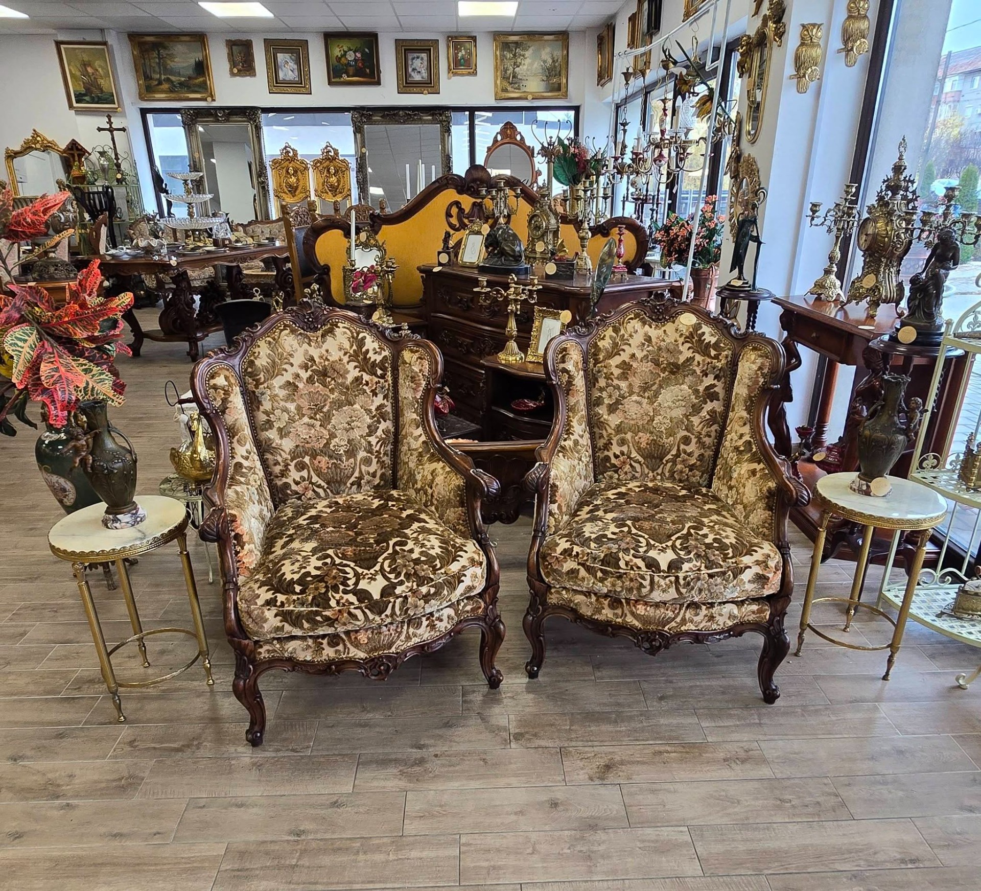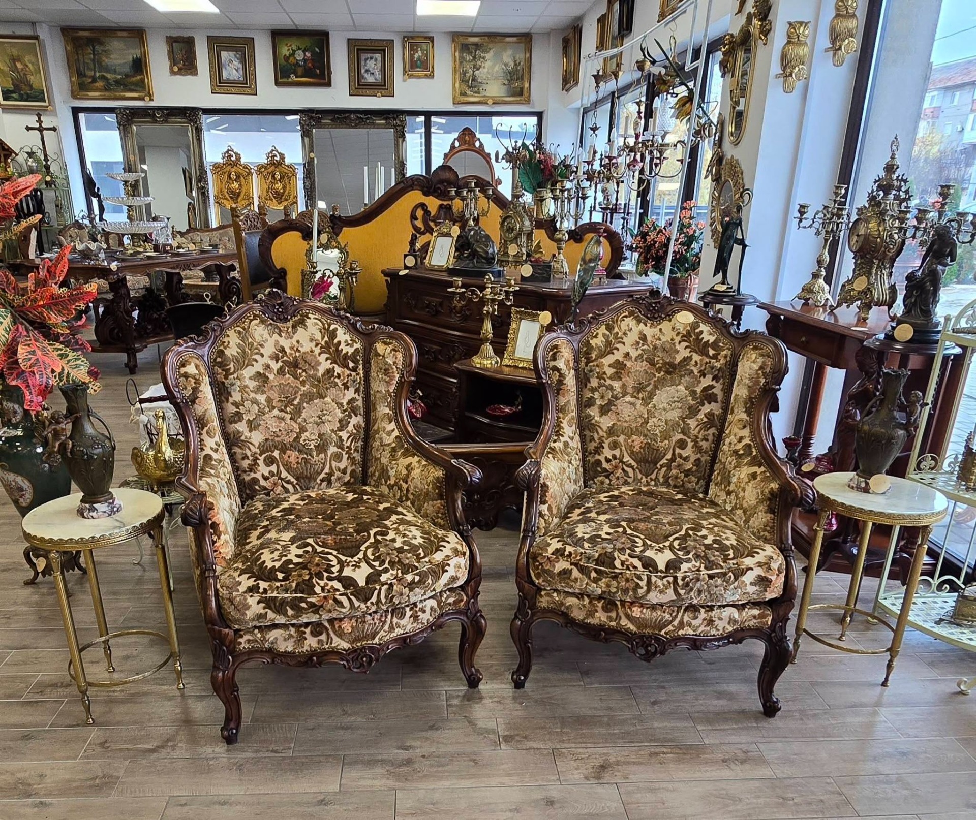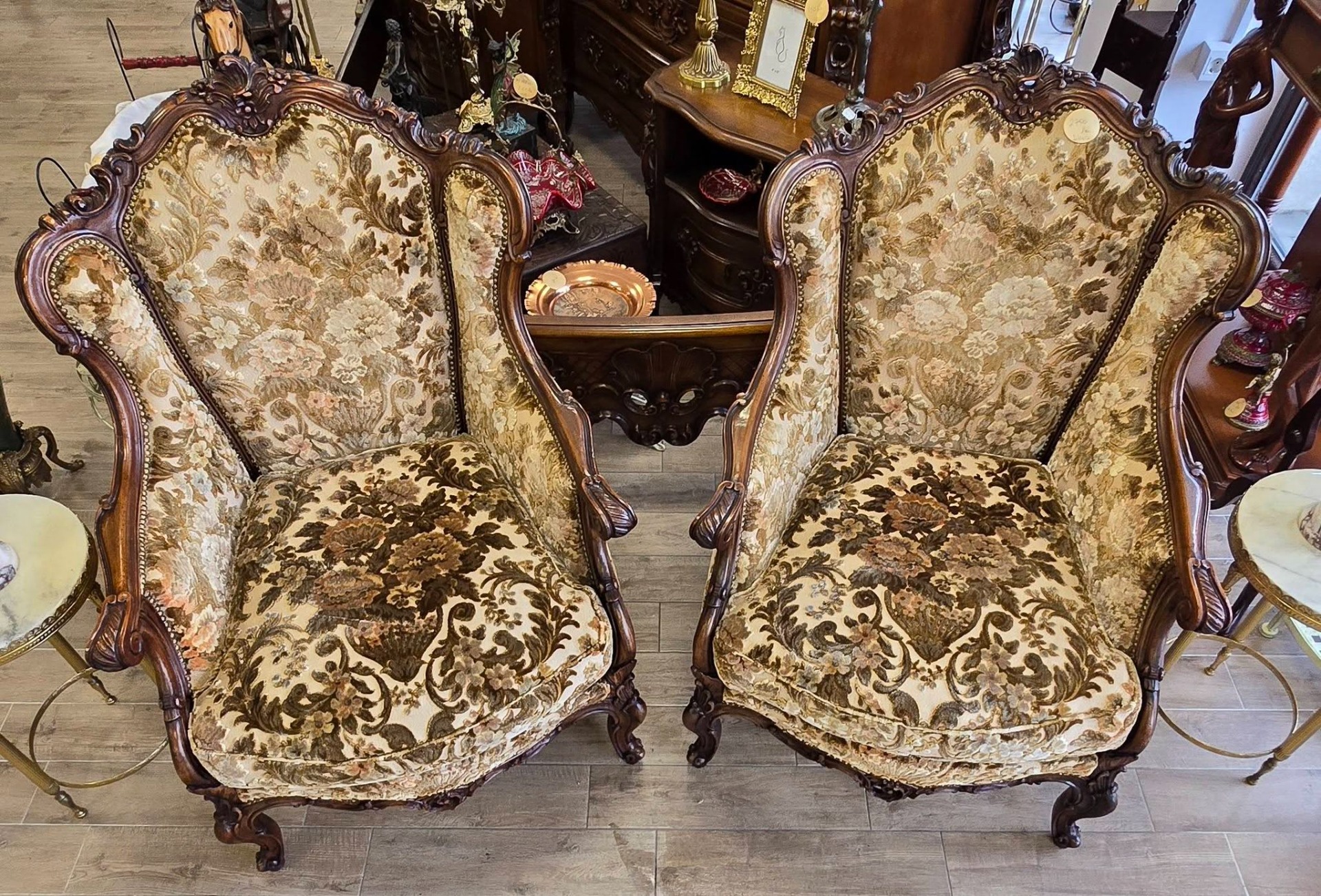 Set compus din 2 fotolii impunătoare realizate în stil clasic Rococo-Ludovic al XV-lea, din lemn sculptat și tapițerie din catifea în motiv floral, cu nuanțe