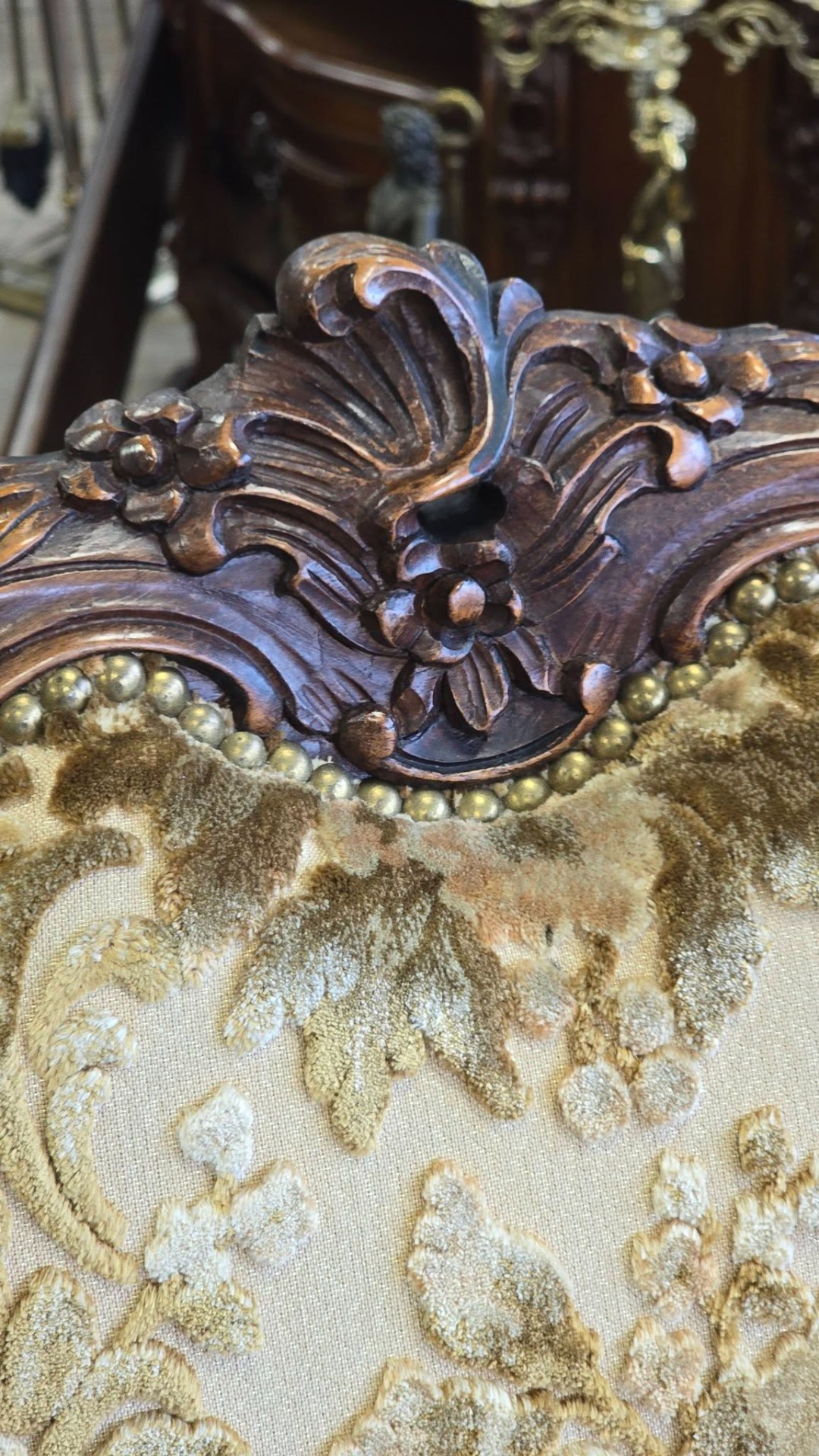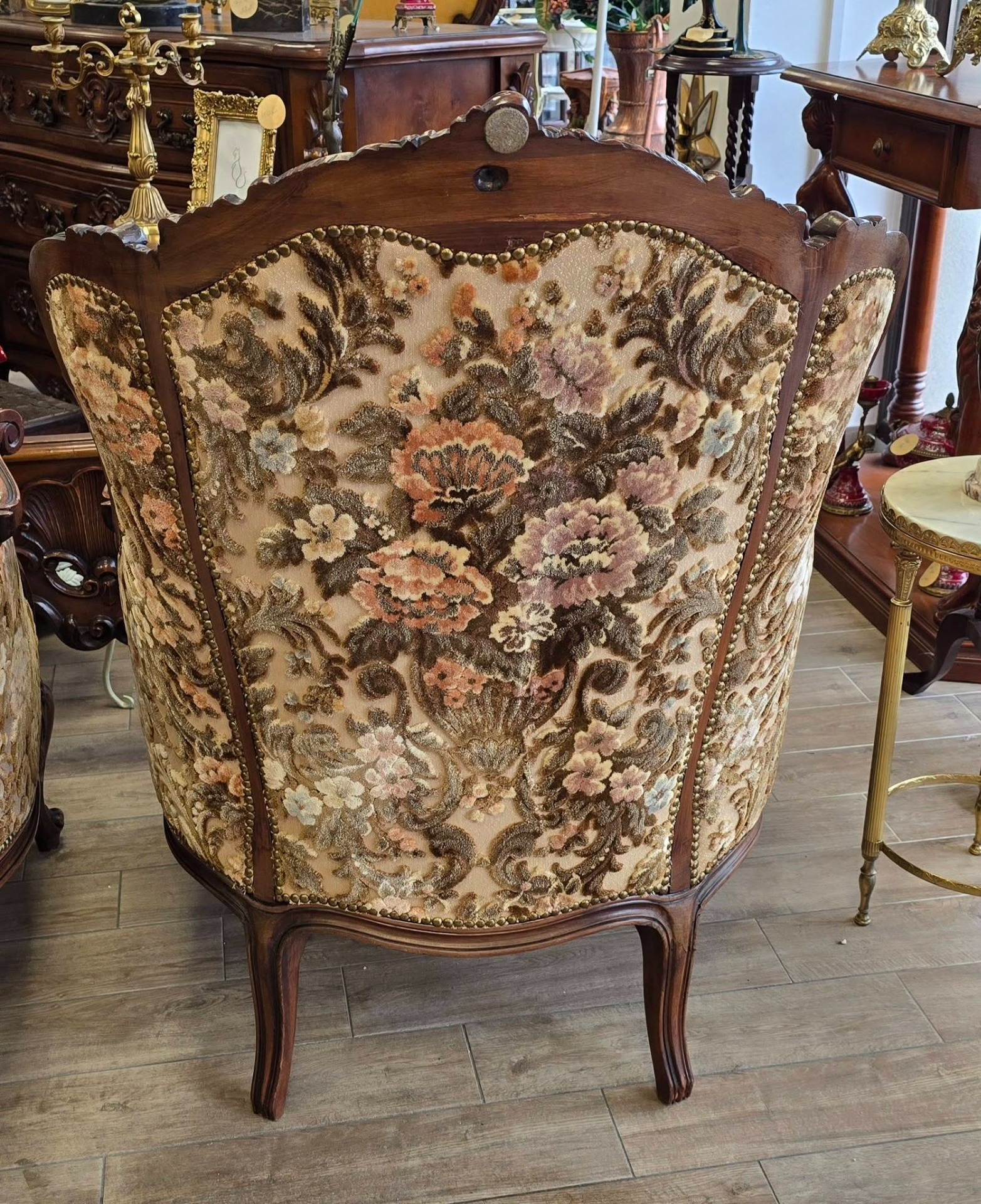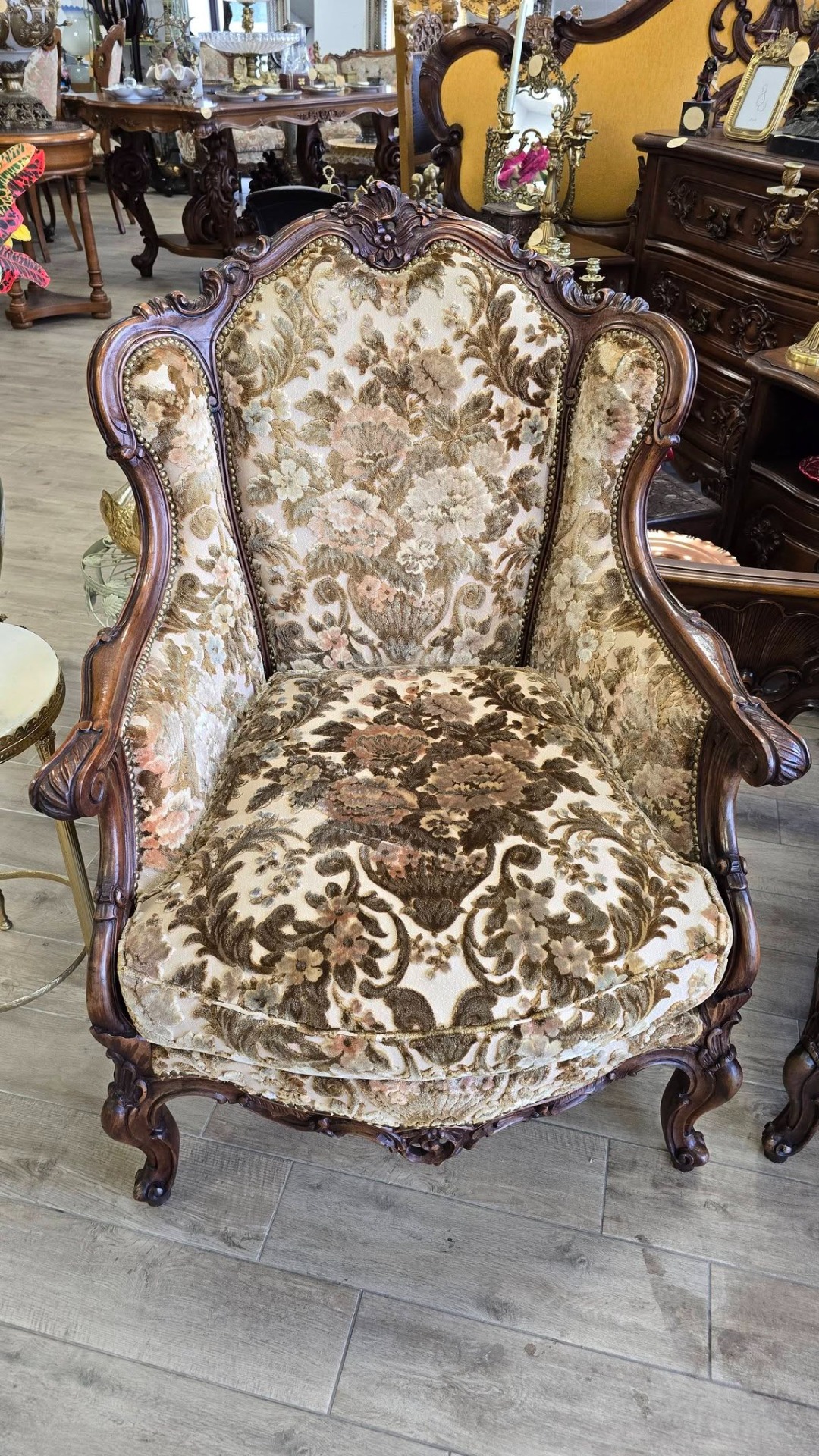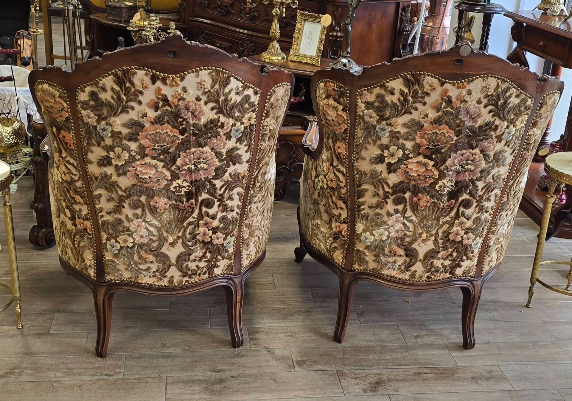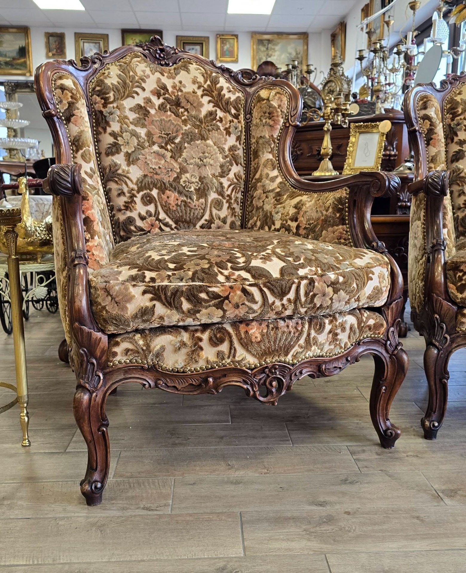 Set compus din 2 fotolii impunătoare realizate în stil clasic Rococo-Ludovic al XV-lea, din lemn sculptat și tapițerie din catifea în motiv floral, cu nuanțe