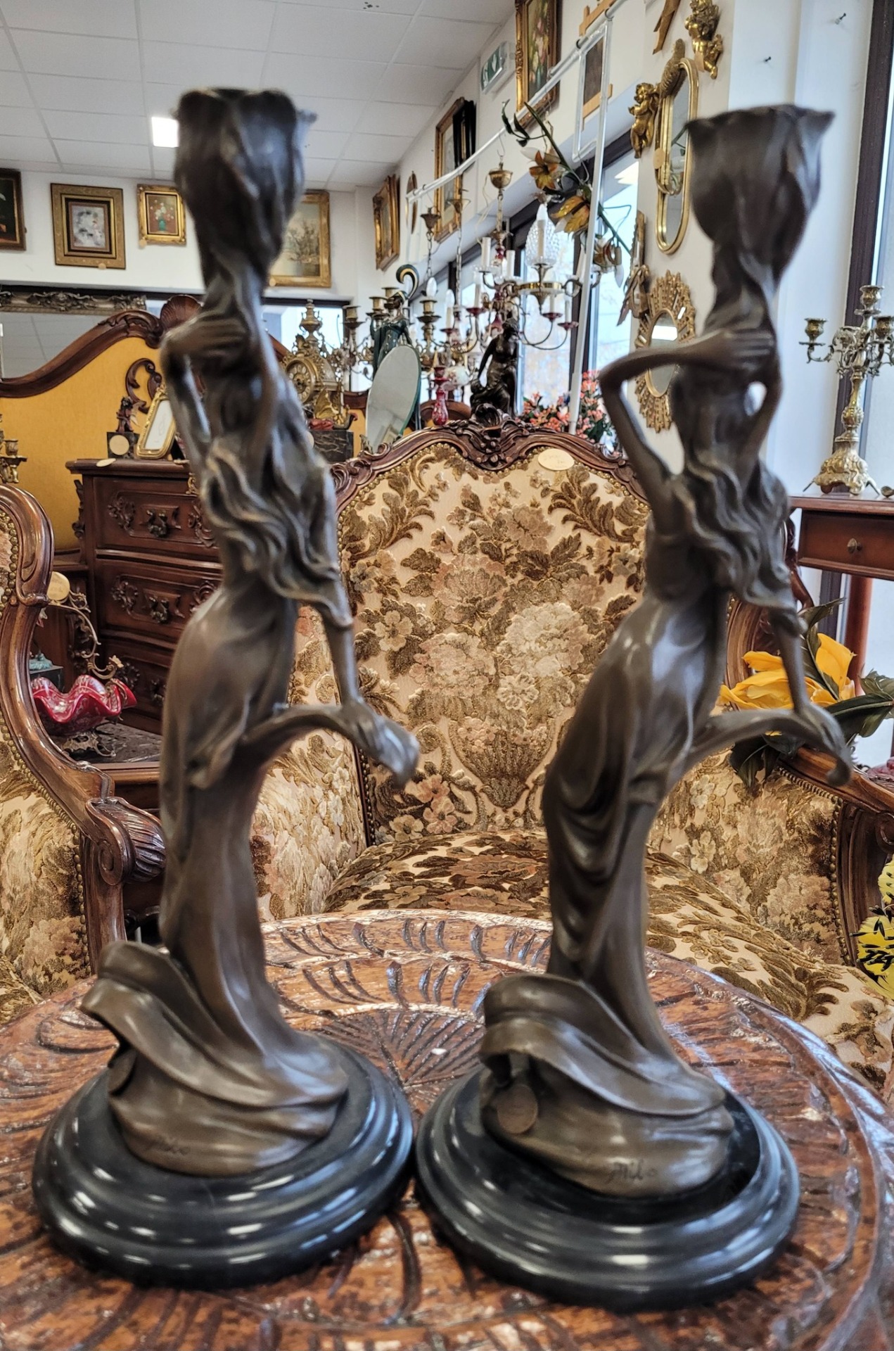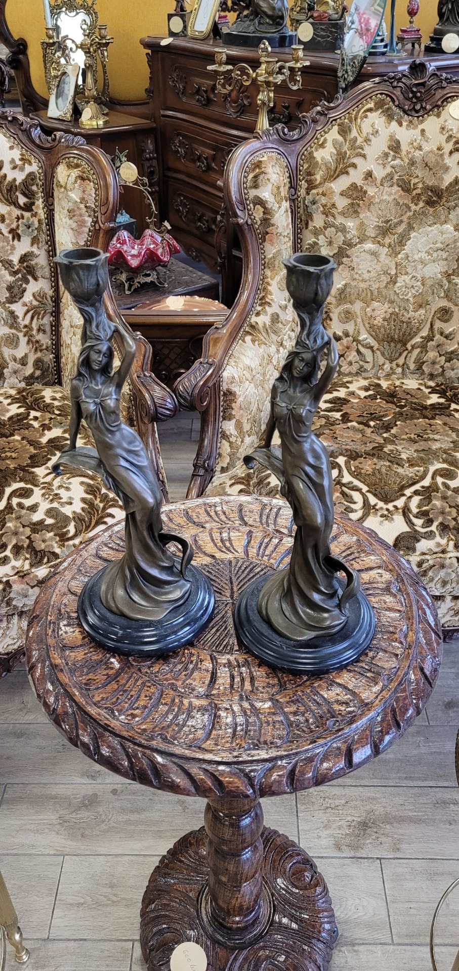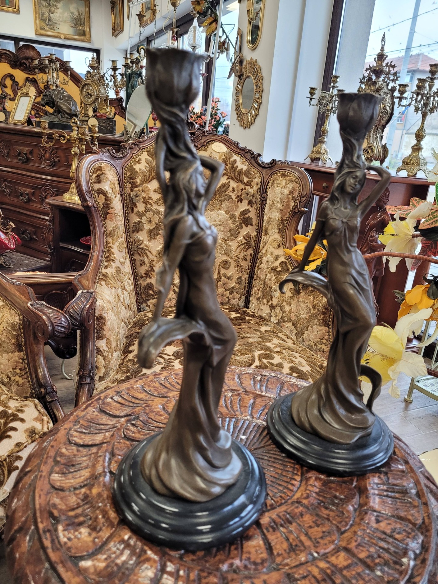 Set compus din două sfeșnice din bronz, în stil Art Nouveau, piese care combină funcționalitatea cu arta, fiind ideale pentru a crea o atmosferă rafinată și