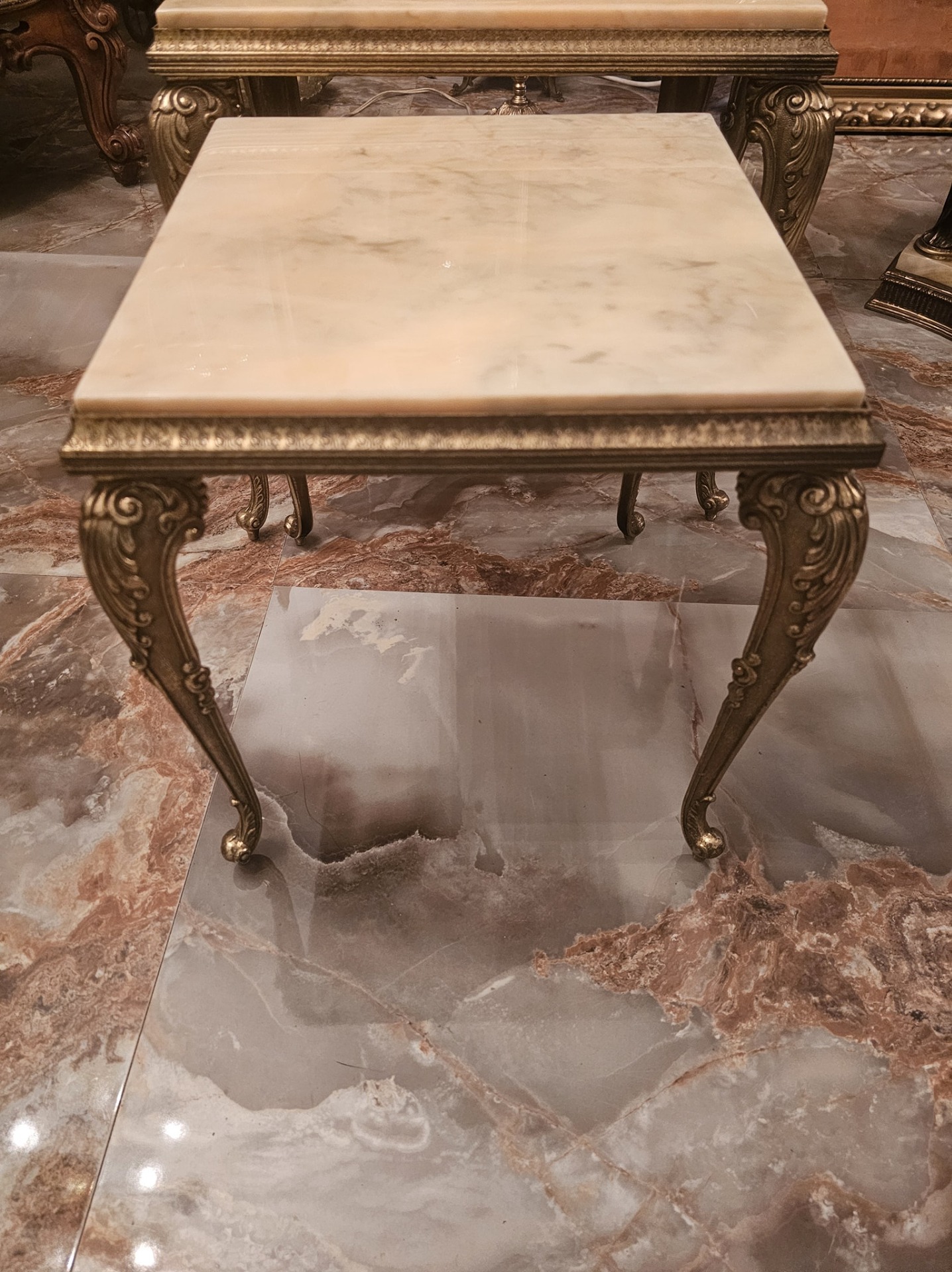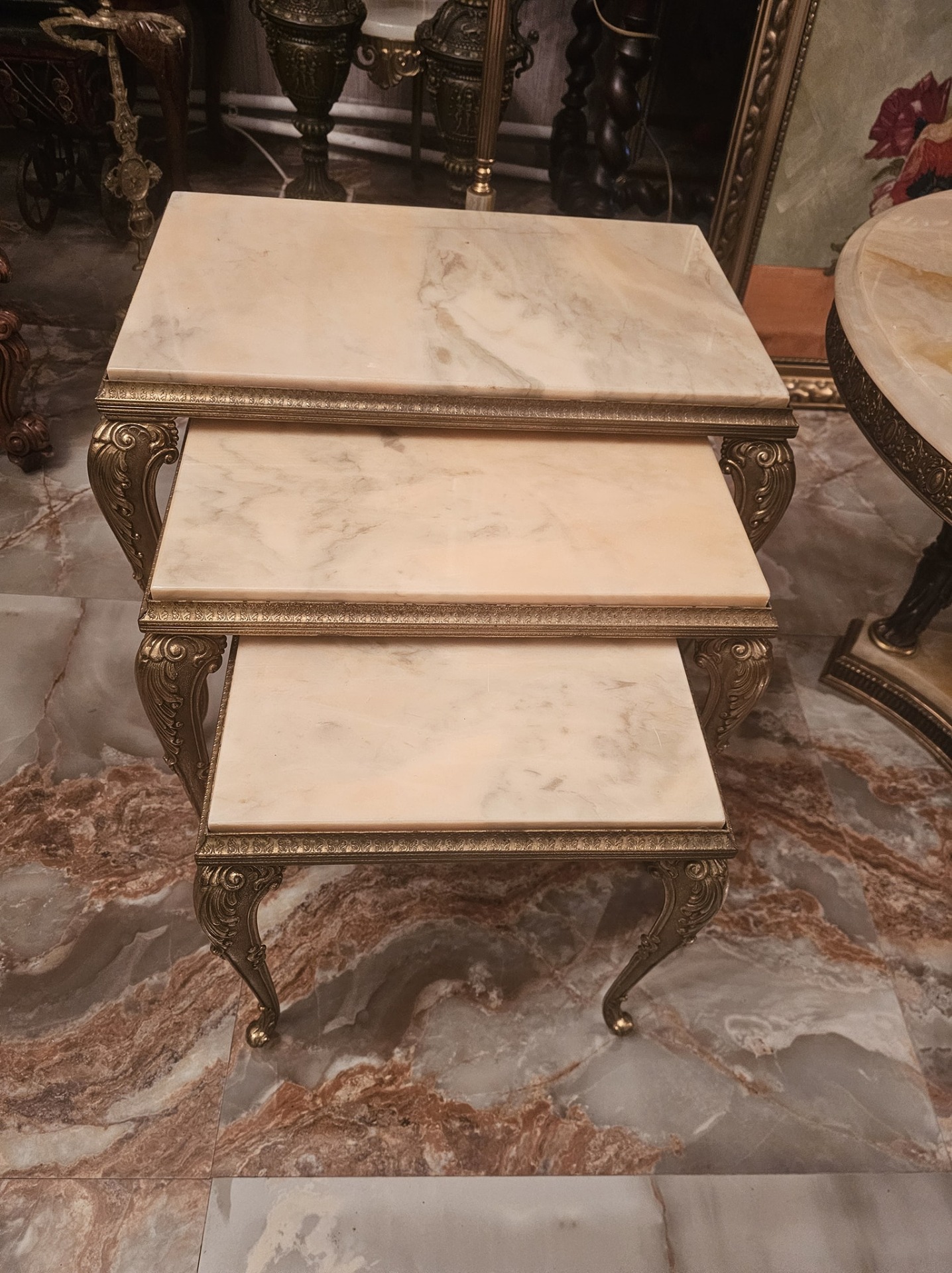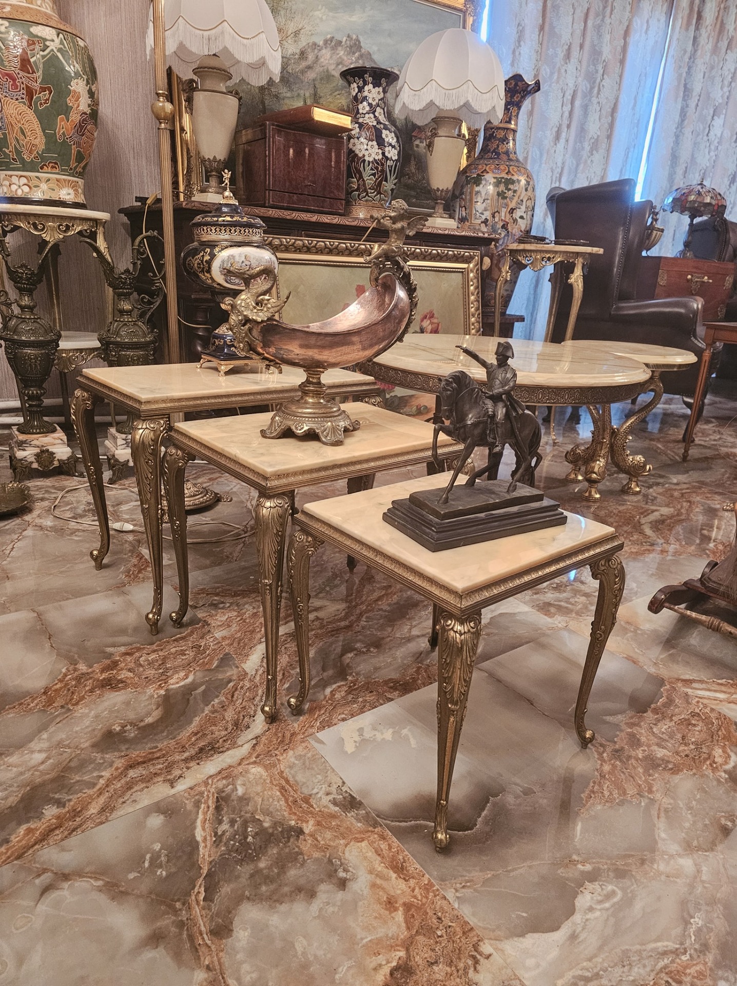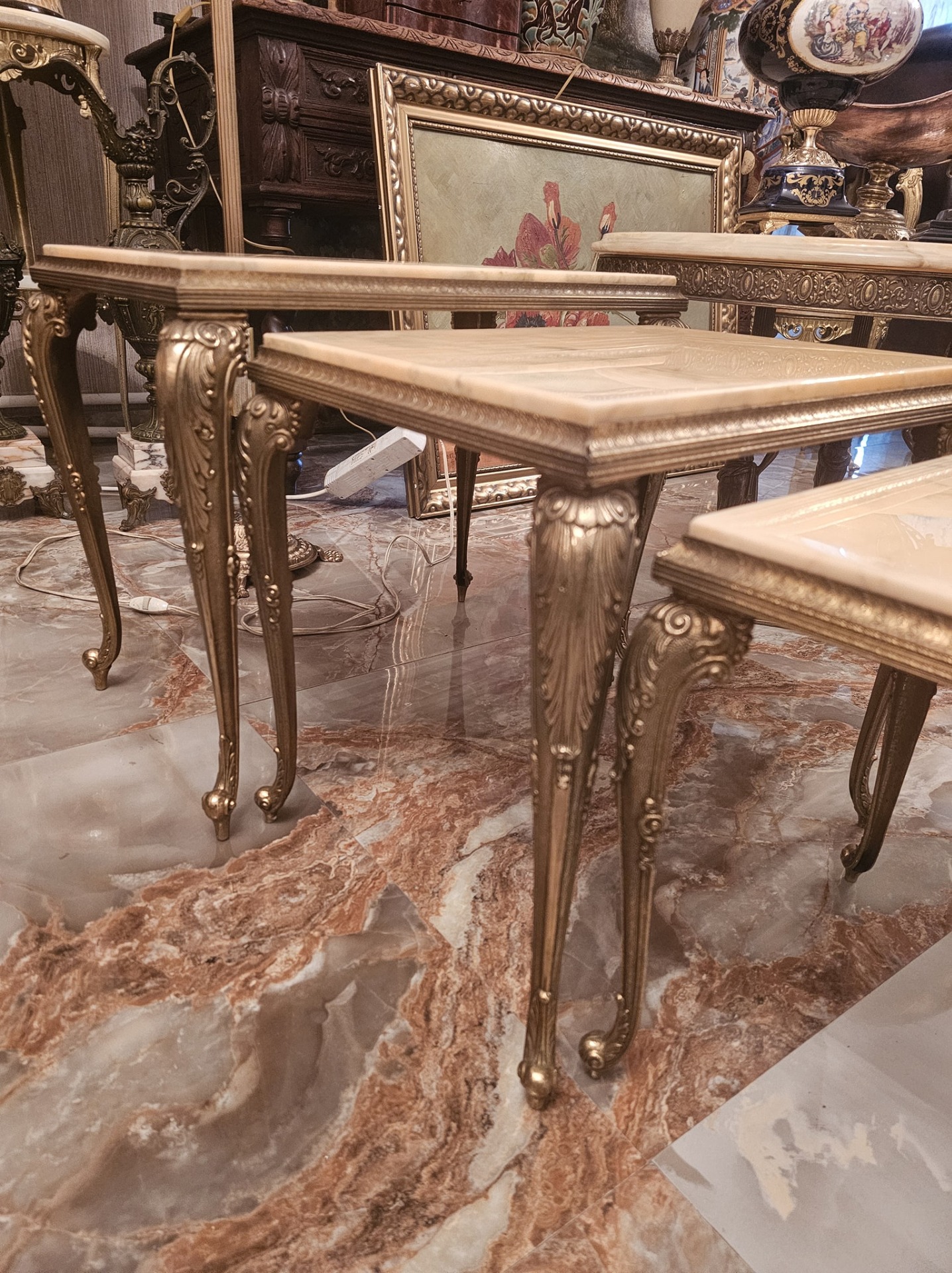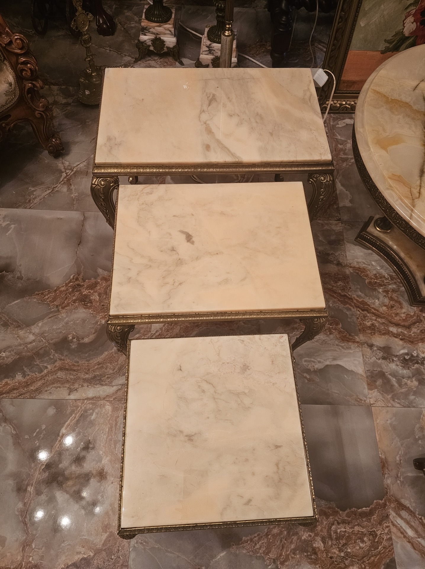 Set de 3 măsuțe cu picior din bronz și blat de onix,fără defecte.