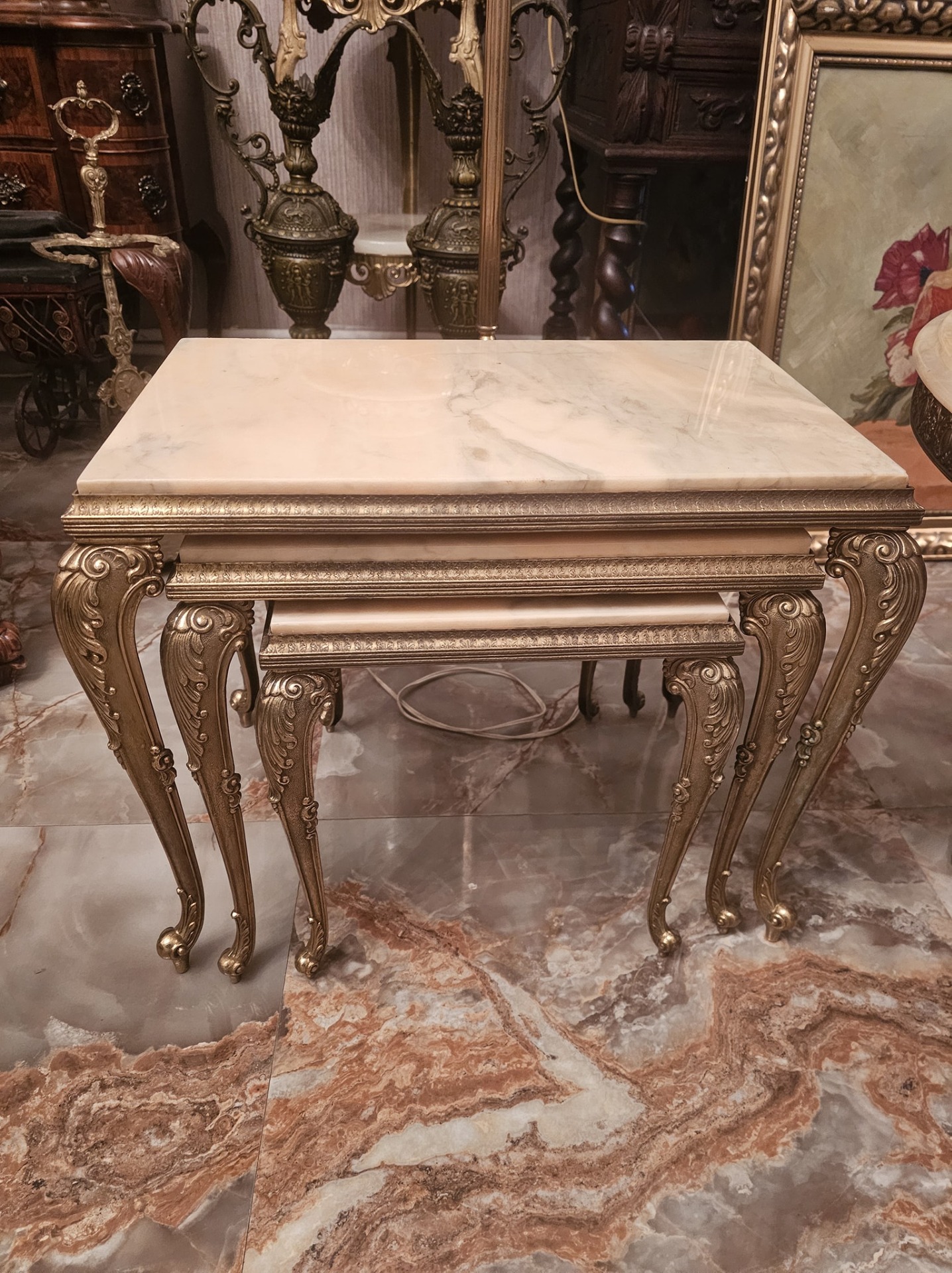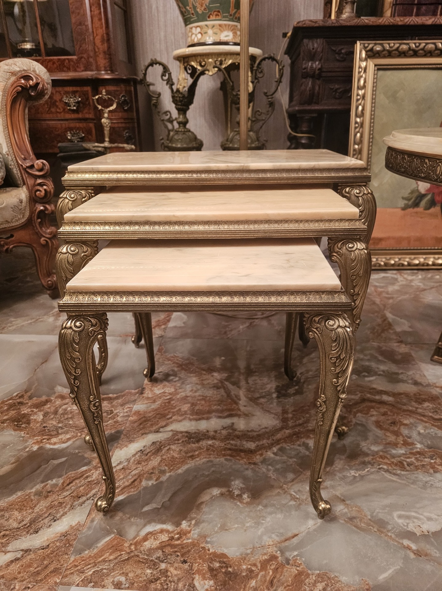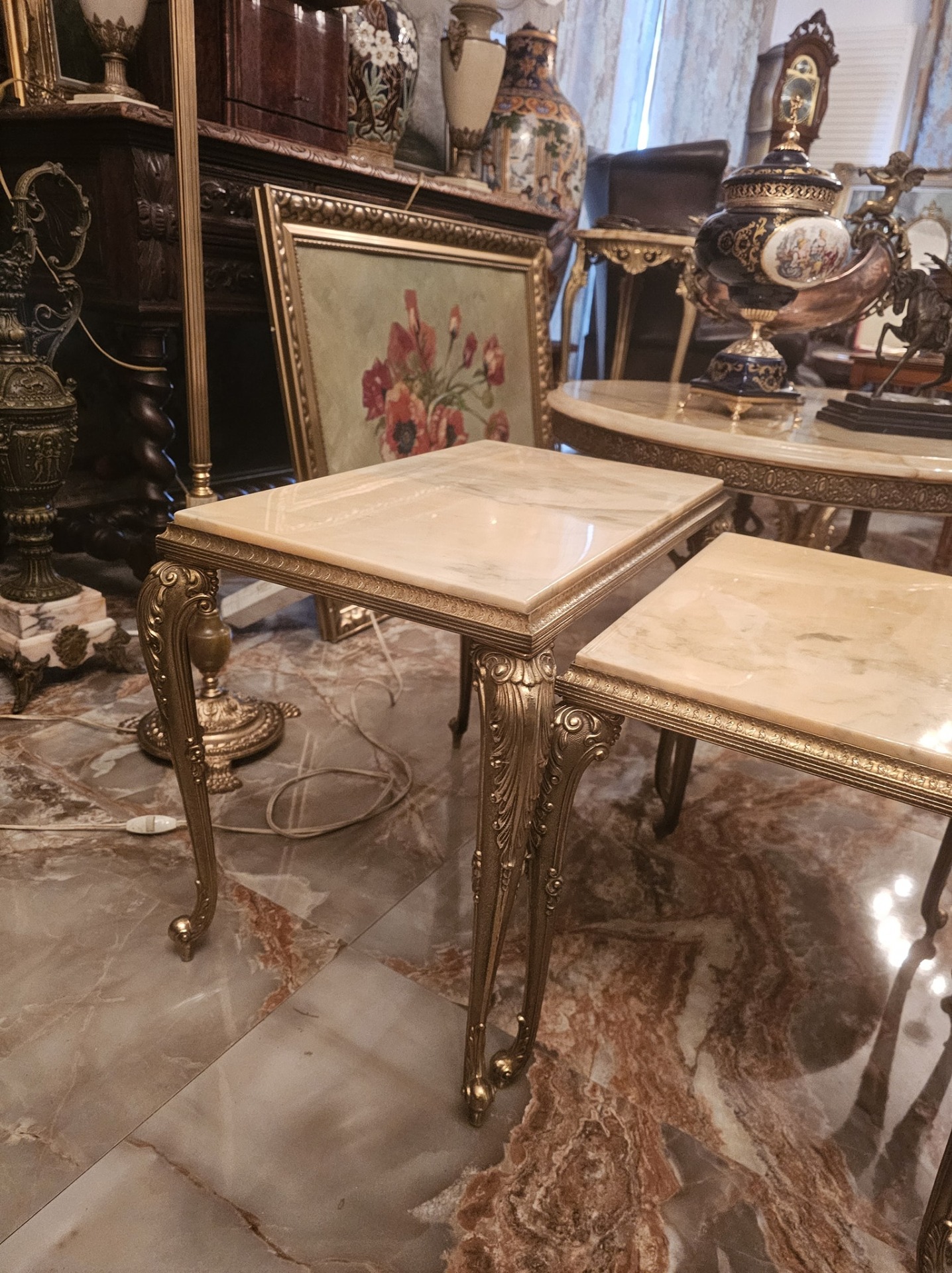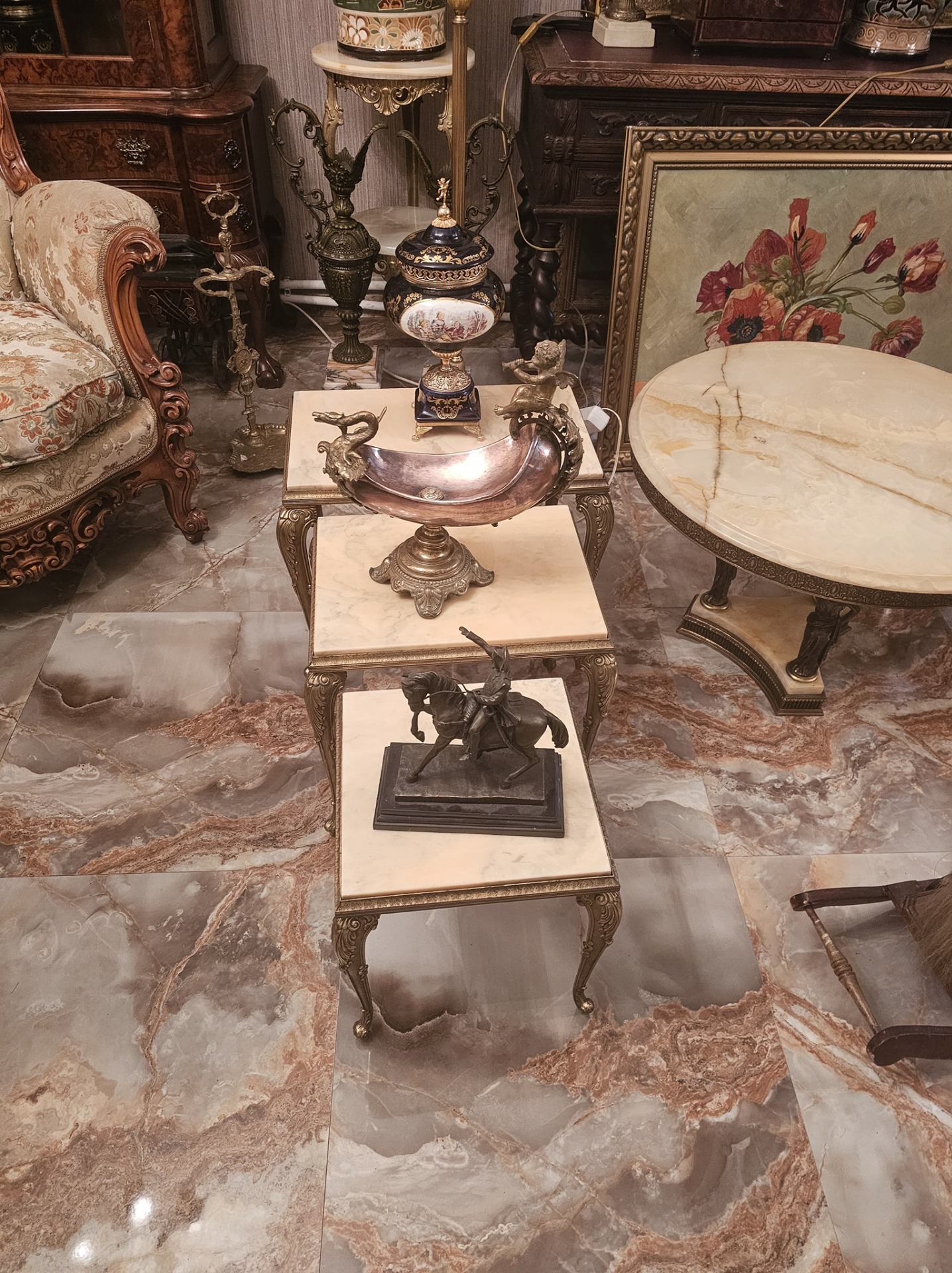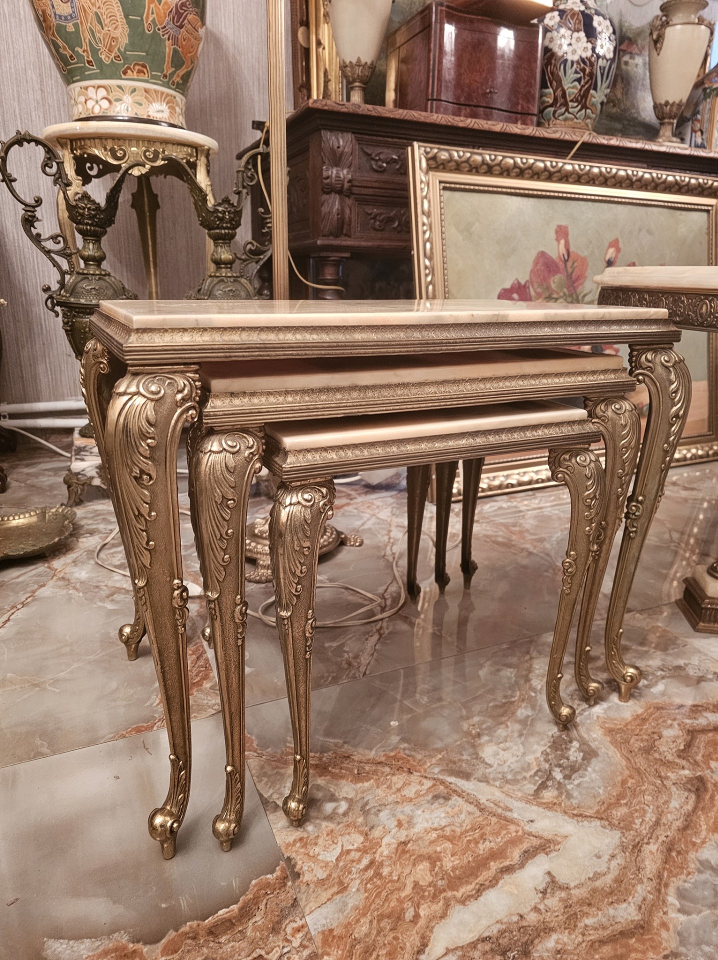 Set de 3 măsuțe cu picior din bronz și blat de onix,fără defecte.