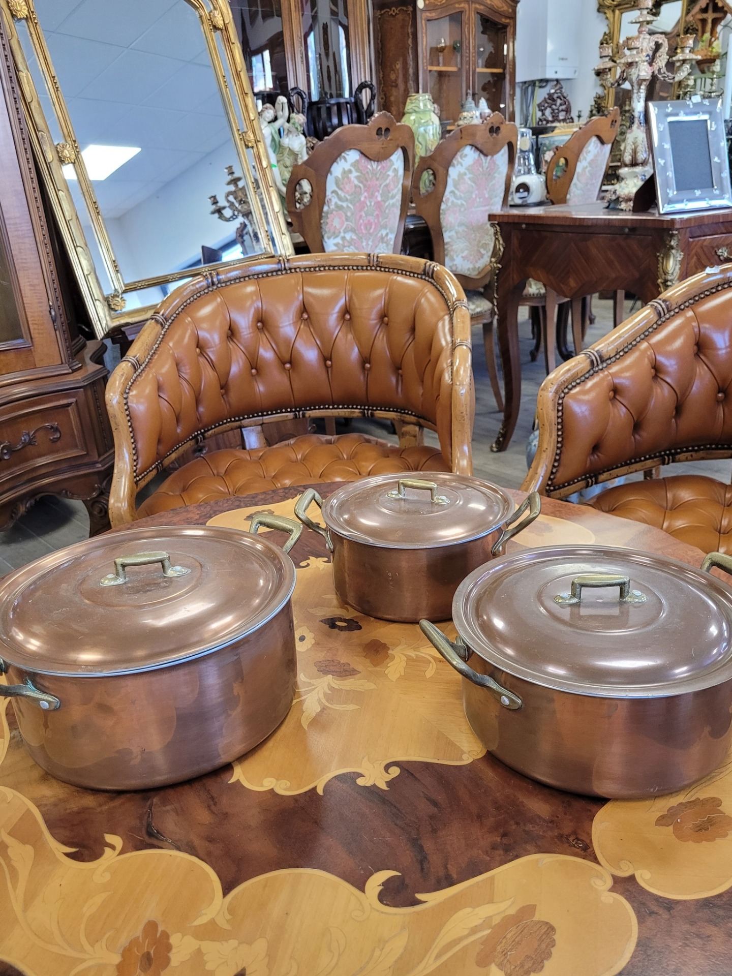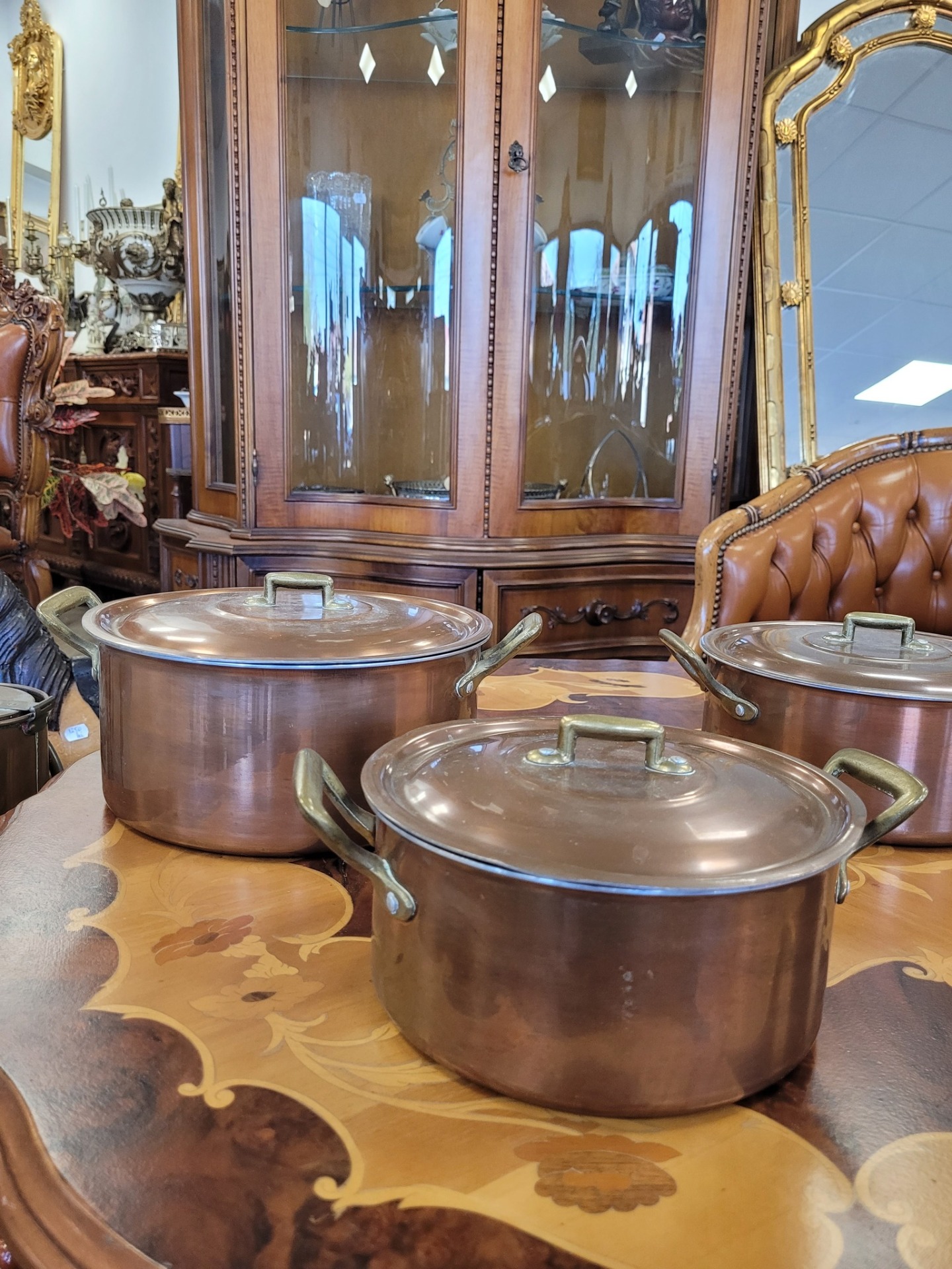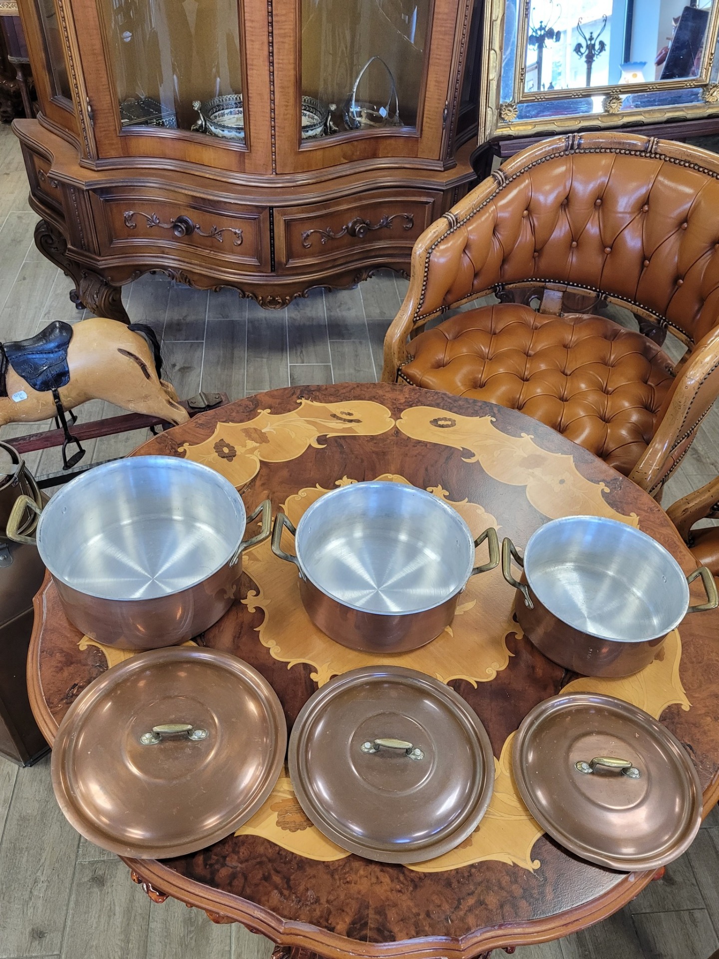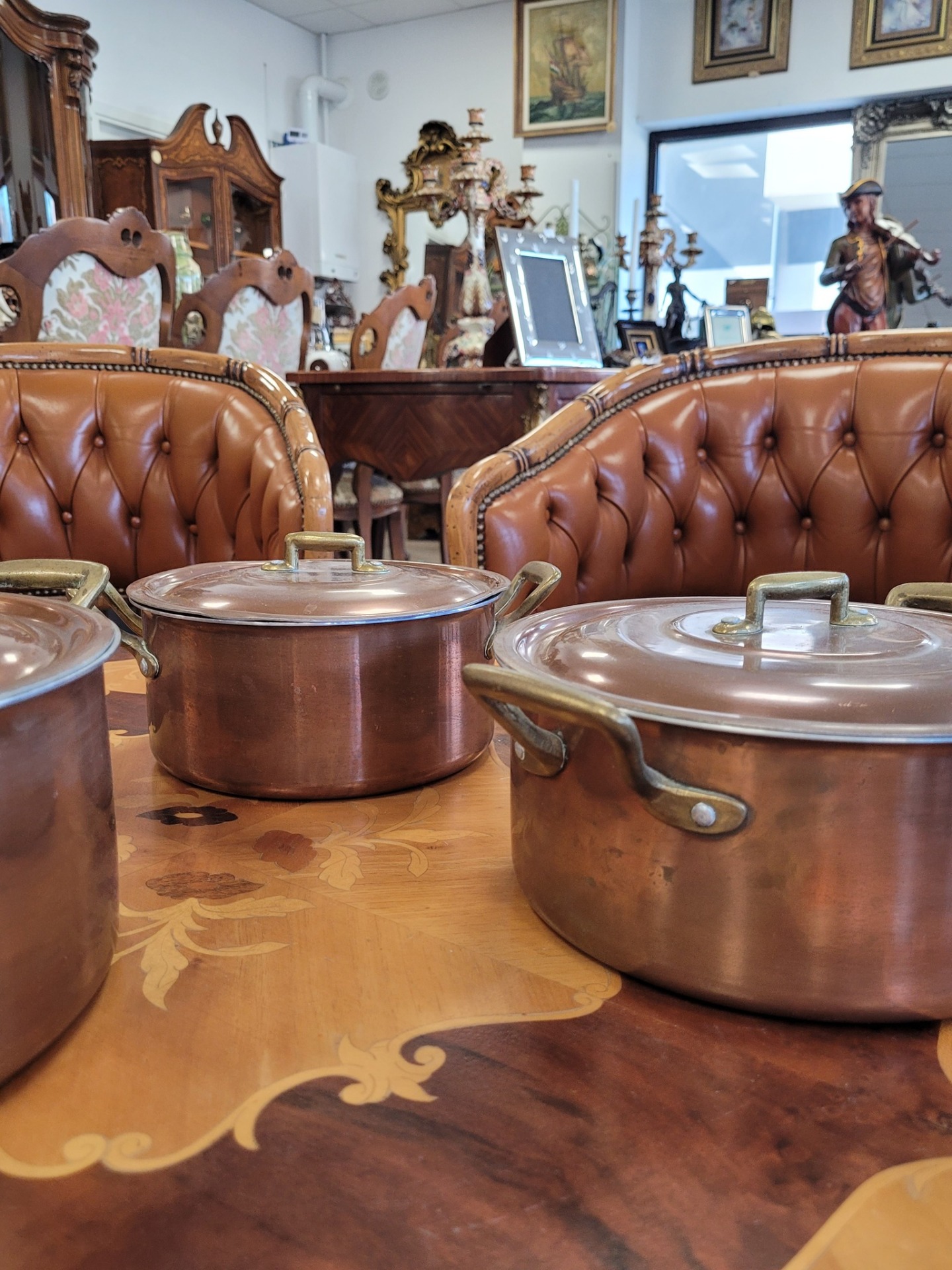 Set de 3 oale vintage din cupru, cu interior din aluminiu și mânere din bronz, în stil retro/rustic.
