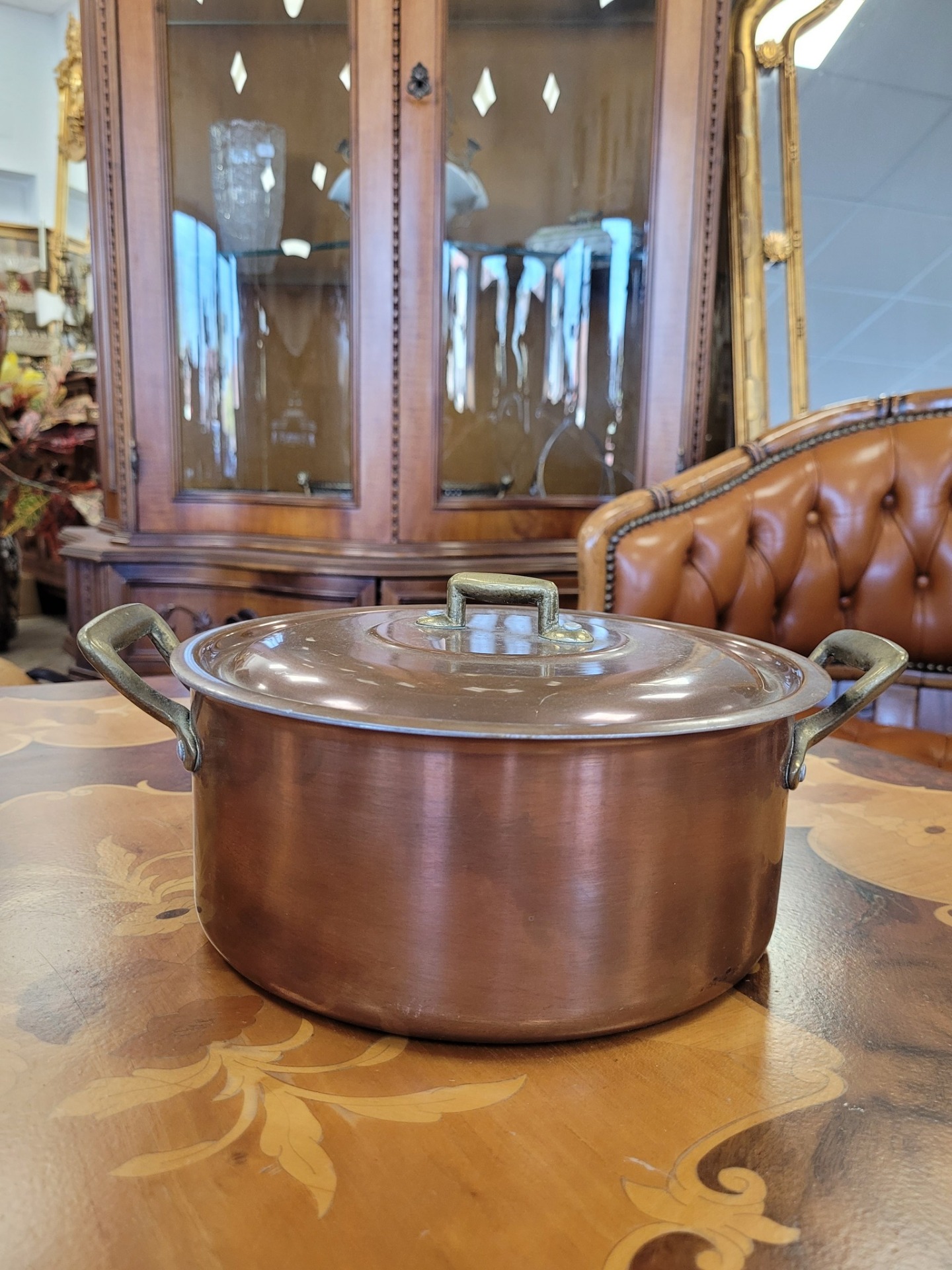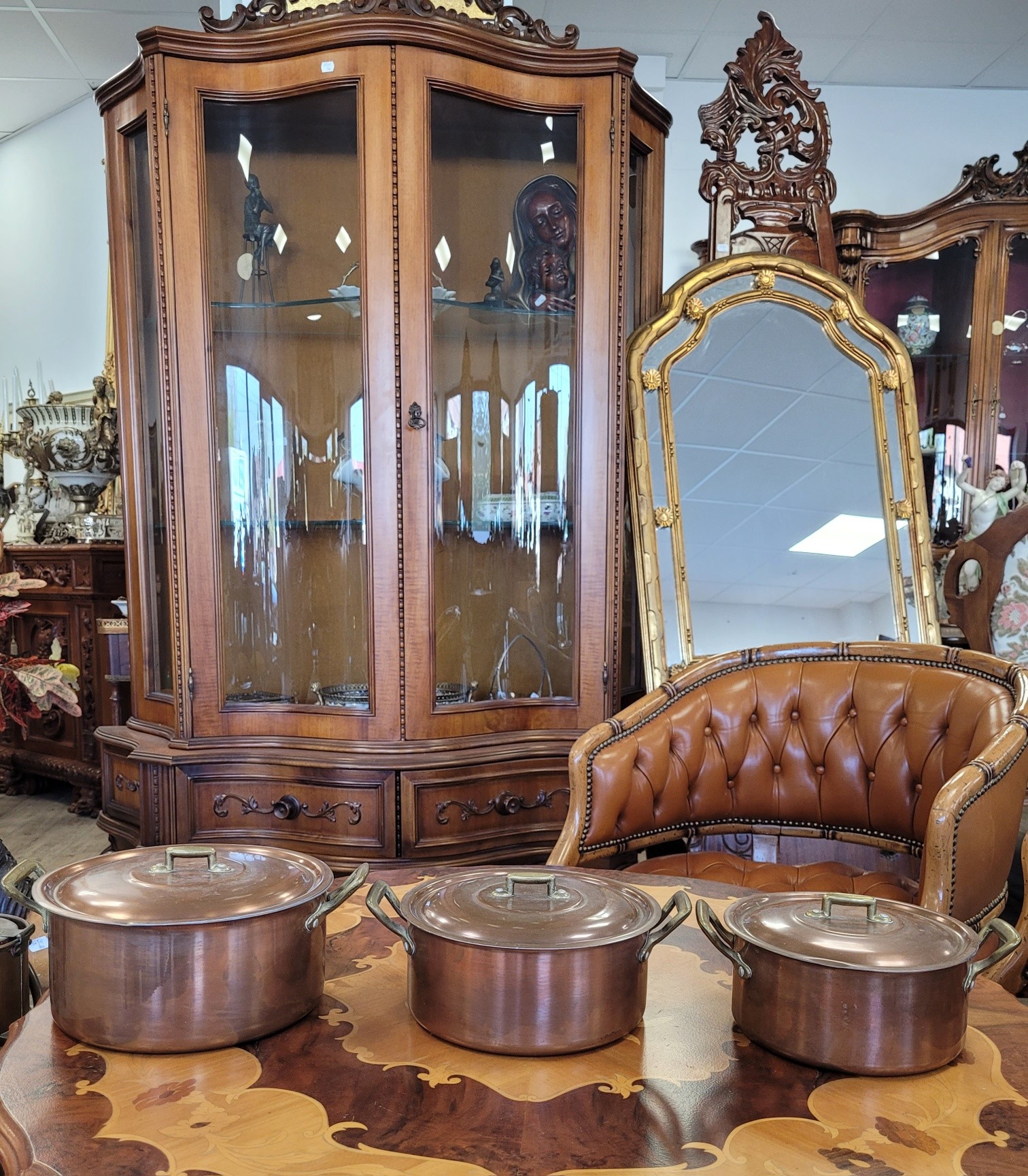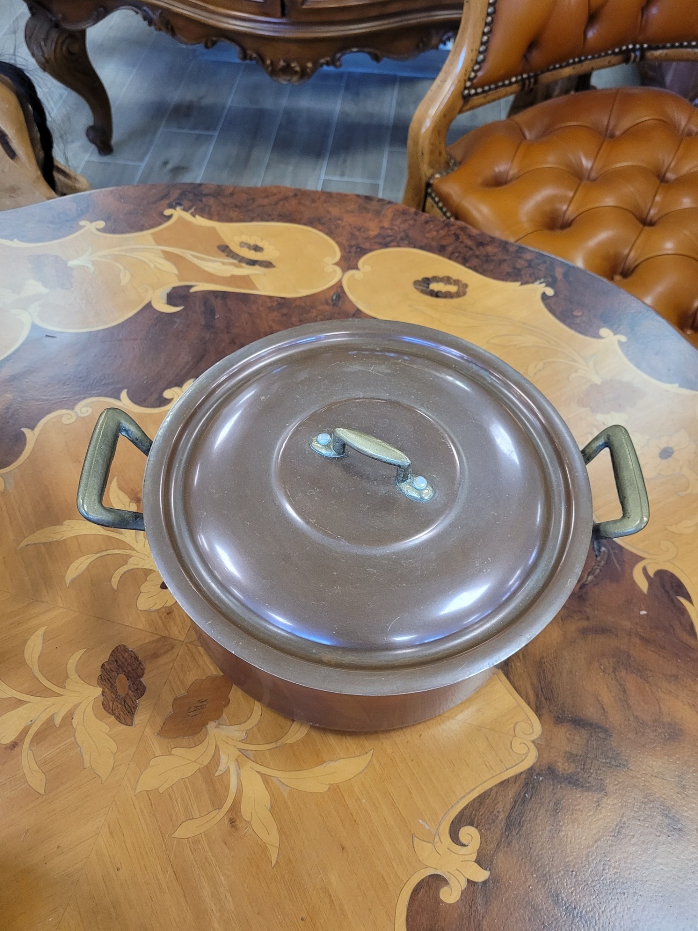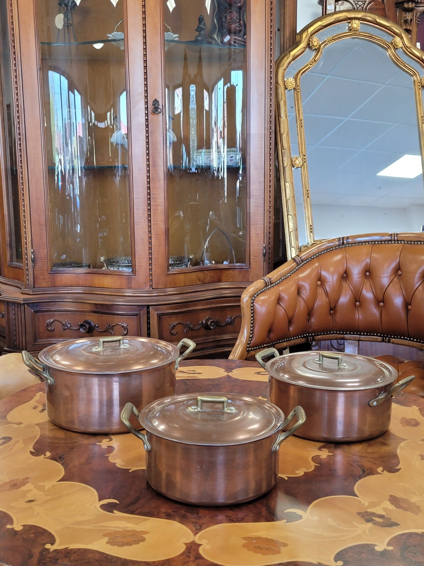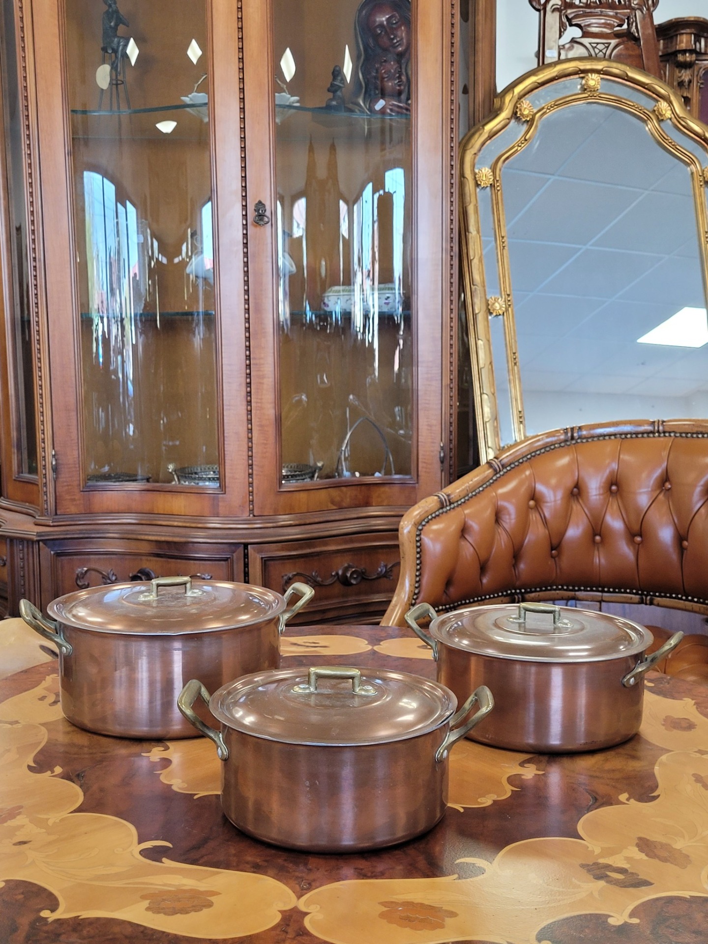 Set de 3 oale vintage din cupru, cu interior din aluminiu și mânere din bronz, în stil retro/rustic.