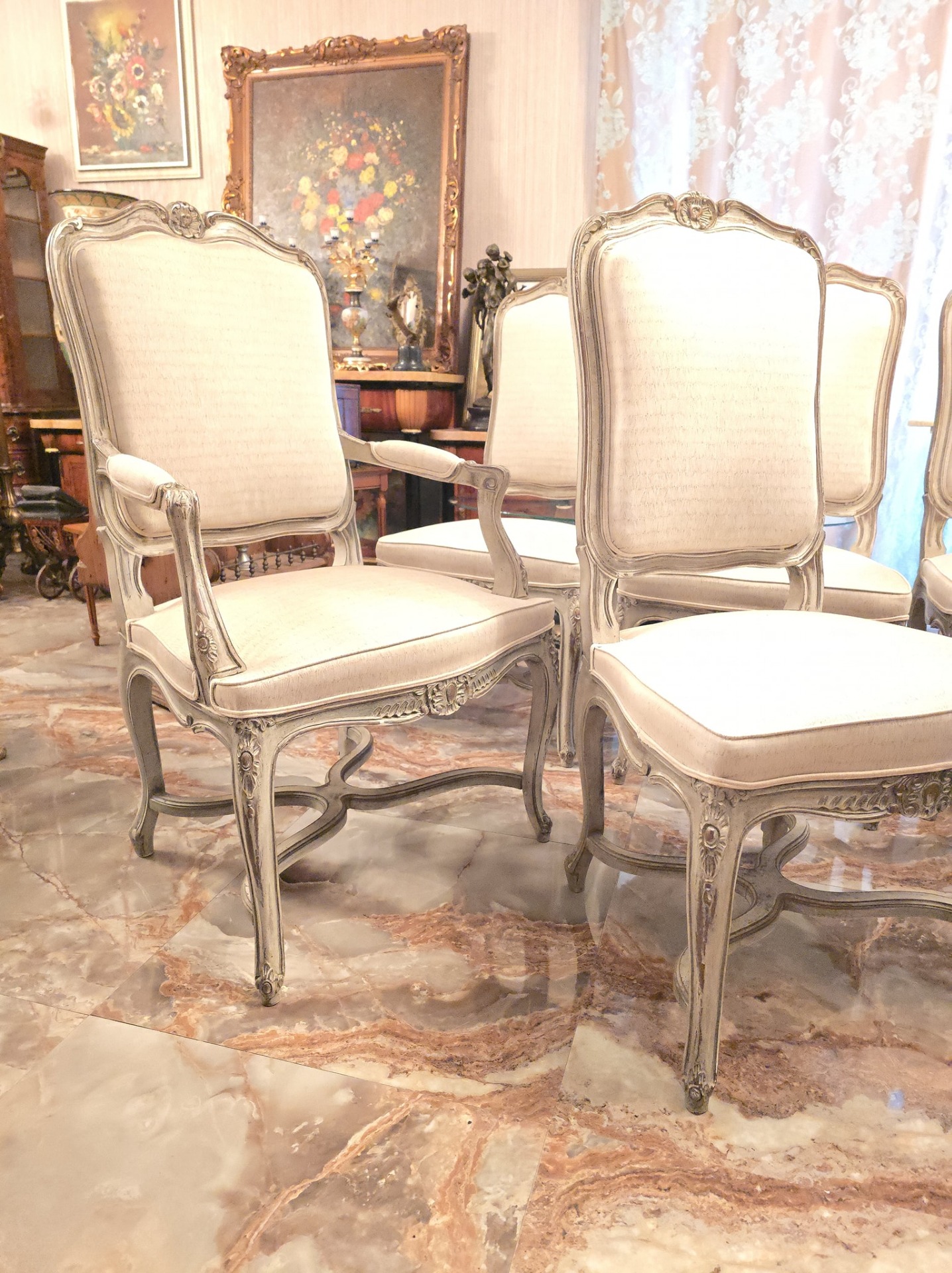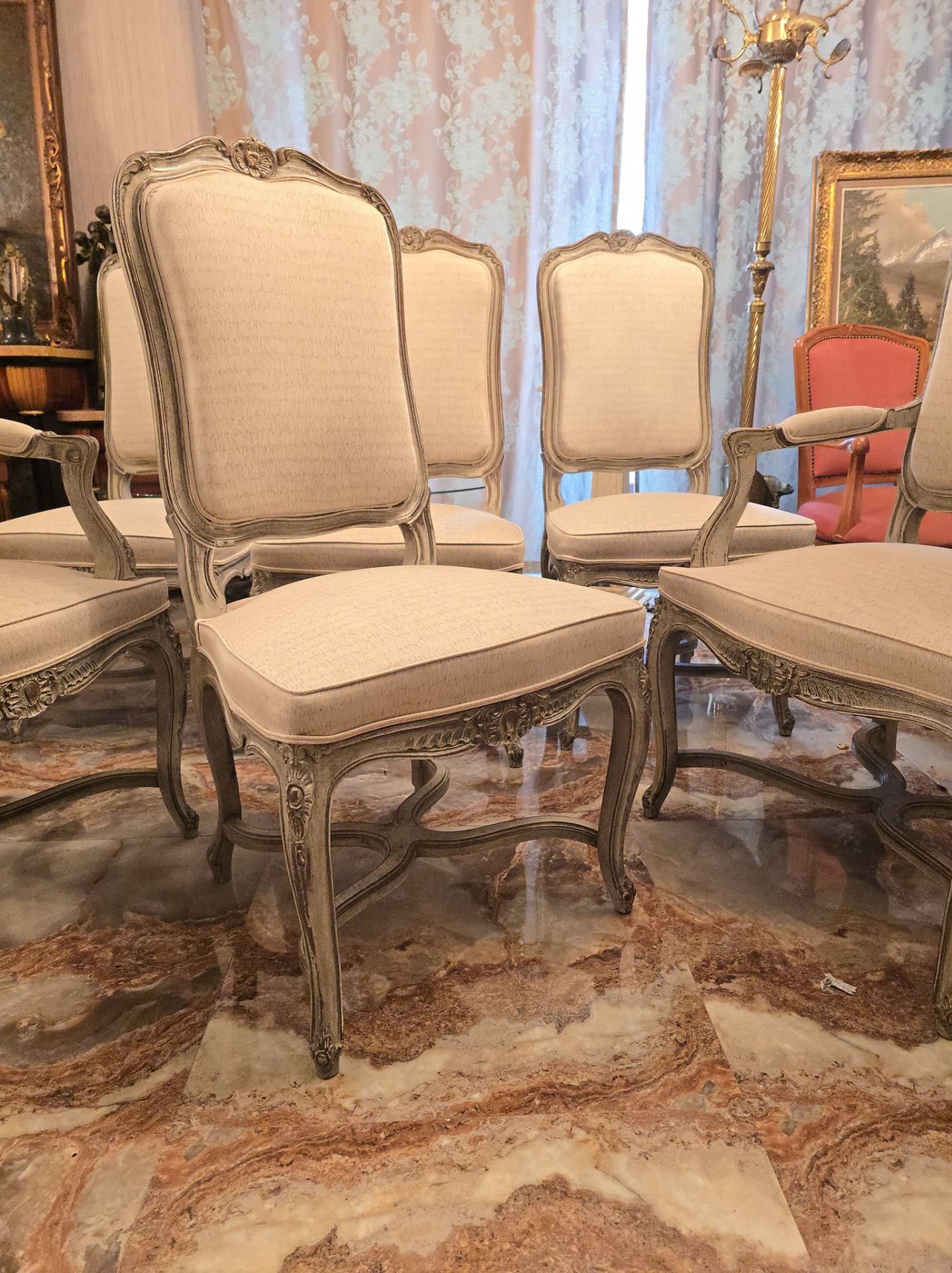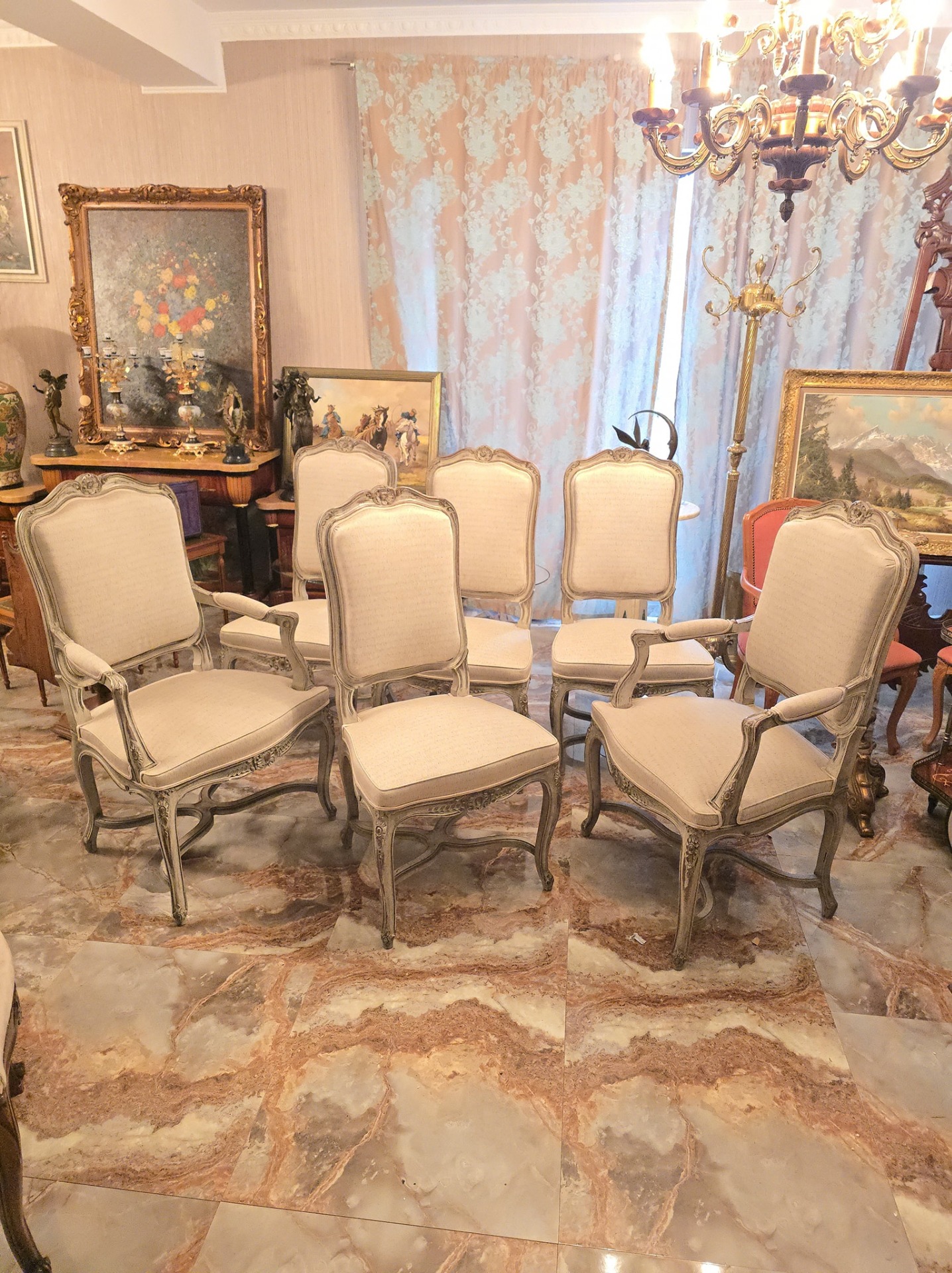 Set de 6 scaune in stilul louis realizate recent,tapiseria calitatetiva (alb-gri)