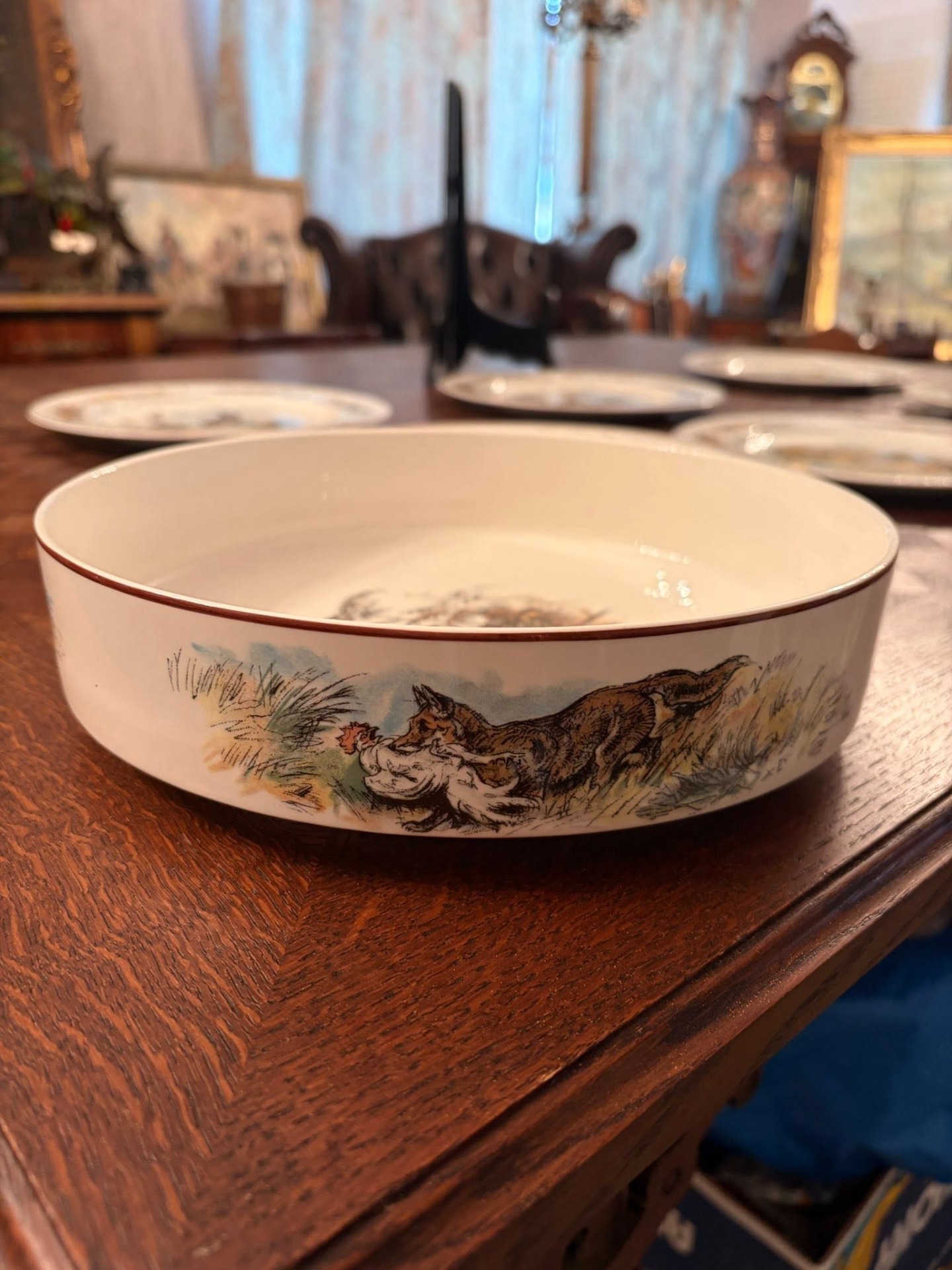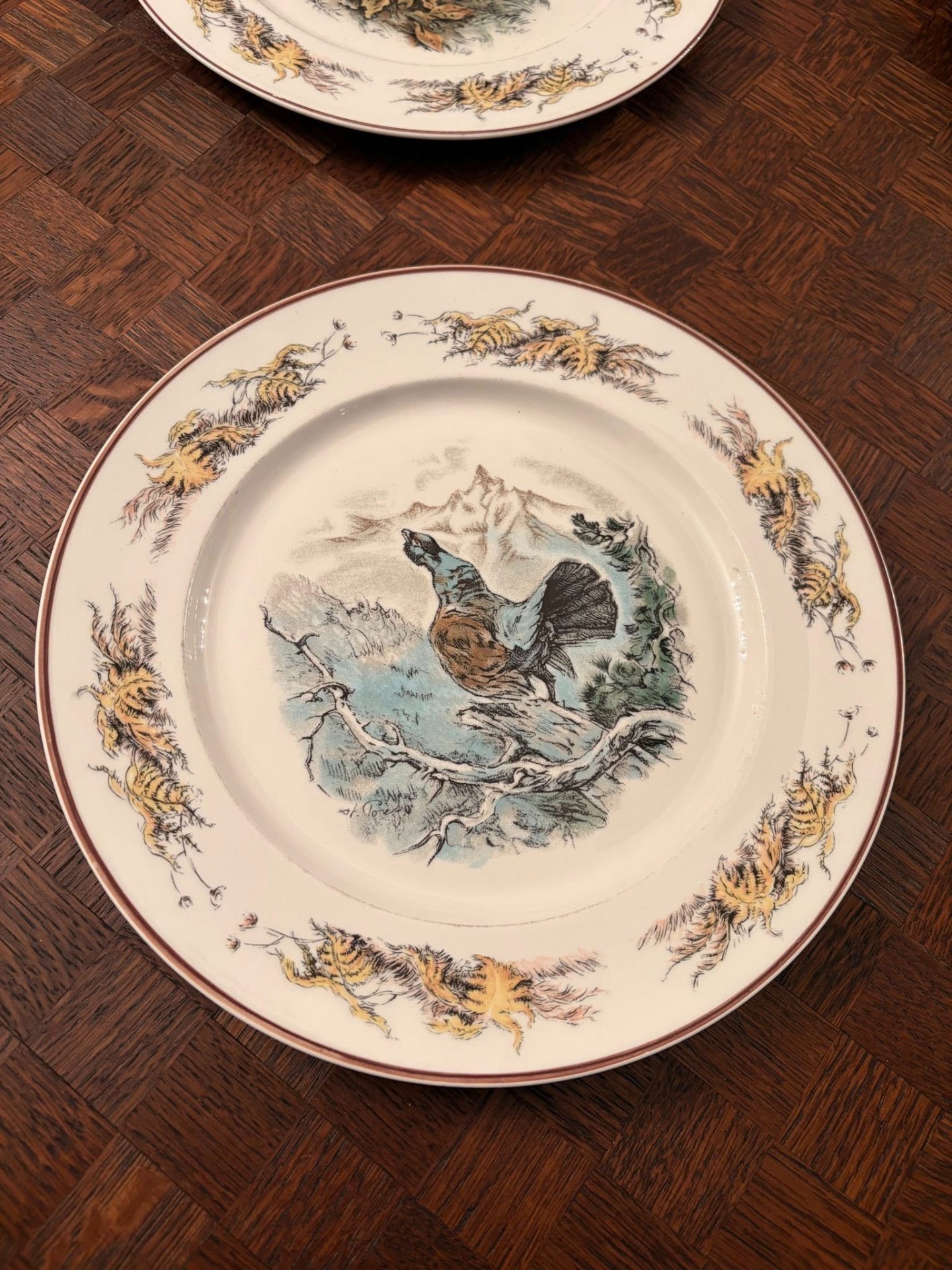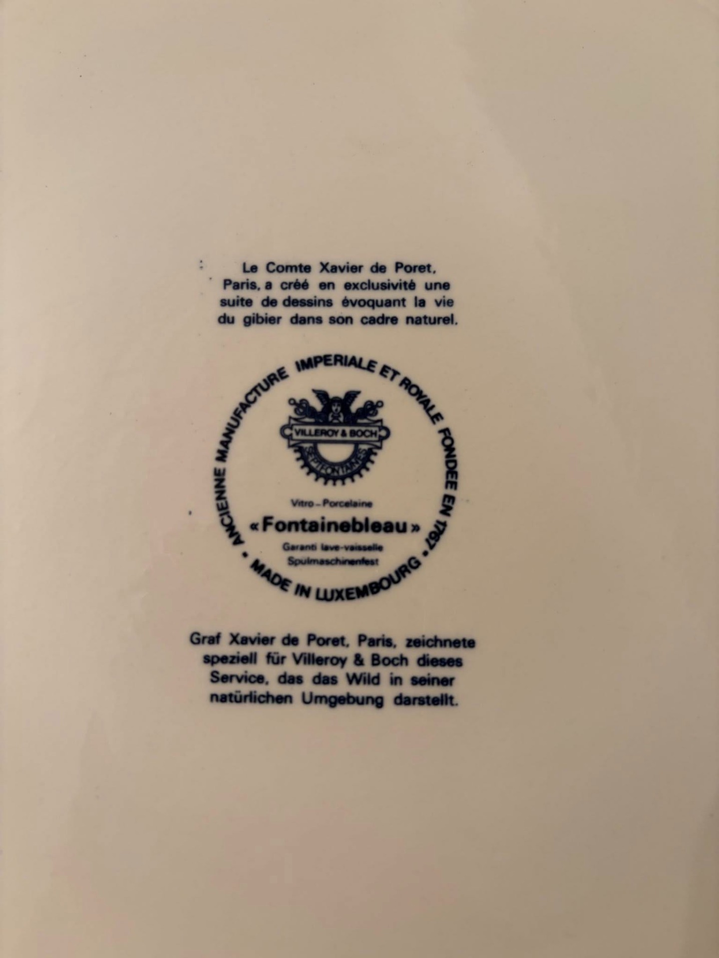 Villeroy & Boch – „Fontainebleau”, realizate în Luxemburg, cu ilustrații create în exclusivitate de Xavier de Poret, reprezentând scene cu vânat în mediul natural. Farfuriile sunt din vitro-porțelan de calitate superioară, cu margini decorate detaliat și picturi centrale în culori vibrante.