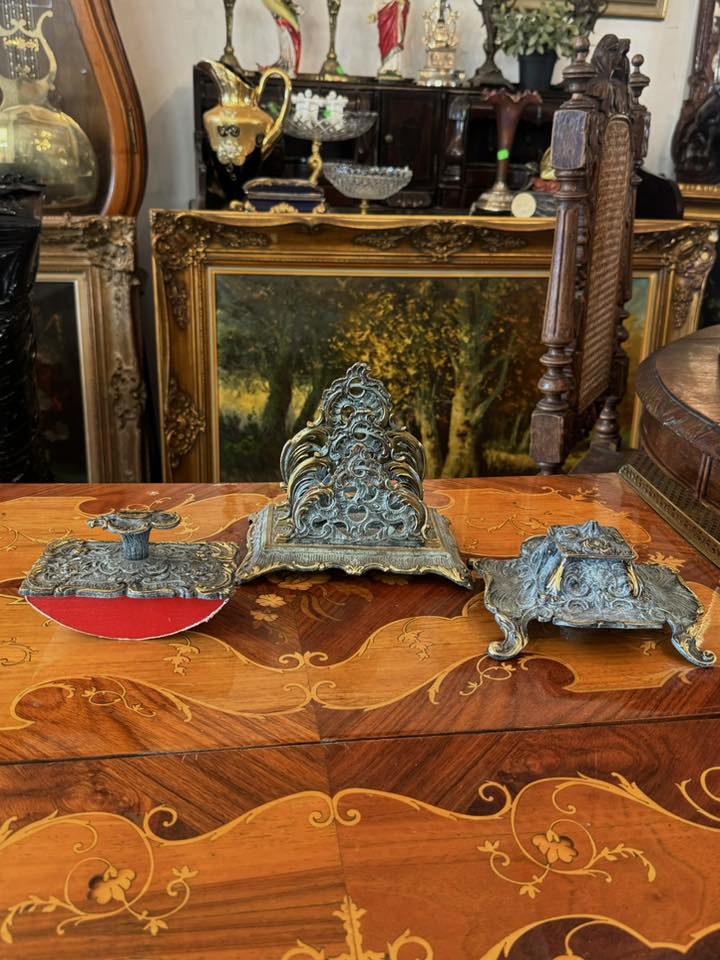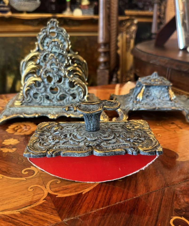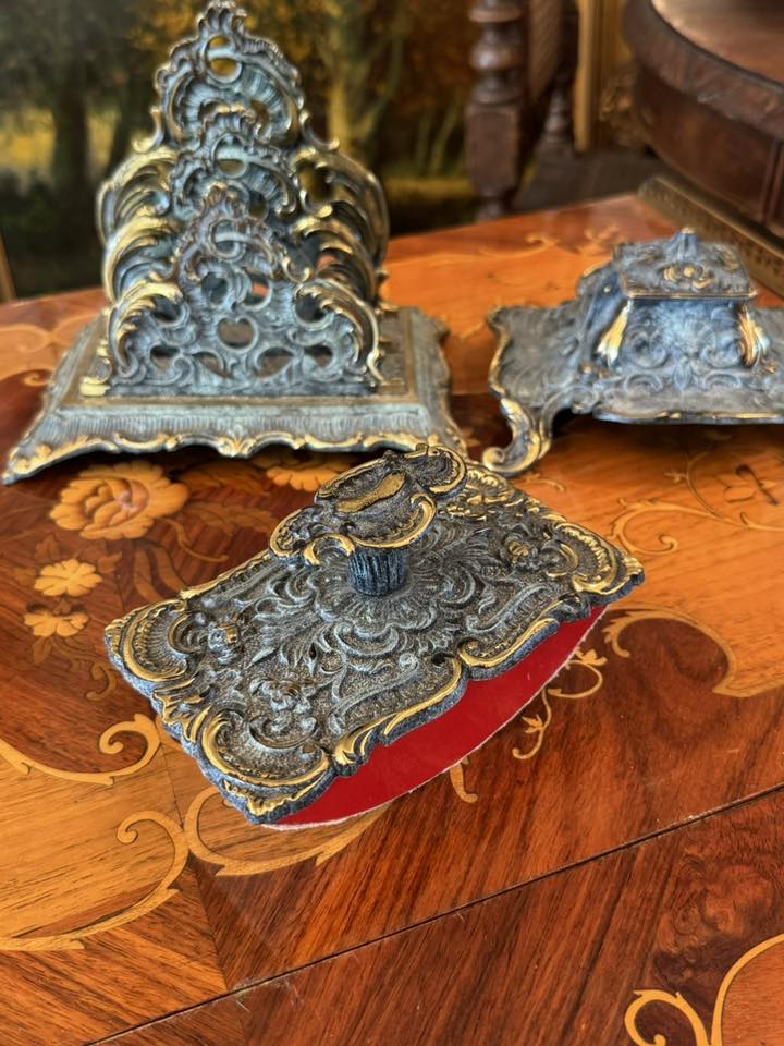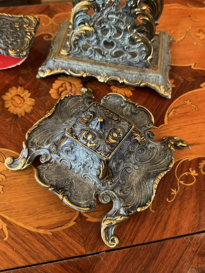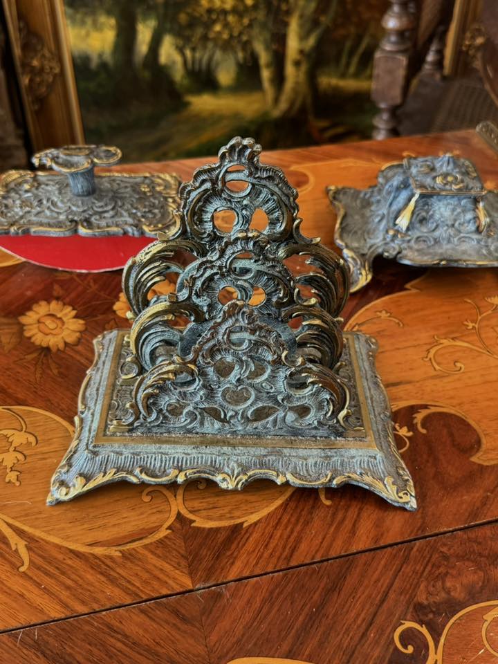 Set de birou de colecție, realizat din bronz în stil Baroc/Rococo, extrem de decorativ și bogat ornamentat. (Franța, cca 1910)