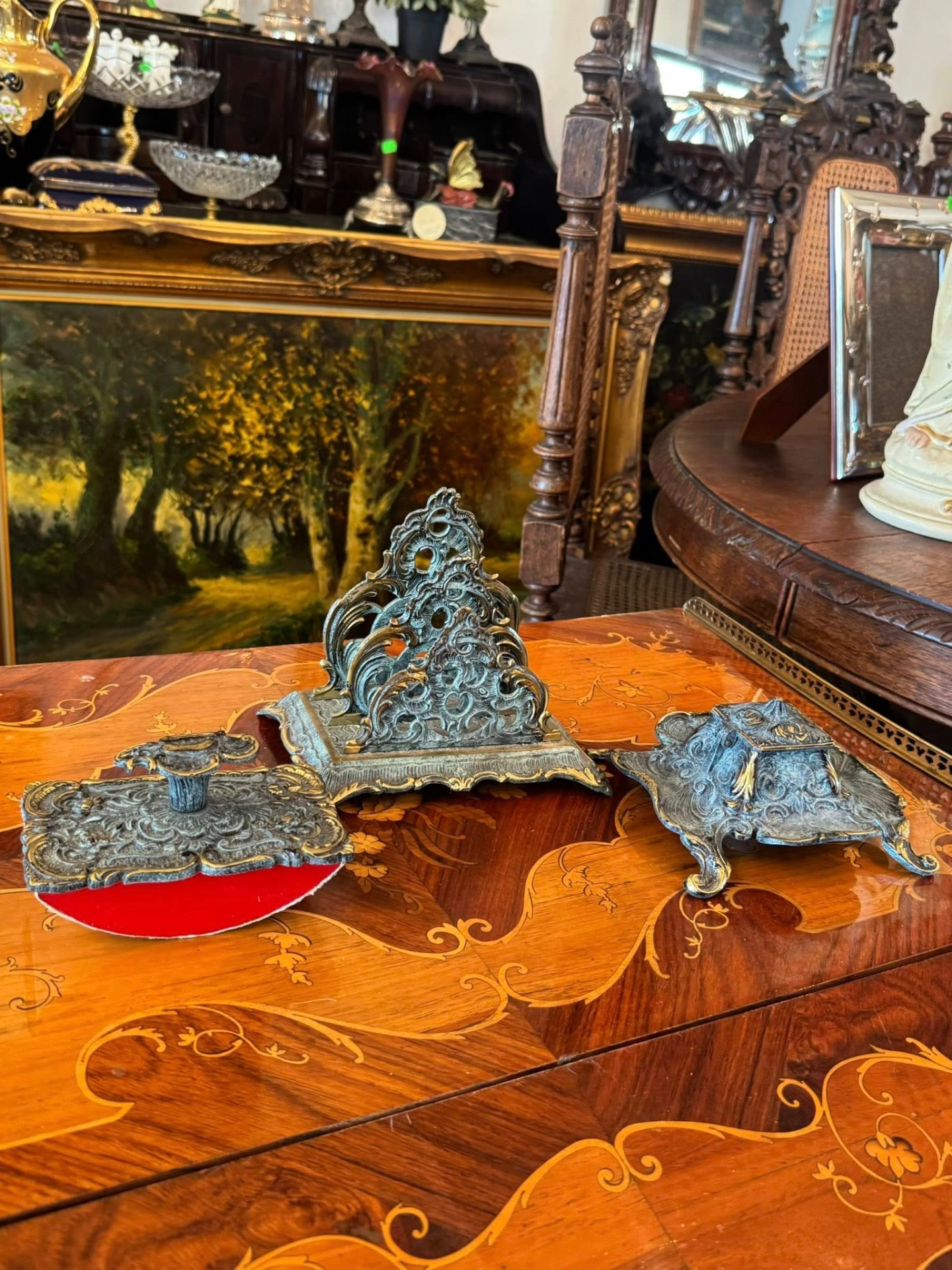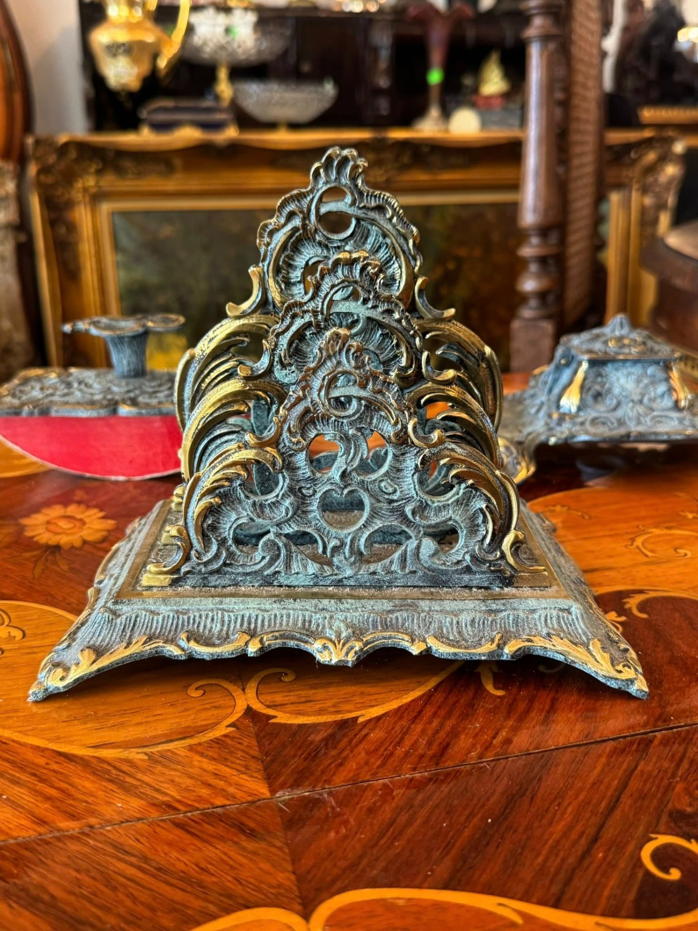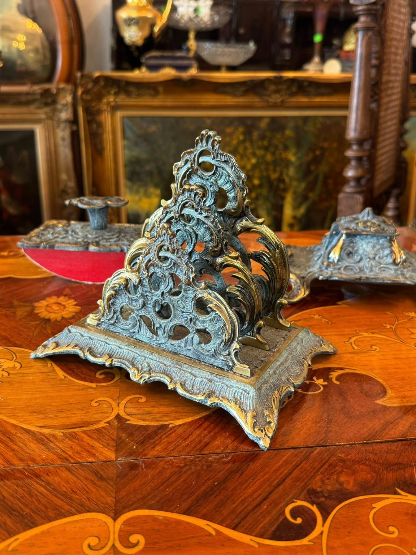 Set de birou de colecție, realizat din bronz în stil Baroc/Rococo, extrem de decorativ și bogat ornamentat. (Franța, cca 1910)