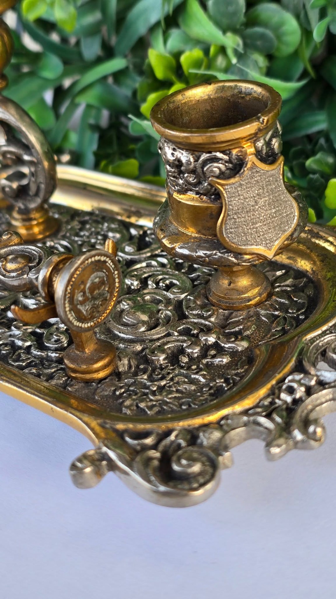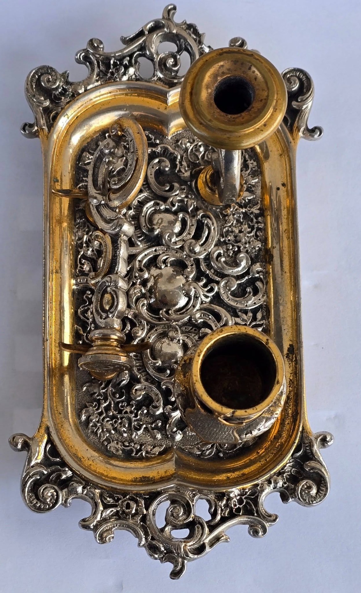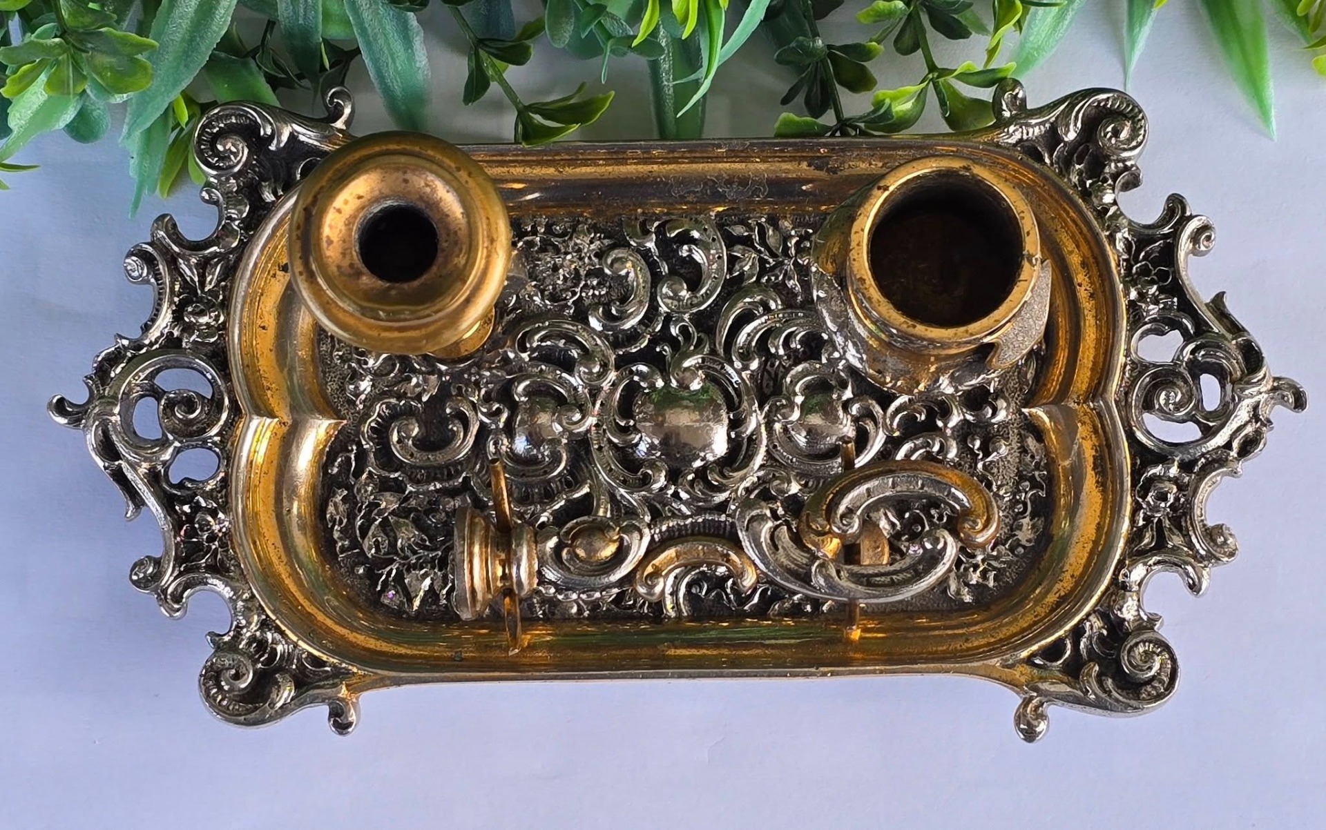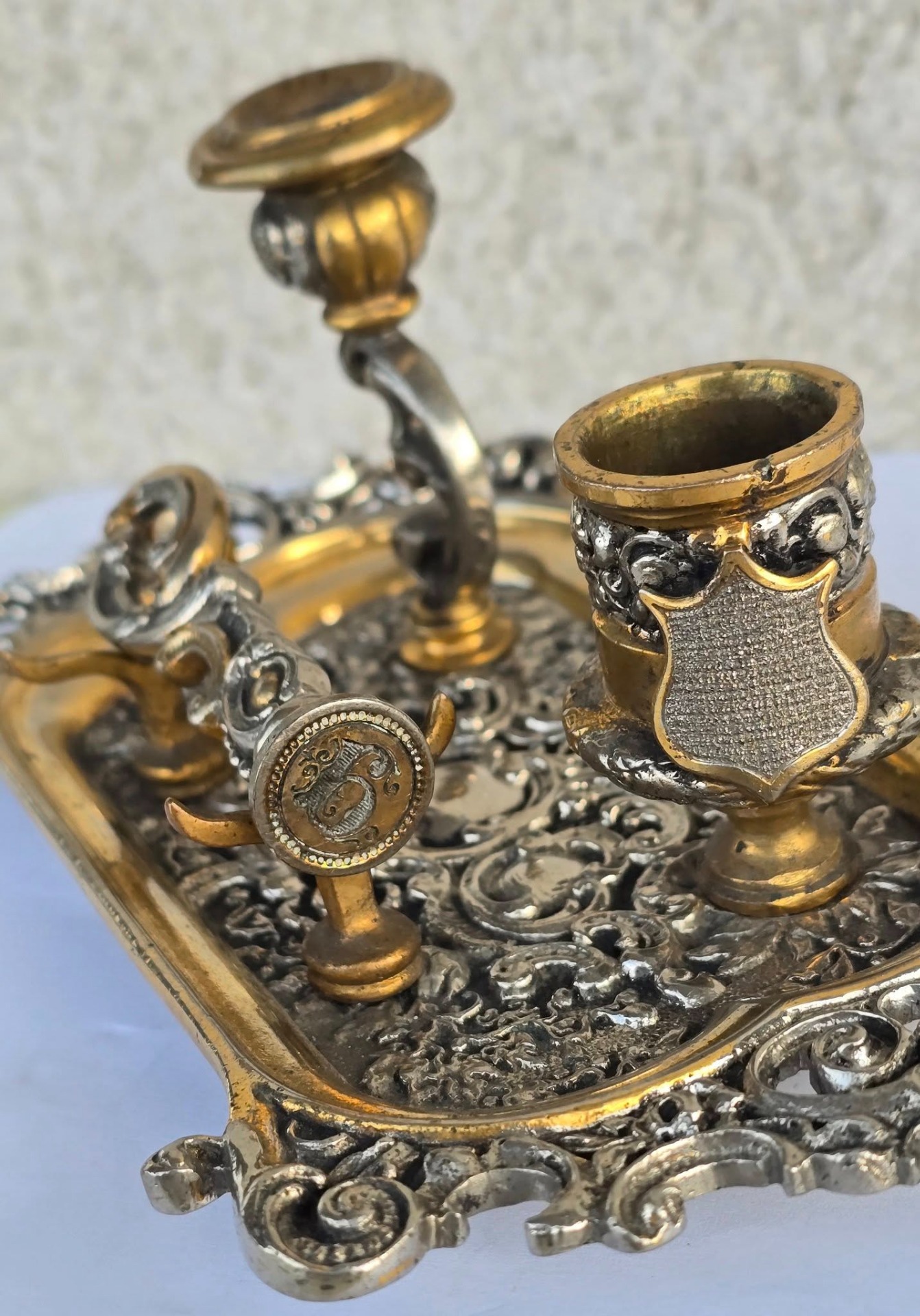 Set de birou vechi, de colecție, în stil Baroc/Rococo, din metal aurit și argintat, cu detalii în relief și design cu volute, motive florale și borduri crestate,