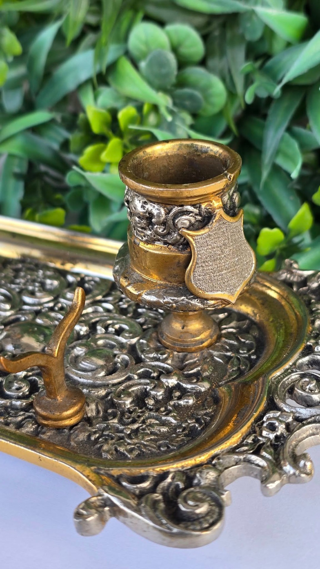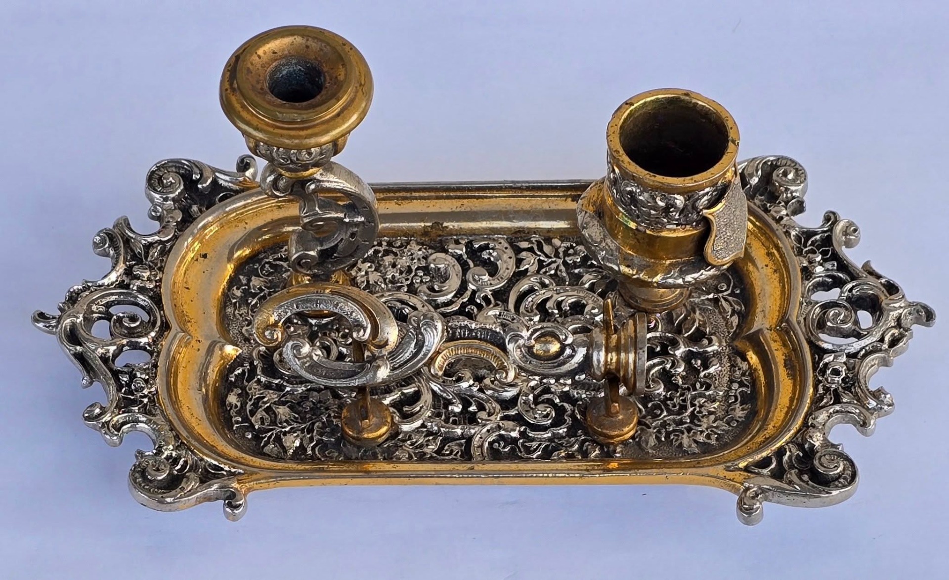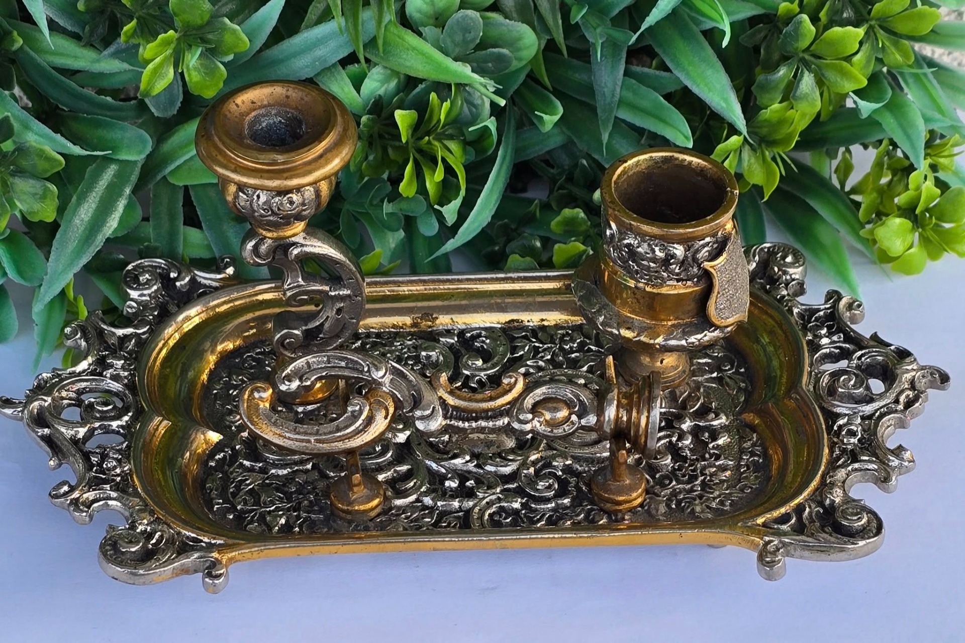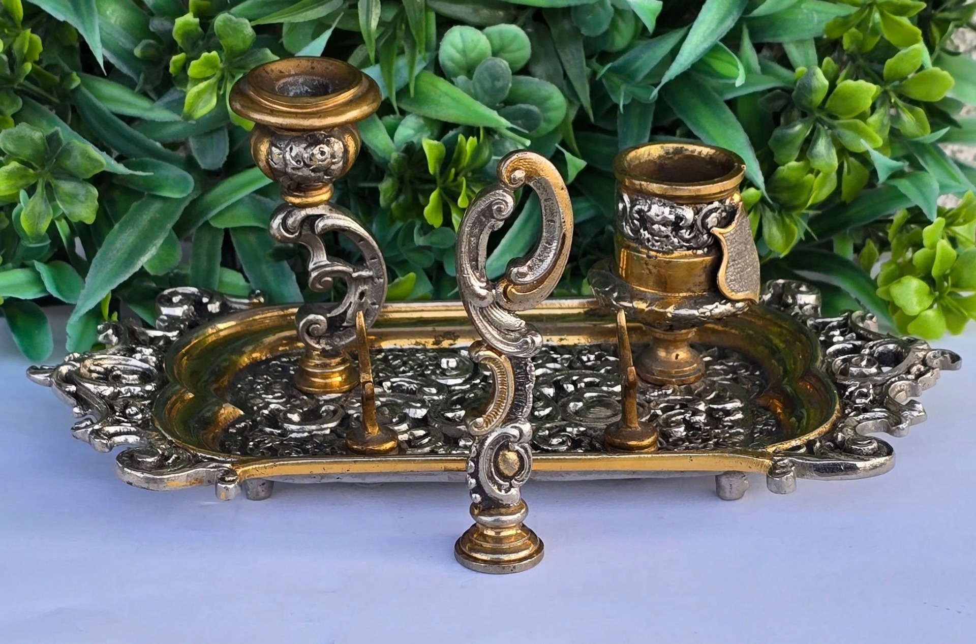 Set de birou vechi, de colecție, în stil Baroc/Rococo, din metal aurit și argintat, cu detalii în relief și design cu volute, motive florale și borduri crestate,